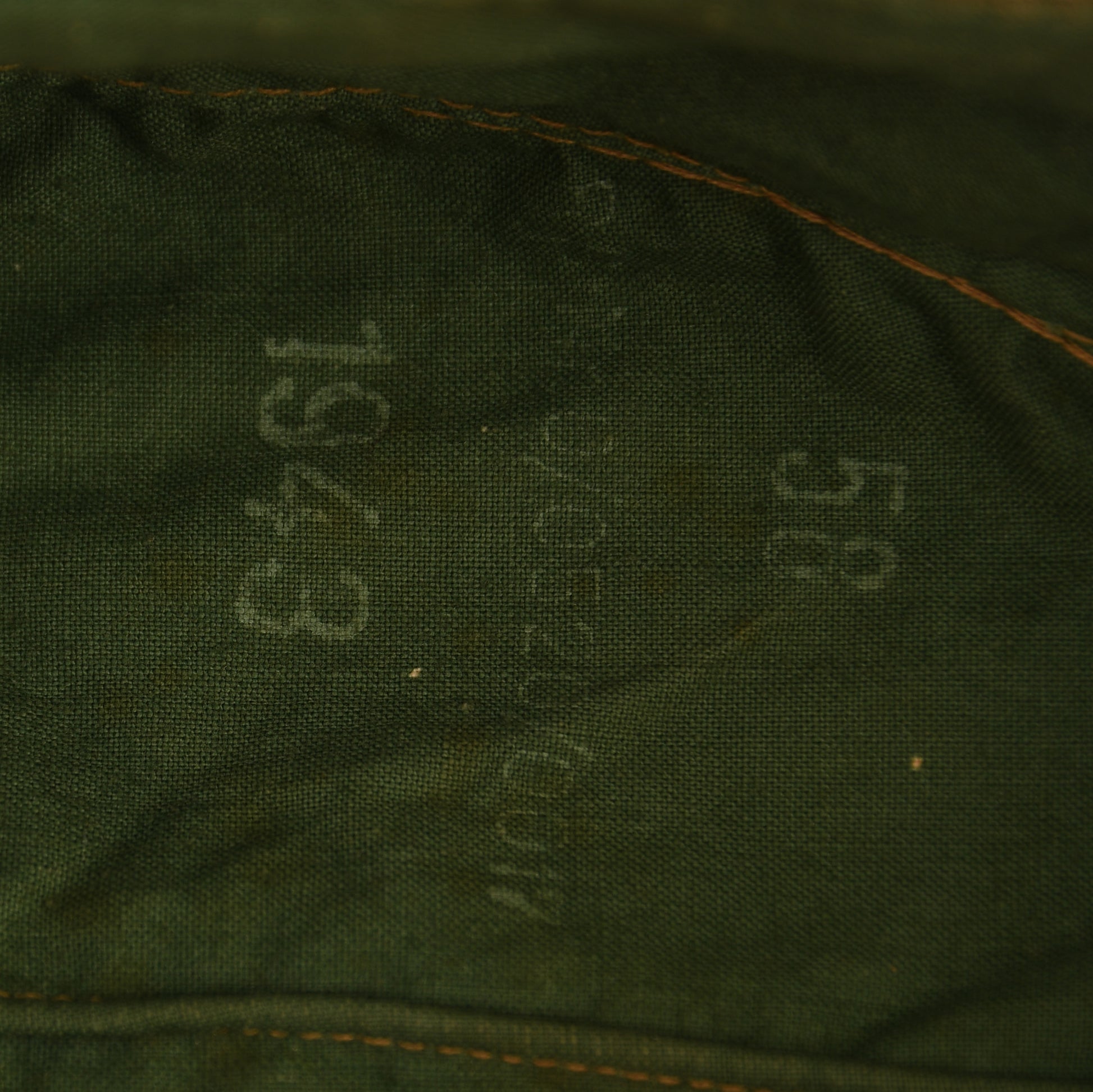 A rare officers version of the M.41 tropical field cap, featuring silver piping around the lower sides. Fitted with standard Kriegsmarine gold-on-tan insignia; the gold weave, while slightly less bright than typical officer insignia, is brighter than the standard Bevo weave for enlisted caps. The cockade is a standard enlisted mans type. Twin air vents, Kriegsmarine green lining, stamped size ‘58’ with full RB number and date ‘1943’ in white ink.