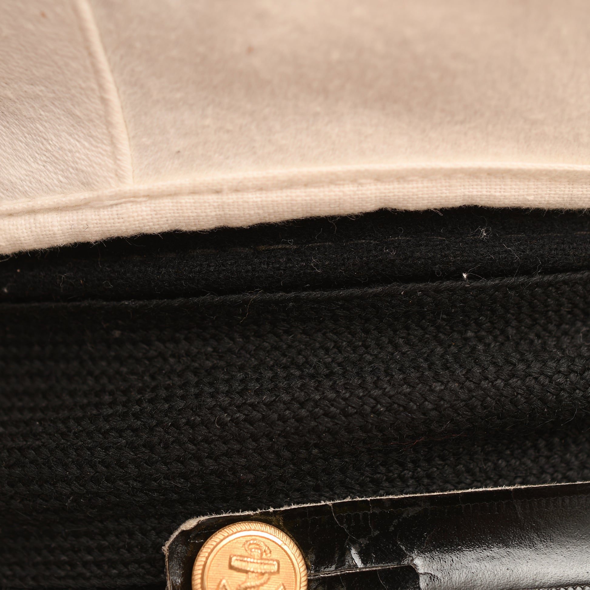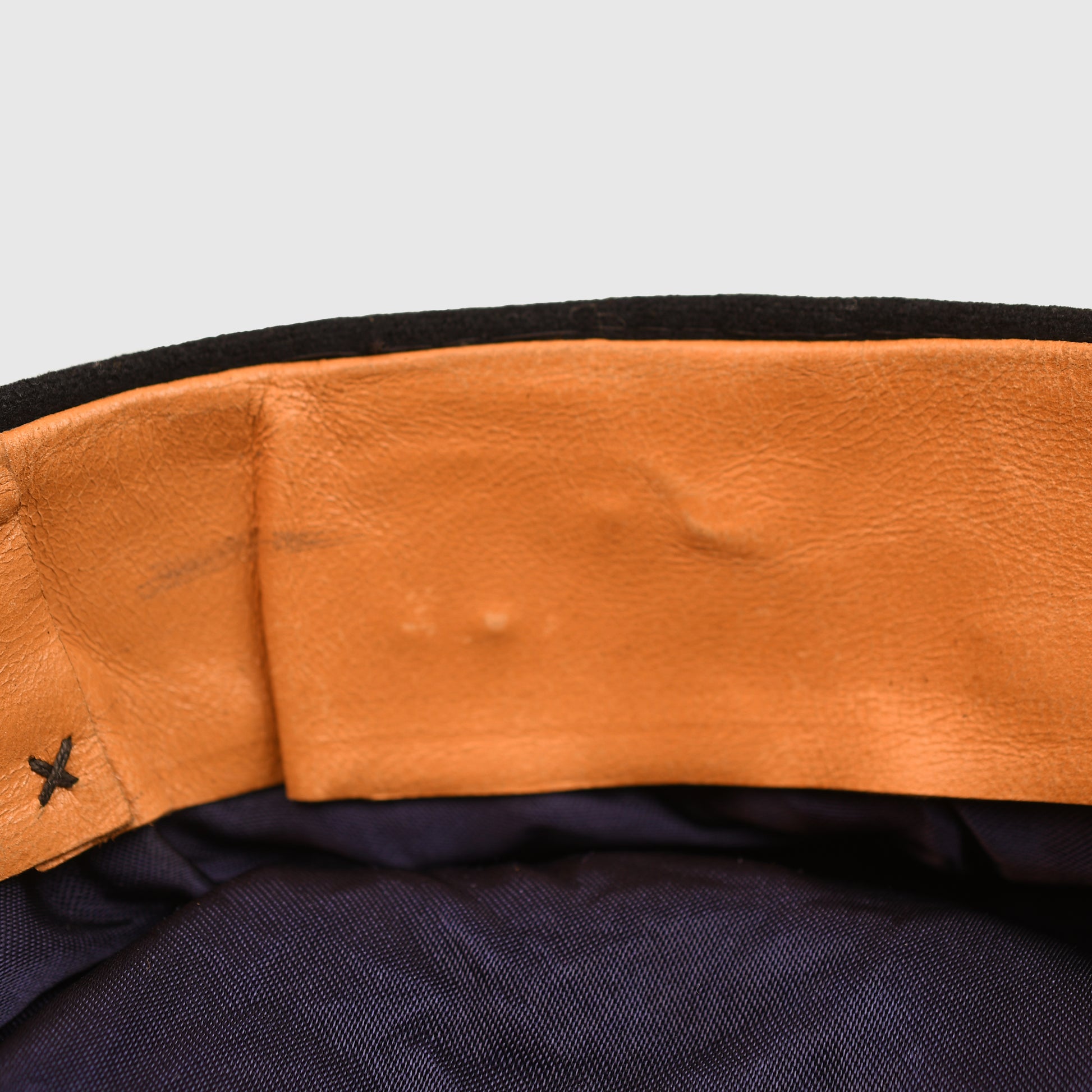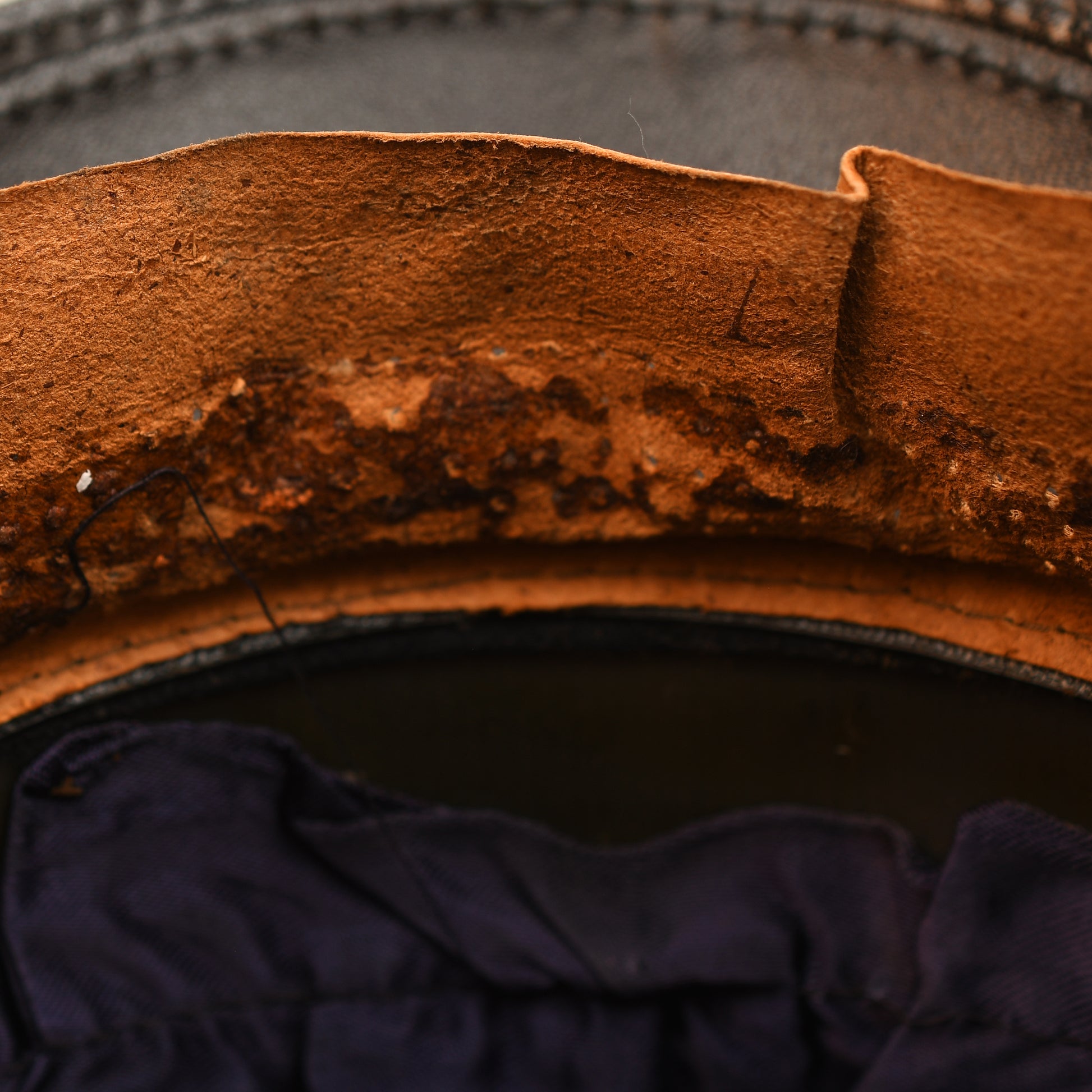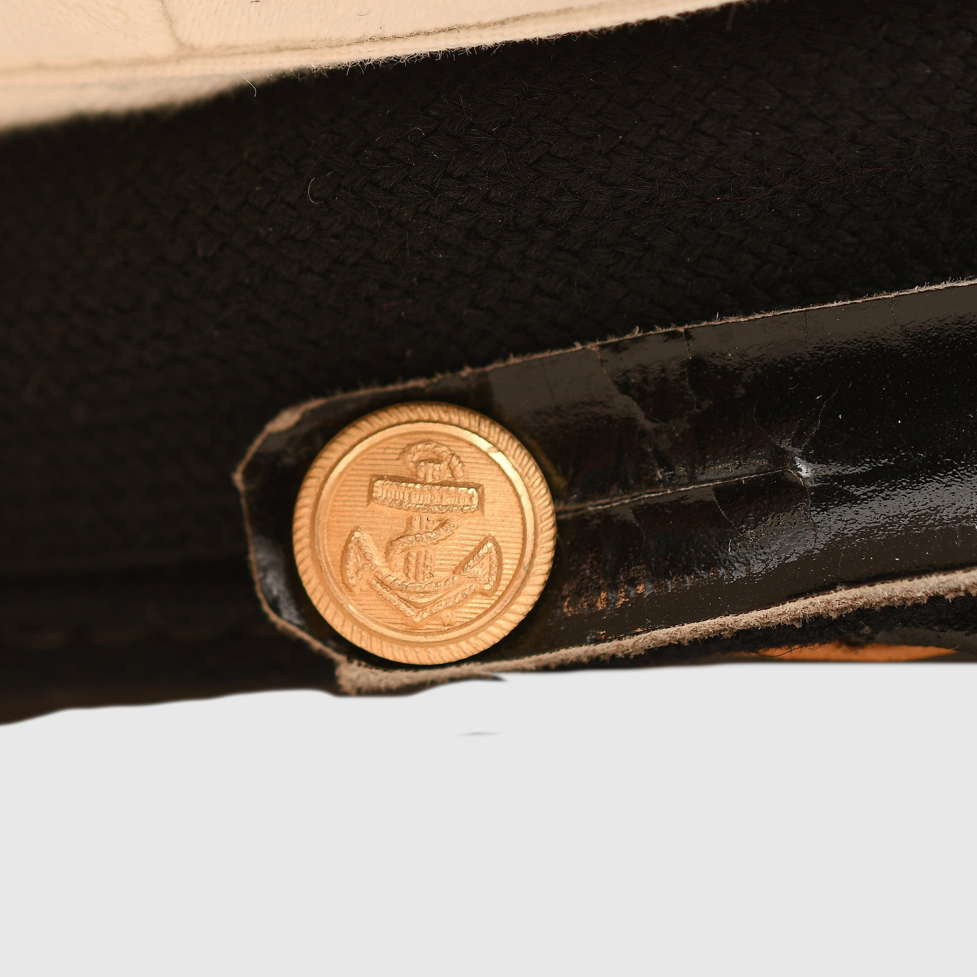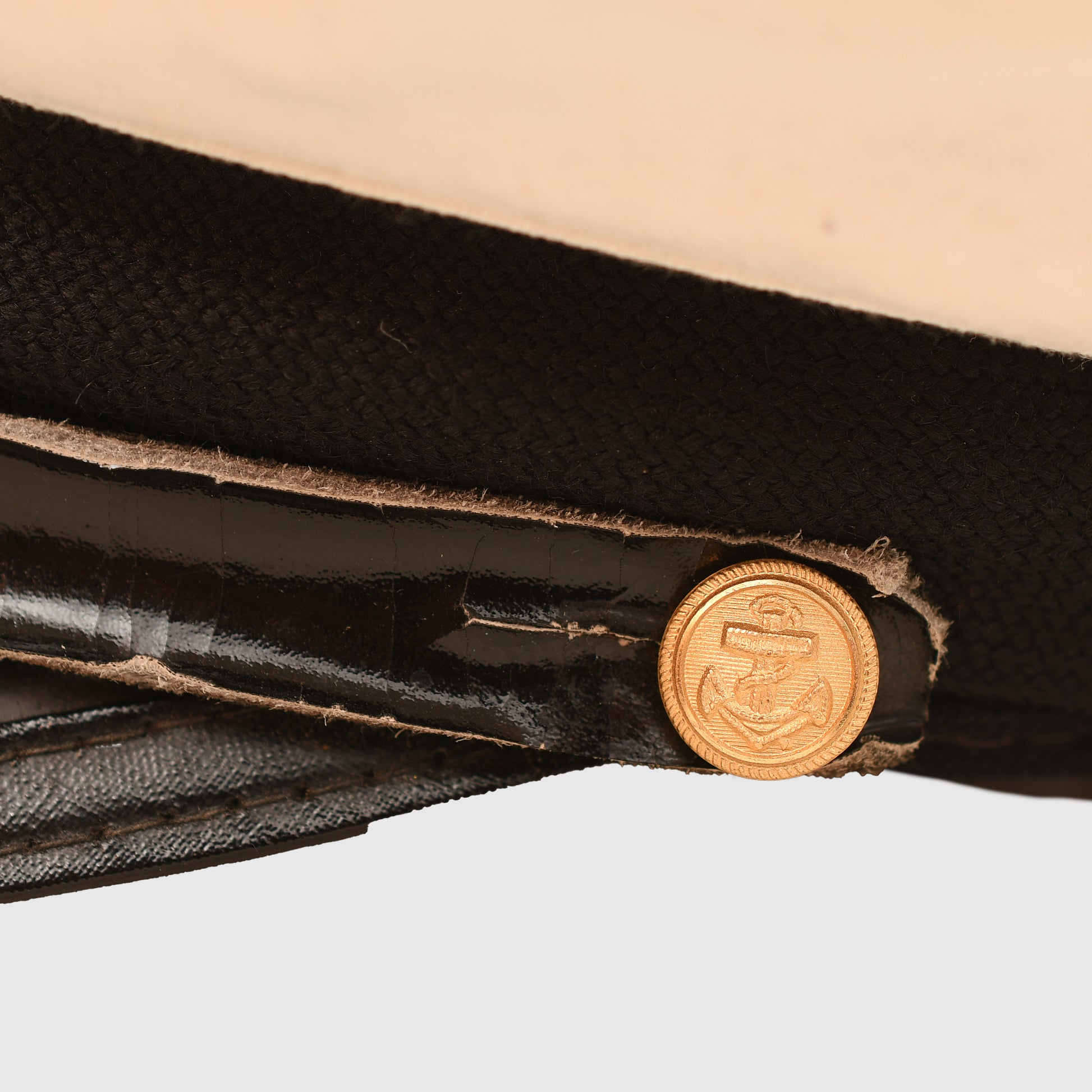 The correct naval chinstrap is in place, secured by gilded anchor side buttons. The double-ribbed edge peak confirms the NCO designation. Inside, the light tan leather sweatband remains fully intact. The dark blue rayon lining is clean and complete, though it lacks the celluloid centre lozenge, as often found in wartime examples.