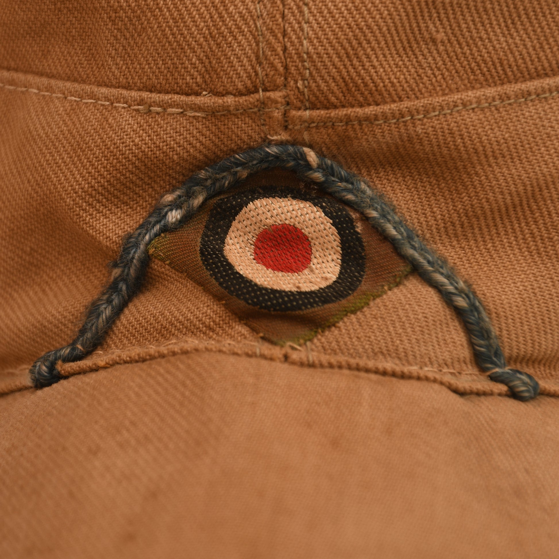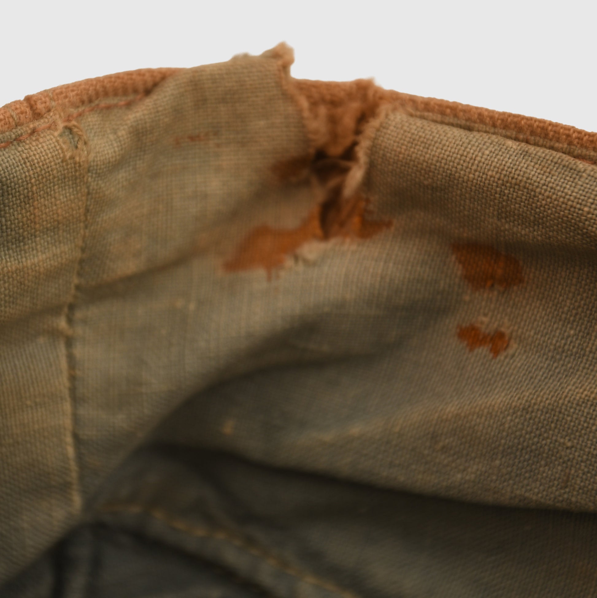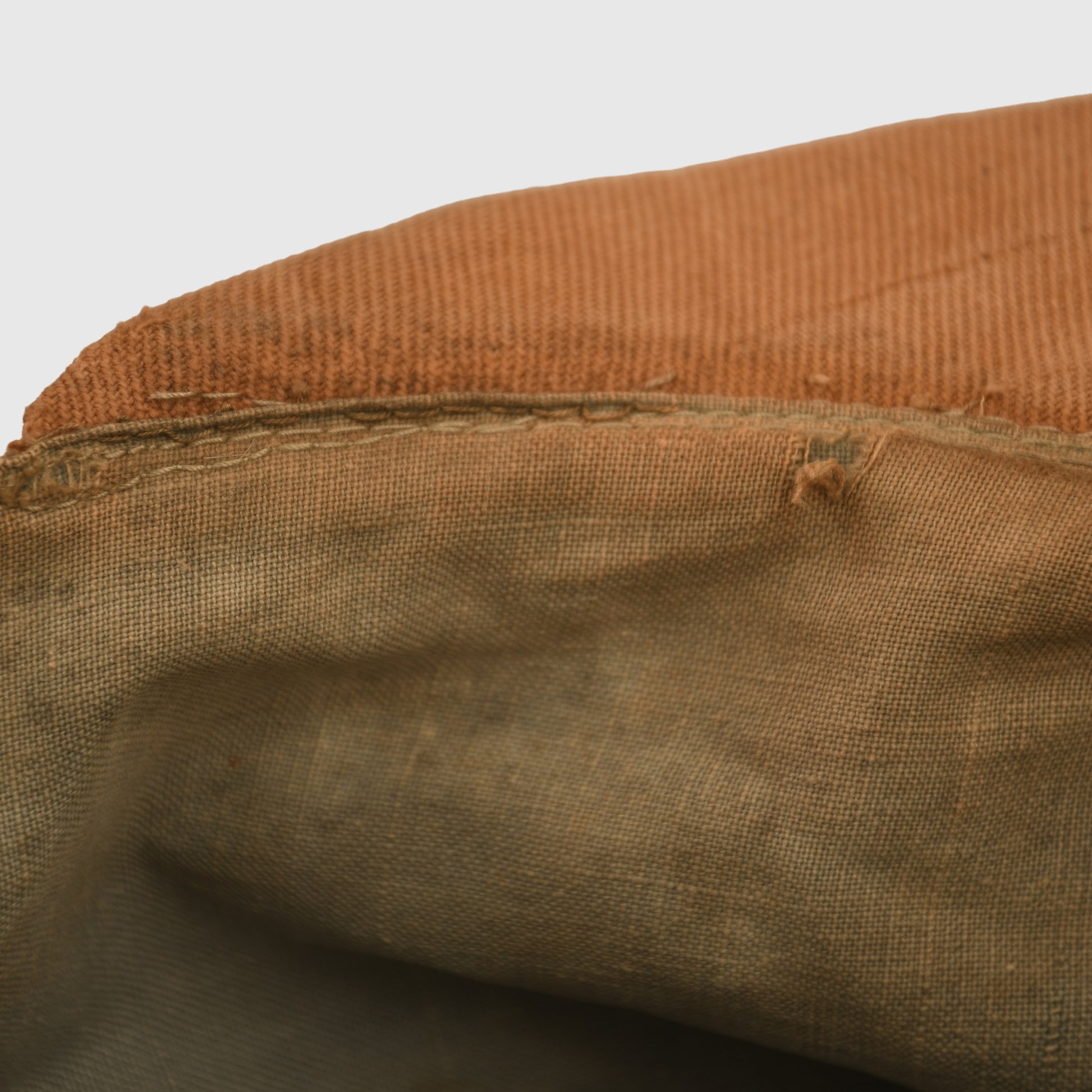 Fitted with the correct gold-on-tan Bevo woven eagle and matching Bevo cockade, the lower cockade is surrounded by the inverted V waffenfarbe in light blue. While photographic or regulatory evidence of waffenfarbe on Naval tropical caps is scarce, this example clearly retains its original fitting.