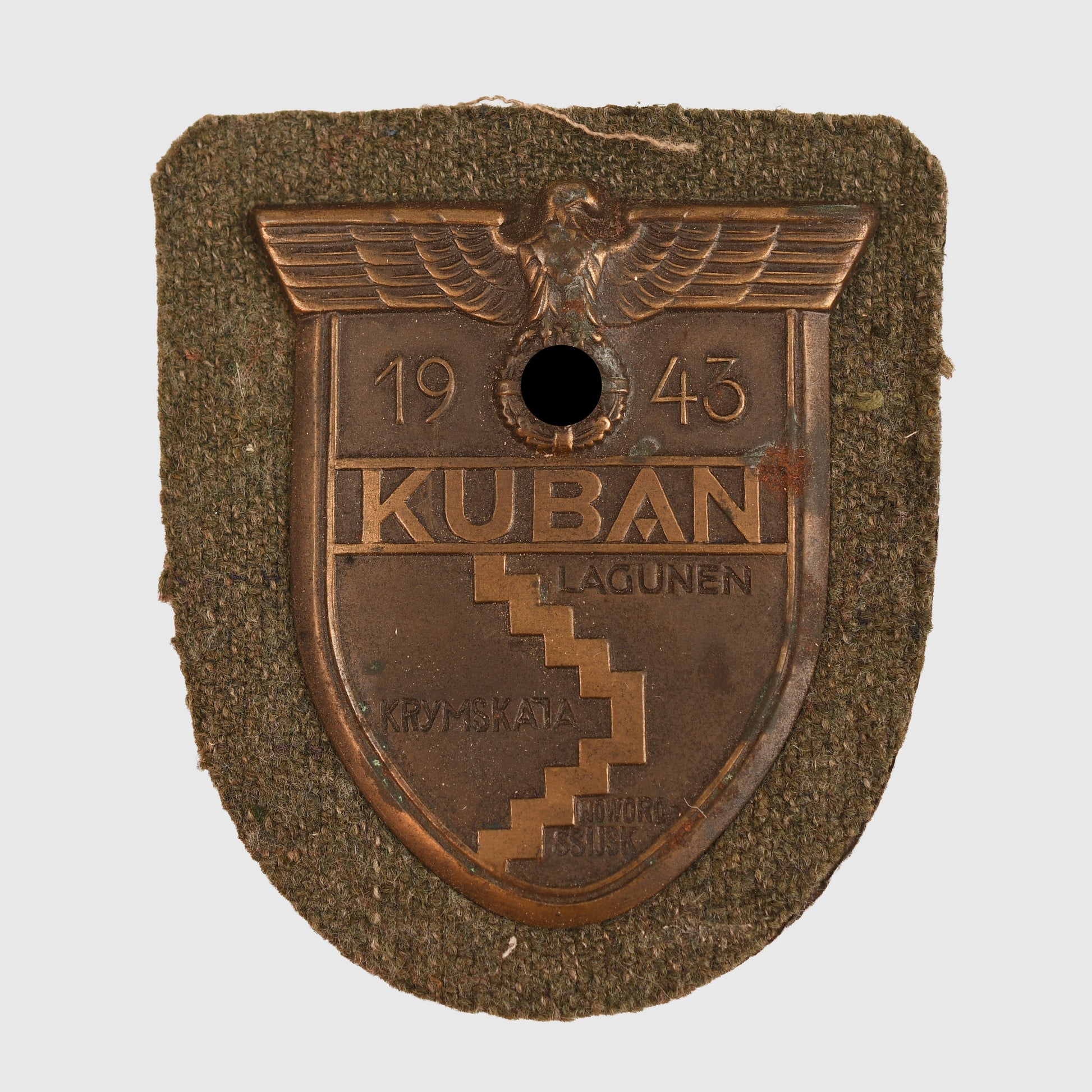 A very good example of the Kuban Shield, retaining all of its original finish with only slight rust spotting to the right-hand side. It is mounted on its original army field-grey cloth, with an imitation leather backing to the reverse. All four attachment pins remain visible beneath the covering material.