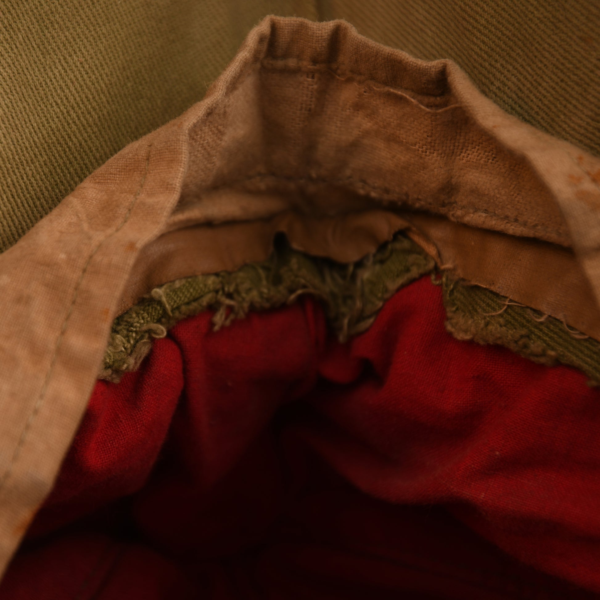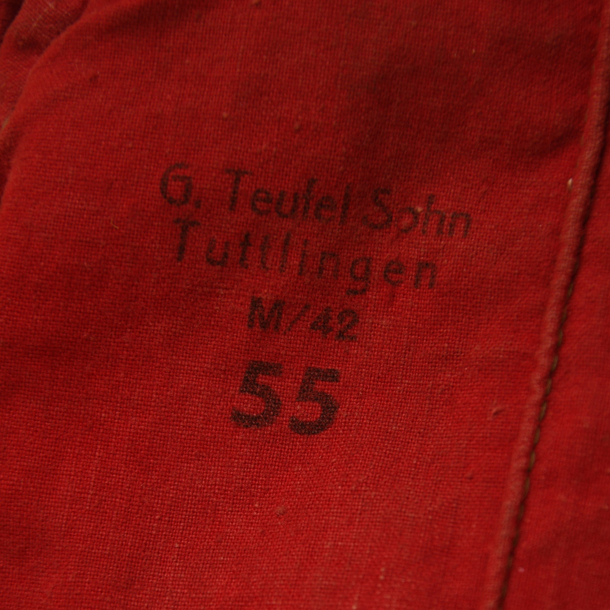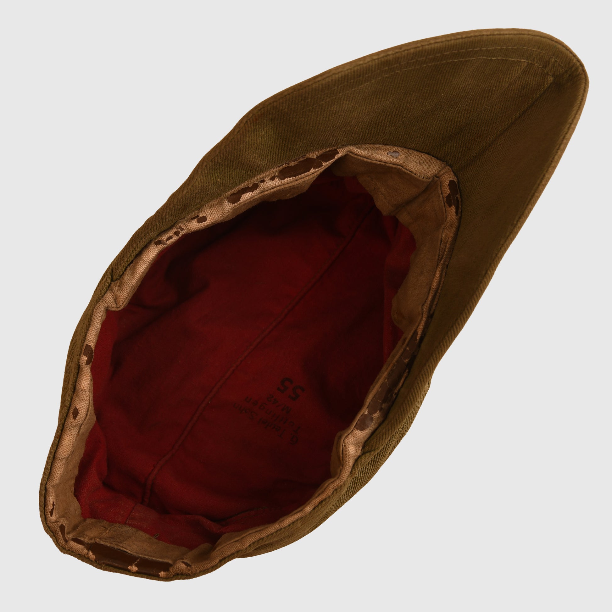 A 2nd pattern tropical visored field cap, showing light service wear. Fitted with the original Bevo woven blue-on-tan eagle and matching cockade. Features twin side vents and a canvas sweatband with partial imitation leather covering still intact. Maker marked ‘Teufel & Sohn, Tuttlingen’ with M/42 and stamped size ‘55’. Minor rust stain at the rear, otherwise in clean, well-preserved service-worn condition.