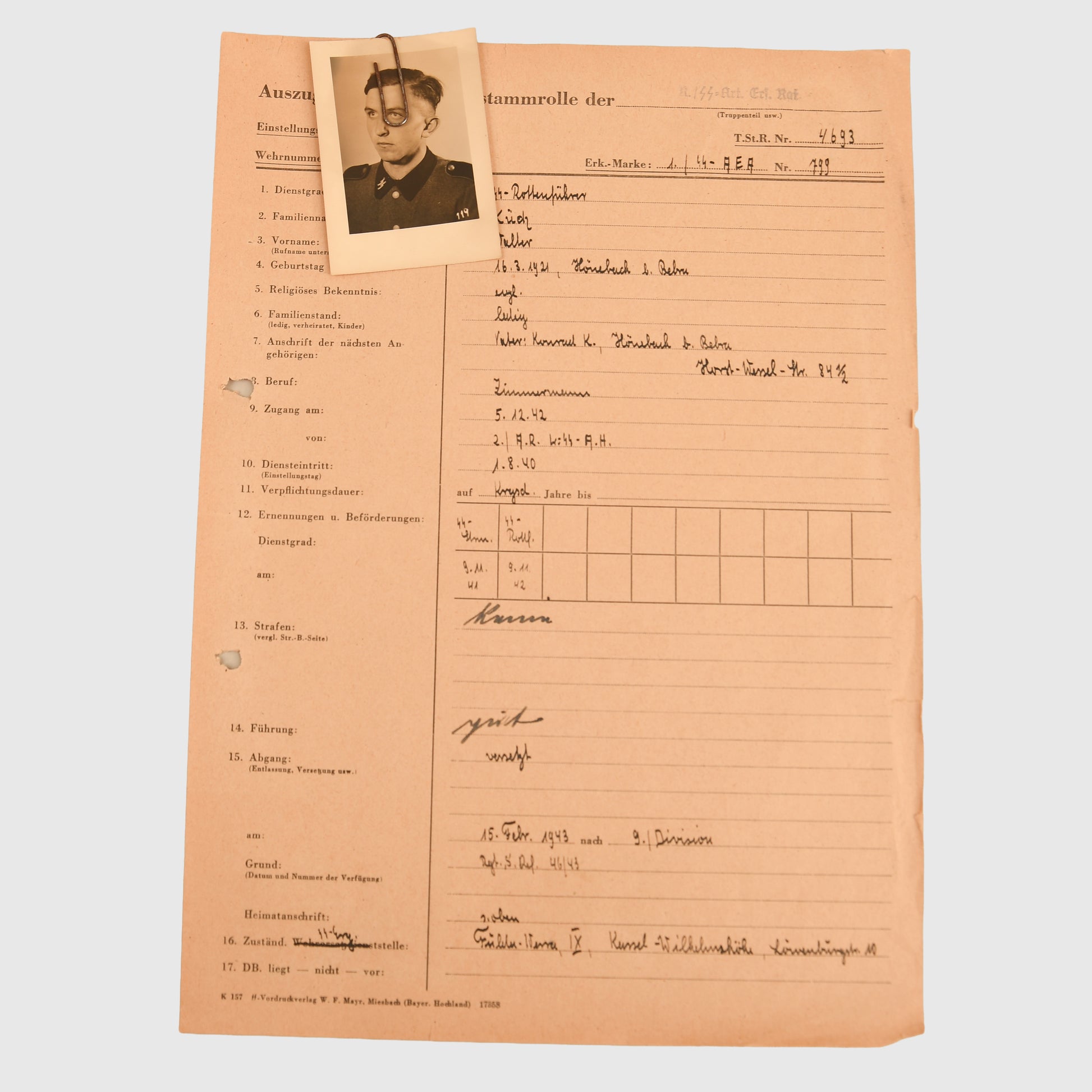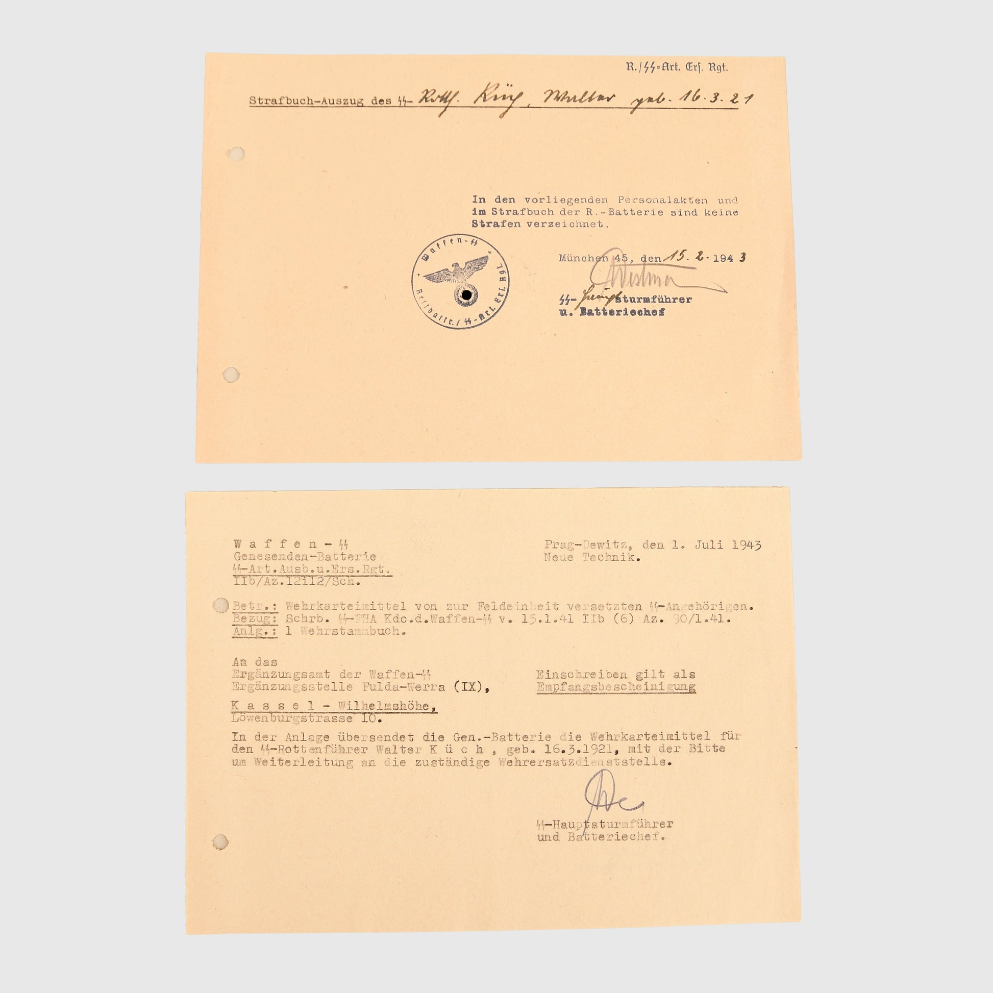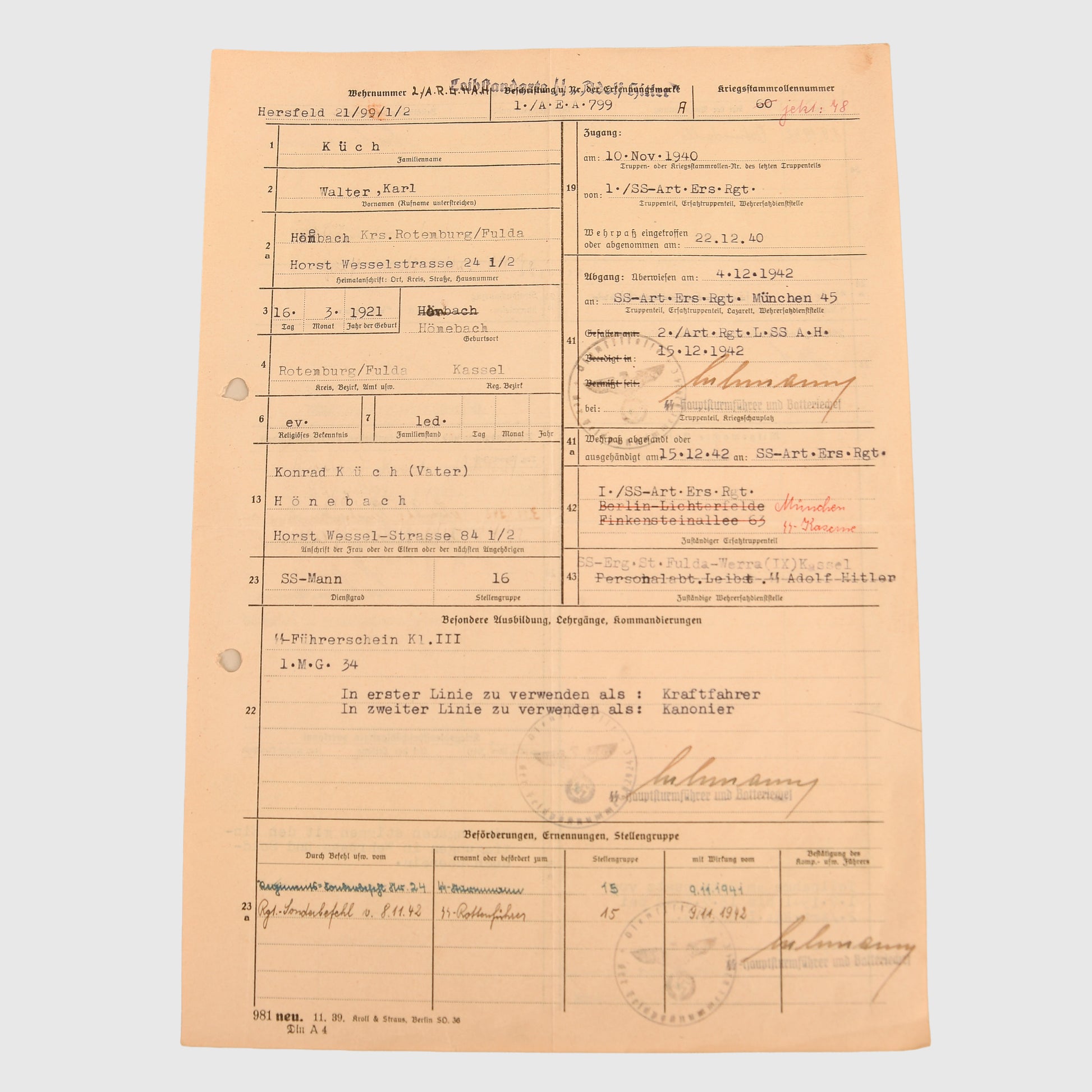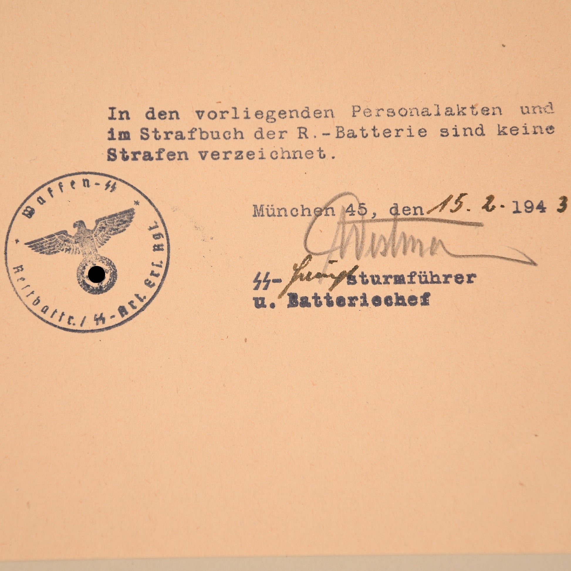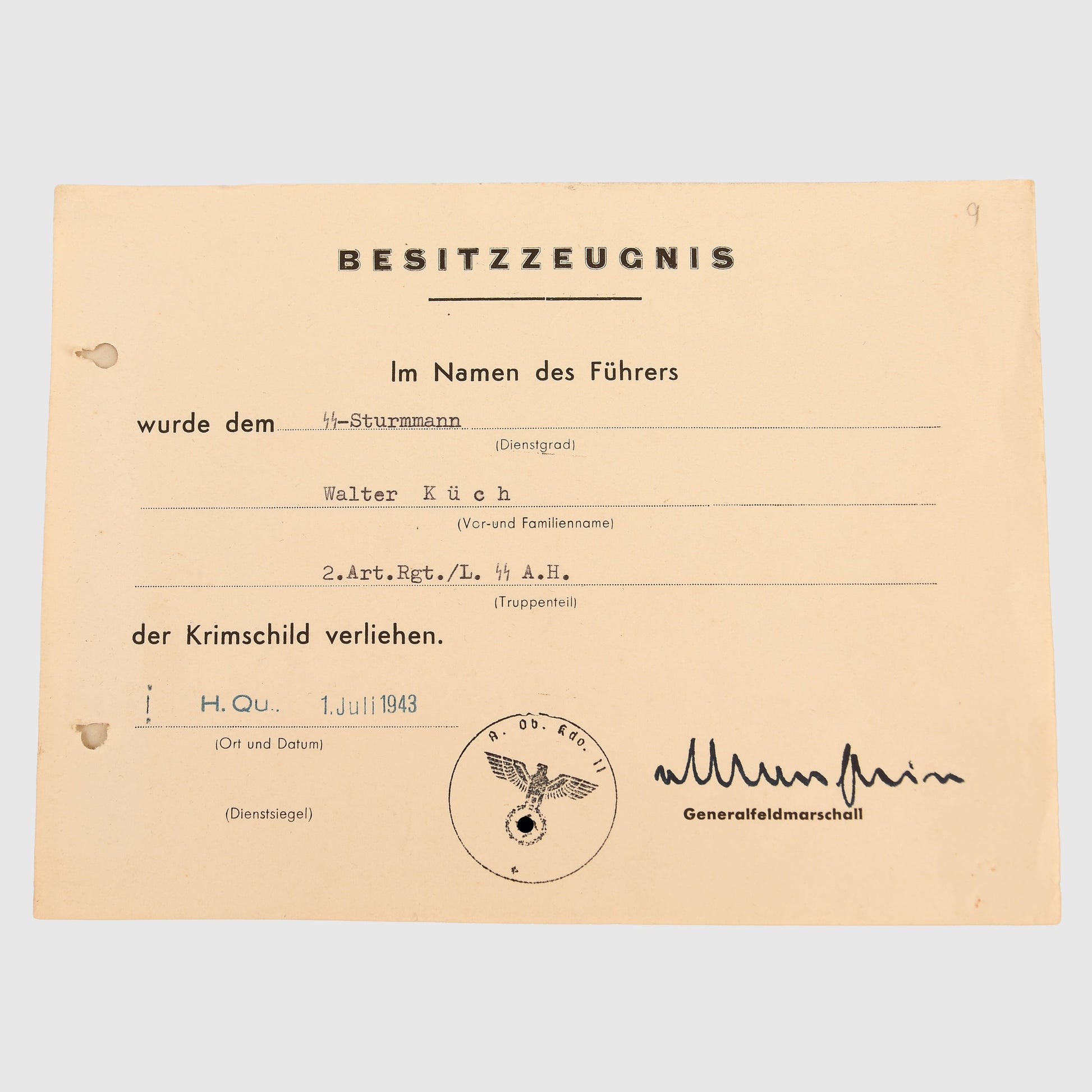 A very good and complete file of documents relating to SS Sturmann Walter Koch of the 2nd Artillery Regiment, Leibstandarte Adolf Hitler. The group includes the official citation for the Krim Shield, dated 1st July 1943, bearing the facsimile signature of Field Marshal von Manstein. Accompanying the award citation is Koch’s full SS service file, which contains a photograph of him, likely the same image used in his soldbuch. The photo depicts Koch hatless, wearing the M.36 uniform with black shoulder boards and the SS runic collar patch clearly visible. A rare and highly desirable SS paperwork grouping.