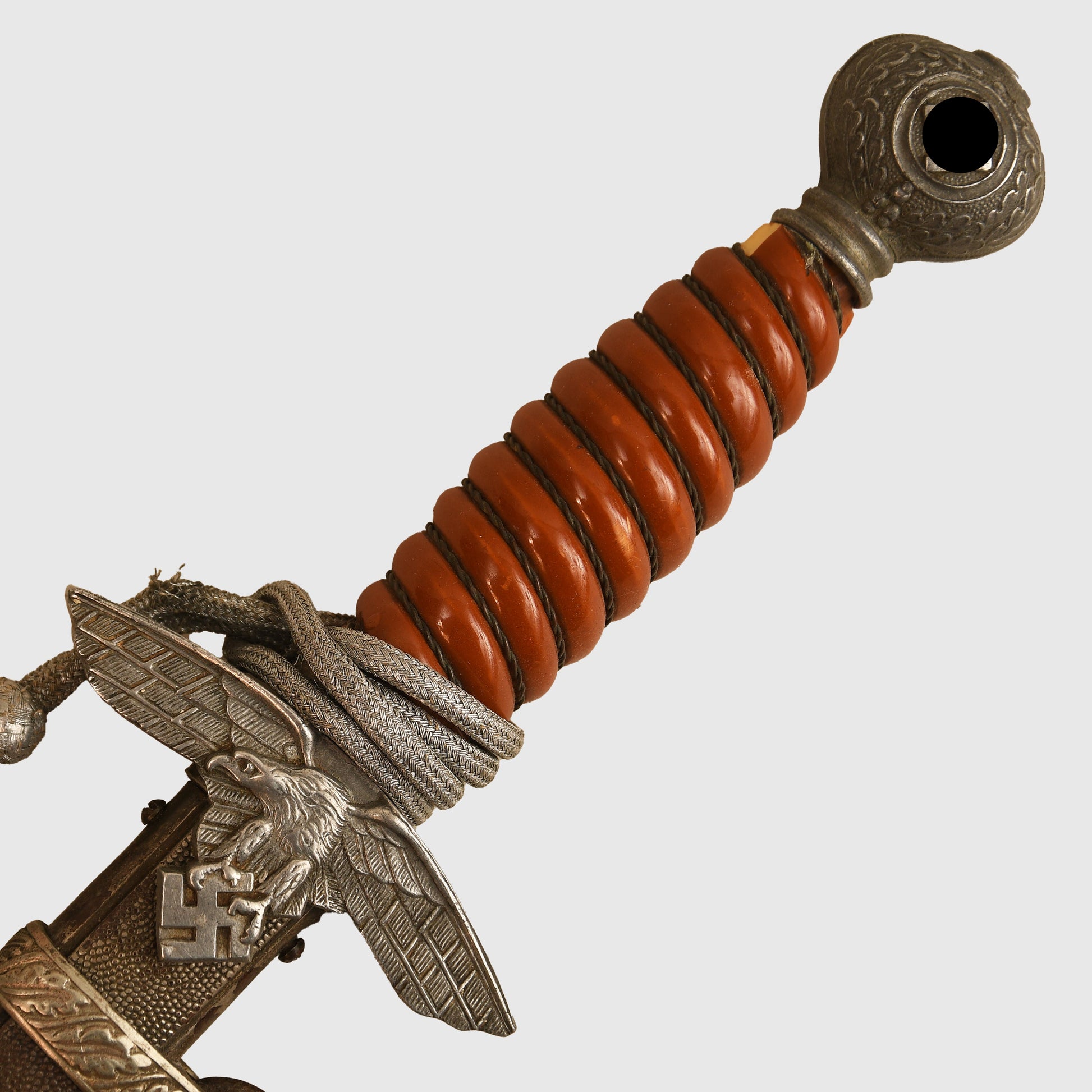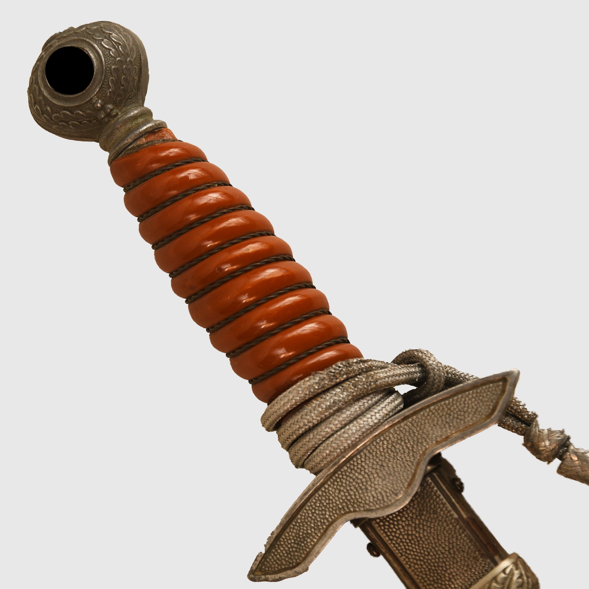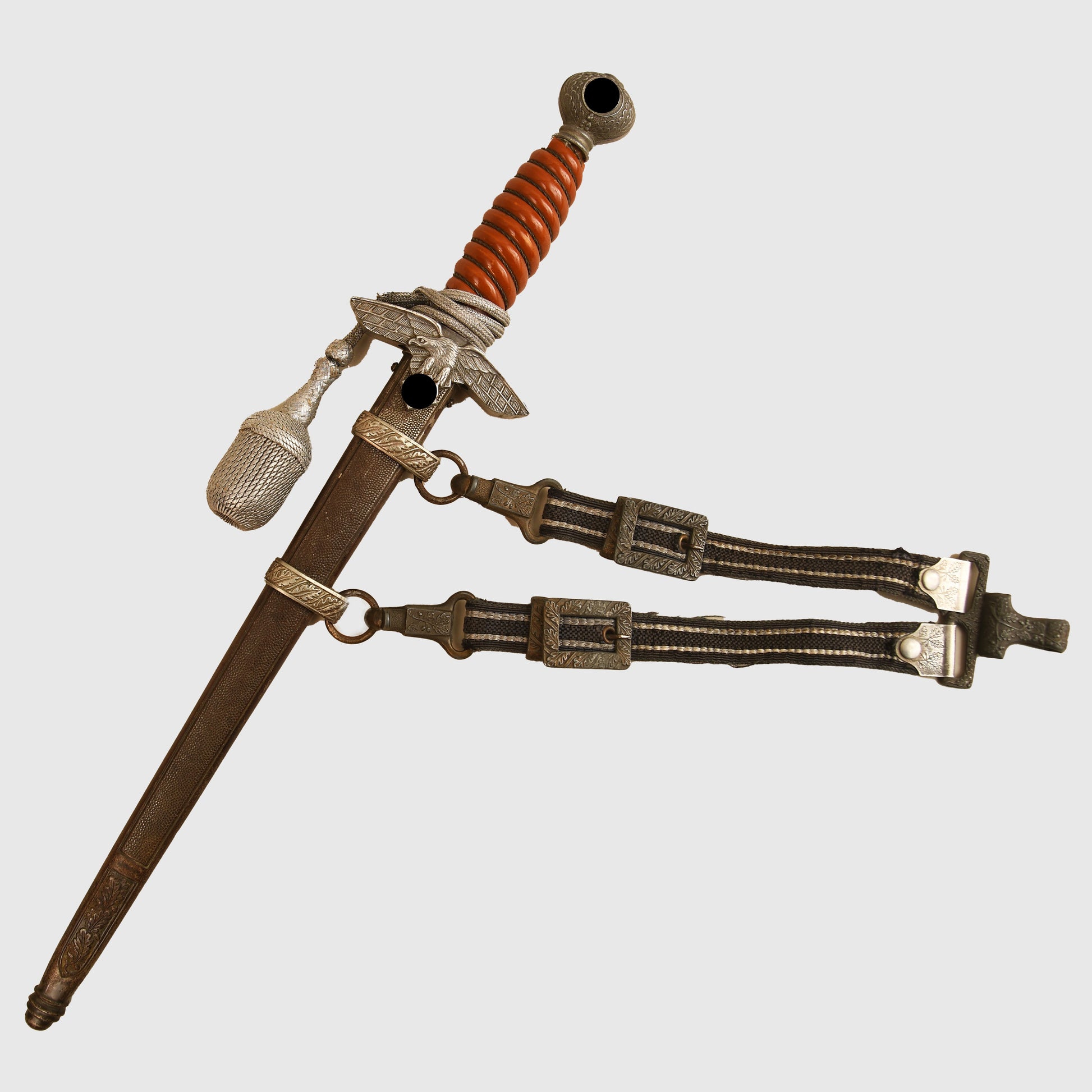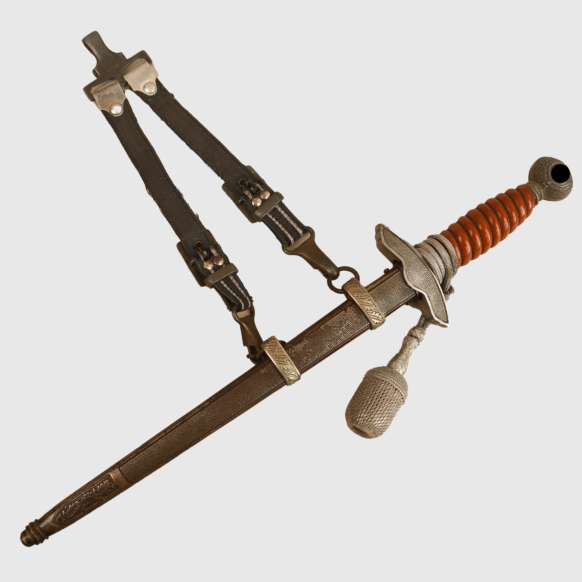 An excellent example of a Luftwaffe 2nd Pattern officers display piece by SMF. The main body features a well-preserved finish with matching grey tone to the upper pommel, cross guard, and scabbard rings. The scabbard’s body, made from a different material, retains a more steel-like finish. The deep orange grip shows two small chips but retains all grip wire intact. It includes a short pattern portapee knot and the late pattern unlined brocade straps, which show slight fraying. The blade is in good condition with clear SMF and Luftwaffe acceptance stamps, showing no abuse but with a slightly dulled finish.
