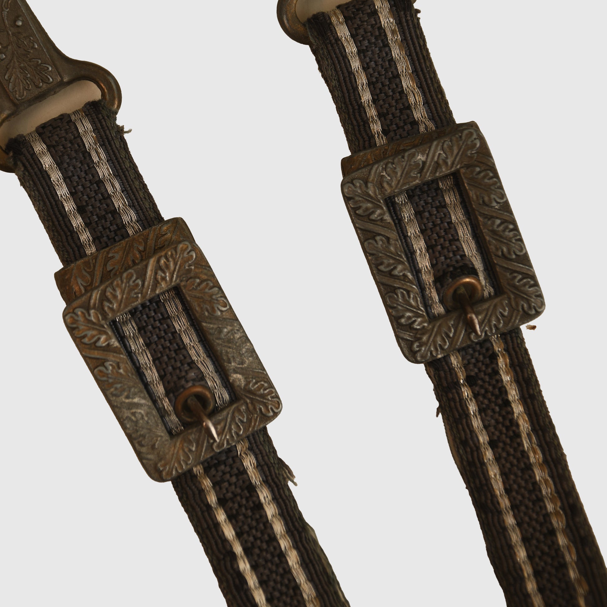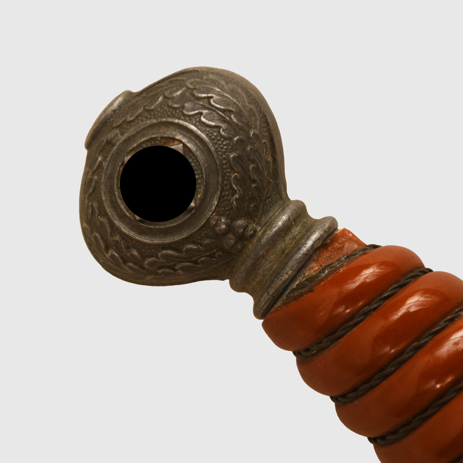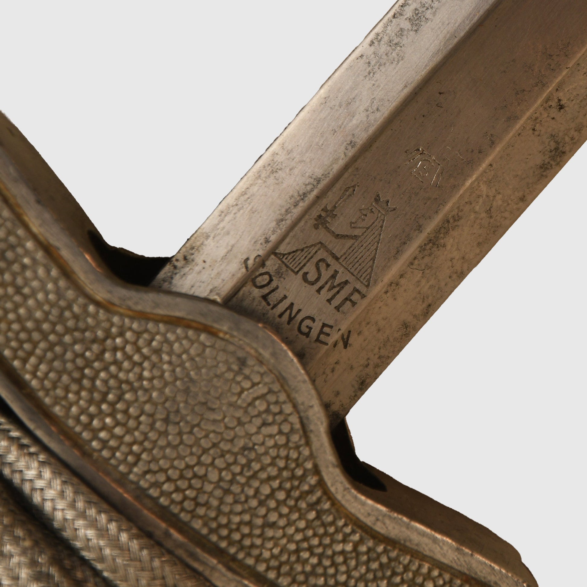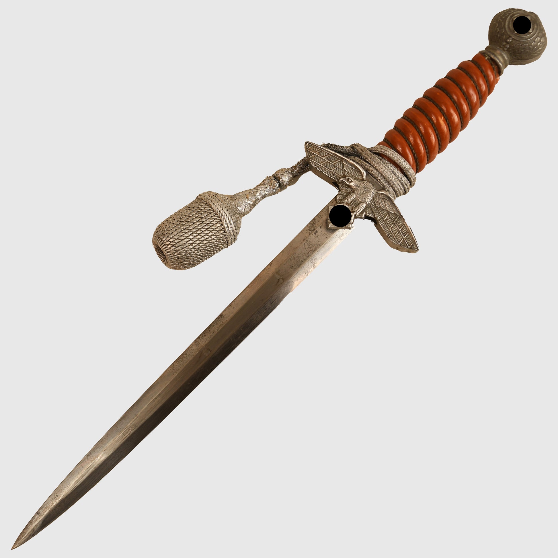 An excellent example of a Luftwaffe 2nd Pattern officers display piece by SMF. The main body features a well-preserved finish with matching grey tone to the upper pommel, cross guard, and scabbard rings. The scabbard’s body, made from a different material, retains a more steel-like finish. The deep orange grip shows two small chips but retains all grip wire intact. It includes a short pattern portapee knot and the late pattern unlined brocade straps, which show slight fraying. The blade is in good condition with clear SMF and Luftwaffe acceptance stamps, showing no abuse but with a slightly dulled finish.