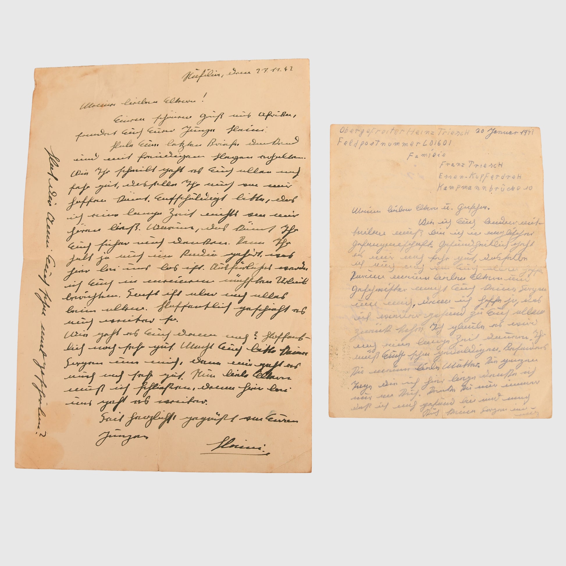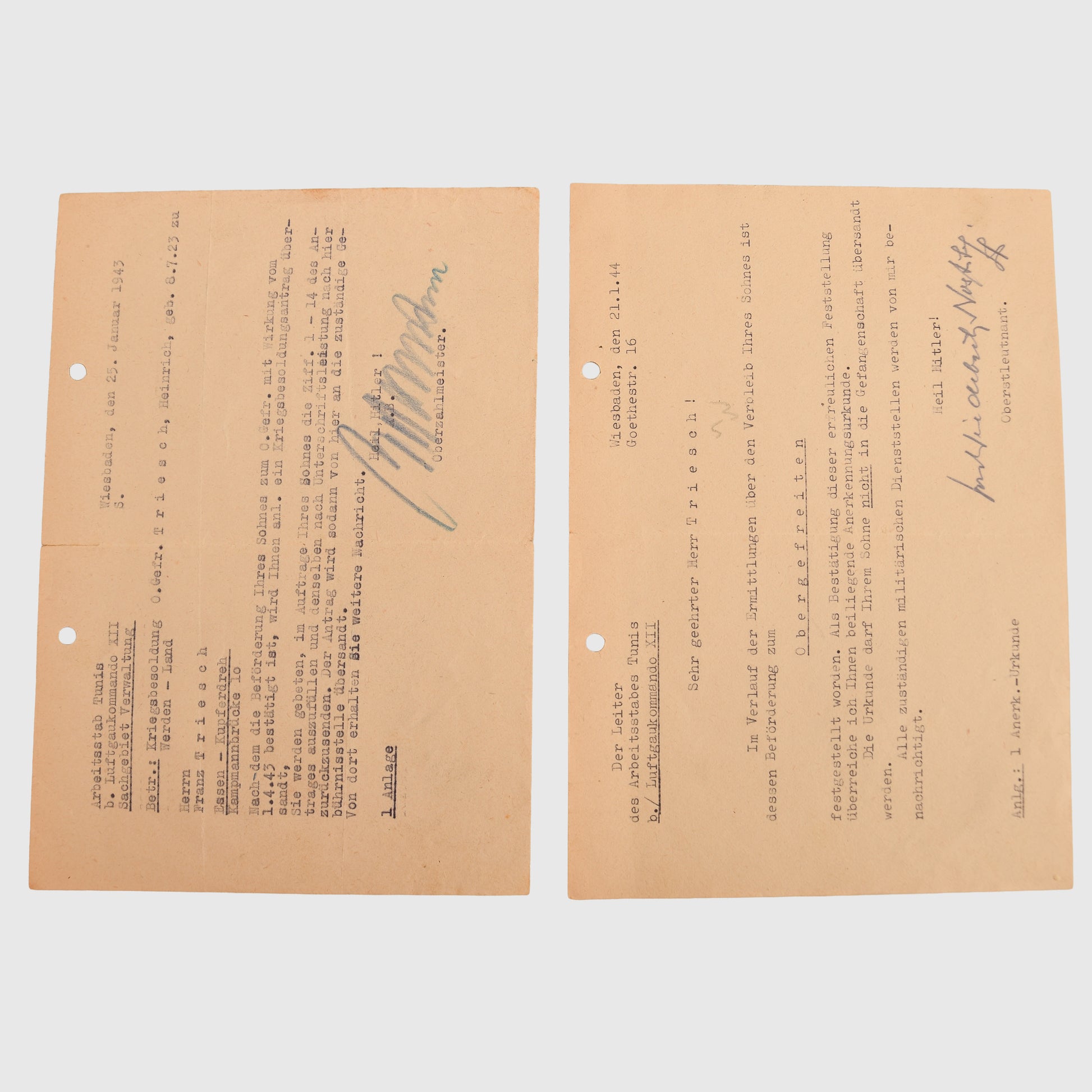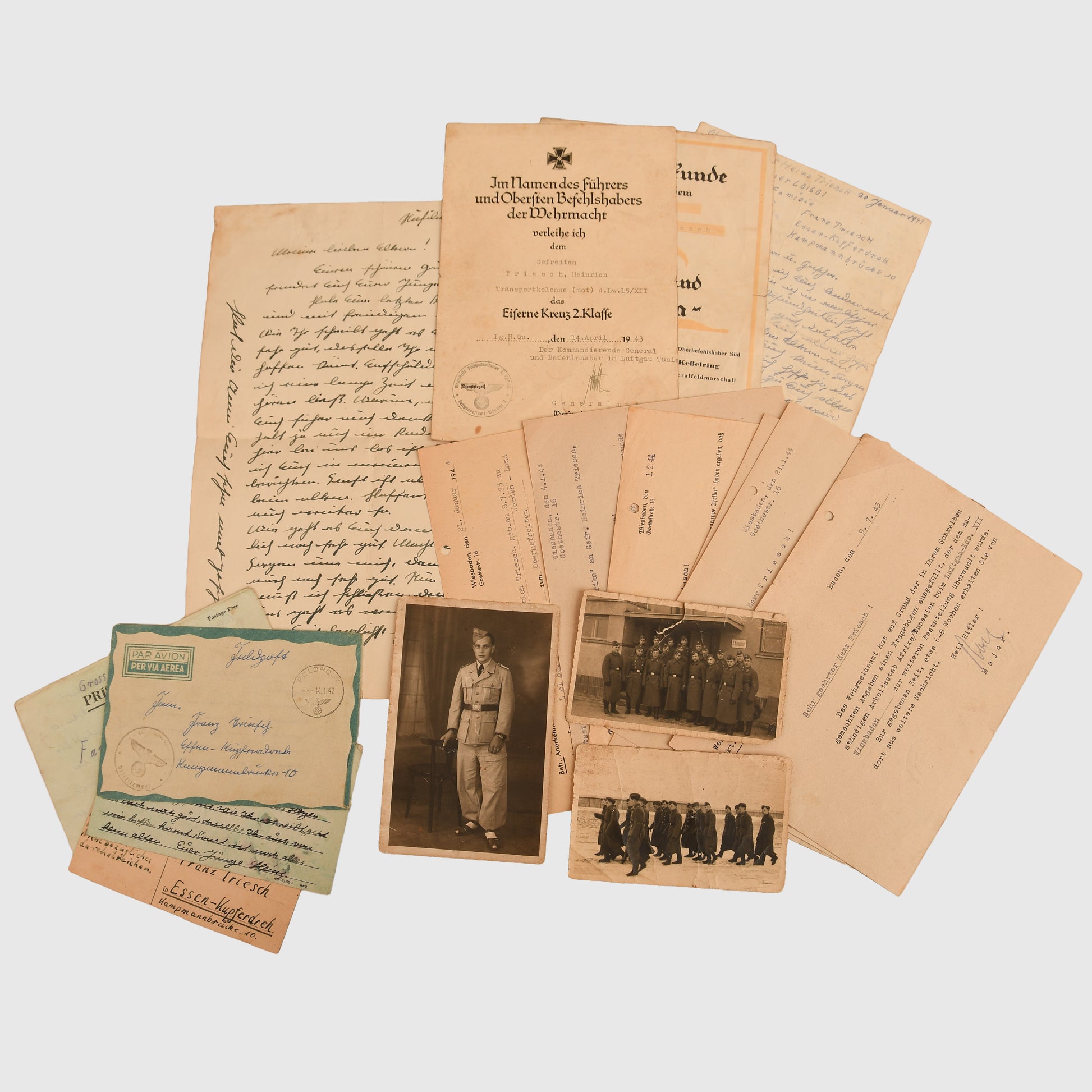 A historically interesting group relating to Gefreiten Heinrich Triesch of Transport Column 15. The grouping includes an A5-size Iron Cross 2nd Class citation, once folded, non-punched, awarded 14 April 1943, with the pen signature of the Commanding General of Luftgau Tunis.