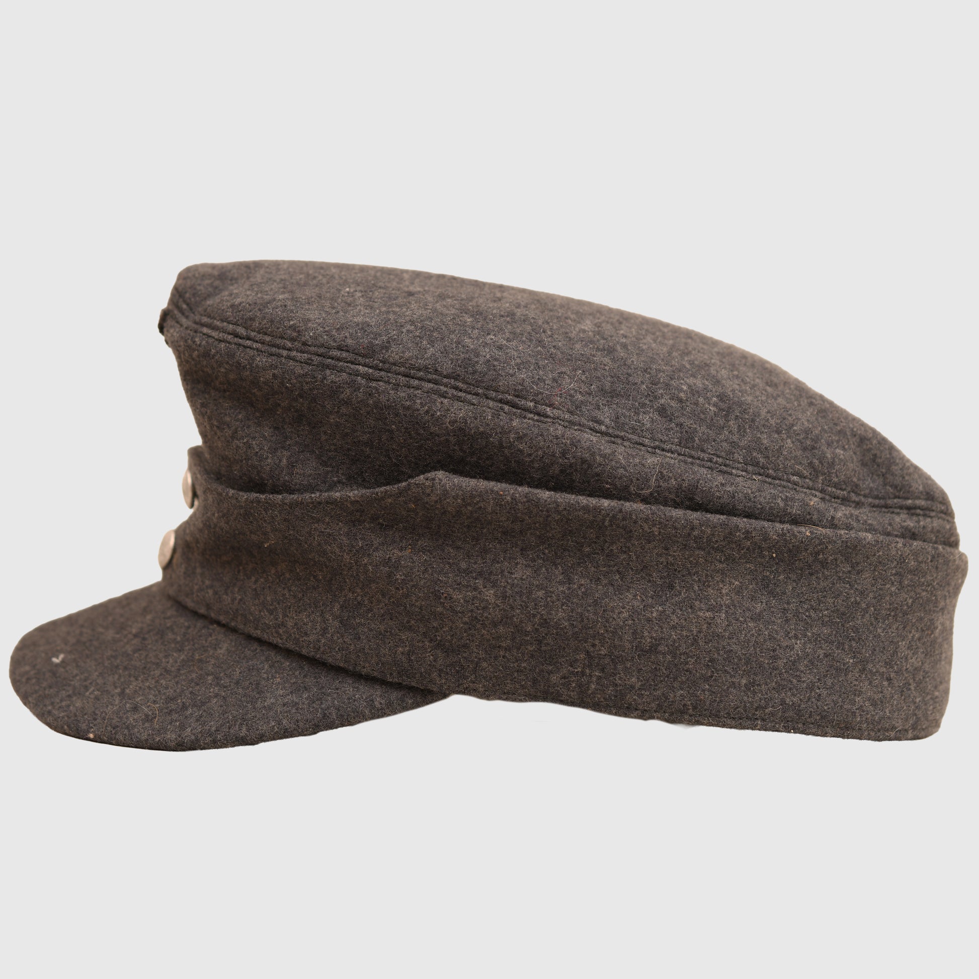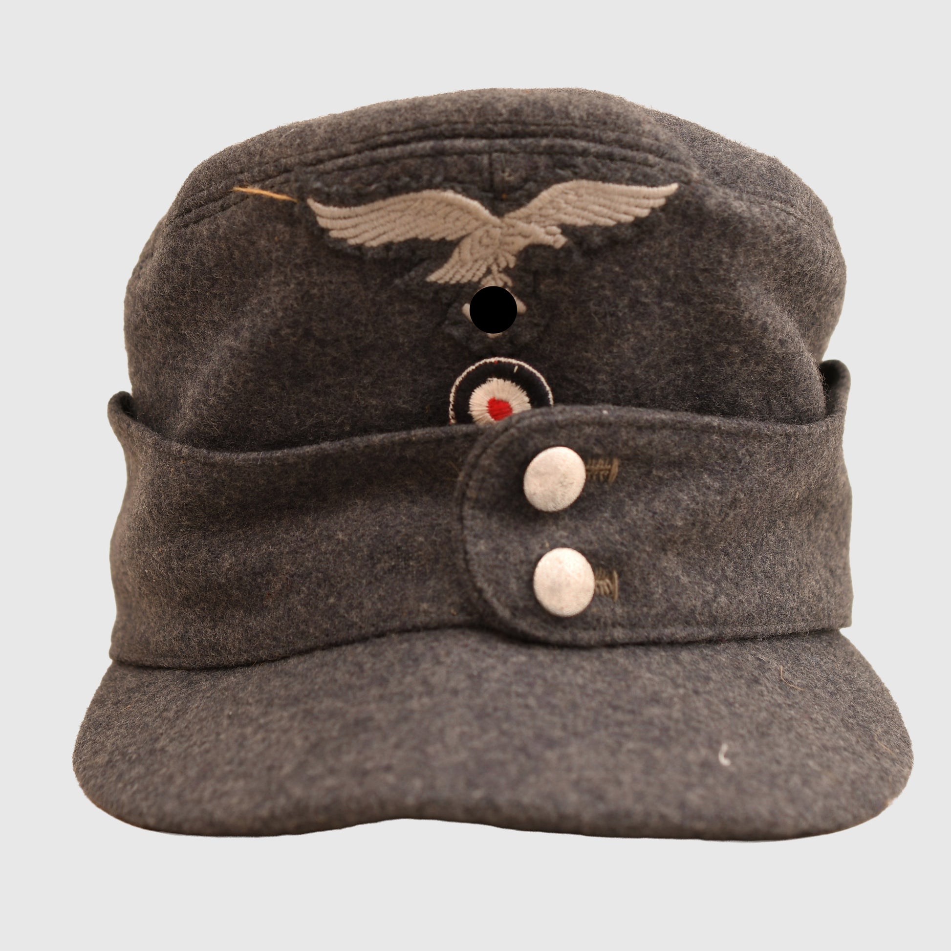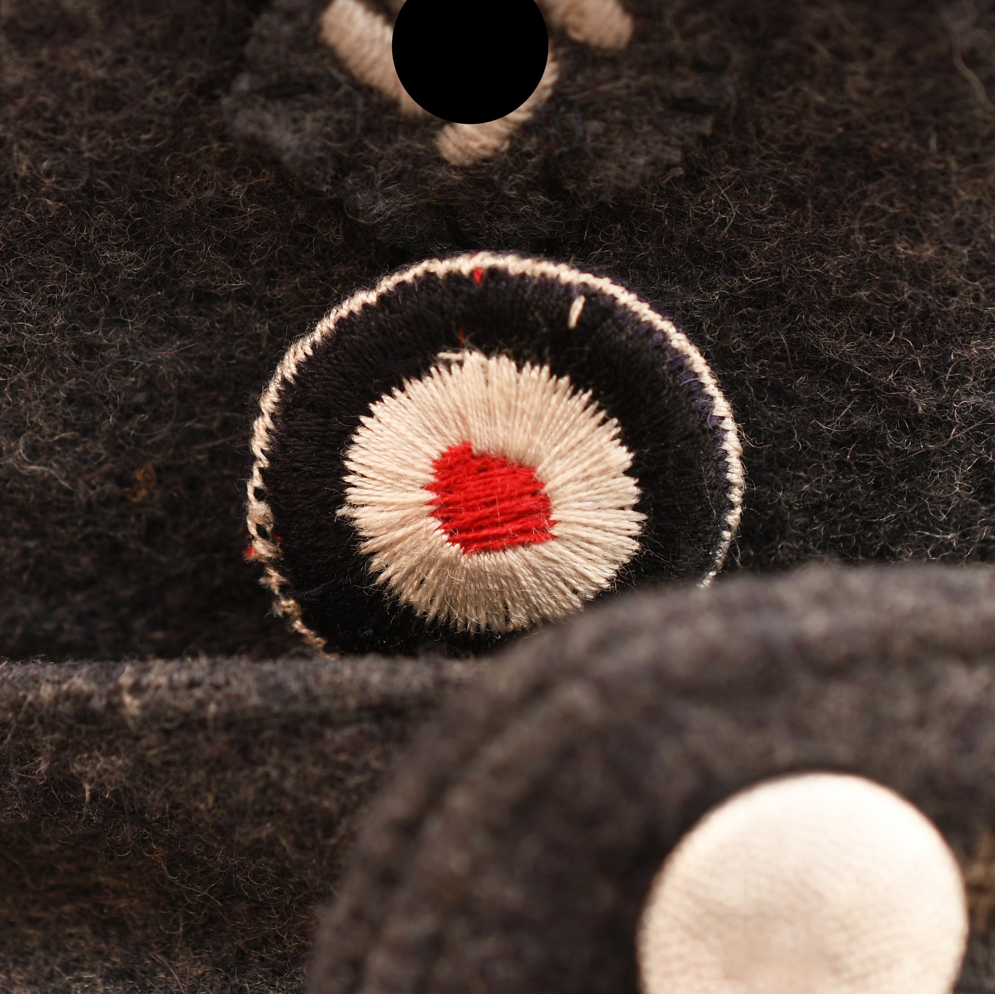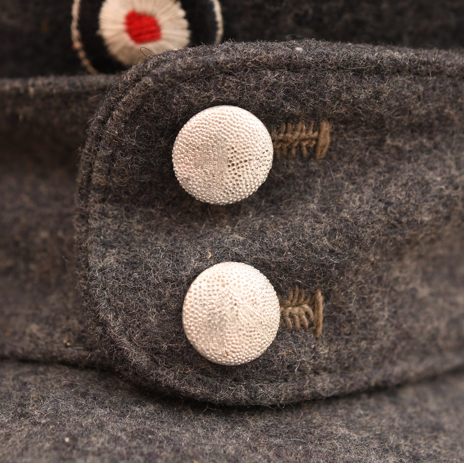 An excellent example of a Luftwaffe Bergmütze, constructed in the standard enlisted man’s blue-grey wool cloth. The material retains a strong nap with no moth damage or repairs. The front features the correct machine-embroidered Luftwaffe eagle above a national cockade, both applied to matching blue-grey backing cloth. Two pebbled silvered buttons secure the front flap, characteristic of this mountain cap style.