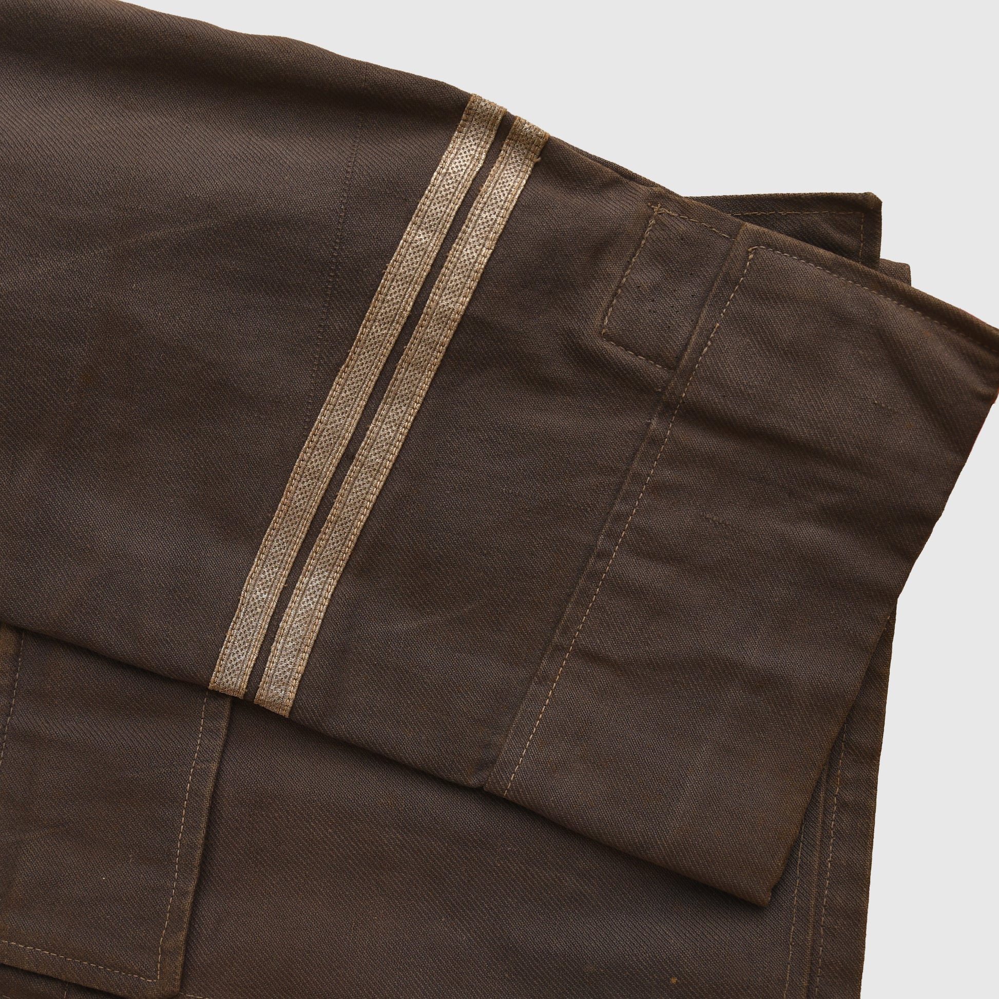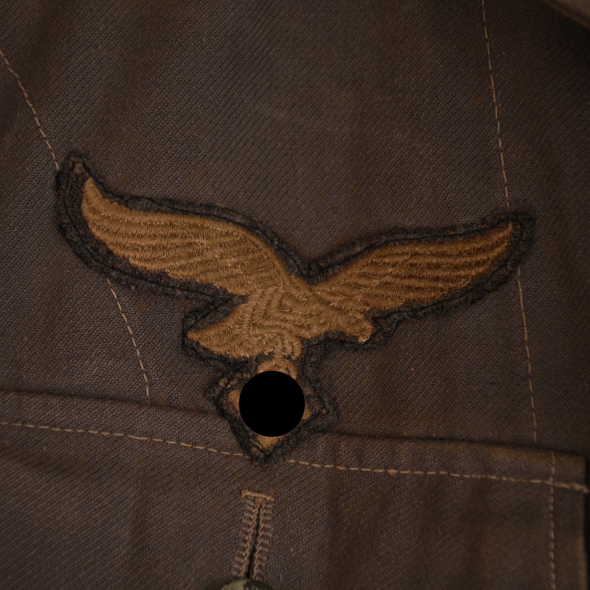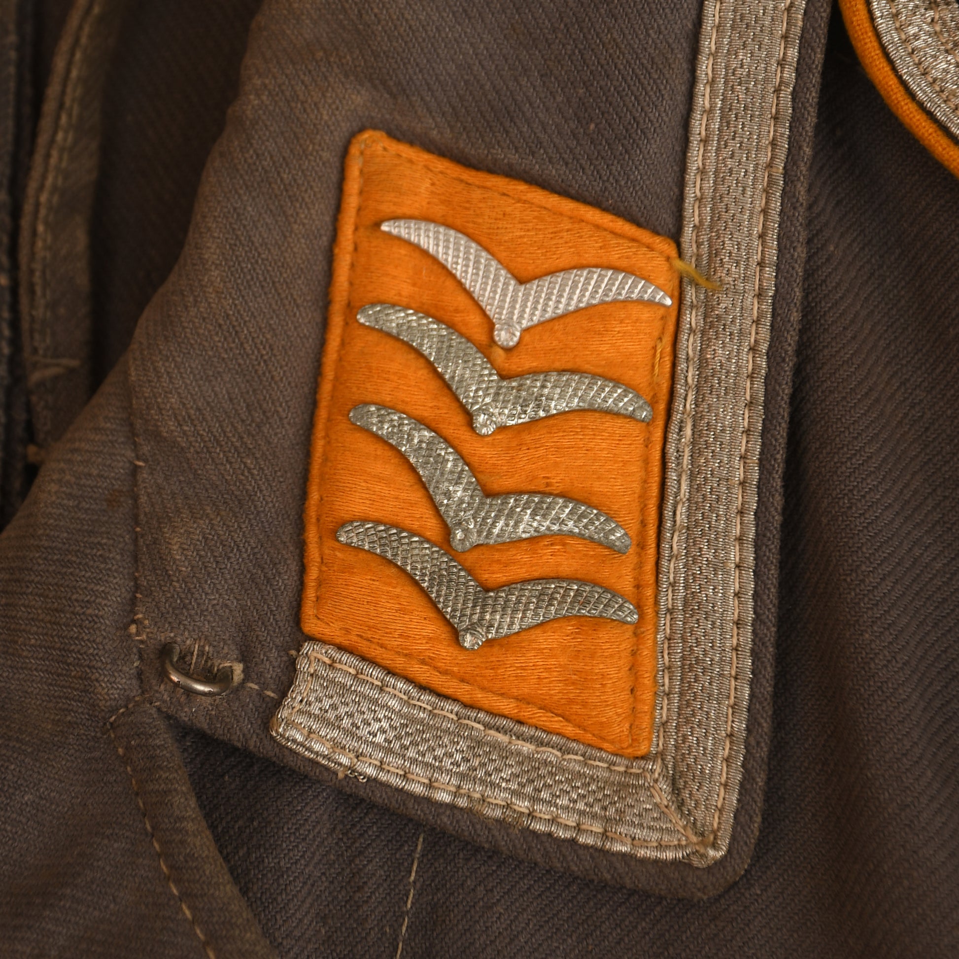 A fine example of a well-used Luftwaffe four-pocket tunic in blue ribbed tropical-weight material—distinct from the lighter workwear type. Originally sold by us to the current consigner in the 1990s. Constructed with four pleated pockets and a six-button front closure. Fitted with a matching set of slip-on yellow wool–piped shoulder boards for an Oberfeldwebel, and machine-stitched yellow-based collar patches. A single row of Luftwaffe-style NCO lace adorns the collar, while both lower sleeves display twin rows of correct Luftwaffe Der Spiess lace. The machine-embroidered breast eagle is period-applied. Buttons have lost much of their blue paint, and the tunic shows honest service wear but remains free of tears, patches, or moth damage. Faint manufacturer and size markings can be seen near the inner armpit area. A rare and highly desirable Luftwaffe tropical tunic.