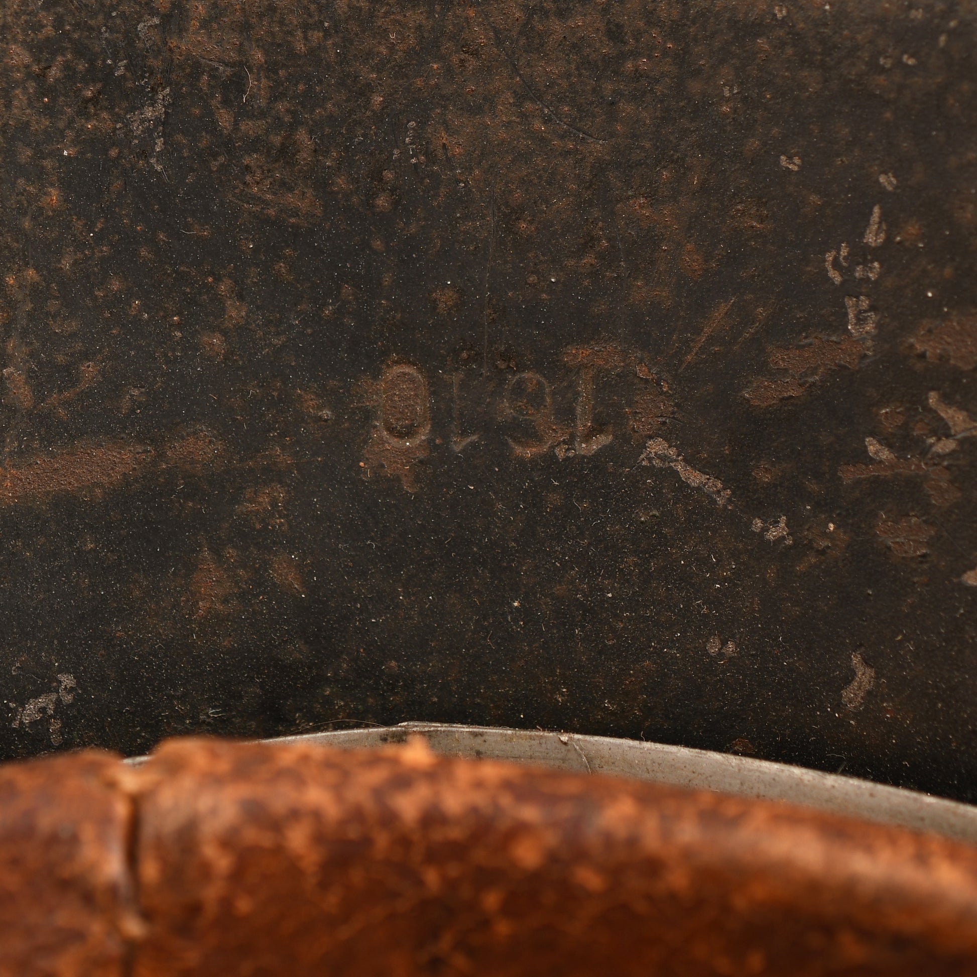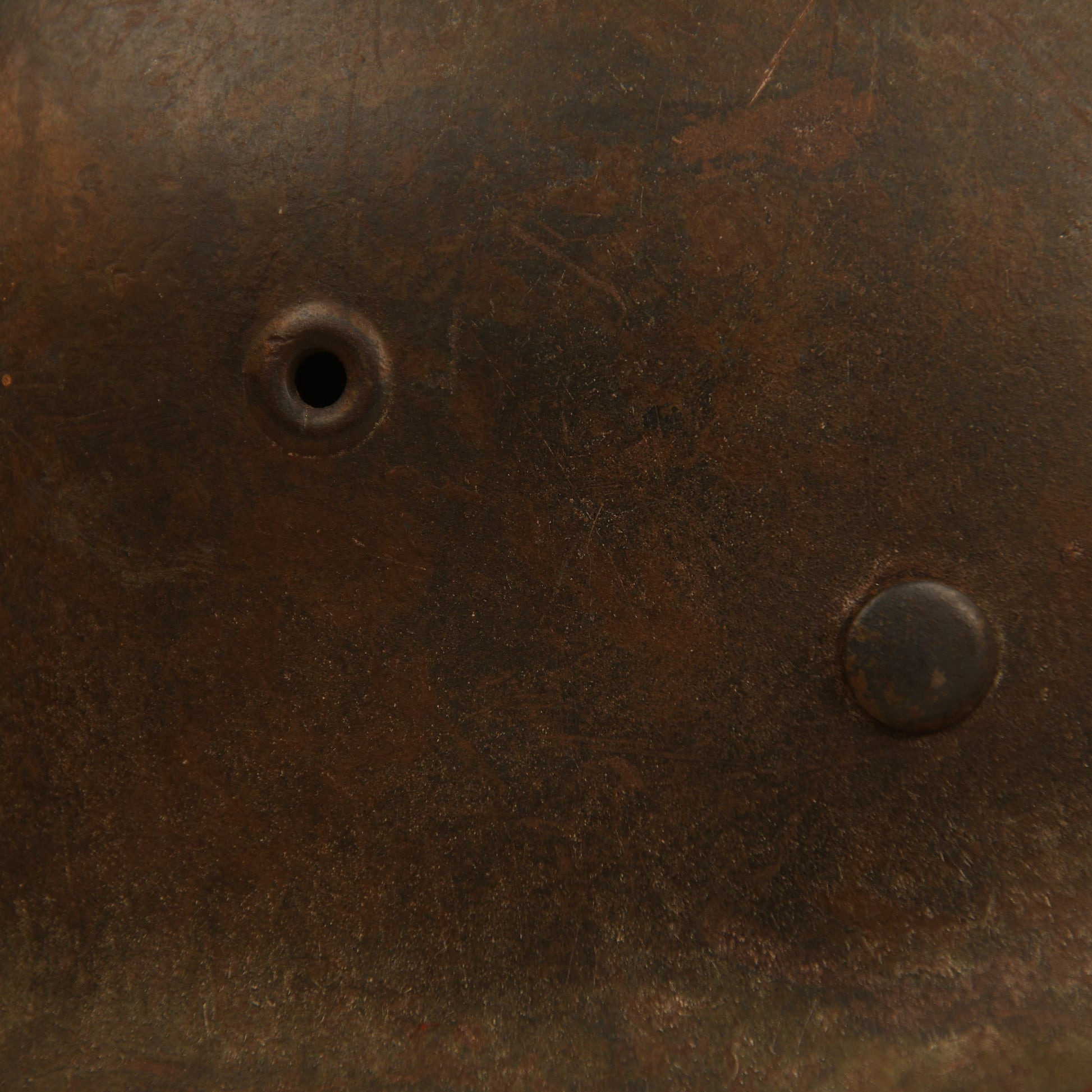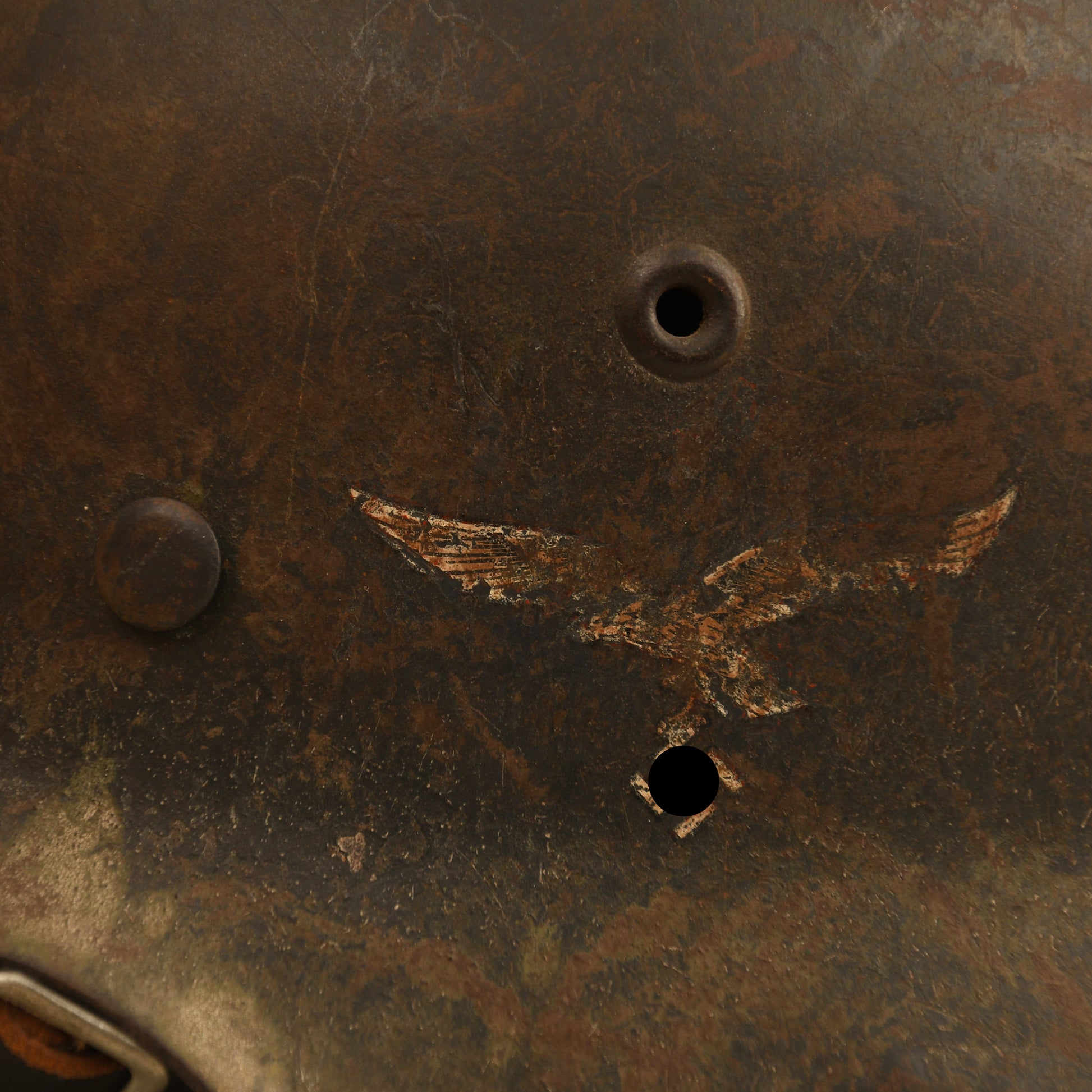 A semi-camouflaged large size Luftwaffe M42 helmet with single decal. The shell is stamped ET64, batch number 1610. The eagle decal shows some abrasions, and the camouflage paint is faint and subdued, consistent with the overall condition of the helmet. Fitted with an original undated, unmarked mid-to-late war chinstrap, likely a period addition. The interior lining is pigskin, 8-tongued and supple, with its original drawstring. The soldier’s name is painted in red on the inner skirt. A nice original helmet.