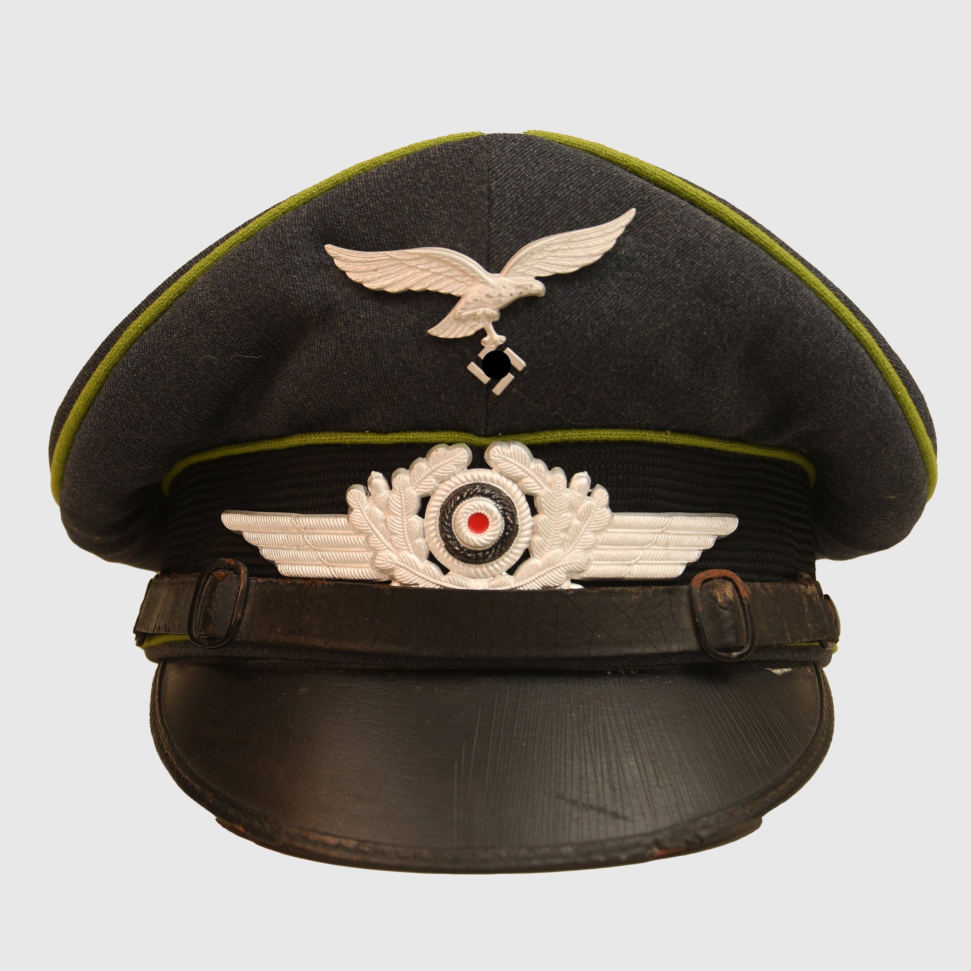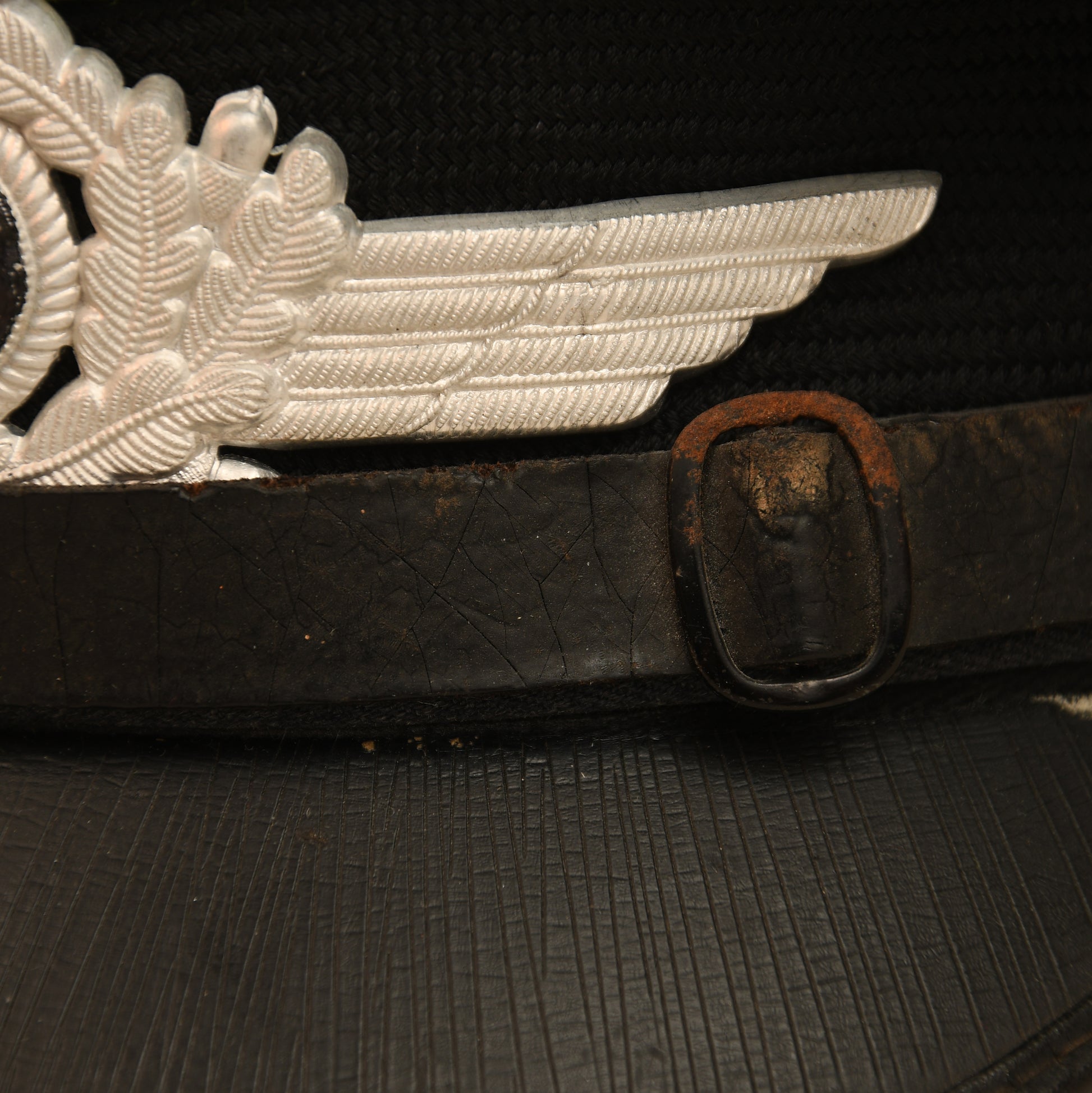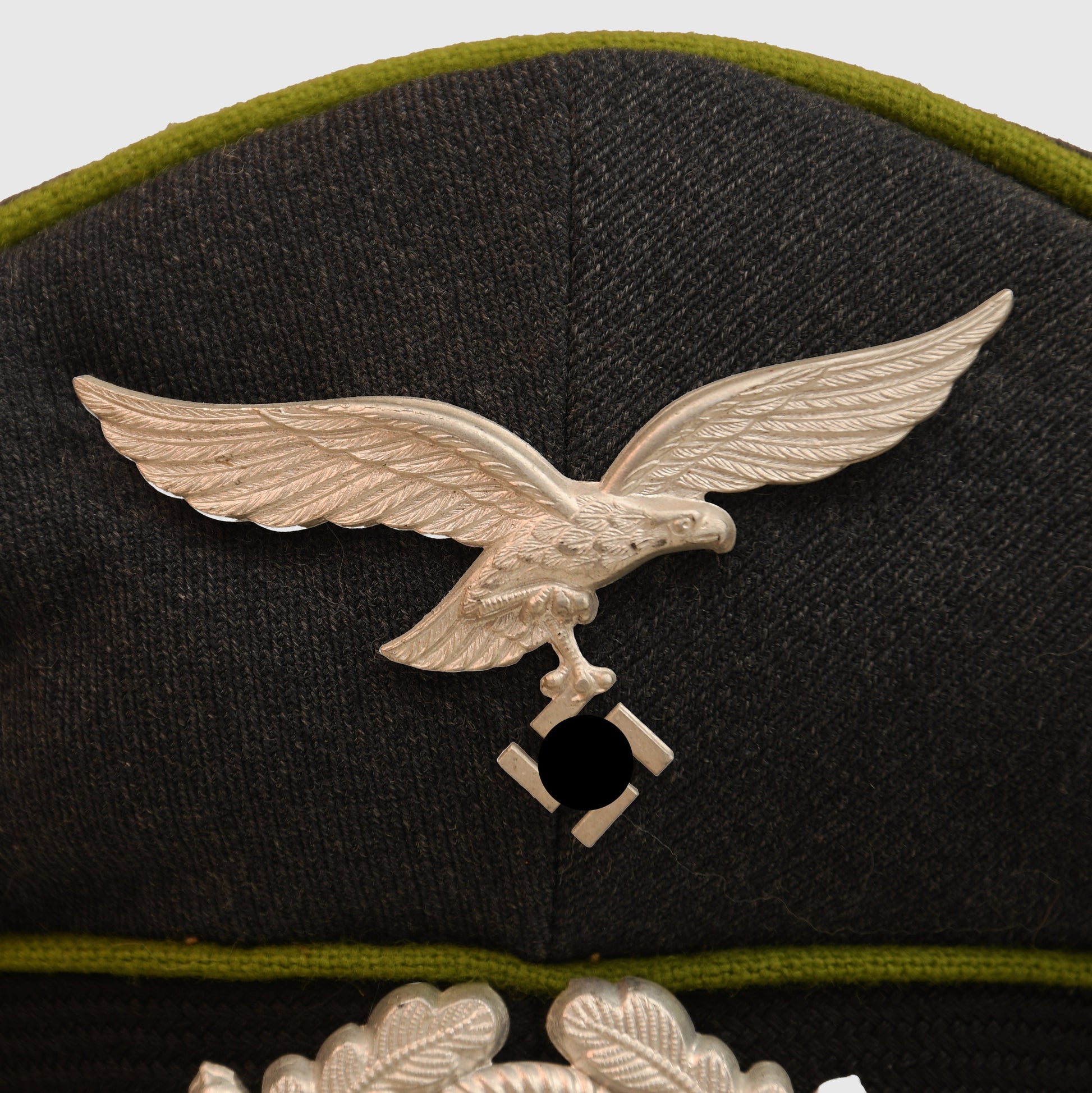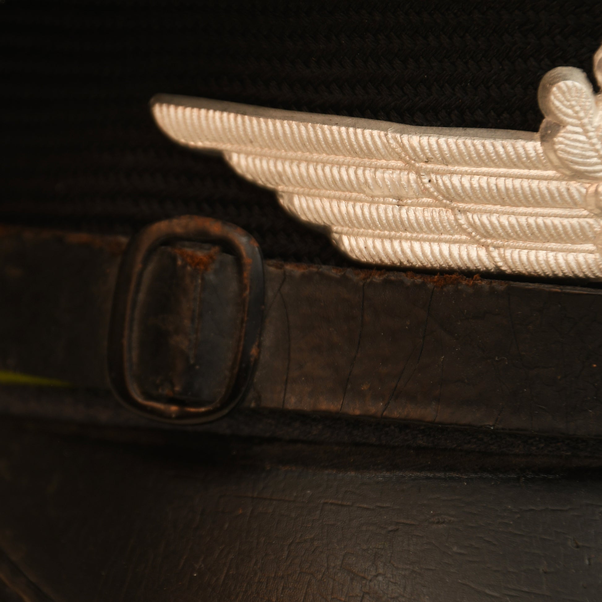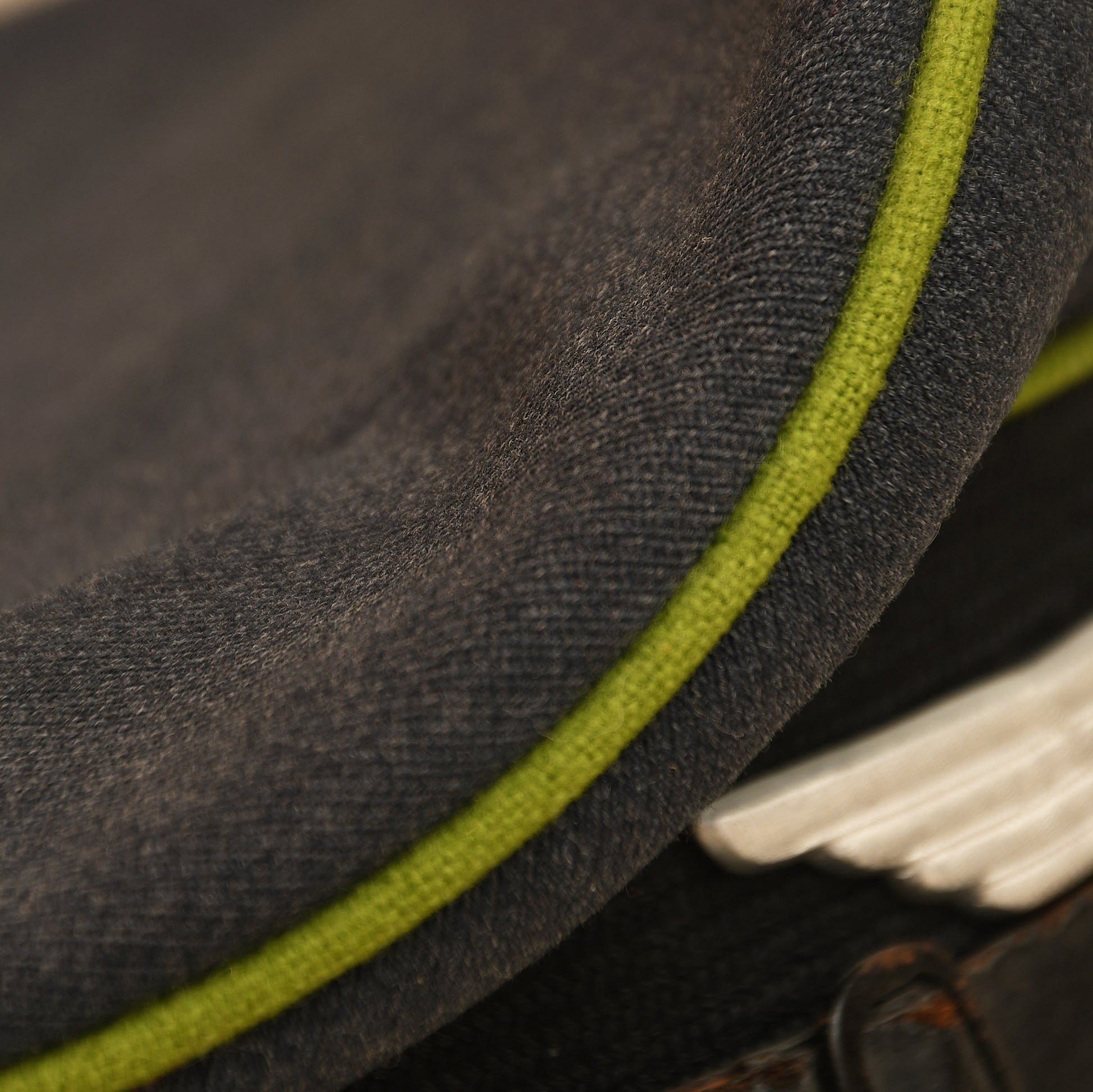 The distinctive apple green piping stands out sharply on the crown and the upper and lower edges of the mohair centre band. There is no moth damage to any part of the cap, with only one or two minor nicks present on the mohair band. Fitted with a matching set of bright aluminium Luftwaffe eagle and cockade, along with a standard double buckle chinstrap. The fibre peak is of the standard double-ribbed type commonly encountered on Luftwaffe caps for both officers and enlisted men.