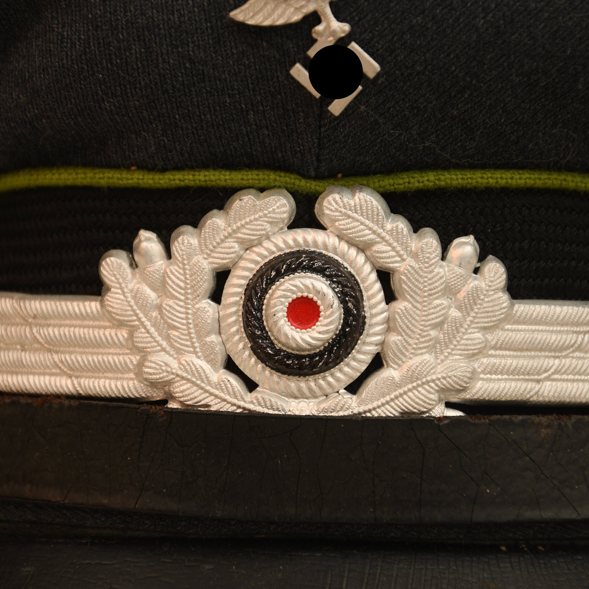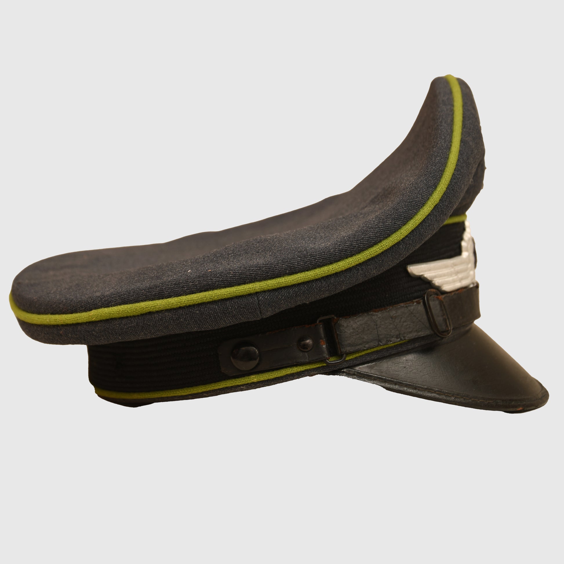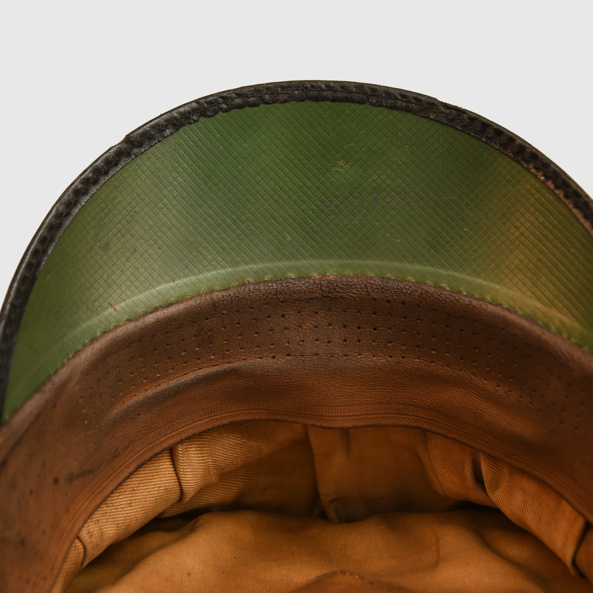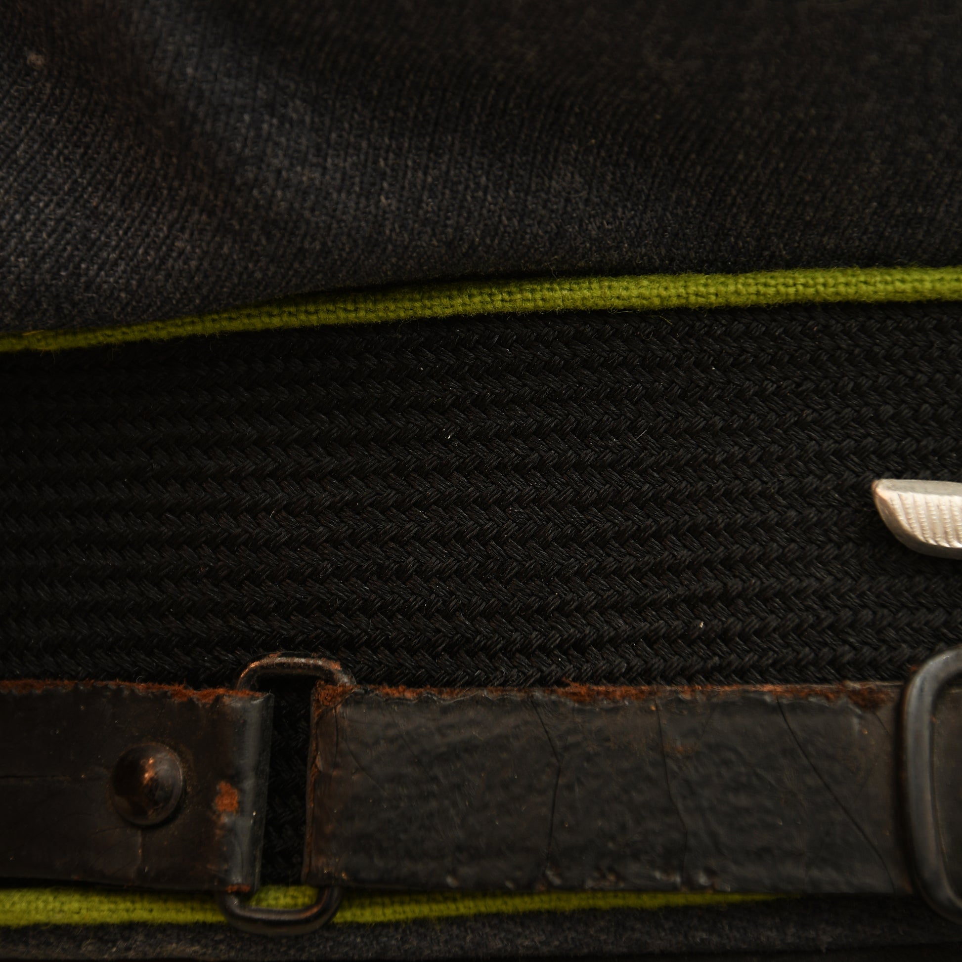 The distinctive apple green piping stands out sharply on the crown and the upper and lower edges of the mohair centre band. There is no moth damage to any part of the cap, with only one or two minor nicks present on the mohair band. Fitted with a matching set of bright aluminium Luftwaffe eagle and cockade, along with a standard double buckle chinstrap. The fibre peak is of the standard double-ribbed type commonly encountered on Luftwaffe caps for both officers and enlisted men.