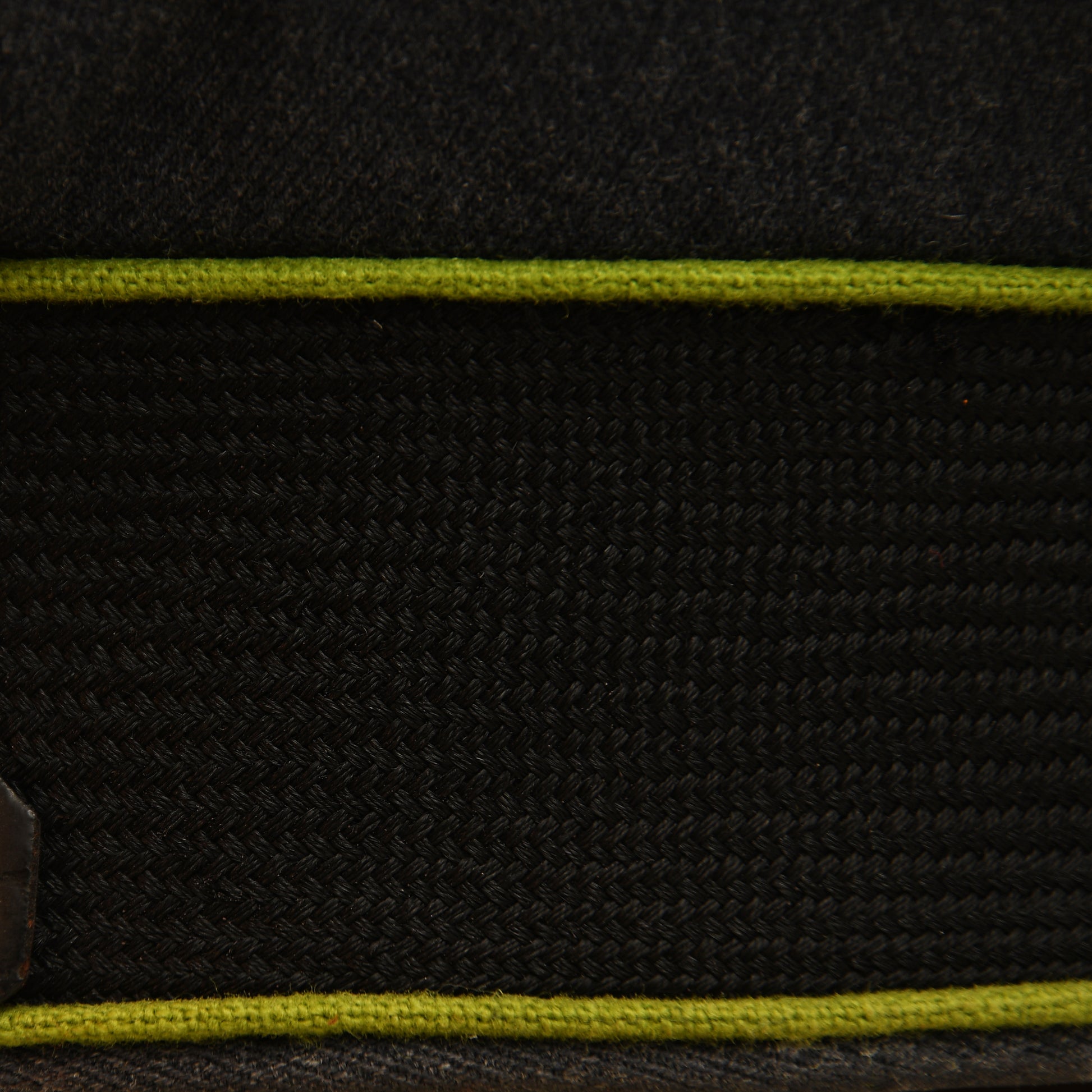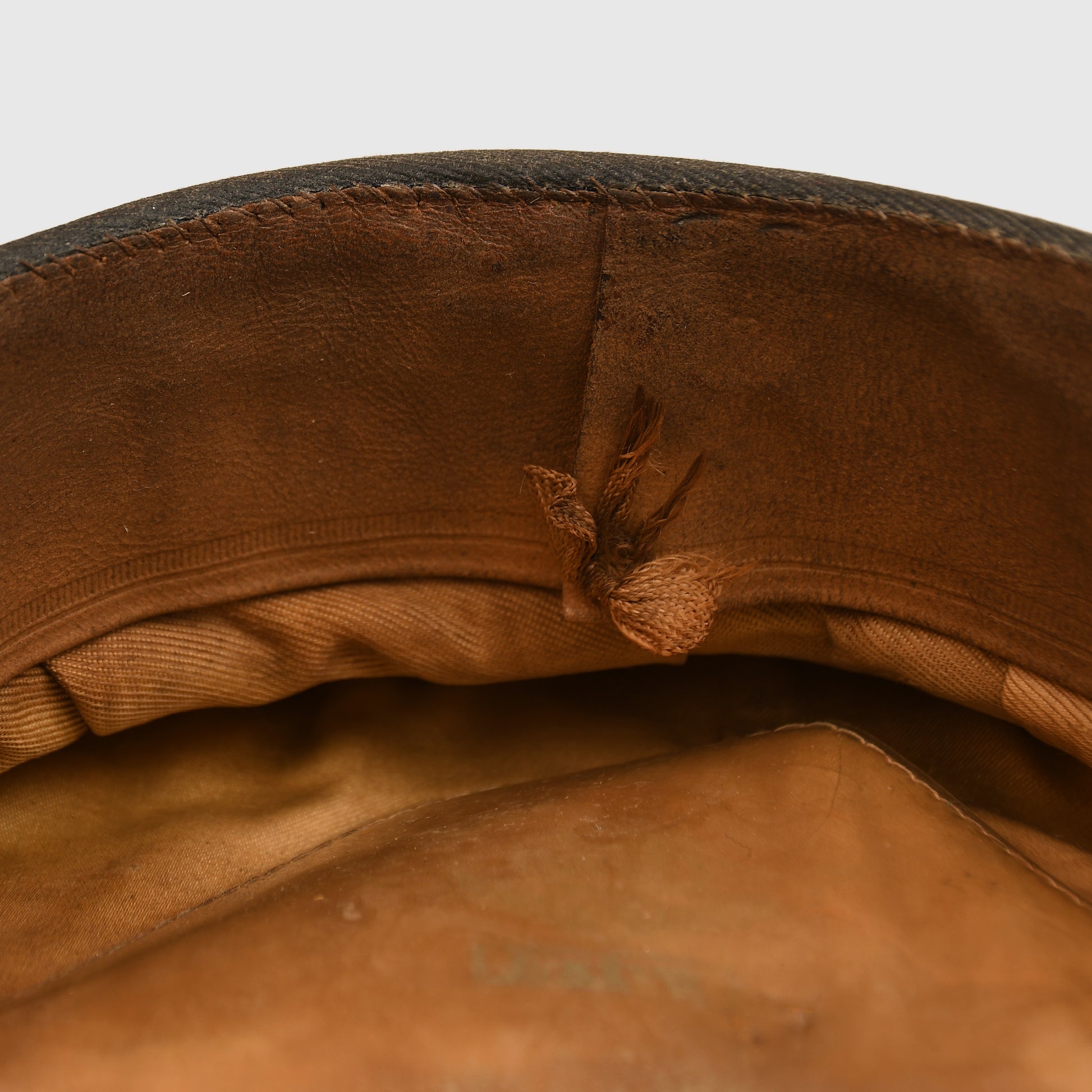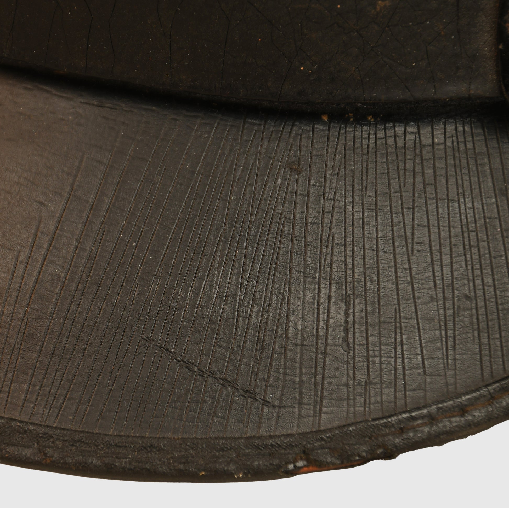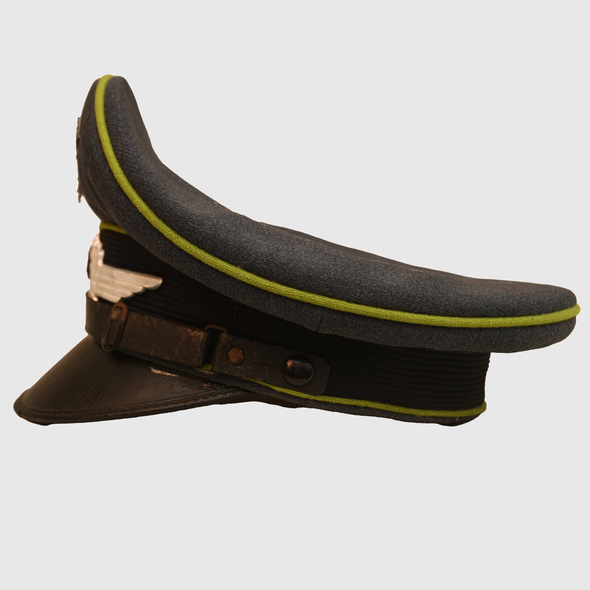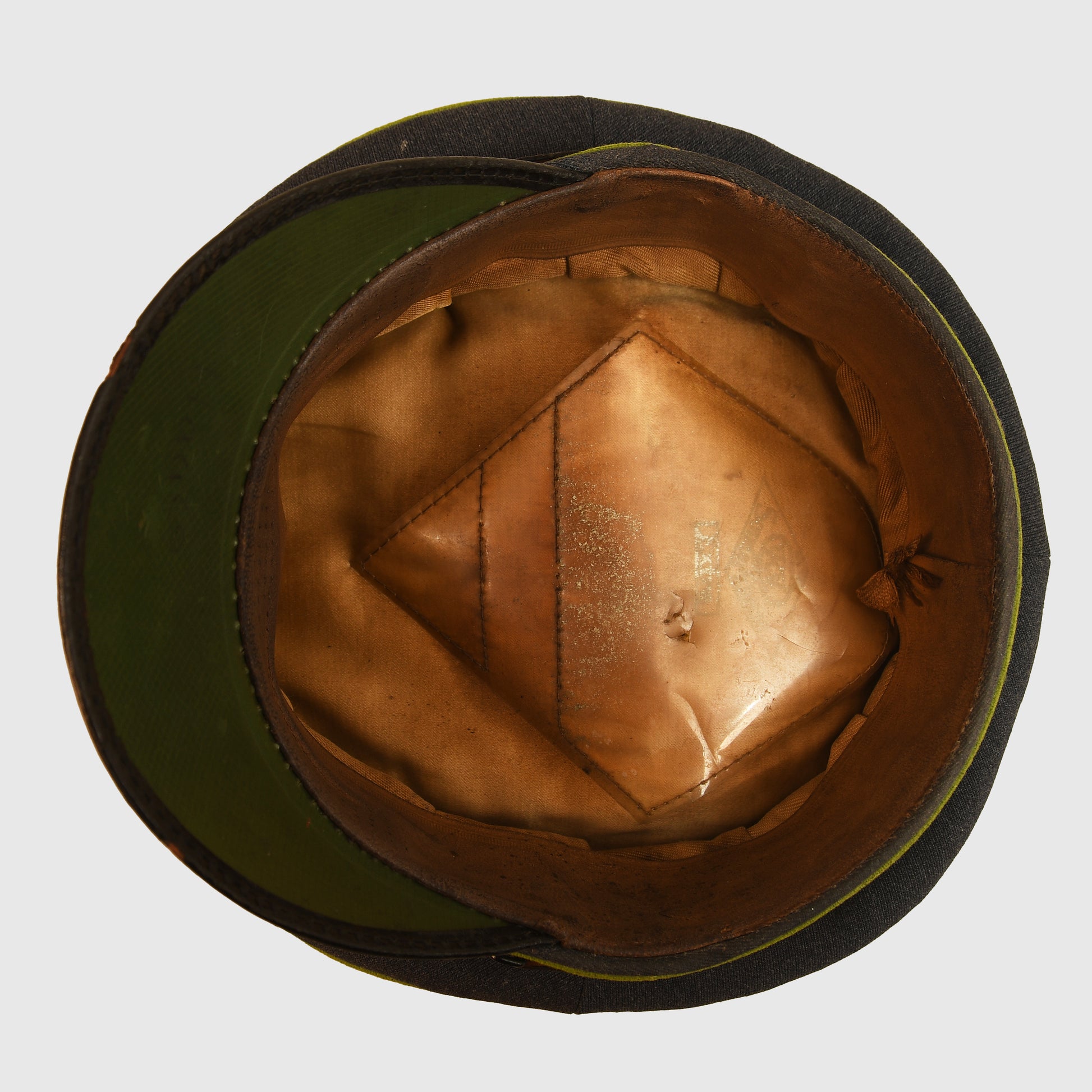 The distinctive apple green piping stands out sharply on the crown and the upper and lower edges of the mohair centre band. There is no moth damage to any part of the cap, with only one or two minor nicks present on the mohair band. Fitted with a matching set of bright aluminium Luftwaffe eagle and cockade, along with a standard double buckle chinstrap. The fibre peak is of the standard double-ribbed type commonly encountered on Luftwaffe caps for both officers and enlisted men.
