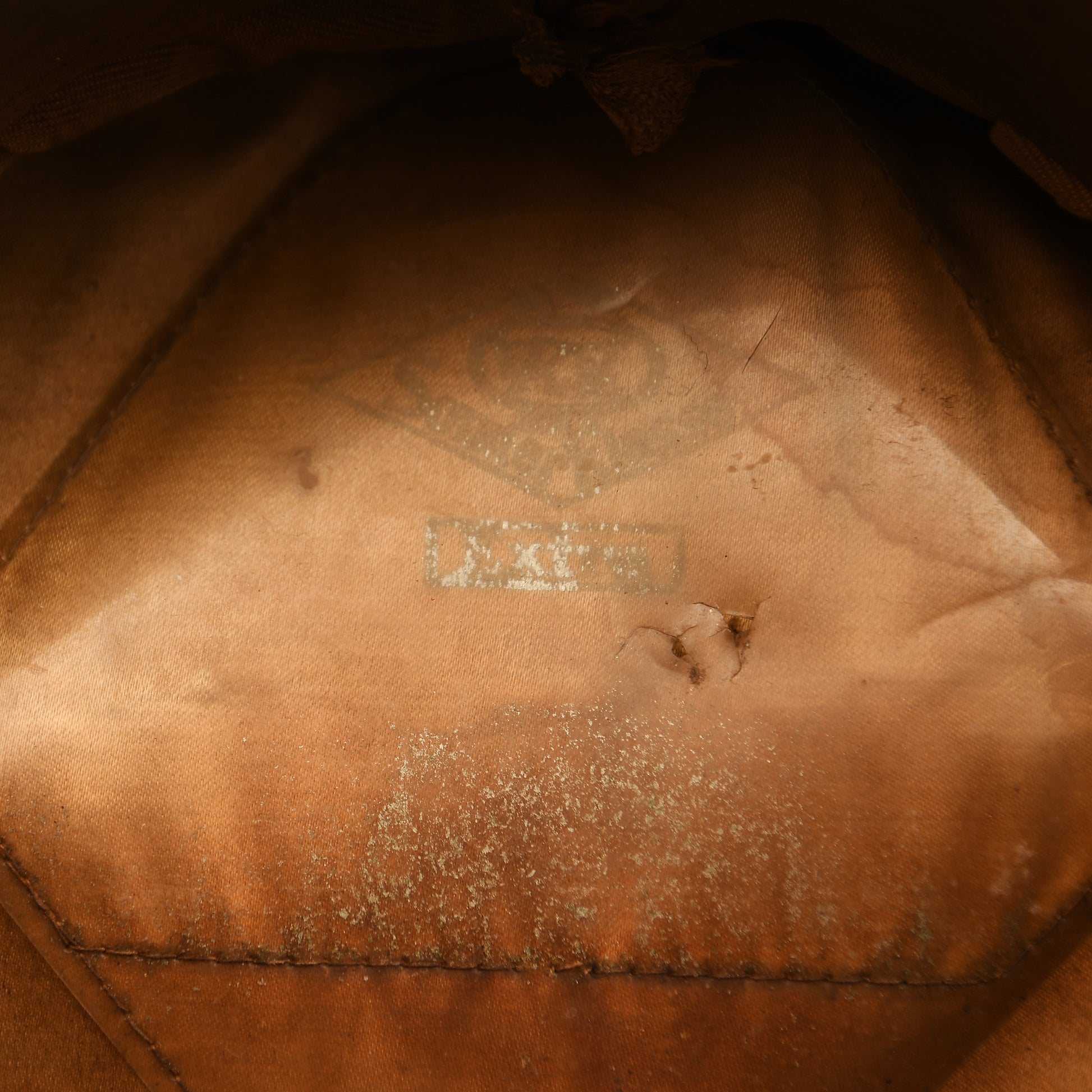 The interior features a mid-tan leather sweatband, soft and supple, showing clear signs of wear. The crown lining is in gold satin, and the cap retains its complete celluloid centre lozenge, though it is considerably stained. Faint traces of the Erel trademark remain visible beneath the celluloid.
