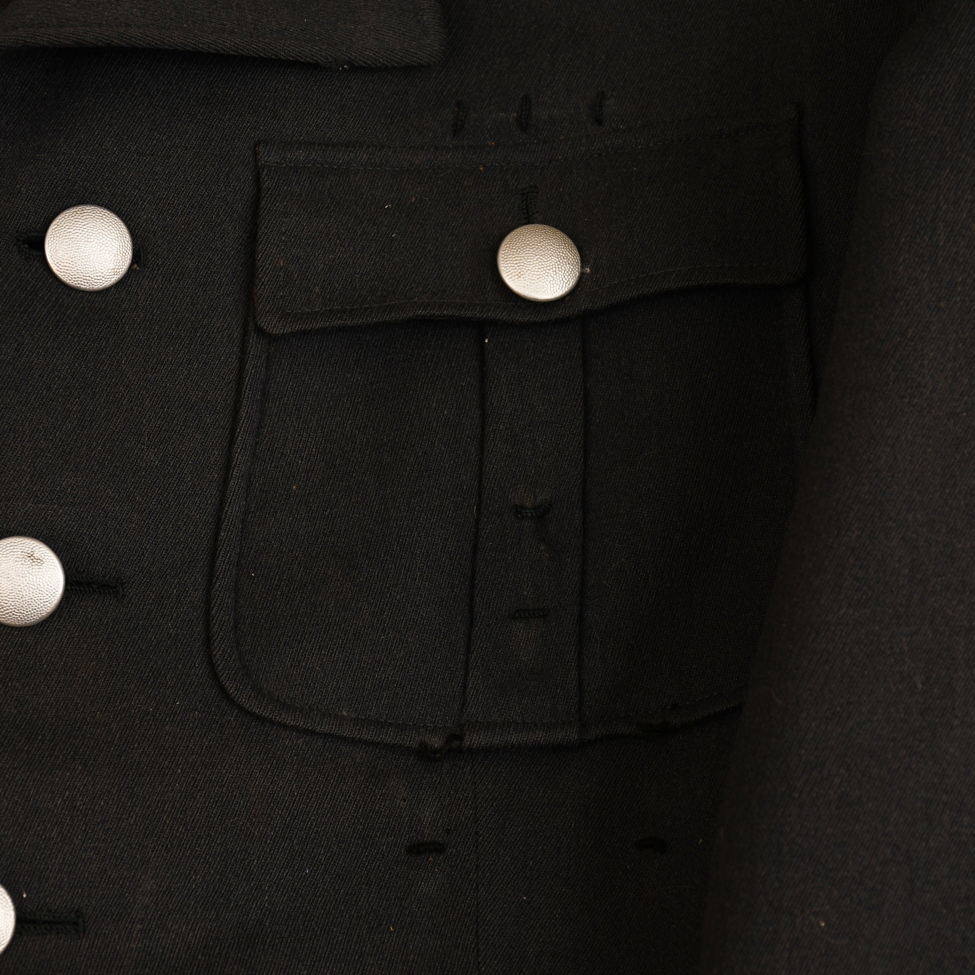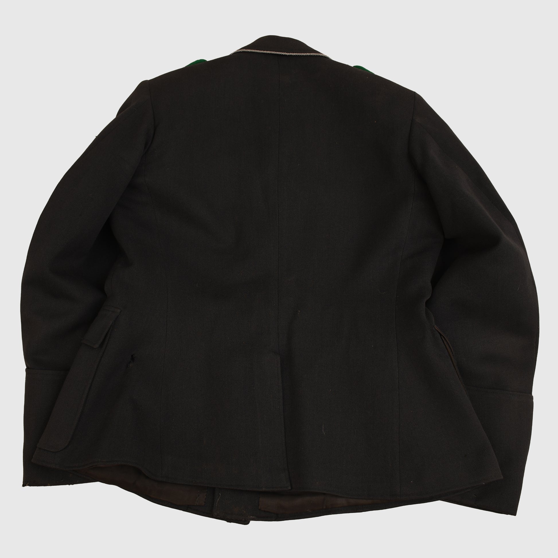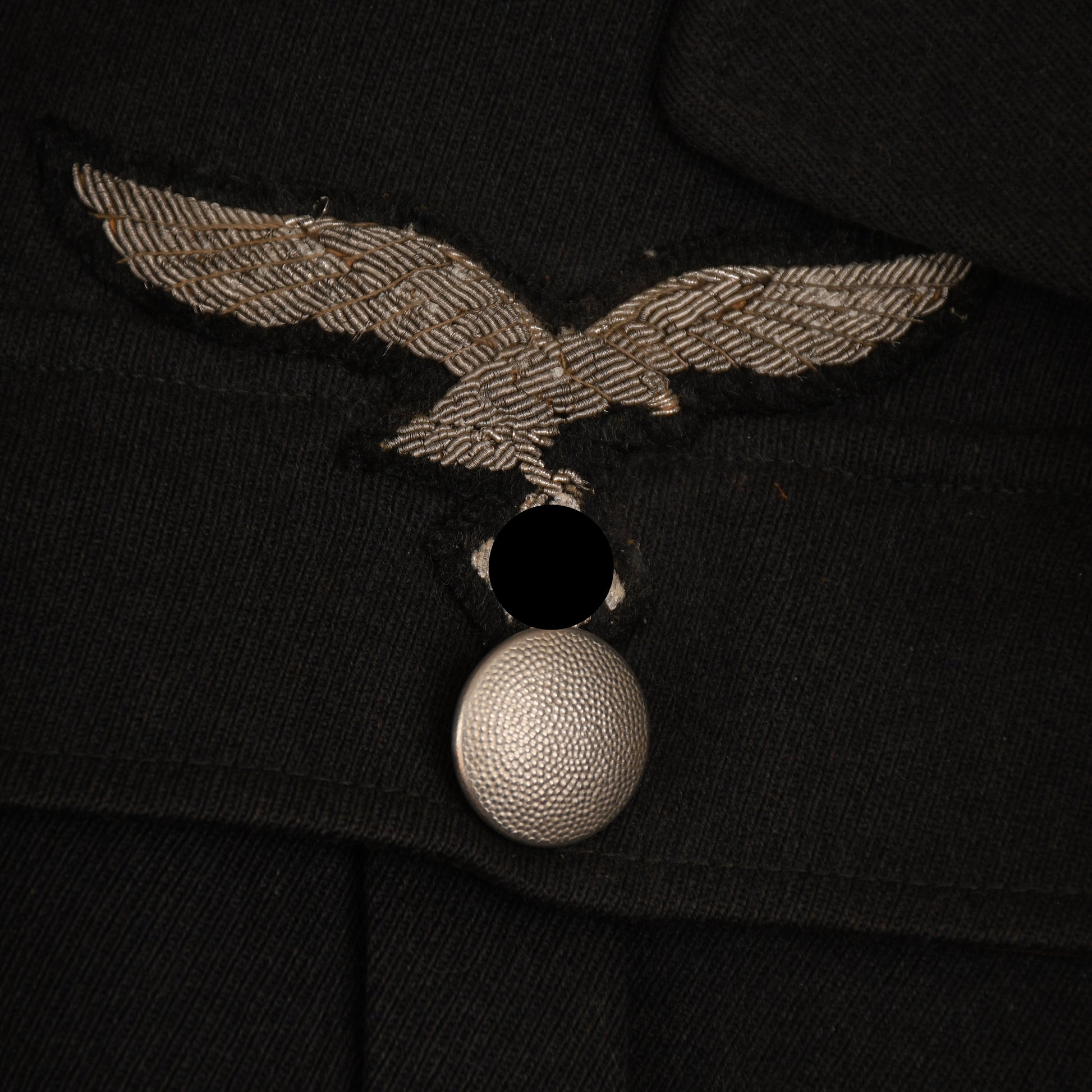 A standard Luftwaffe officer's tunic, open collar wear, four button closure, four patch pockets with pleats and flaps, deep turned back cuffs, and a single pleat to the reverse side. The tunic has seen much service wear; there is a reasonable amount of staining around the collar area. There are some areas of moth damage below the lower pocket, both to the button and to the opening of the opposite side, the base of one cuff and tiny nips in some other places, including the green waffenfarbe of the shoulder boards. The insignia is totally original to the tunic; it can only be a Luftwaffe Field Division officer, with its slightly oxidised Luftwaffe officer's breast eagle. Three loops for a short medal ribbon bar above the right-hand pocket, three sets of loops for three separate awards to the upper right-hand pocket. A nice maker’s label of ‘Pieksen & Kohlmeyer, Oldenburg’. A dagger hanger close to the inside pocket. A tailor’s hole through the lower left-hand pocket for the passing through of the dagger or sword hanger. A generally nice tunic to a rare arm of the Luftwaffe.