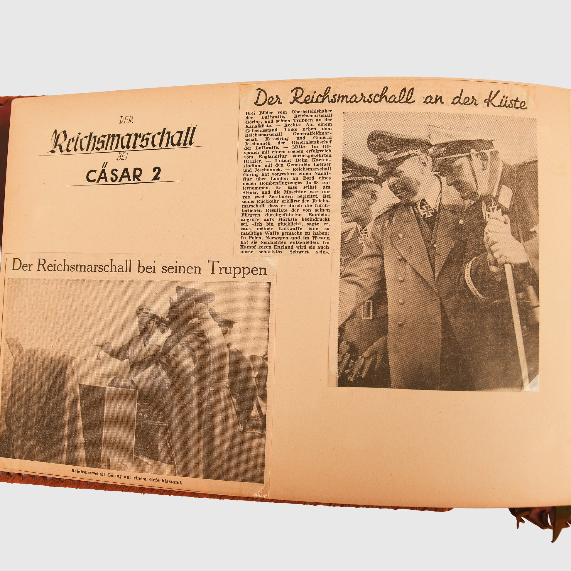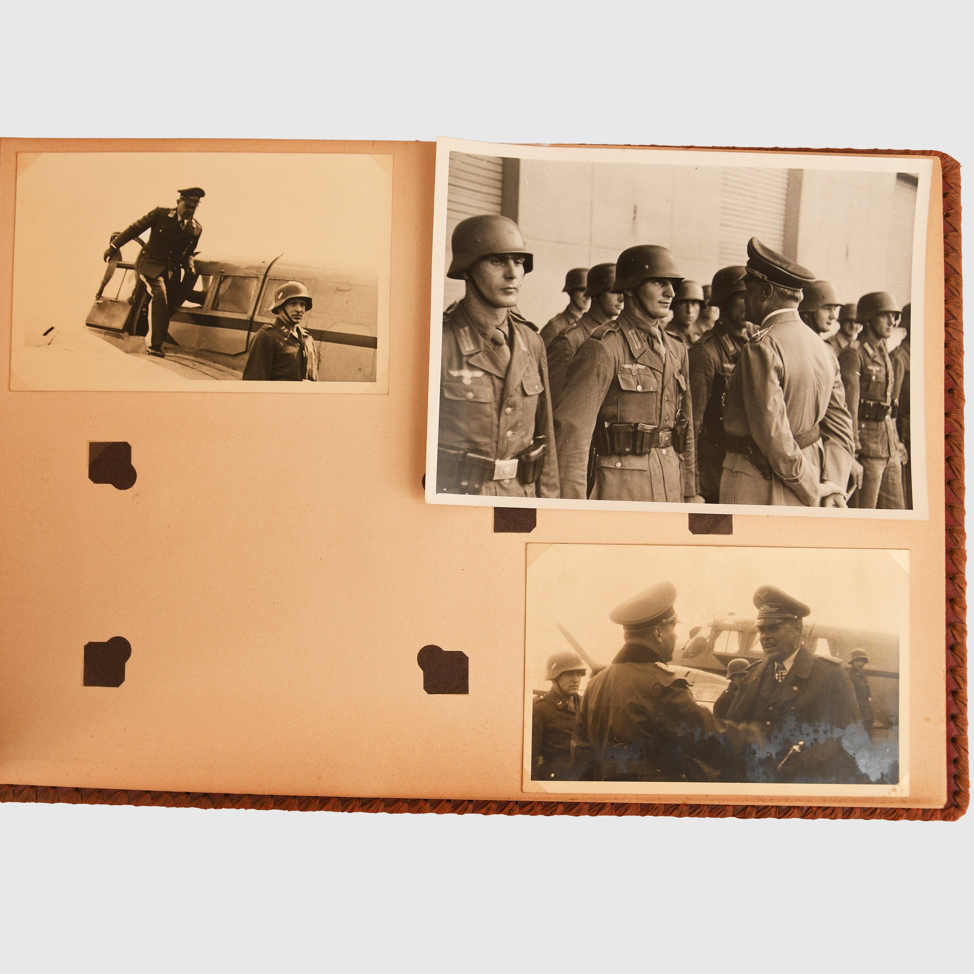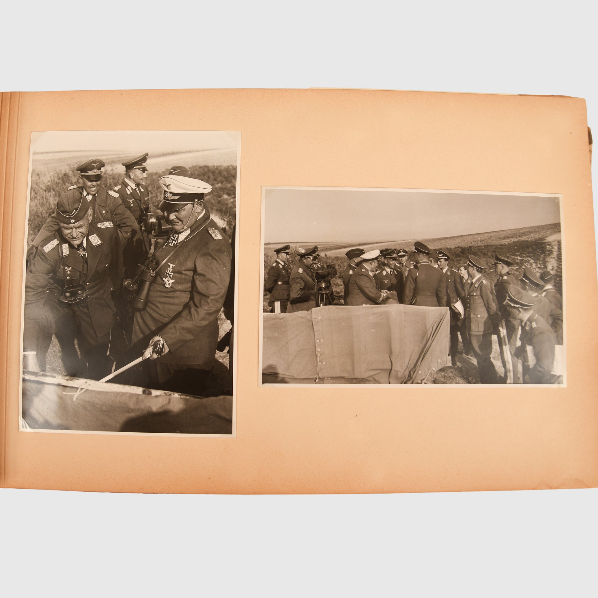 A highly important personal photo album from the estate of Luftwaffe Field Marshal Albert Kesselring, purchased from the German auction of October 2020 which dispersed many of his belongings. The plain leather-bound album contains 102 photographs in various sizes, ranging from 11 x 17 cm down to 8 x 6 cm. The album begins in 1940 and includes significant images such as observations of the air raids on the English Channel coast with Hermann Göring, Field Marshal Bruno Loerzer and other senior commanders; the presentation of Kesselring’s Marshal’s Baton on 4th September 1940; visits to an airfield hospital in December 1940; meetings with Hungarian and Japanese officers at the Hotel Metropole in Brussels; and scenes at 9th Flieger Corps headquarters in 1941. Many other high-quality and historically significant images with senior Luftwaffe officers are included. Originally the album contained around 40% more photographs, which have been removed. Albert Kesselring, one of the Luftwaffe’s most popular and competent commanders, was sentenced to death in 1945 for war crimes, later commuted to imprisonment, and released in 1952.