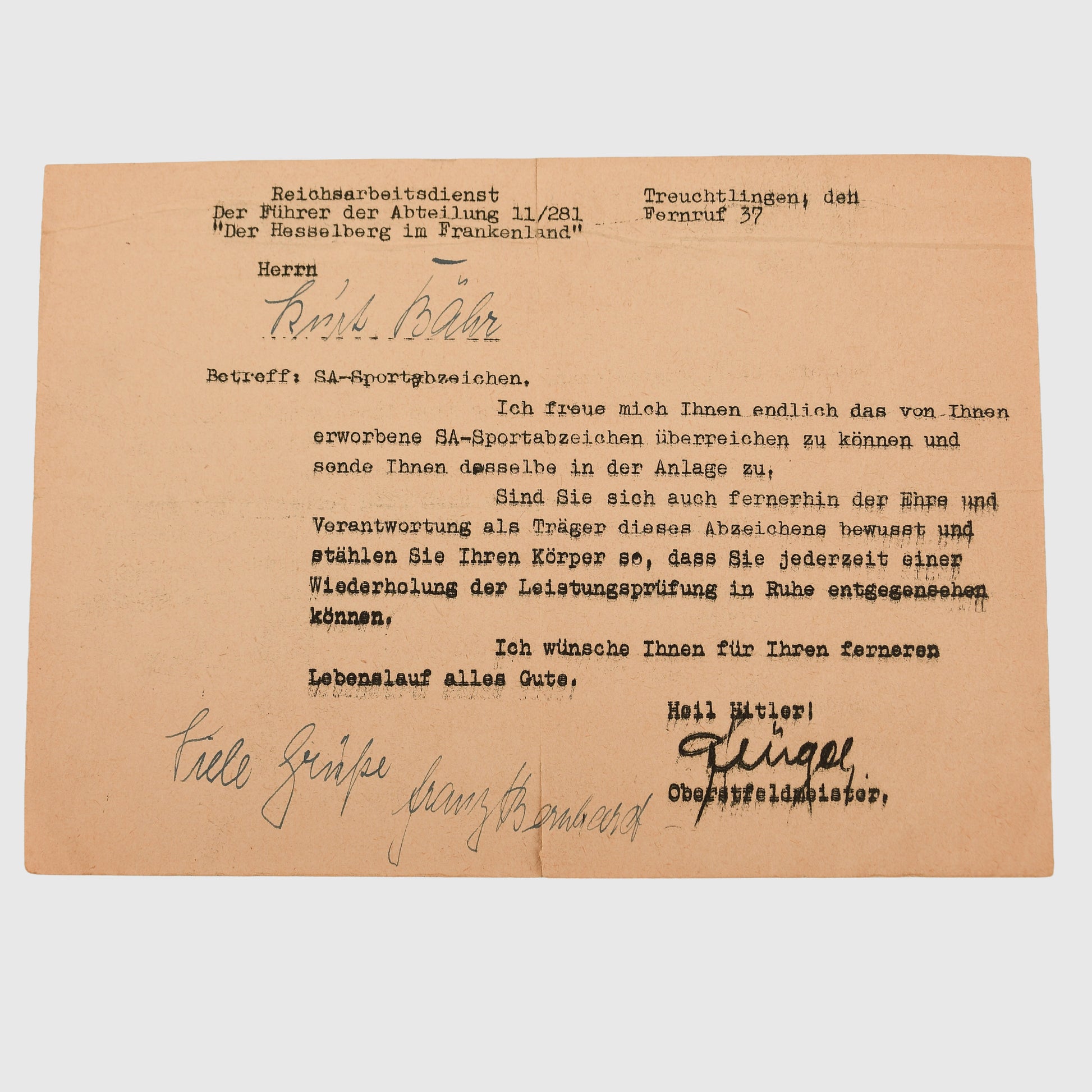 Also included is Bahr’s SA Sports Badge book with his photograph in RAD uniform, together with a printed letter from his German Labour Service commanding officer regarding the award of the badge. Completing the grouping is a high-quality studio portrait of Bahr as an Oberfeldwebel, wearing all his decorations, with a handwritten dedication on the reverse dated 1943.