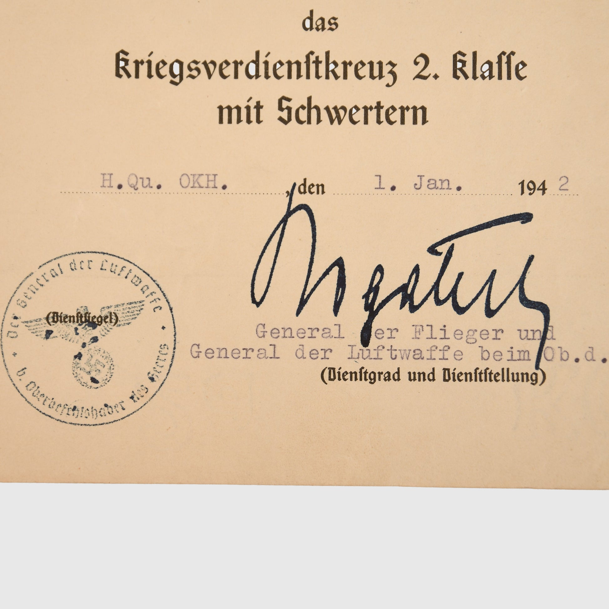 War Service Cross 2nd Class with Swords citation, A5 size, once folded, dated 1 January 1942, pen-signed by General Bogatsch, Knights Cross winner and General of Flyers.