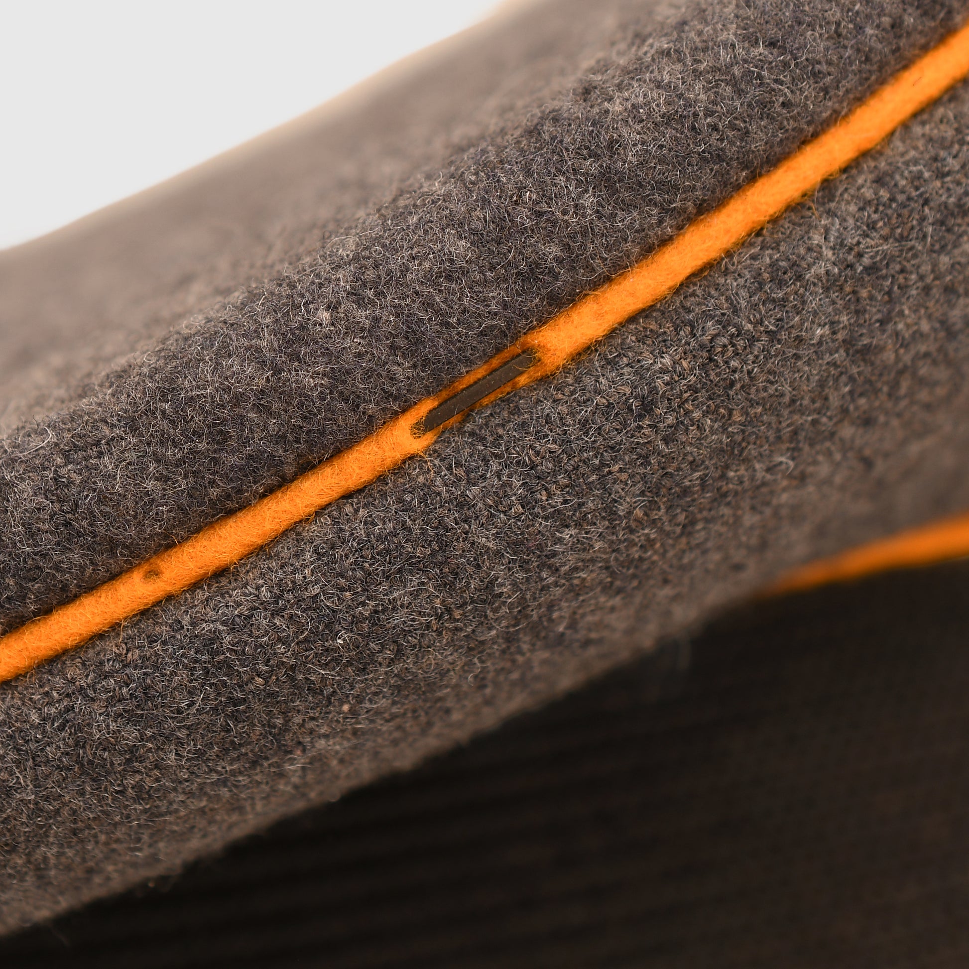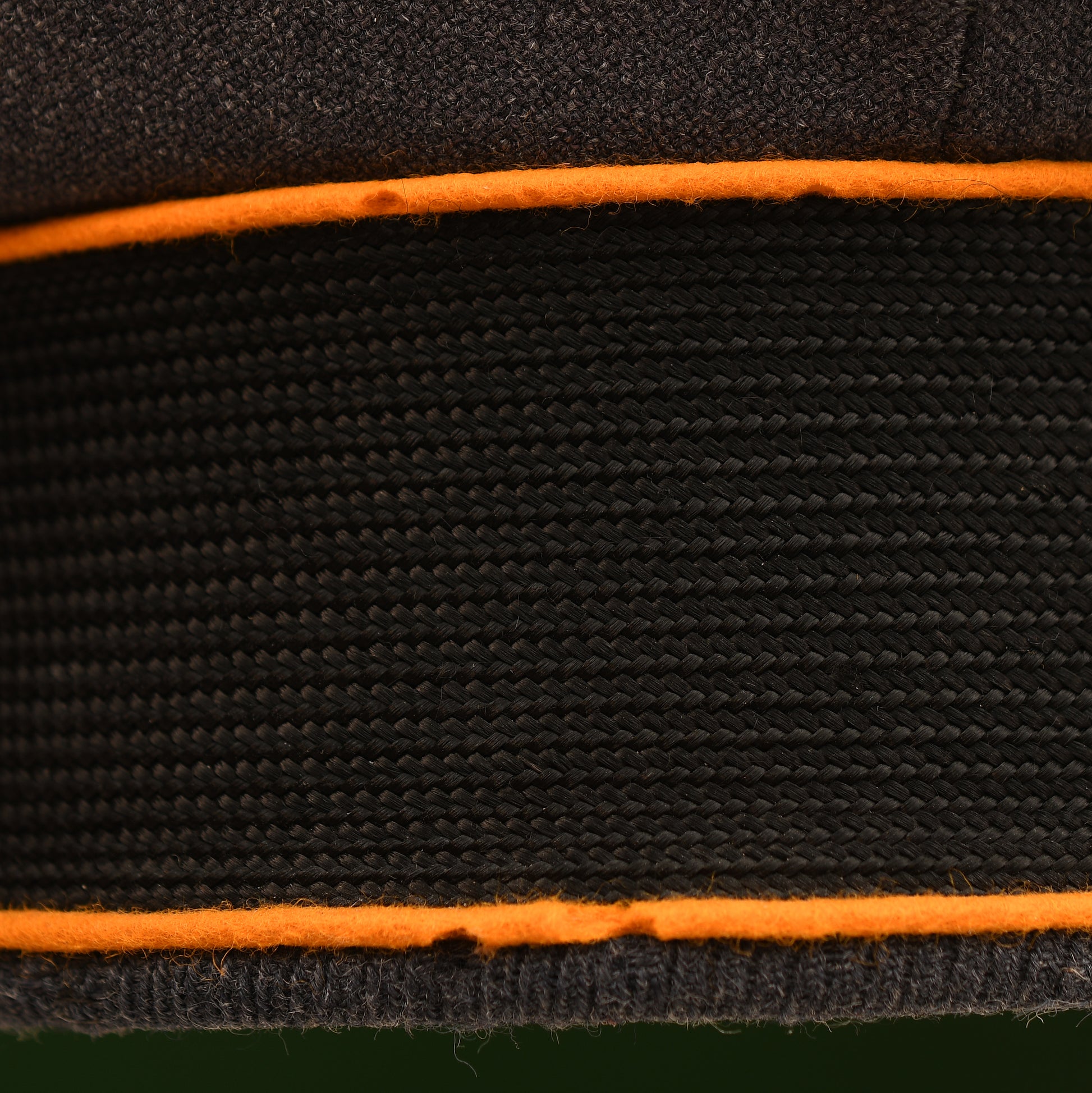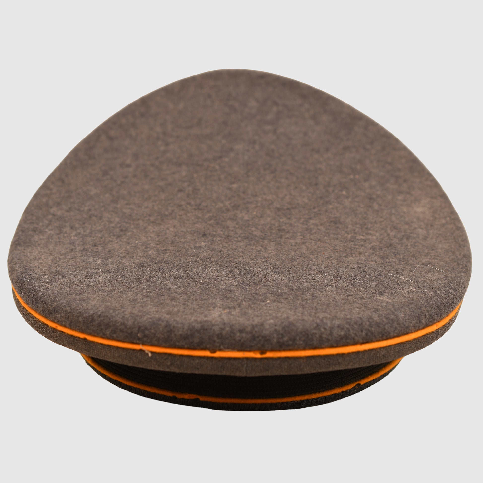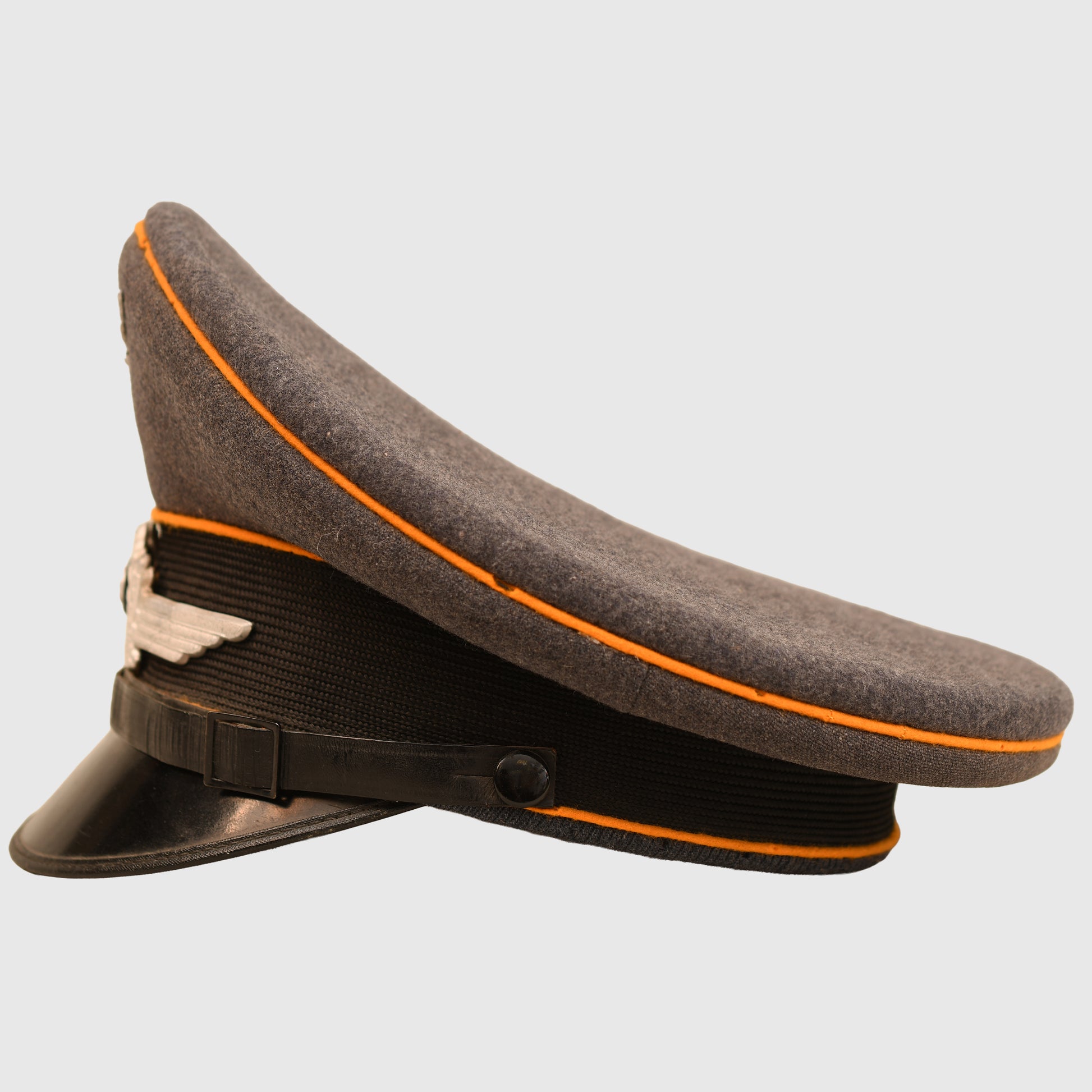 A rare Luftwaffe enlisted man’s/NCO’s visor cap with yellow piping for flight units, size 56 cm, produced by the scarce maker HTC with their patented Frischluft ventilation system. The cap displays an excellent high saddle shape, the crown and upper body completely free of moth damage, tracking, or staining. The waffenfarbe shows moth nips—six to the crown piping and more extensive to the two lower bands—though most are to the rear, leaving the front visually clean.