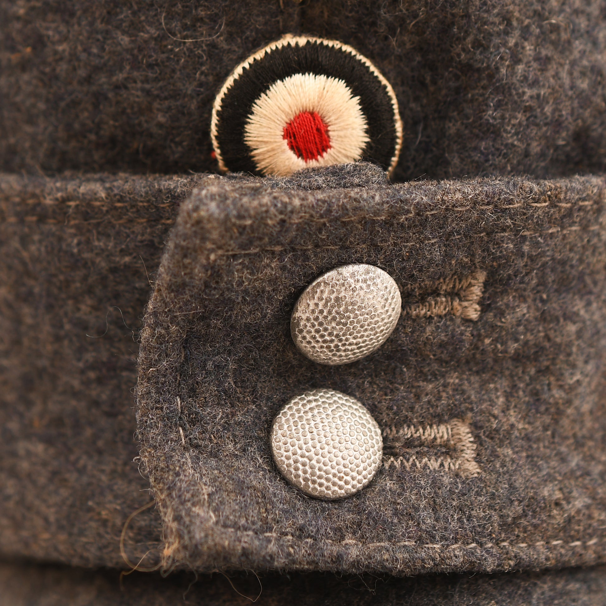 A scarce M43 officer’s field cap worn by the Generalluftzeugmeister, civilian technicians employed by the Luftwaffe in maintenance and supply, distinguished by their unique eagle and cogwheel insignia. This good-sized example, stamped ‘56’, is RB numbered and dated ‘7/43’ to the dark grey/maroon rayon lining. The interior shows cracking and wear to the half-moon shaped forehead sweatband. Externally, the cap retains excellent nap to the cloth with only a single moth nip to the front peak. Completed with silver wire officer’s waffenfarbe fully surrounding the crown, the large and impressive Generalluftzeugmeister insignia, an enlisted ranks Luftwaffe cockade below, and the standard double-button front.