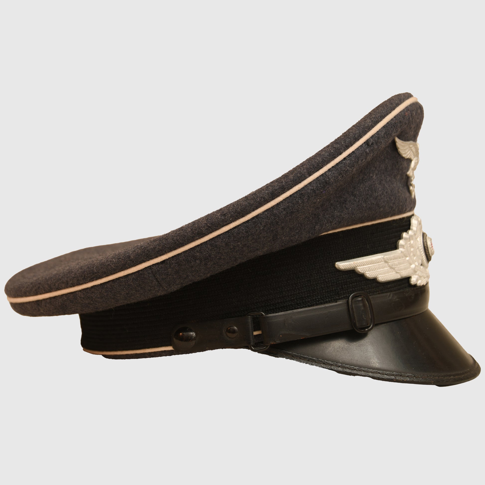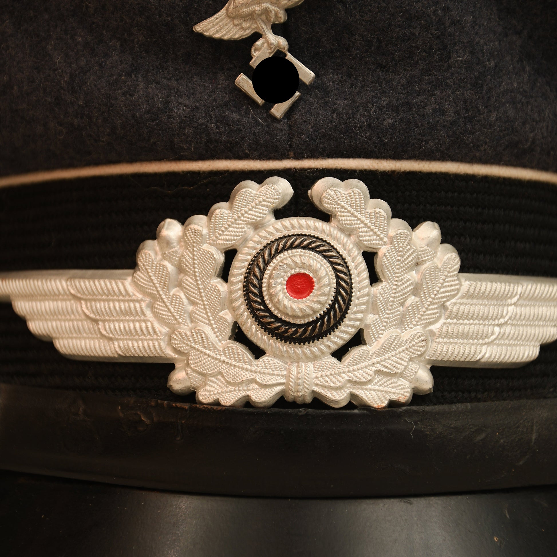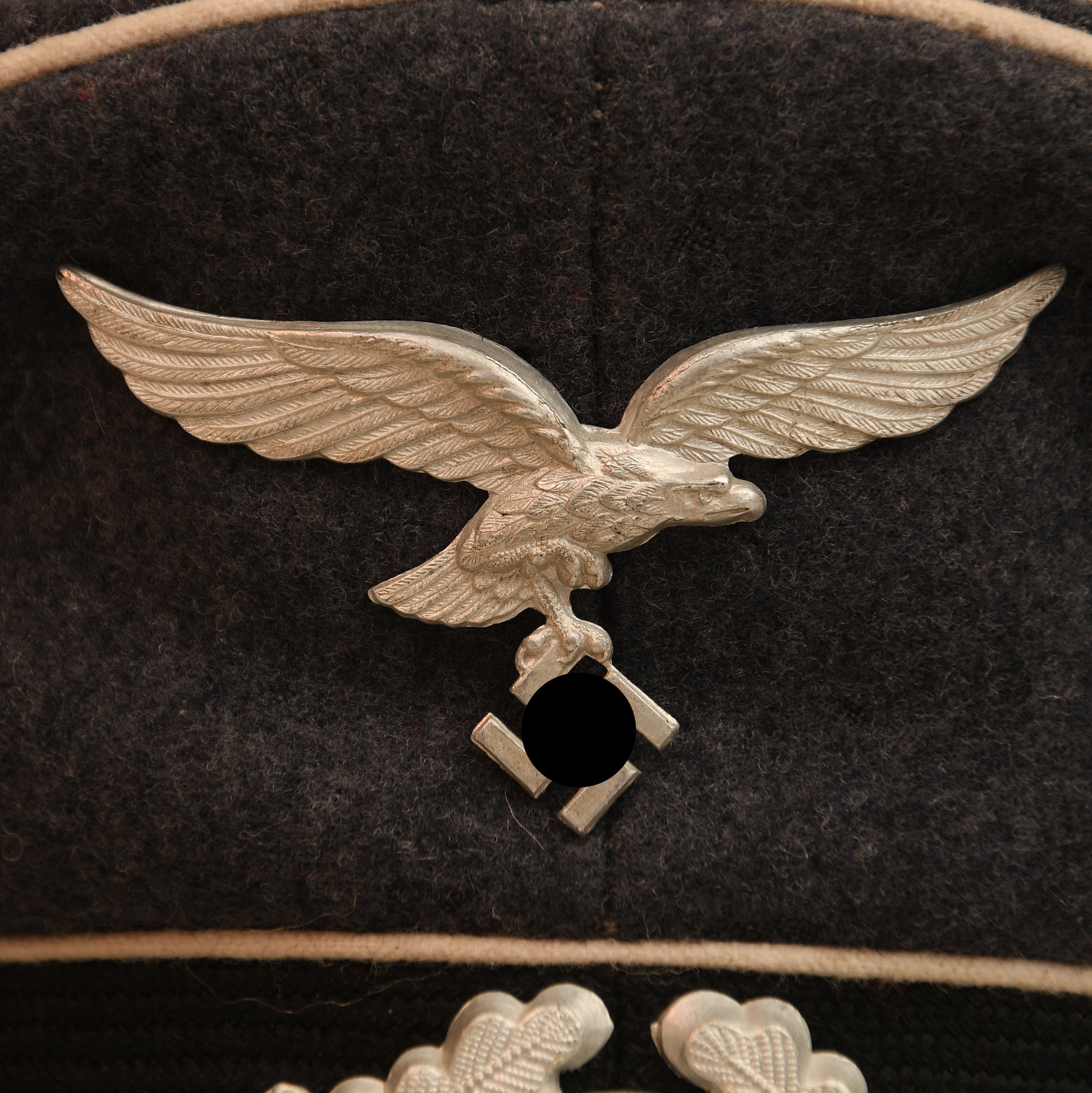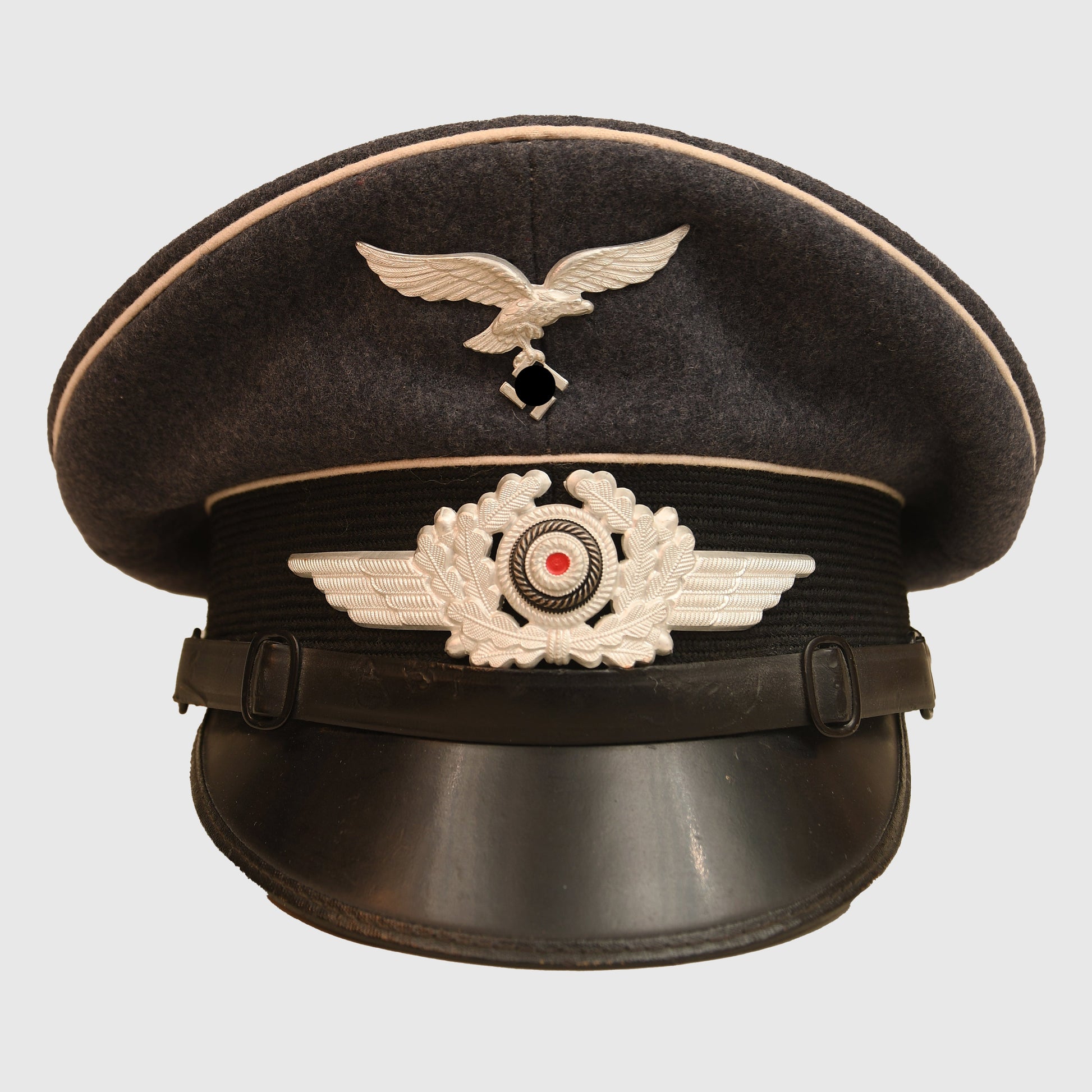A very fine example of an enlisted man’s or NCO visor cap for the elite Hermann Göring Division of the Luftwaffe. Stamped size 56 to the interior, this cap is constructed from excellent quality Luftwaffe blue-grey cloth, retaining strong nap throughout. One small moth nip is present just below the crown waffenfarbe to the left of the Luftwaffe eagle. The waffenfarbe is in white, applied to the crown and both upper and lower edges of the mohair centre band.