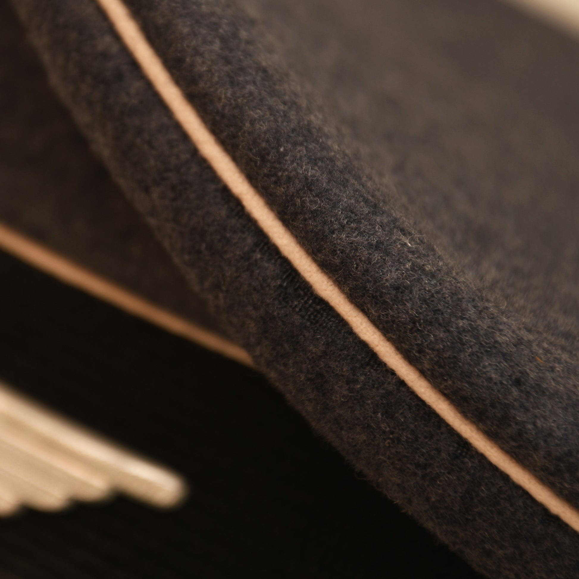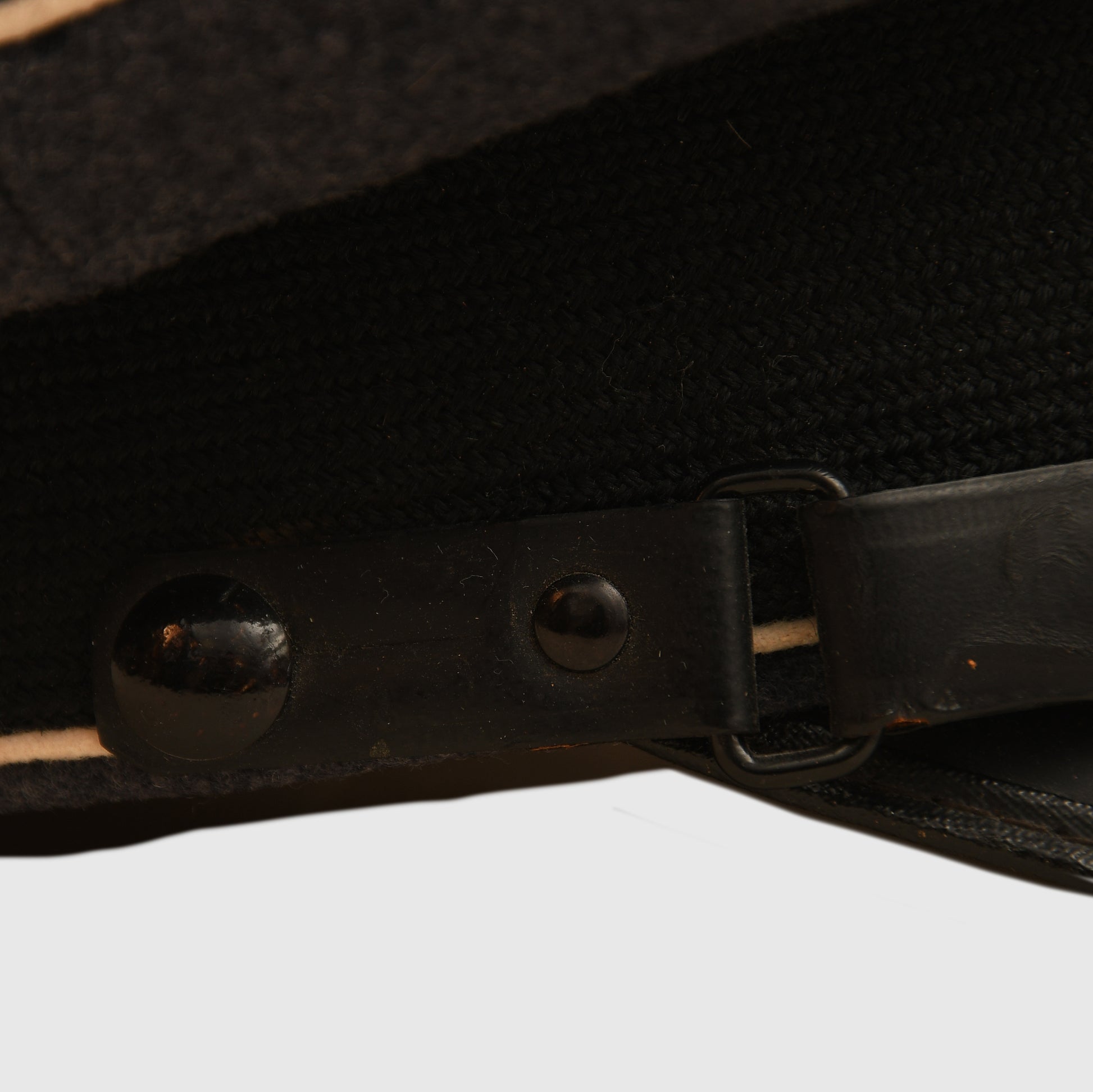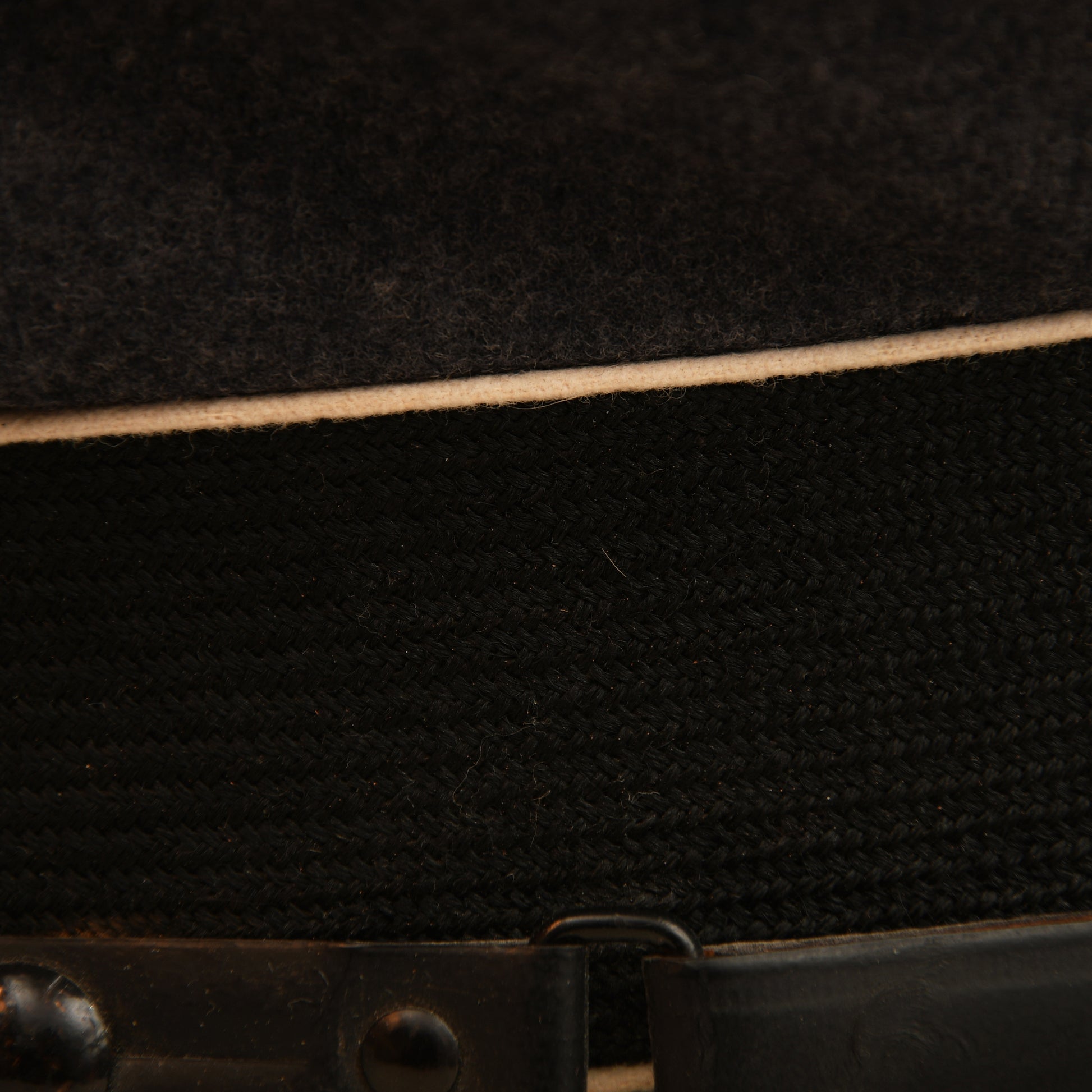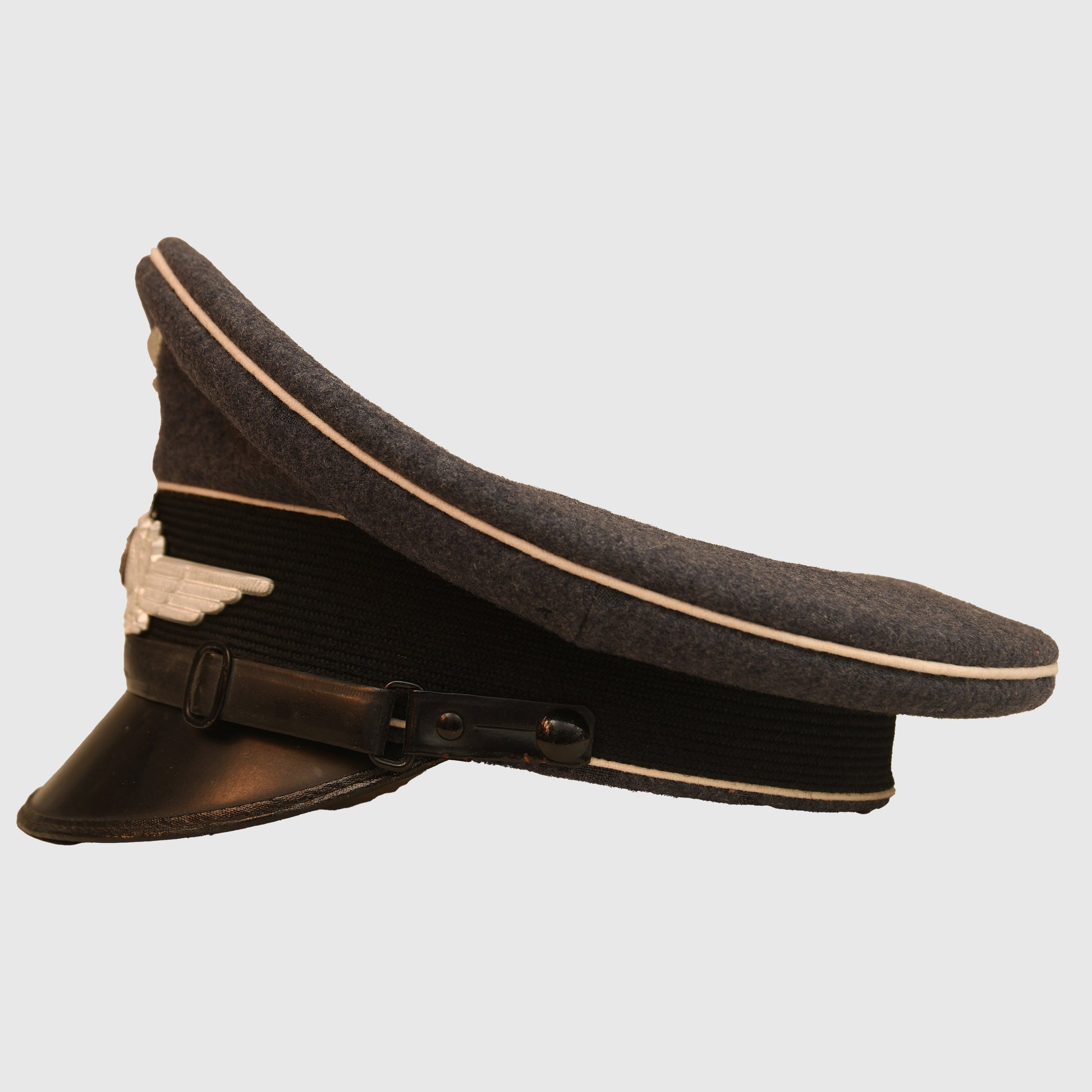 A very fine example of an enlisted man’s or NCO visor cap for the elite Hermann Göring Division of the Luftwaffe. Stamped size 56 to the interior, this cap is constructed from excellent quality Luftwaffe blue-grey cloth, retaining strong nap throughout. One small moth nip is present just below the crown waffenfarbe to the left of the Luftwaffe eagle. The waffenfarbe is in white, applied to the crown and both upper and lower edges of the mohair centre band.