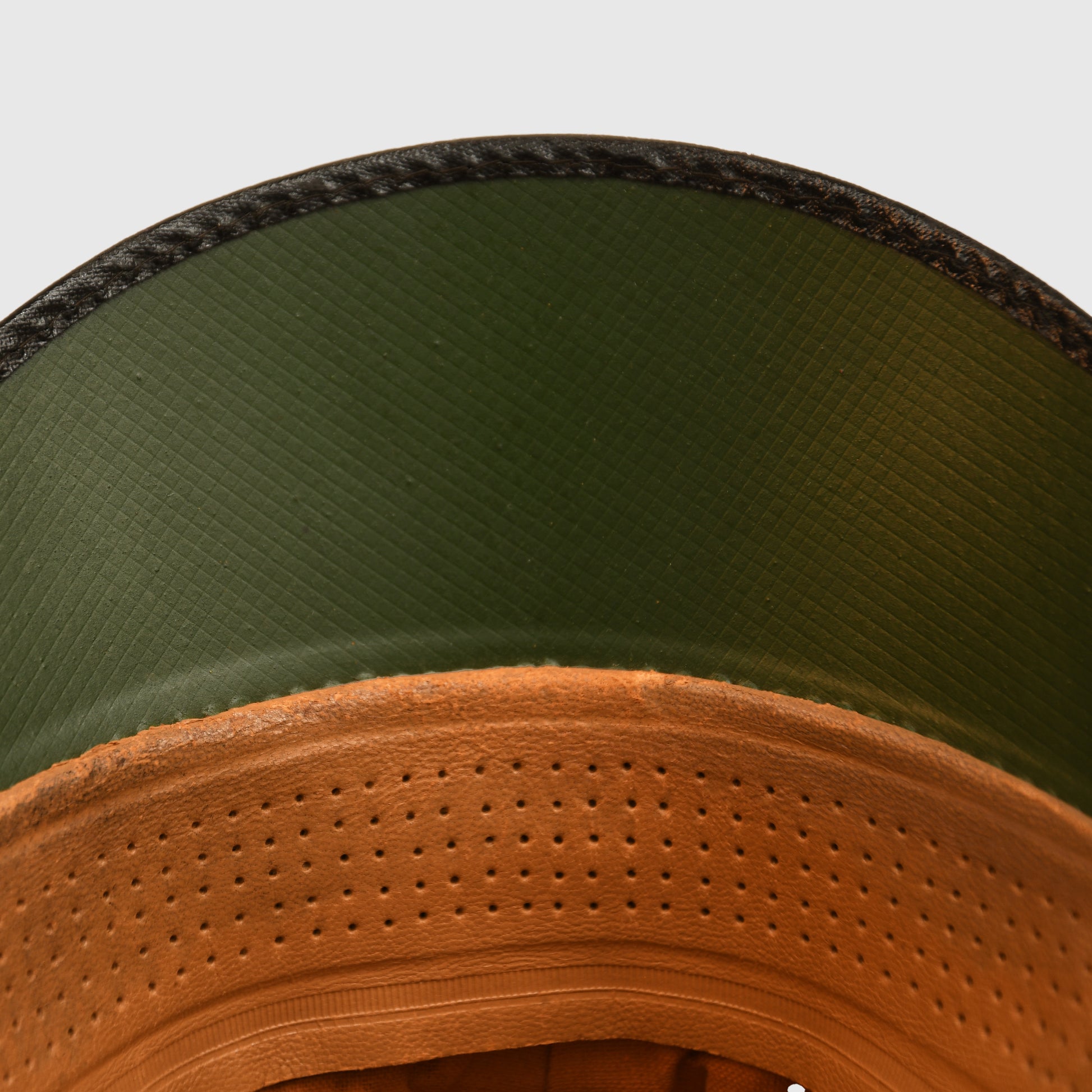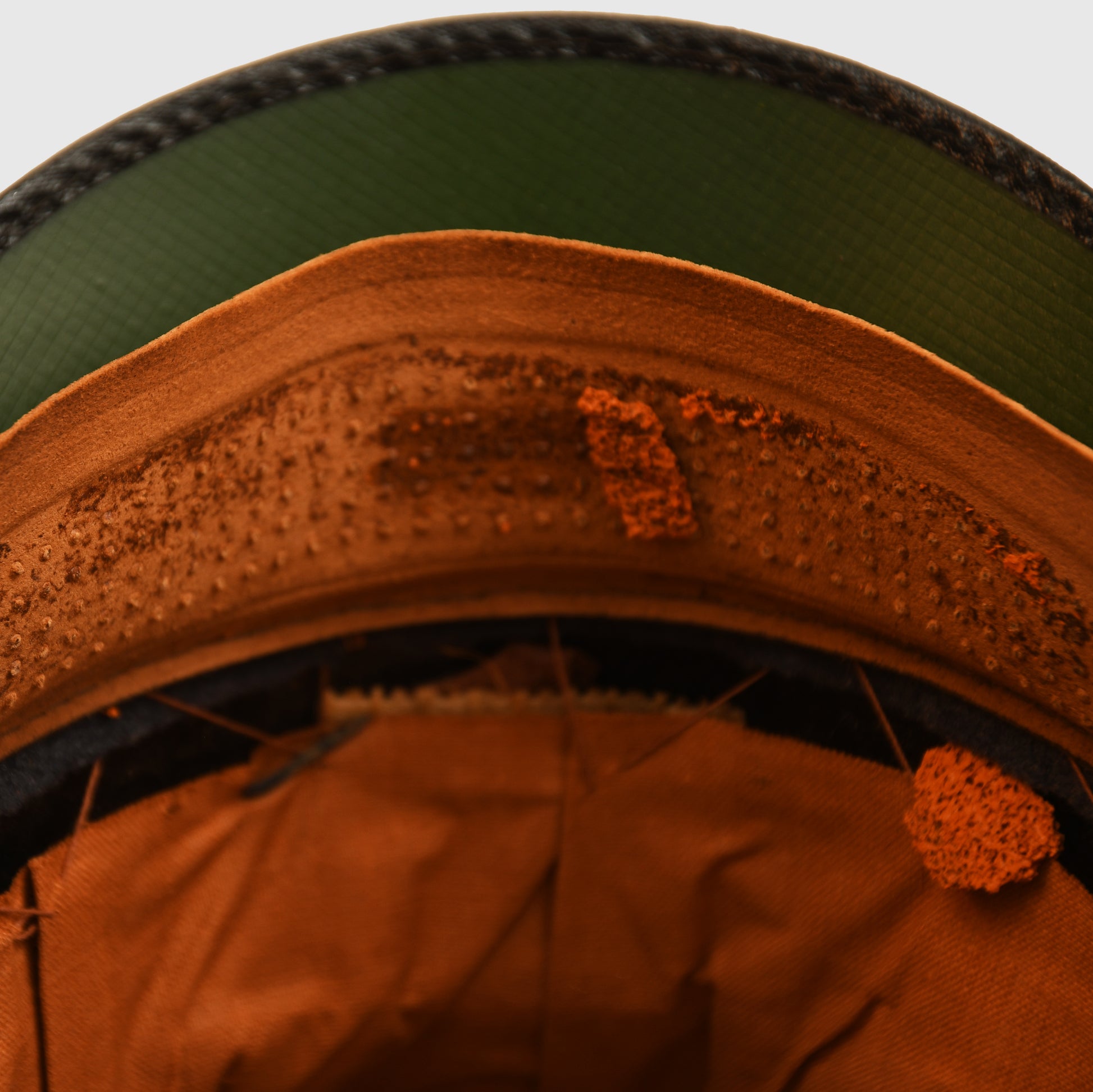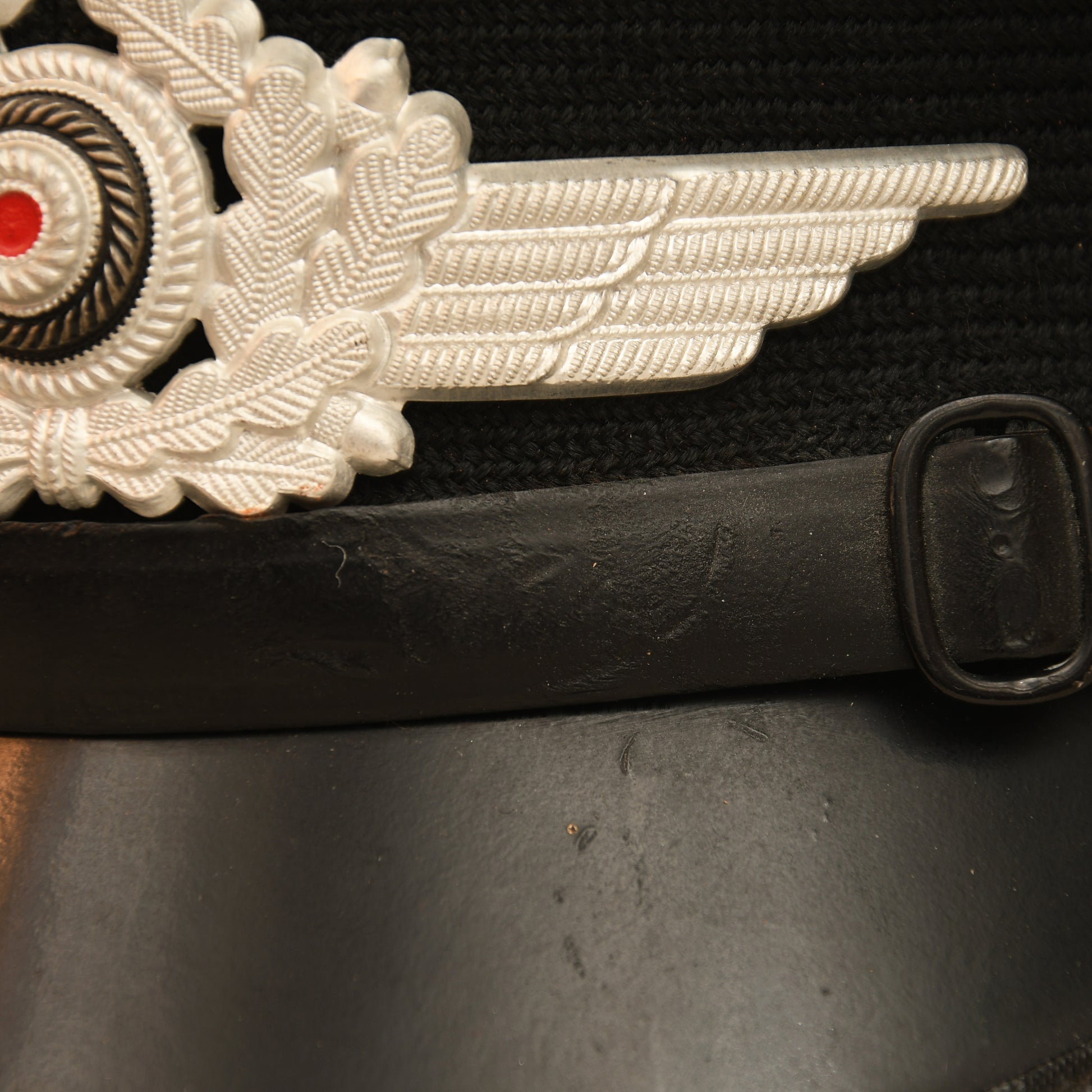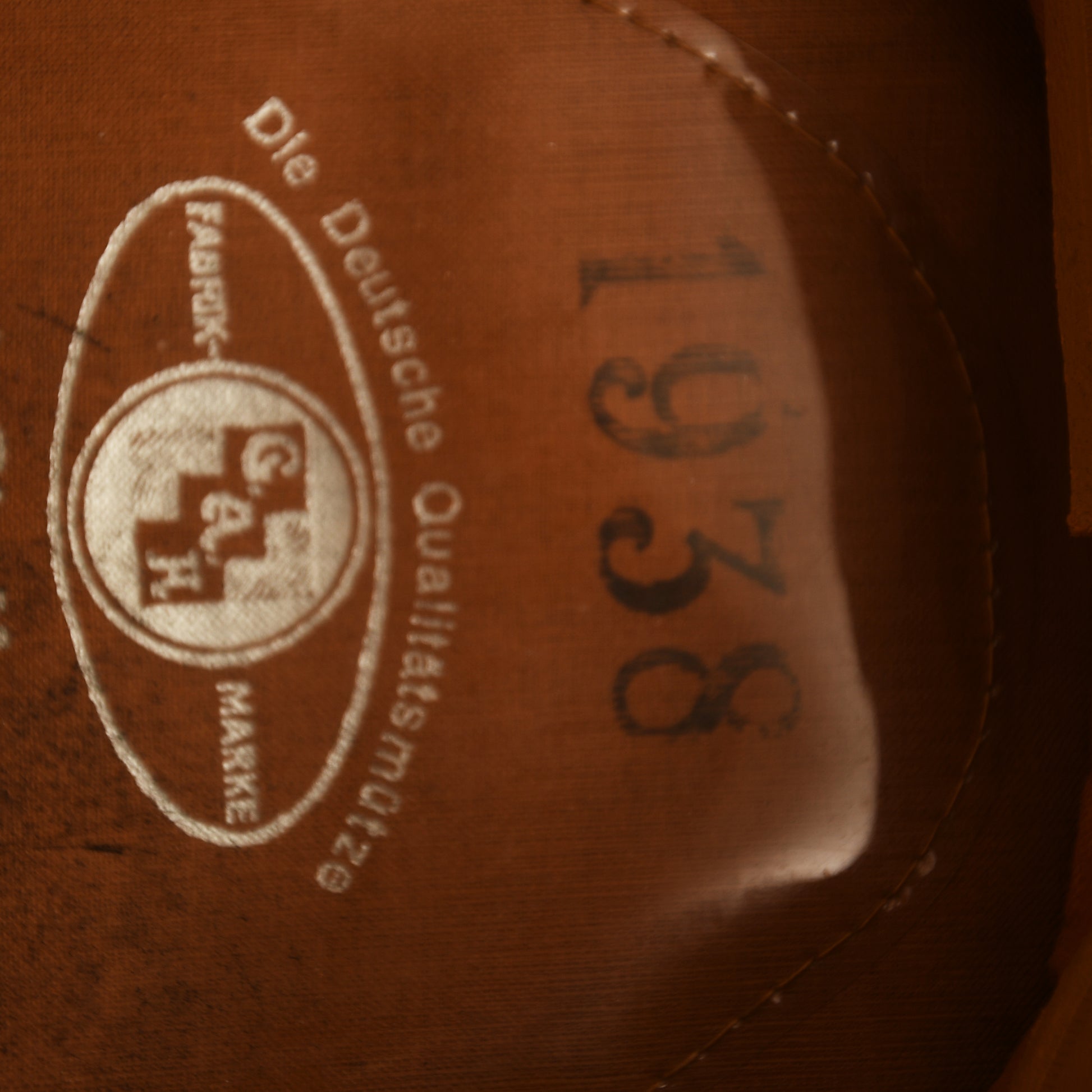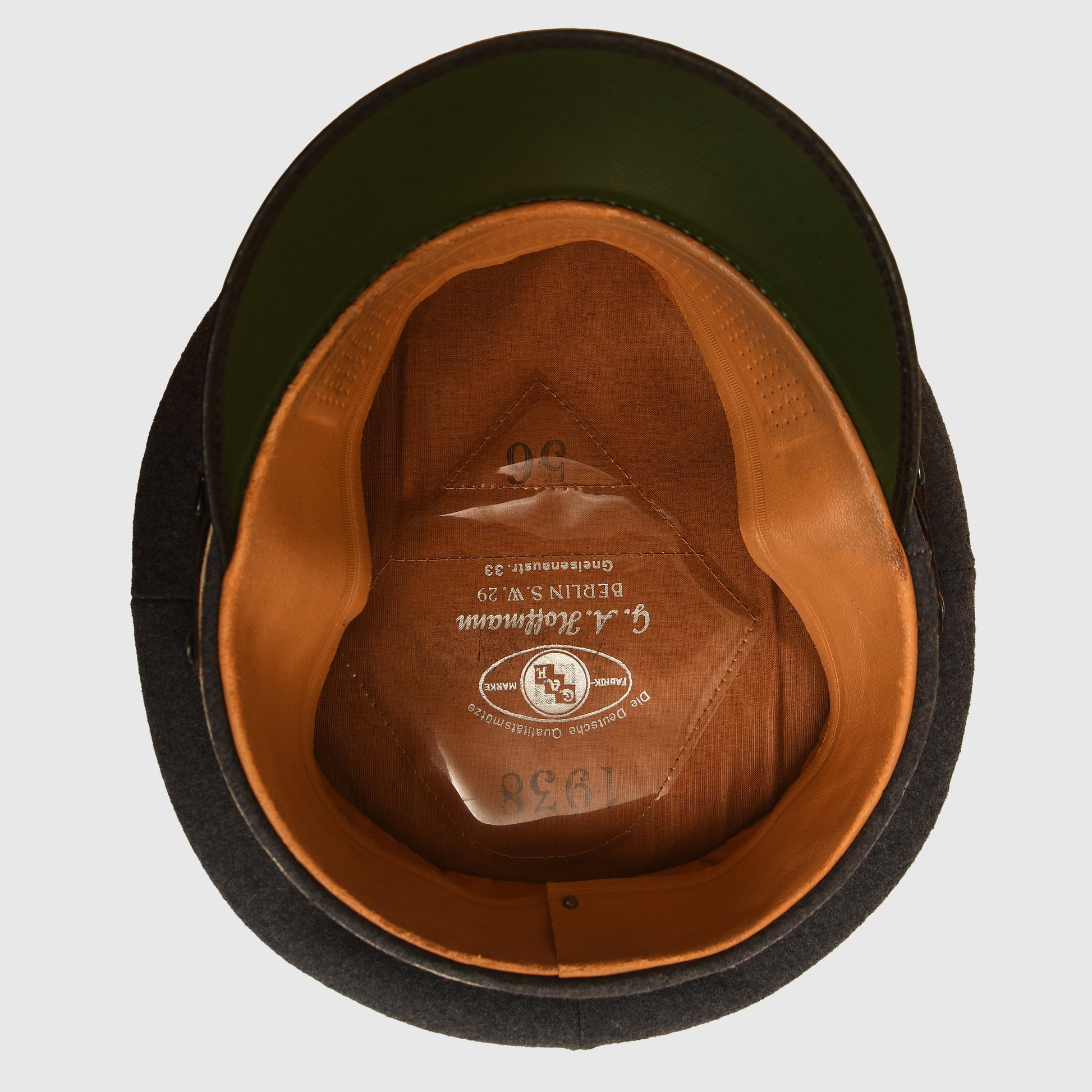 Fitted with a matched and untouched set of Luftwaffe eagle and cockade in aluminium, along with a standard double buckle chinstrap and a double-ribbed fibre visor. The interior features a bright light tan leather sweatband, showing only minor wear at the forehead. The inner lining is constructed from two-tone russet brown brushed cotton, and is dated 1938 beneath the complete and undamaged celluloid centre lozenge.