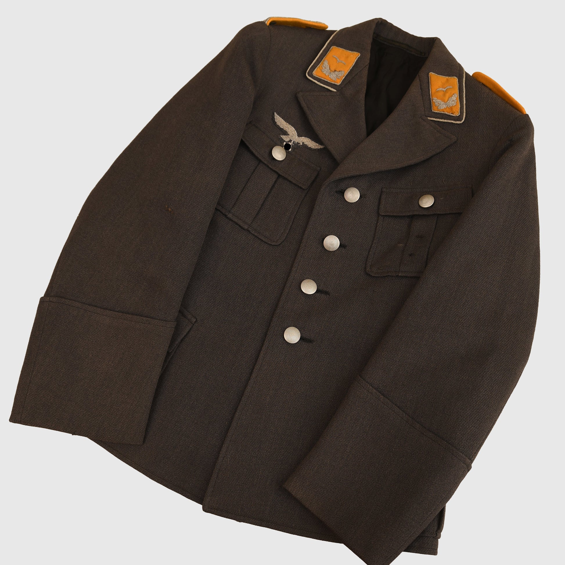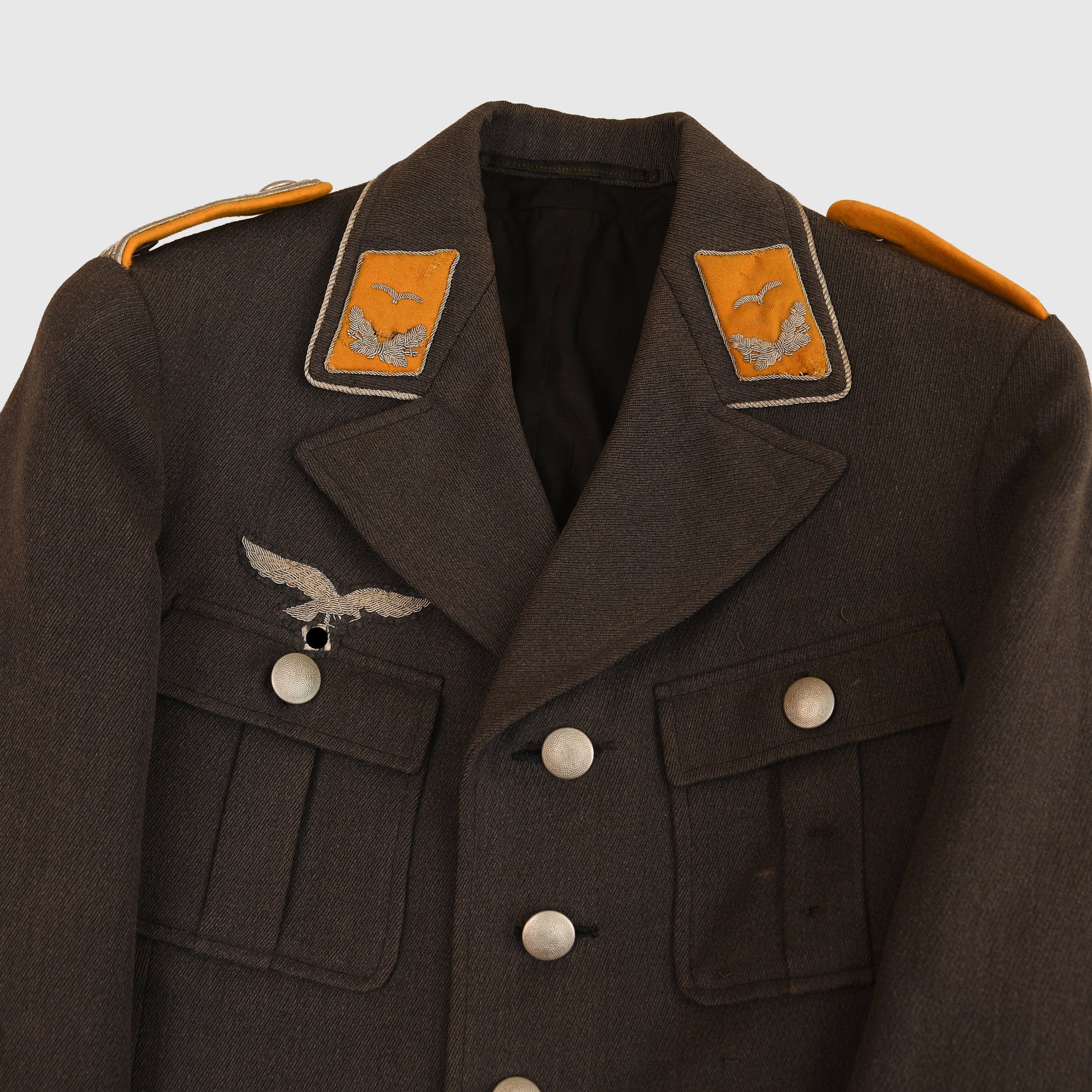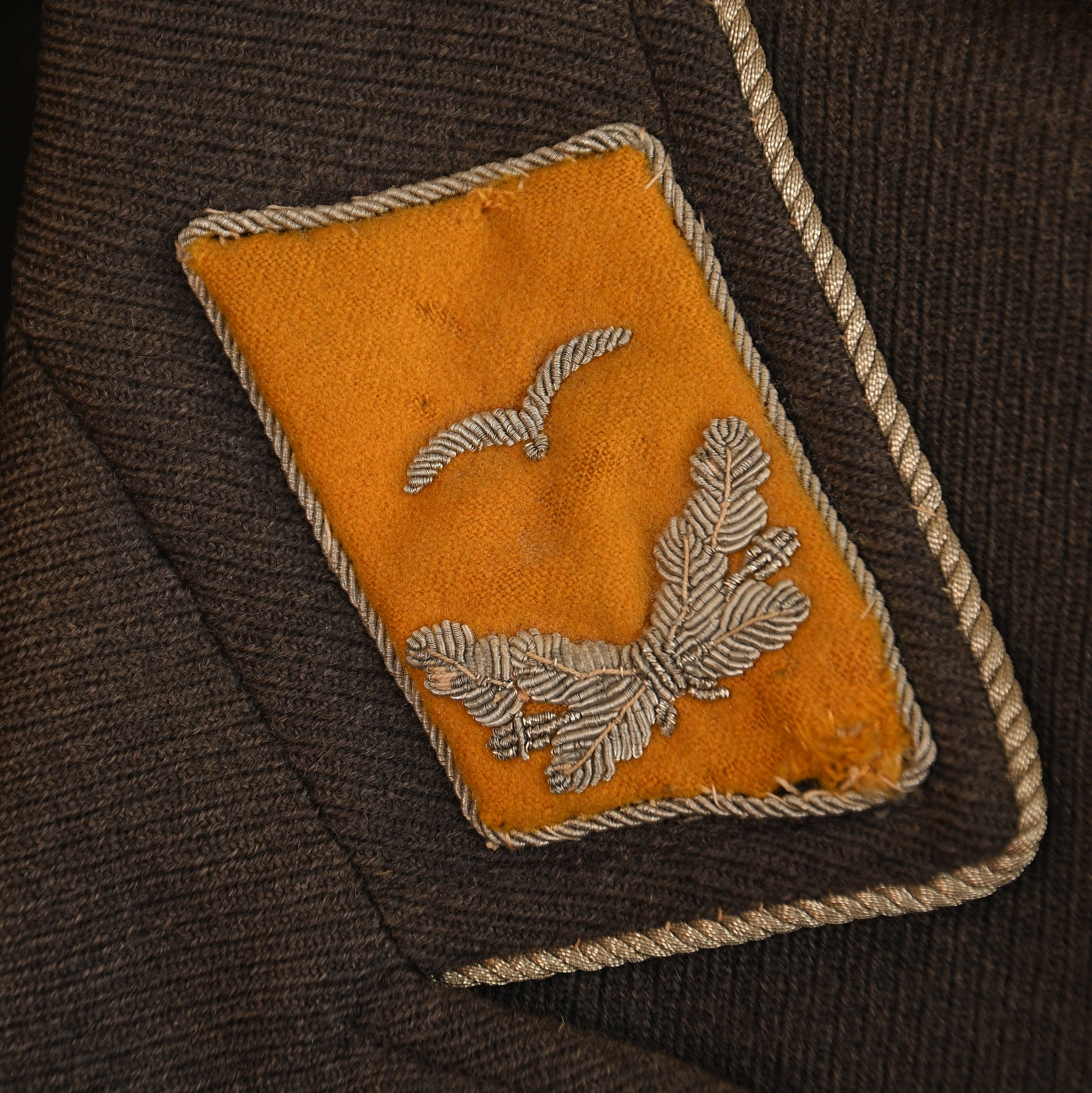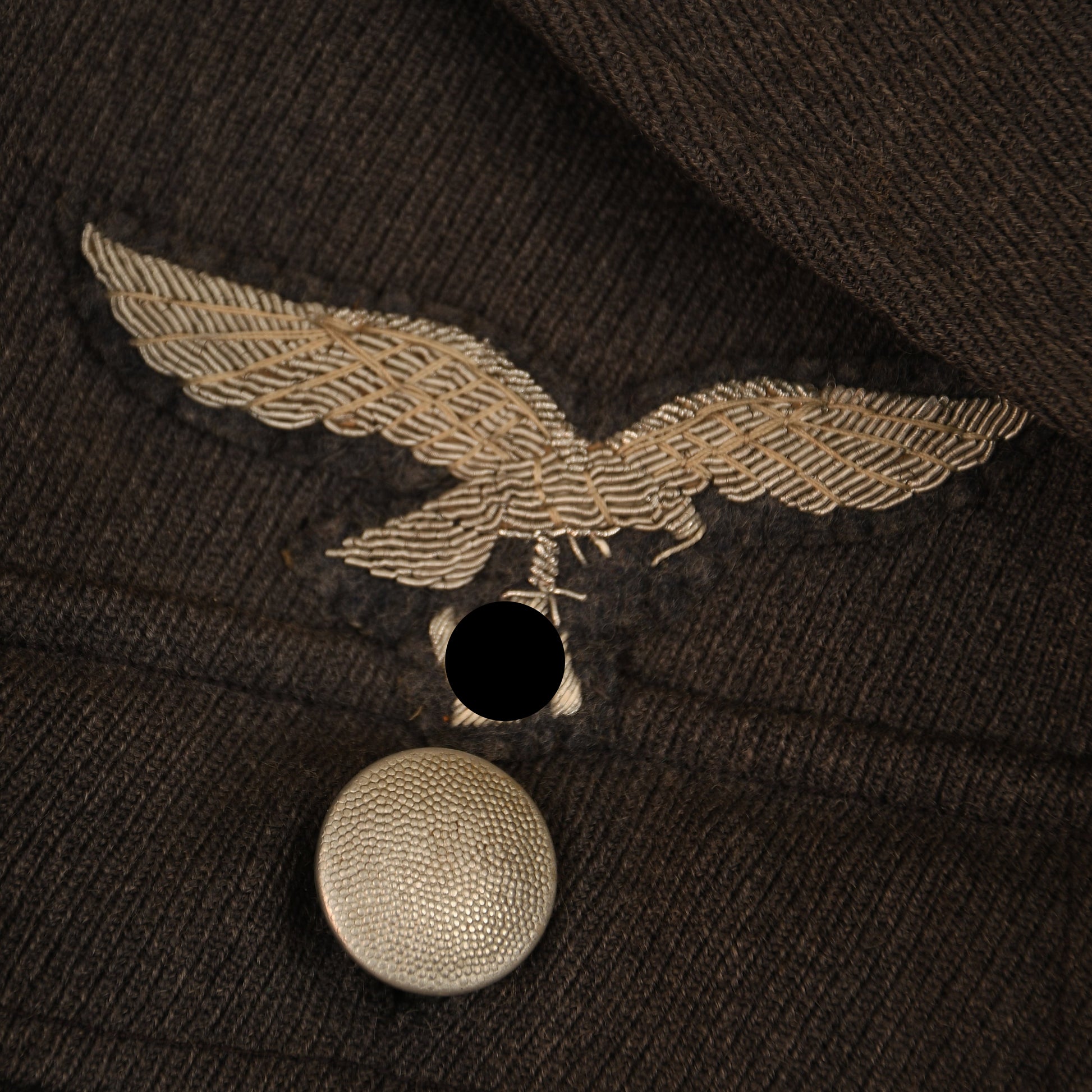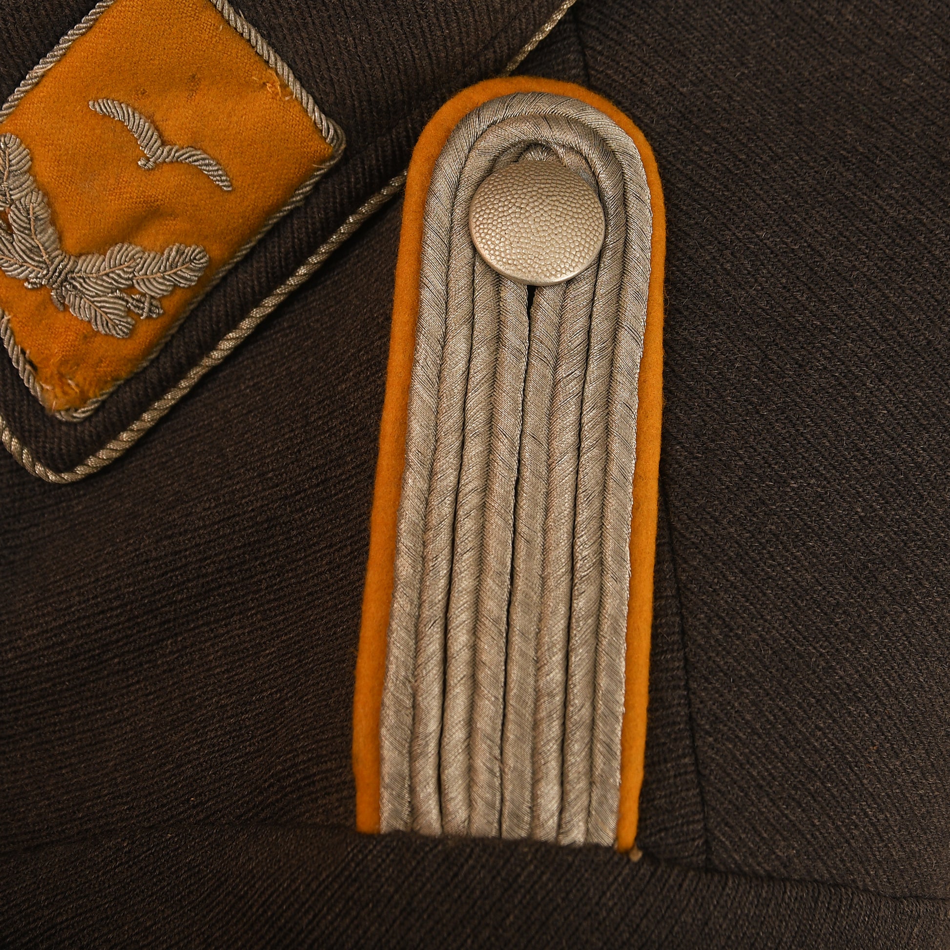 Fitted with untouched yellow wool-based Leutnant shoulder boards, one with a single button for the attachment of parade aiguillettes. The bullion collar patches show light service wear, with silver piping to both collar and patches, and one bullion seagull denoting the rank of Leutnant. An excellent Luftwaffe officer’s wire-woven breast eagle remains firmly applied.