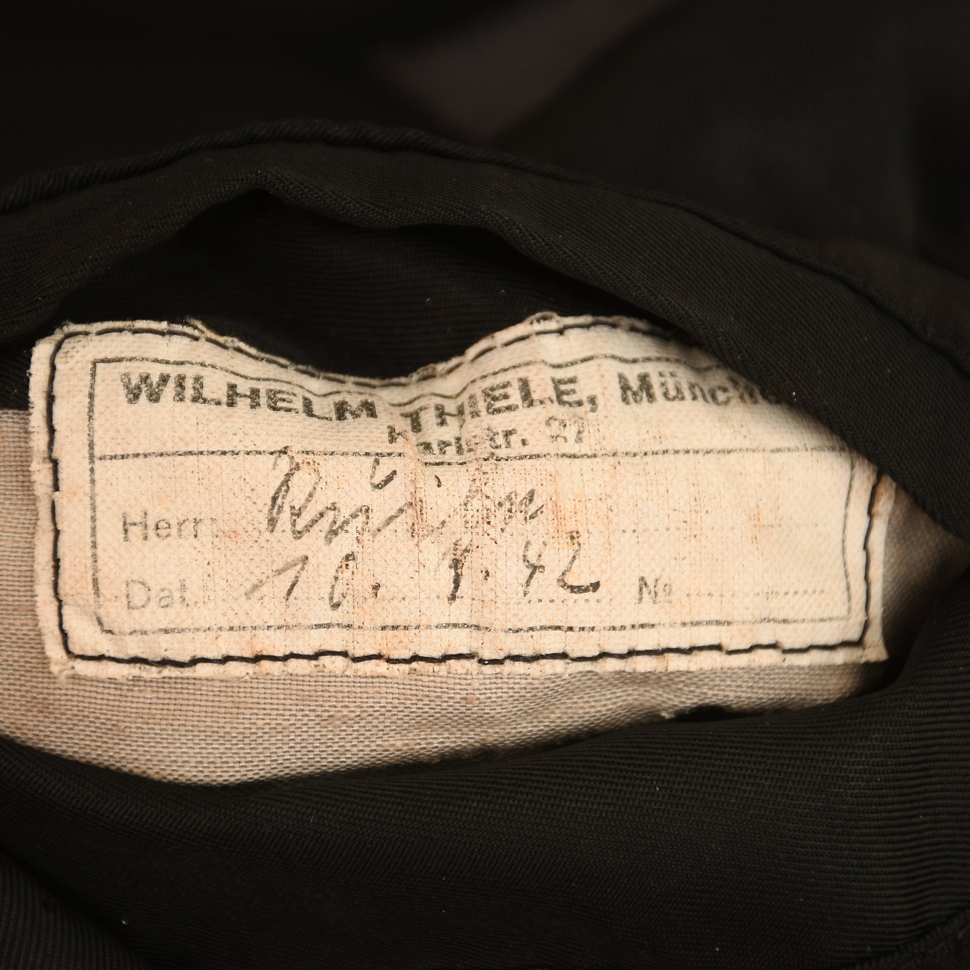 The tunic follows the standard configuration with deep turned-back cuffs and four pleated pockets with scalloped flaps. Loops are present for a short medal ribbon bar and three decorations. To the interior, a tailor’s loop has been added above the tailored hole for suspending a sword or dagger. The inside pocket retains its original tailor’s label from Wilhelm Thiele of Munich, with the officer’s name and date 10.1.42 clearly inscribed. Lining throughout remains complete and undamaged, with no evidence of moth.