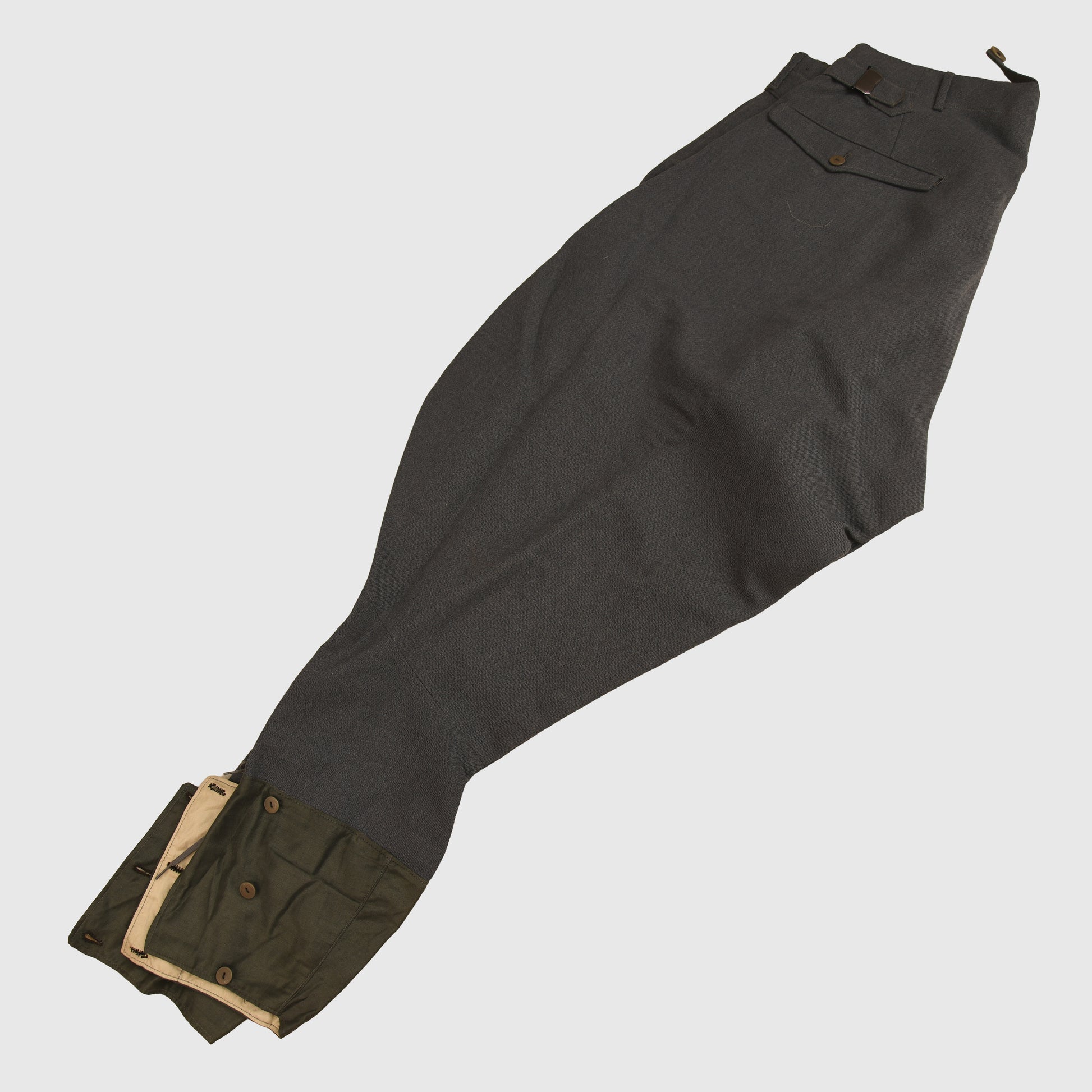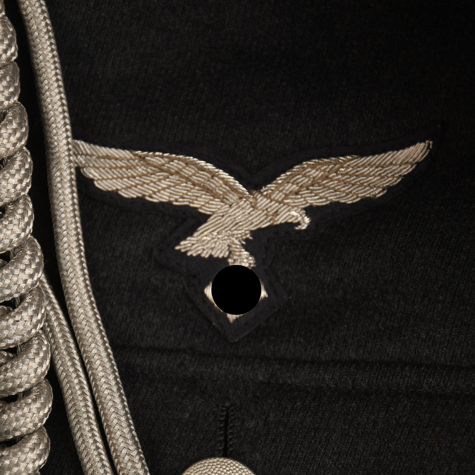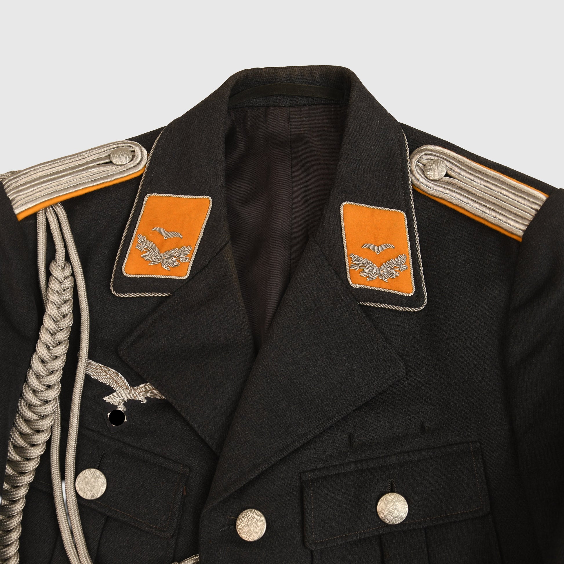 A very nice condition official Luftwaffe issue tunic to a flying leutnant, yellow based insignia. The tunic is absolutely free of any moth damage, stains or repairs. The Luftwaffe grey blue lining is complete with its original ‘LDA VERKAUFS ABTEILUNG DER LUFTWAFFE BERLIN 68’ label placed just below the inner pocket with an interior name label with the name of ‘JAFT HEIL’ dated ‘1941’. The tunic eagle is of the most magnificent quality, complete with a set of silver parade aiguillettes. The tunic comes complete with a slightly lighter shade of Luftwaffe blue grey breeches with a separate tailor’s label, and a separate owner’s name, the owner’s name of the breeches is ‘Leutnant Sickenberger’ dated ‘10th January 1940’. The Luftwaffe eagle has been stitched through the lining material of the tunic. Two loops to the tunic for a short medal ribbon bar. A beautiful quality set overall.