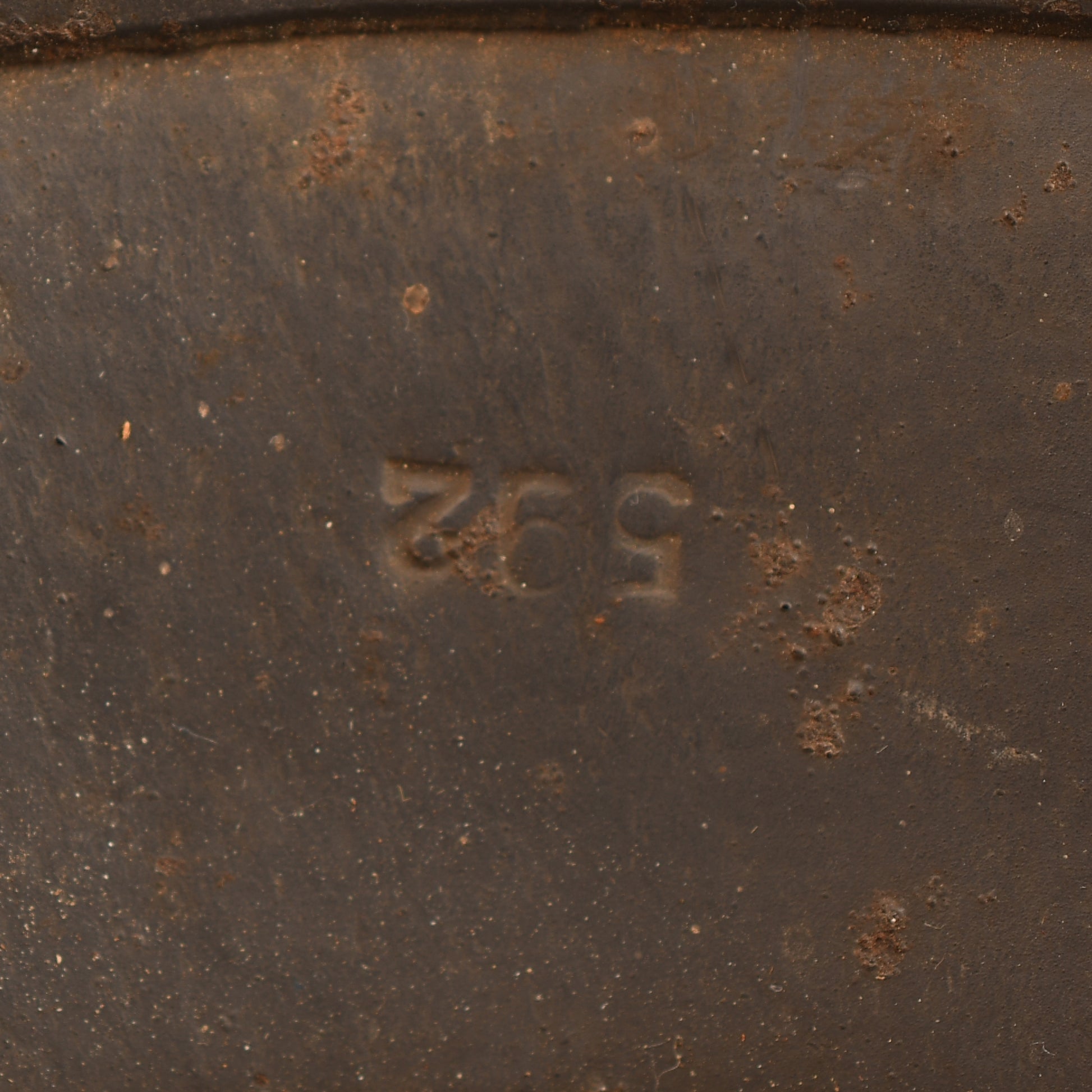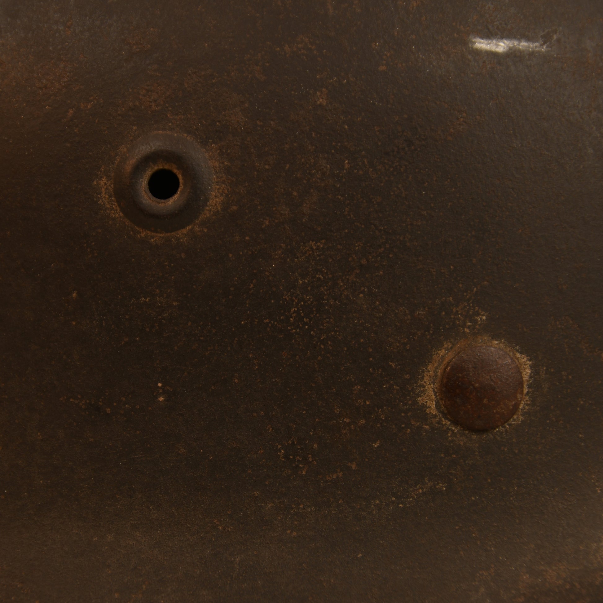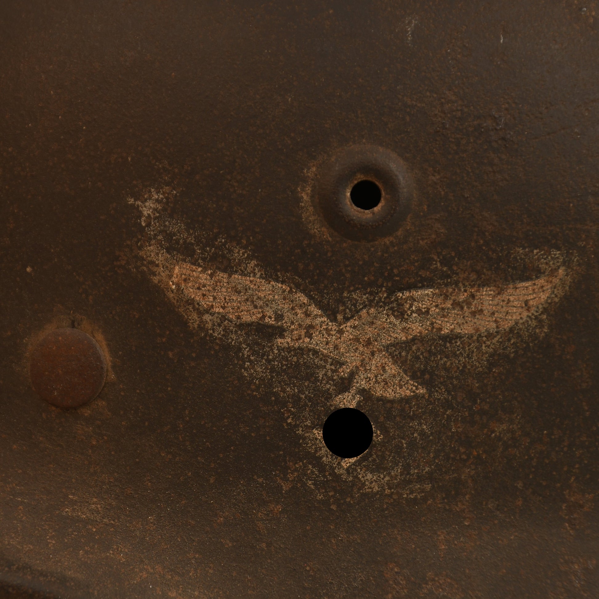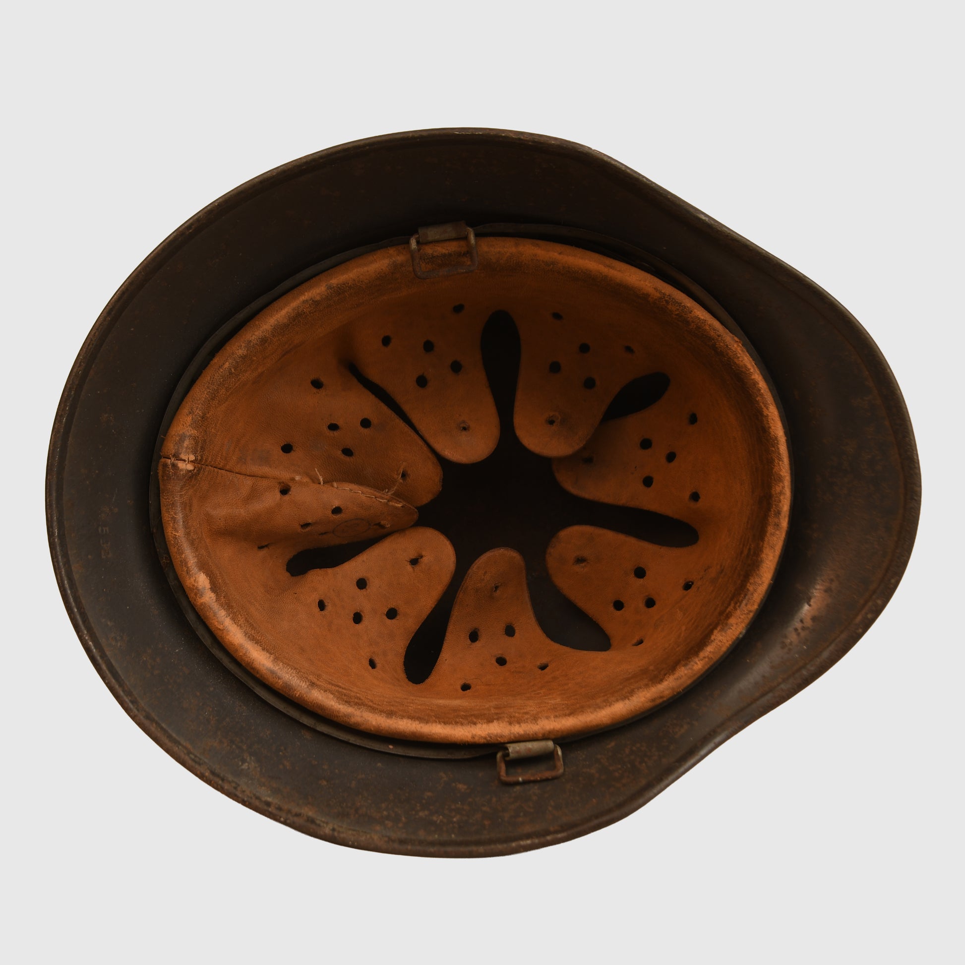 A Q64 manufactured M40 shell with faint traces of an earlier camouflage overpaint, which has since been largely removed. Originally, the camouflage left the Luftwaffe eagle visible in its distinctive triangular form. The interior features a size 56 light tan leather liner in generally clean condition, all tongues present, with the original M40 zinc liner band. Chinstrap is missing.