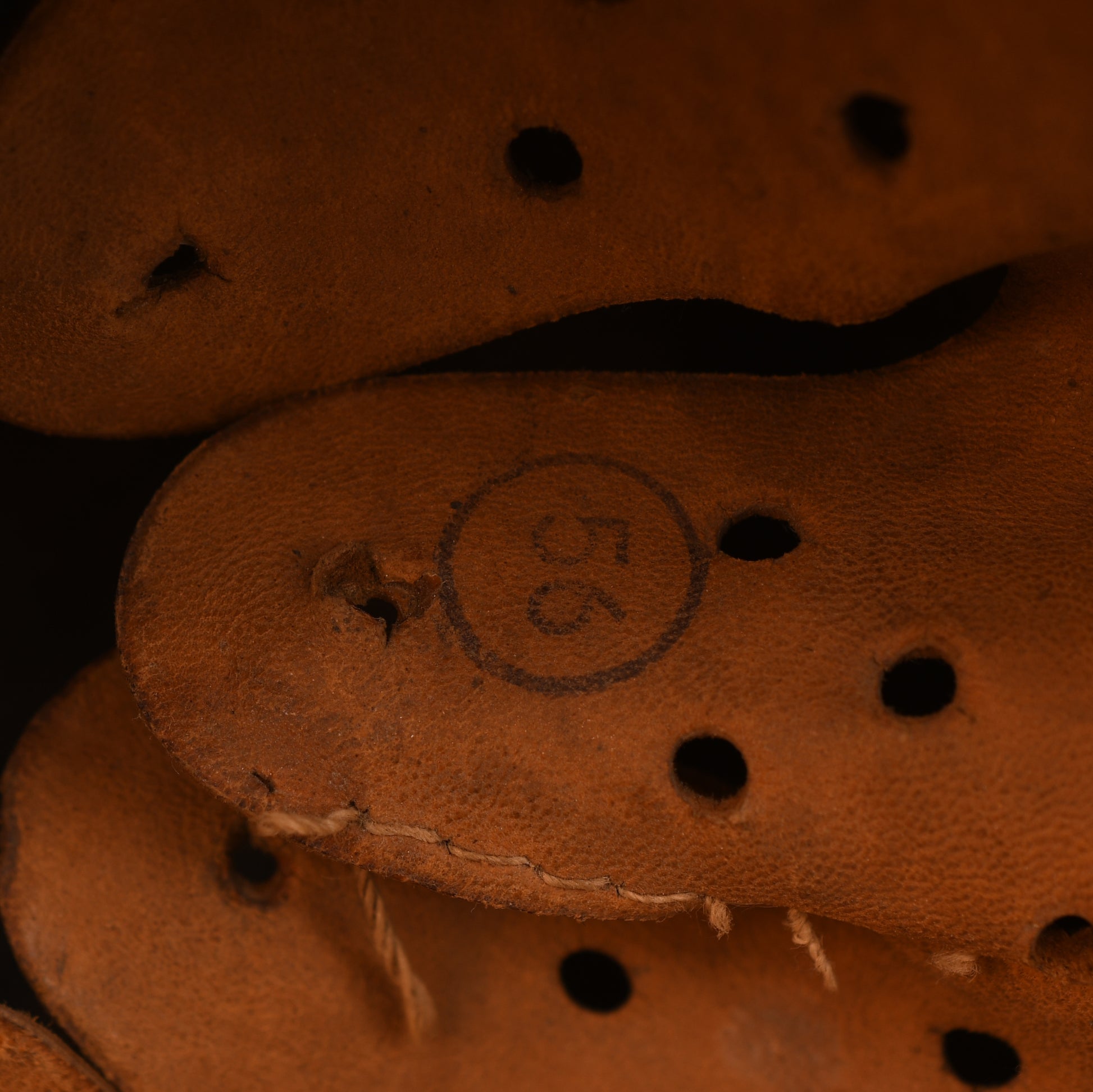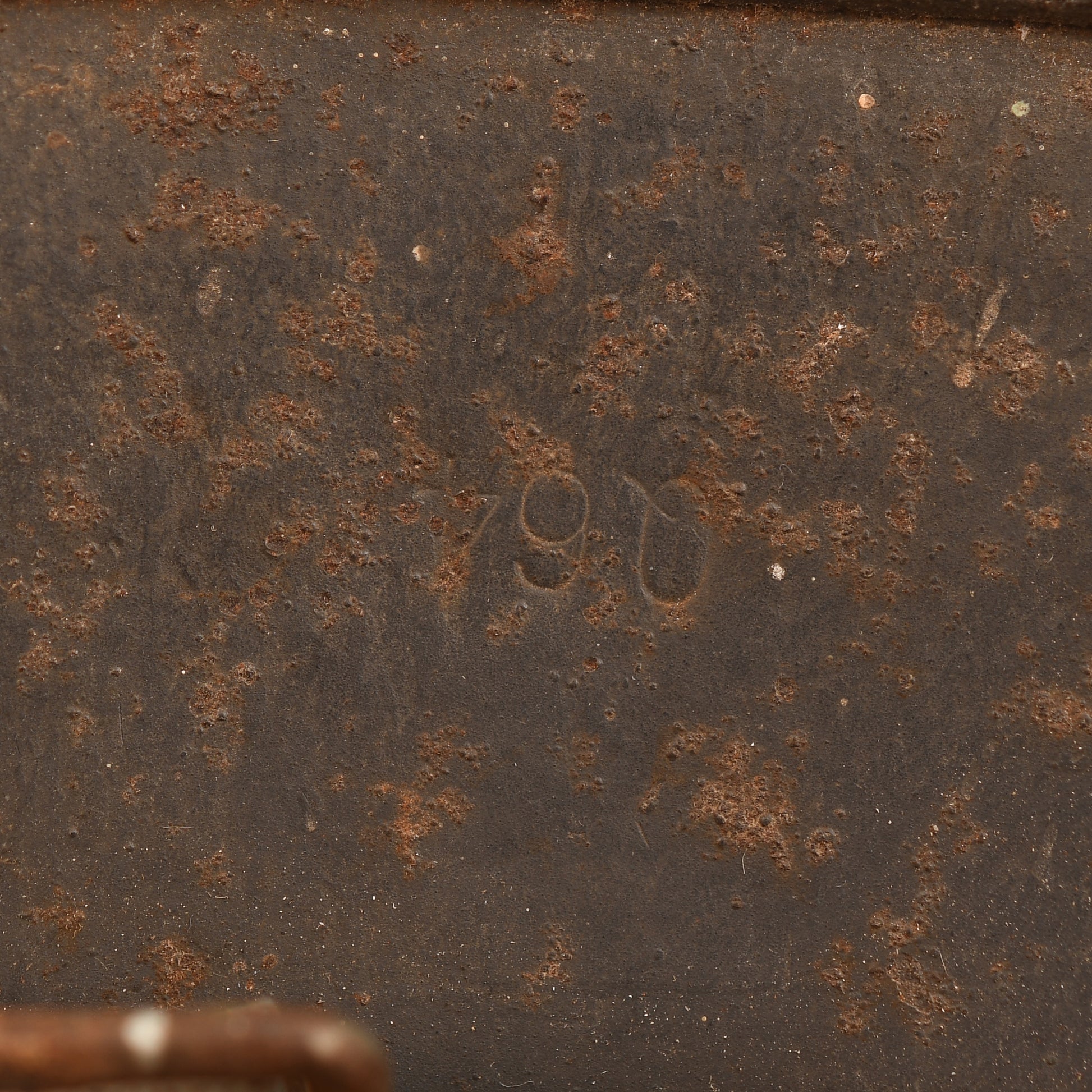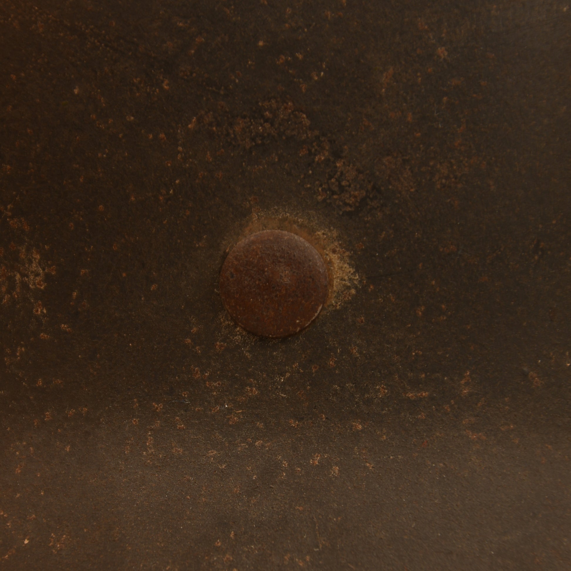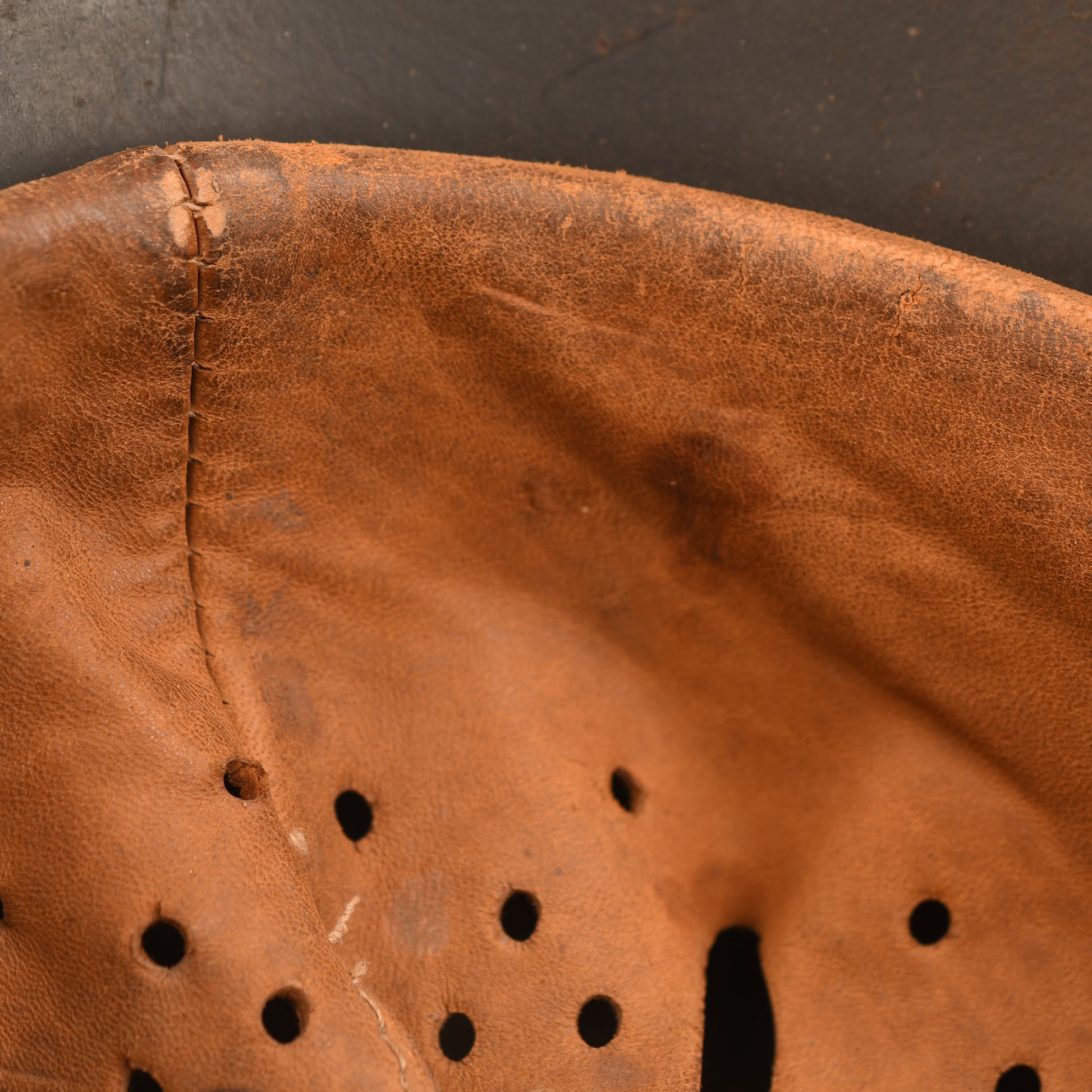 A Q64 manufactured M40 shell with faint traces of an earlier camouflage overpaint, which has since been largely removed. Originally, the camouflage left the Luftwaffe eagle visible in its distinctive triangular form. The interior features a size 56 light tan leather liner in generally clean condition, all tongues present, with the original M40 zinc liner band. Chinstrap is missing.