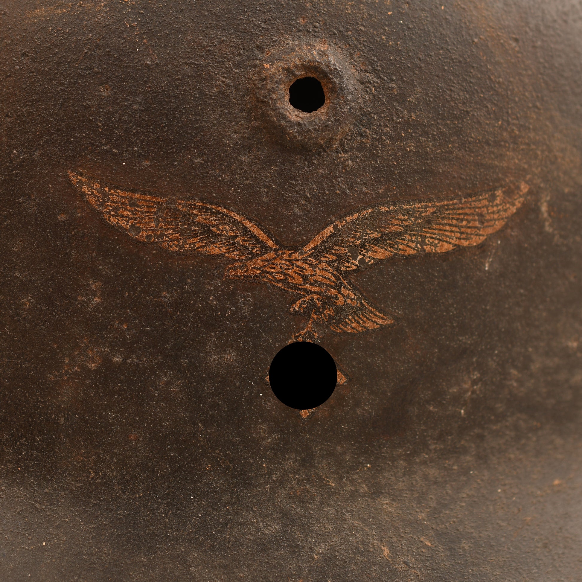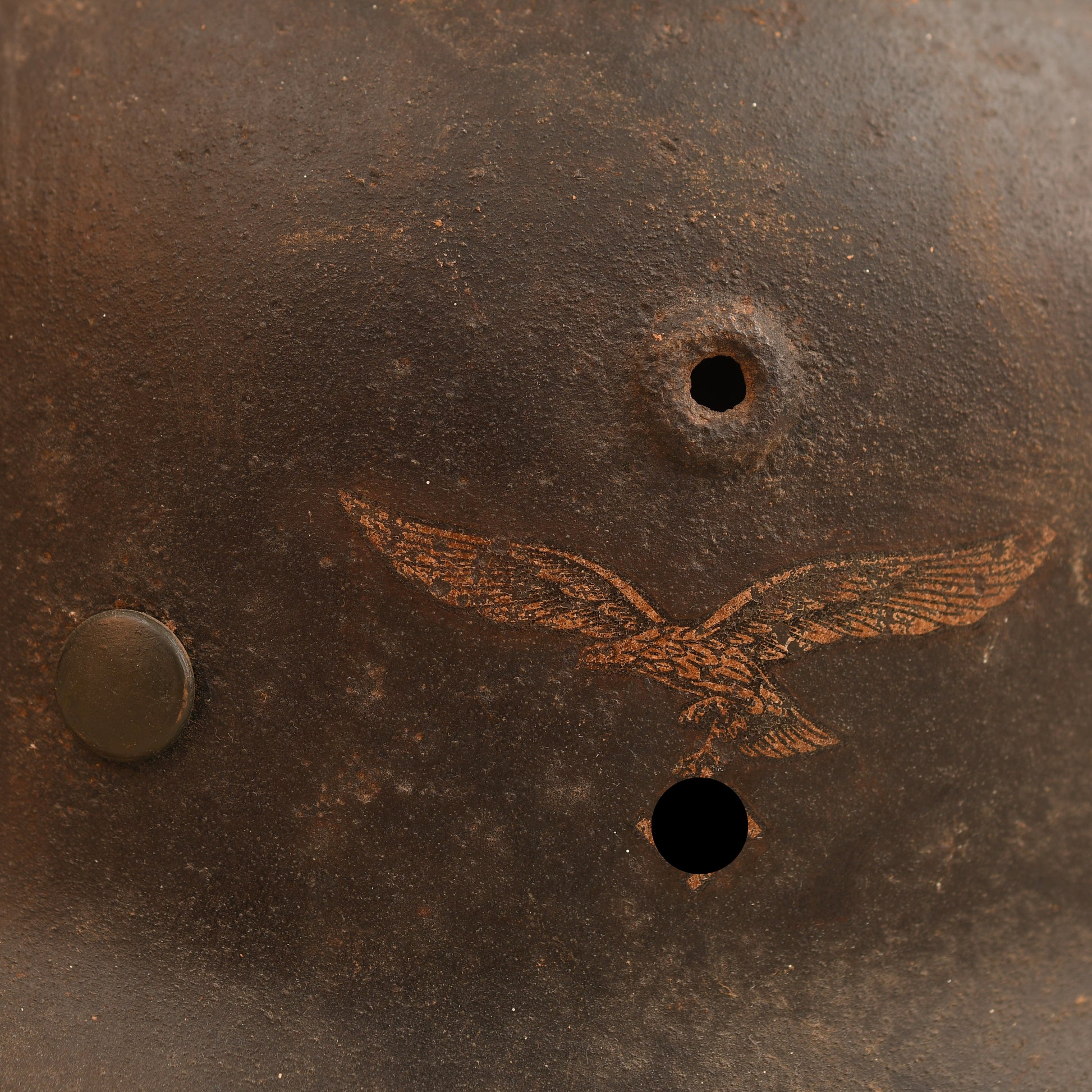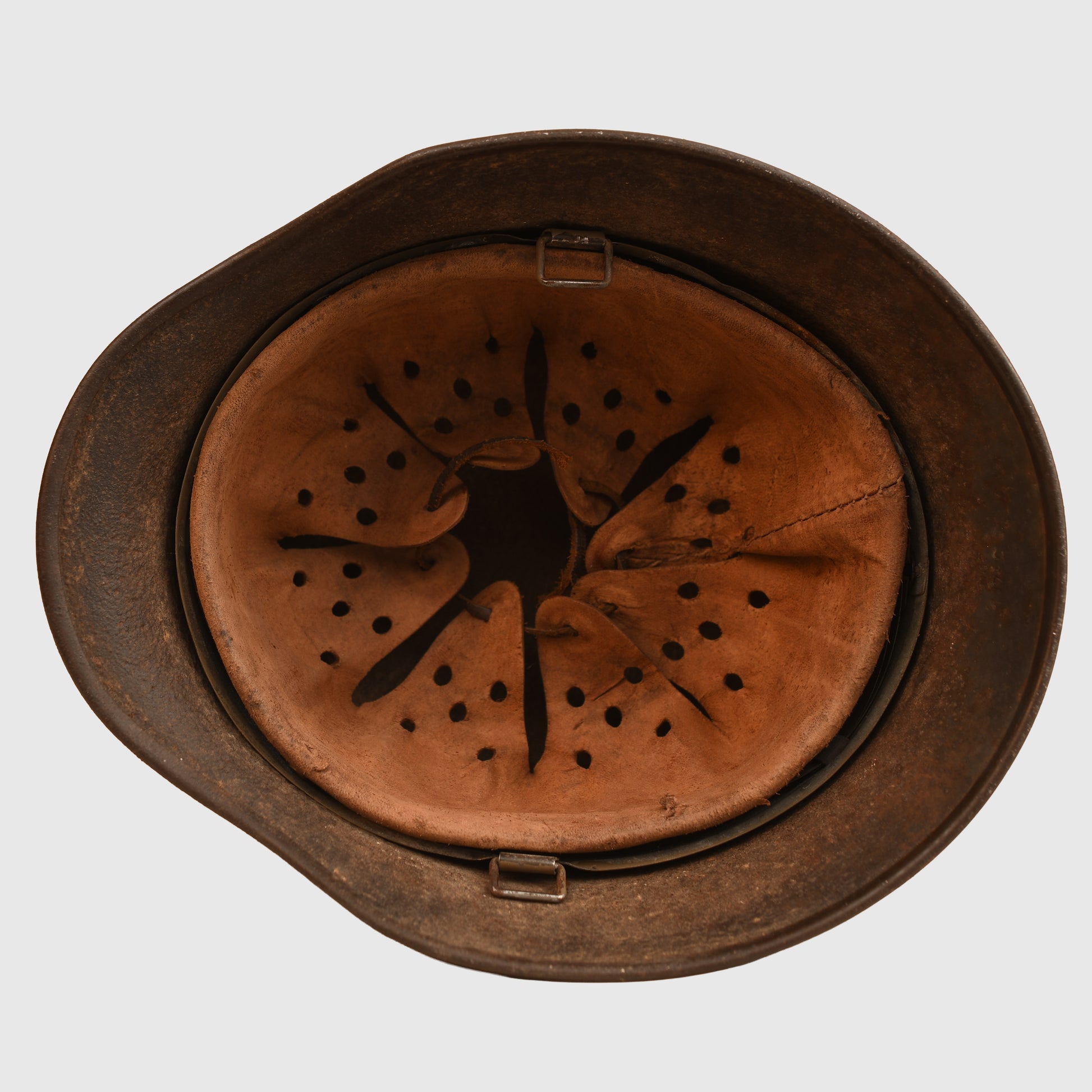 A well-preserved Luftwaffe M40 combat helmet showing authentic age and service character. The interior skirt exhibits corrosion that has obscured the manufacturer’s and batch number stampings, though traces remain faintly visible. The exterior retains much of its original paint with light rust bleed, giving it a pleasing untouched appearance. The Luftwaffe decal is remarkably well-preserved, remaining clear and intact. Inside, the zinc-banded liner is complete with clean, supple leather showing only light service wear — a solid and honest example of a wartime-issued Luftwaffe helmet.