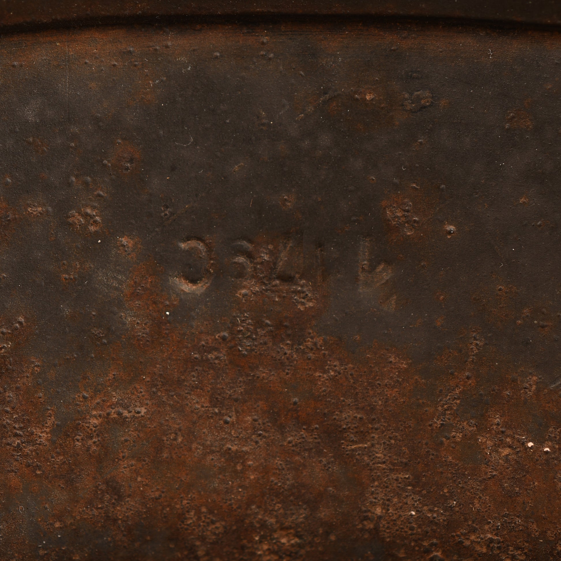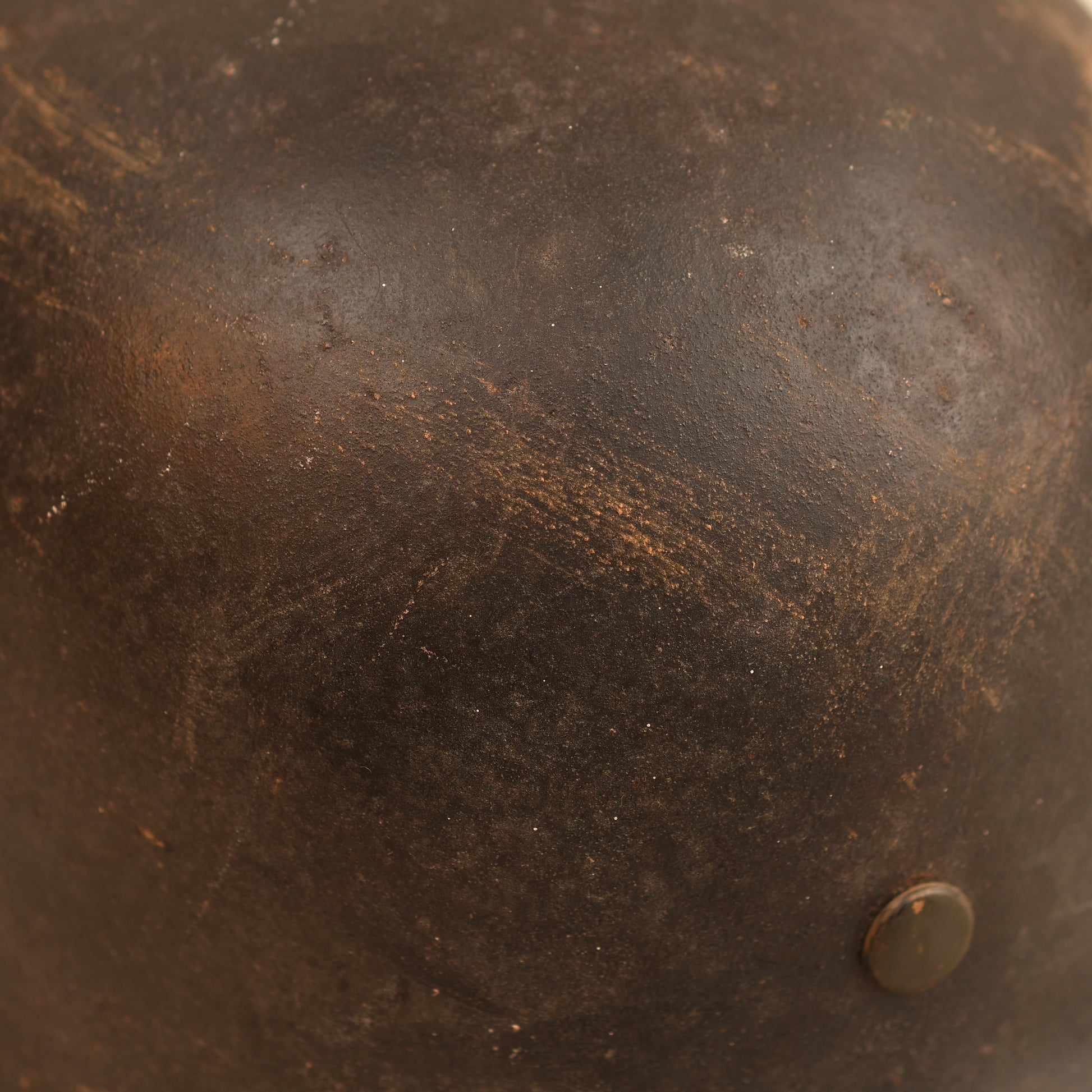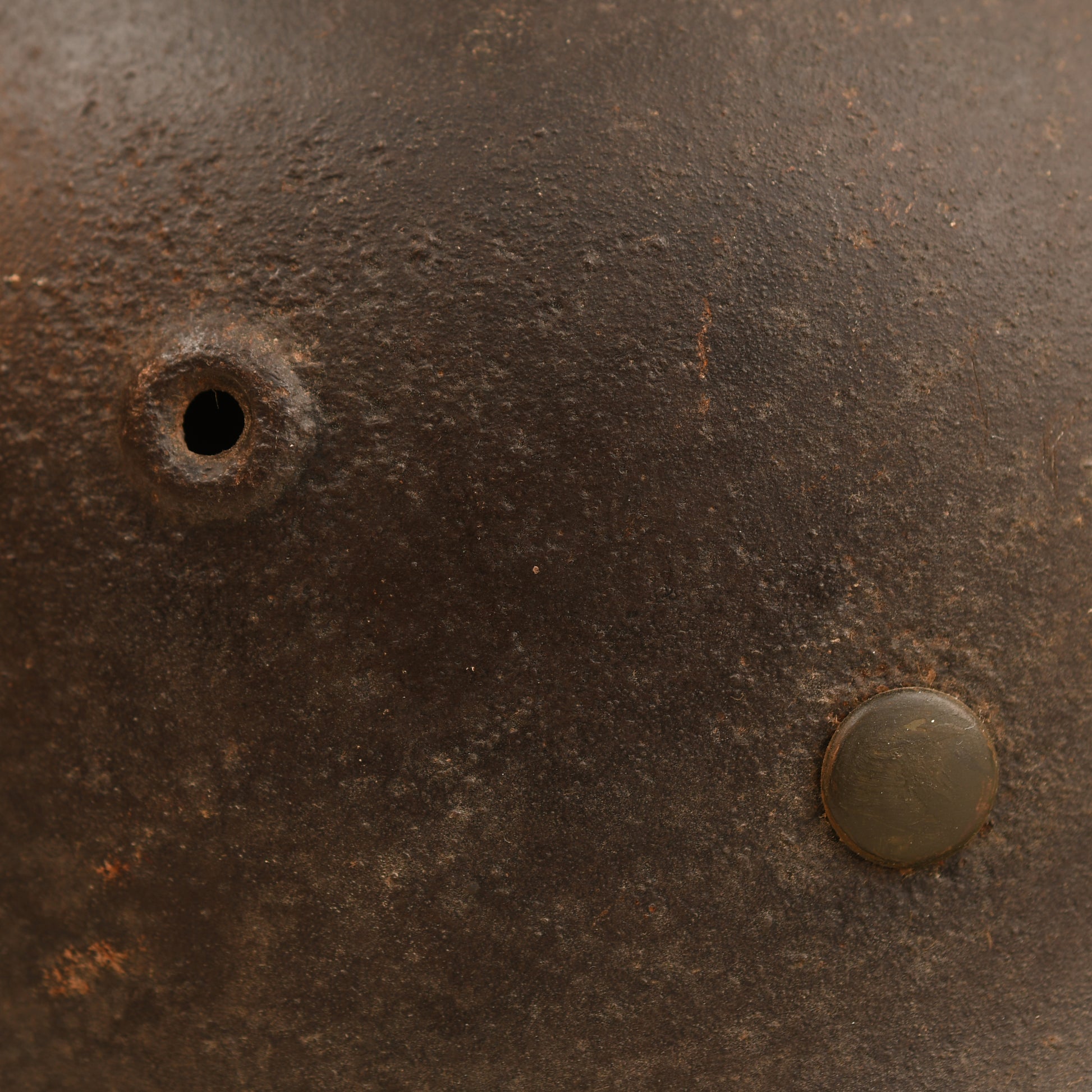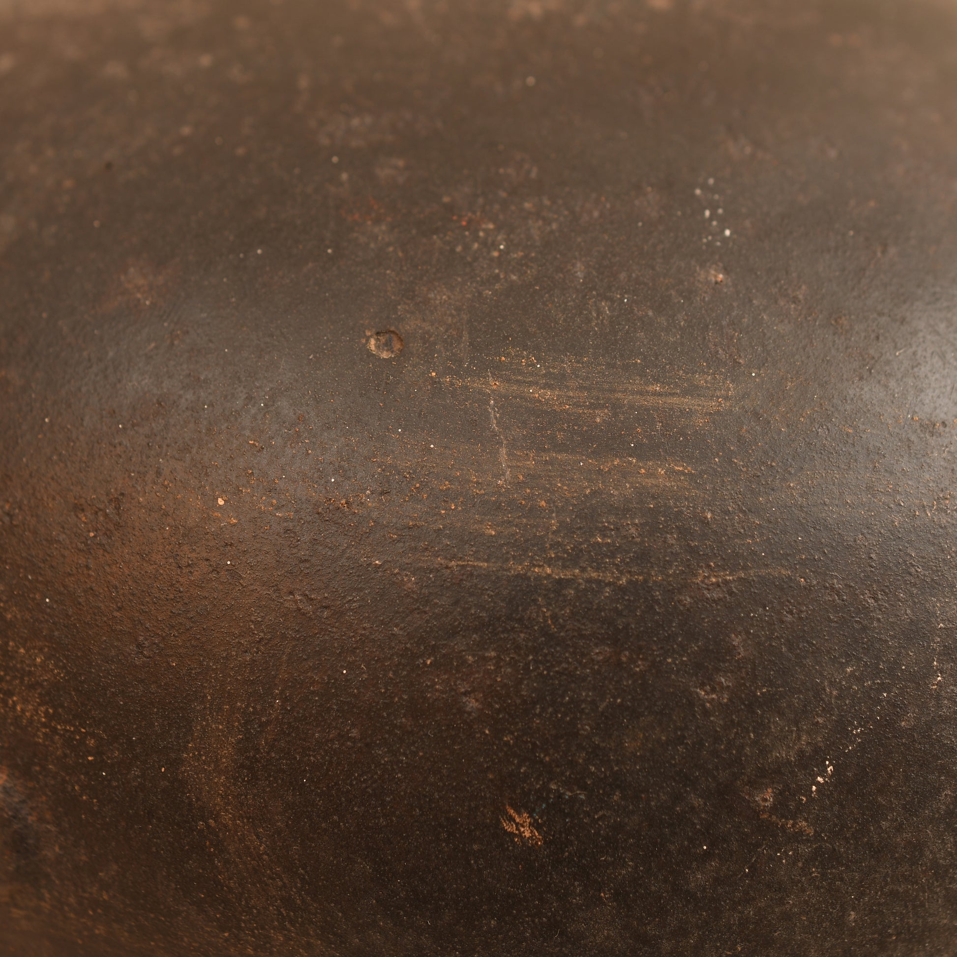 A well-preserved Luftwaffe M40 combat helmet showing authentic age and service character. The interior skirt exhibits corrosion that has obscured the manufacturer’s and batch number stampings, though traces remain faintly visible. The exterior retains much of its original paint with light rust bleed, giving it a pleasing untouched appearance. The Luftwaffe decal is remarkably well-preserved, remaining clear and intact. Inside, the zinc-banded liner is complete with clean, supple leather showing only light service wear — a solid and honest example of a wartime-issued Luftwaffe helmet.