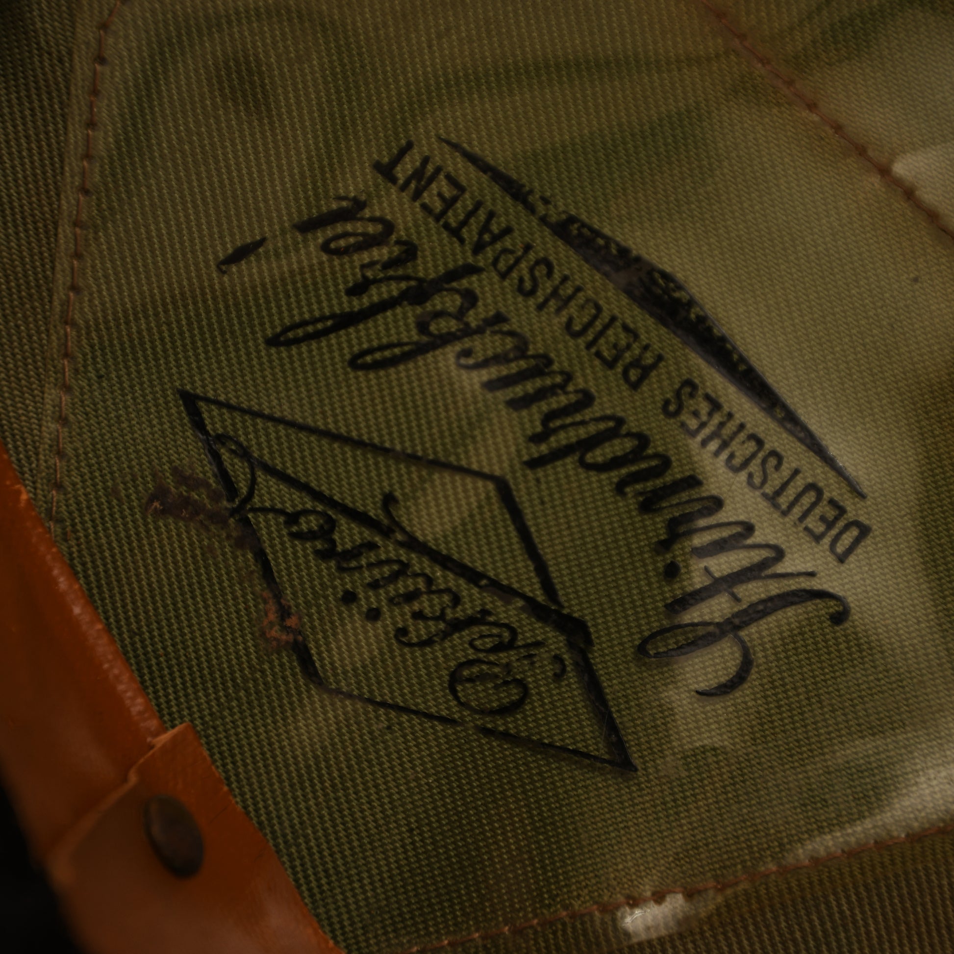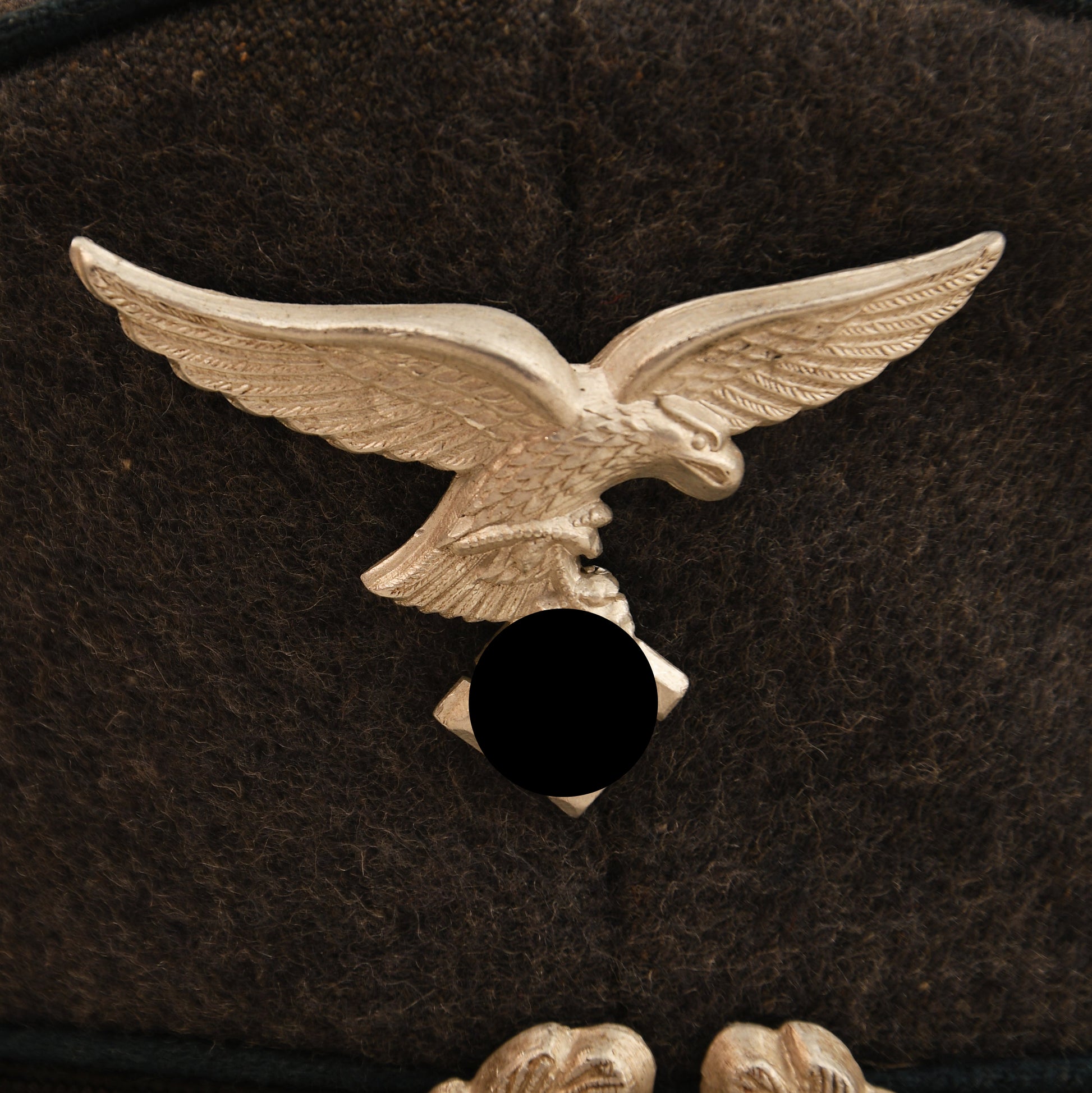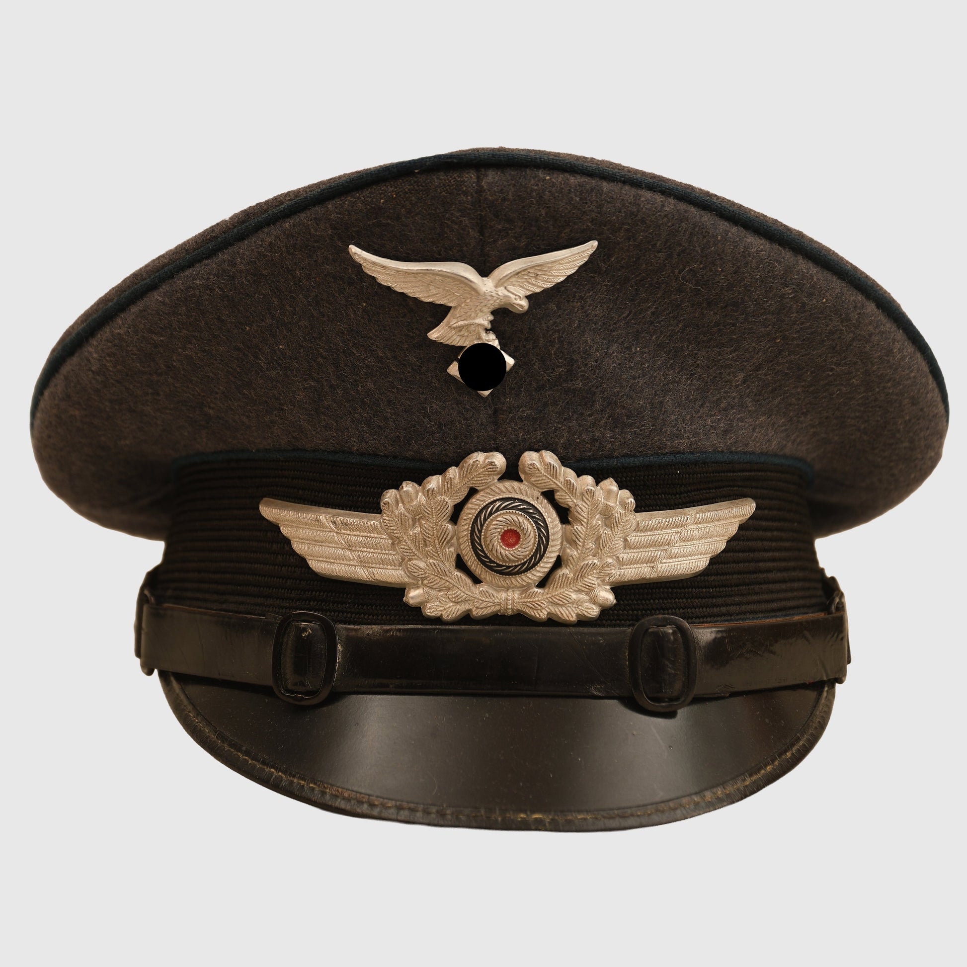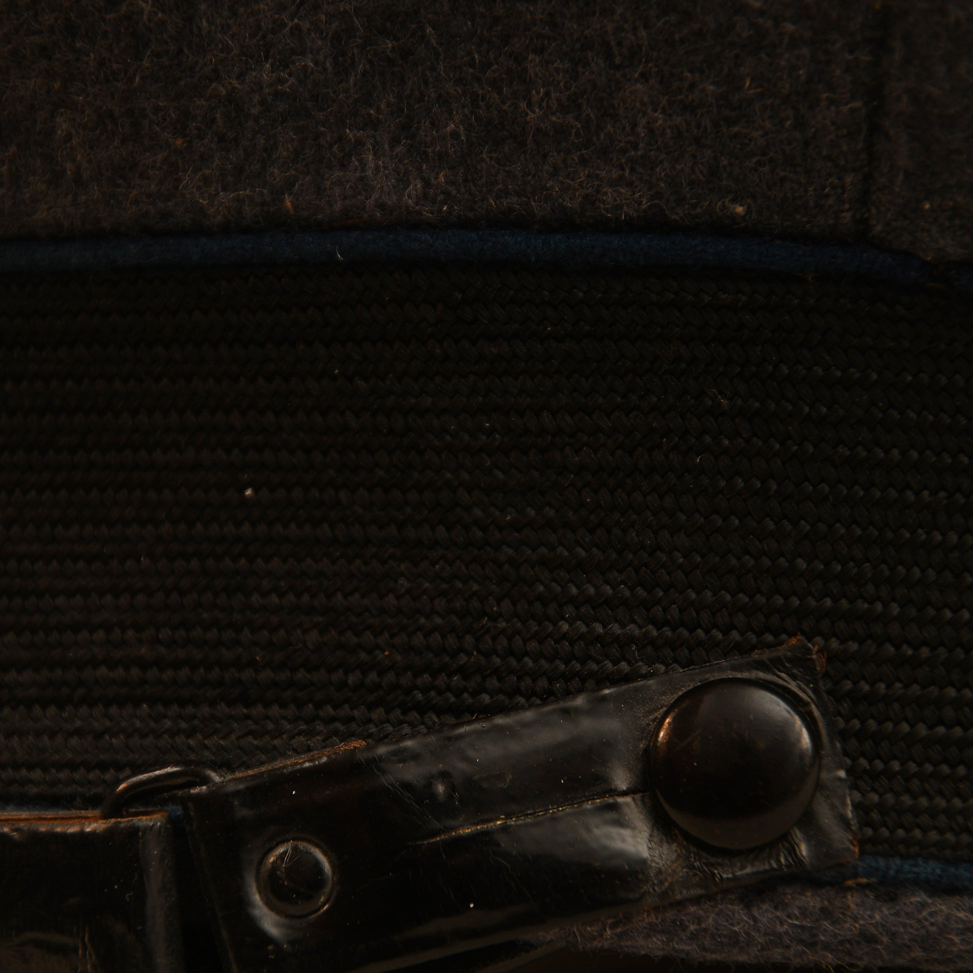 A fine example of a rare Luftwaffe medical section enlisted ranks or NCO’s visor cap. Constructed in Luftwaffe blue-grey enlisted issue cloth, showing only two small moth nips—one to the crown and another to the lower edge. Blue piping is featured on the crown as well as on the upper and lower sections of the mohair centre band. Fitted with a matched set of the early droop-tailed eagle and standard cockade, with a double buckle chinstrap and the double-edged front visor style typical of Luftwaffe caps. The interior has a light tan ersatz sweatband, green satin crown and side lining, and a complete unbroken celluloid lozenge bearing the Pekuro maker’s logo. Estimated size 55.