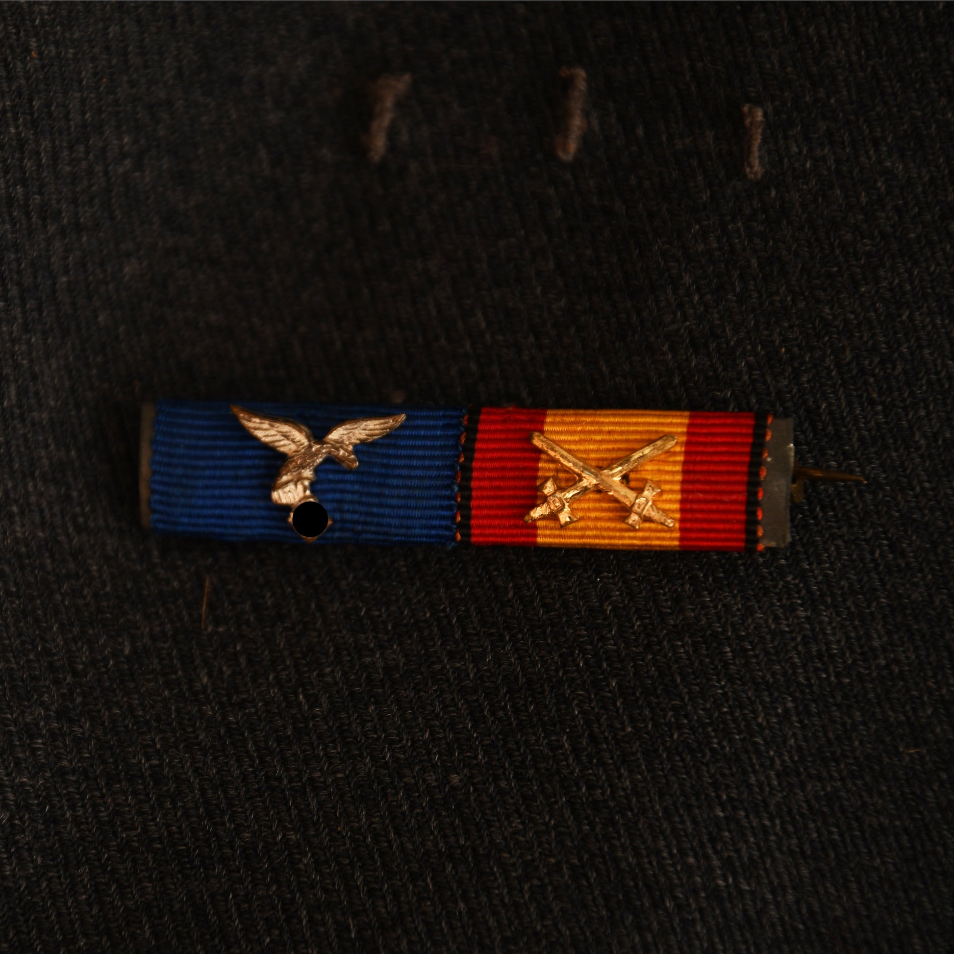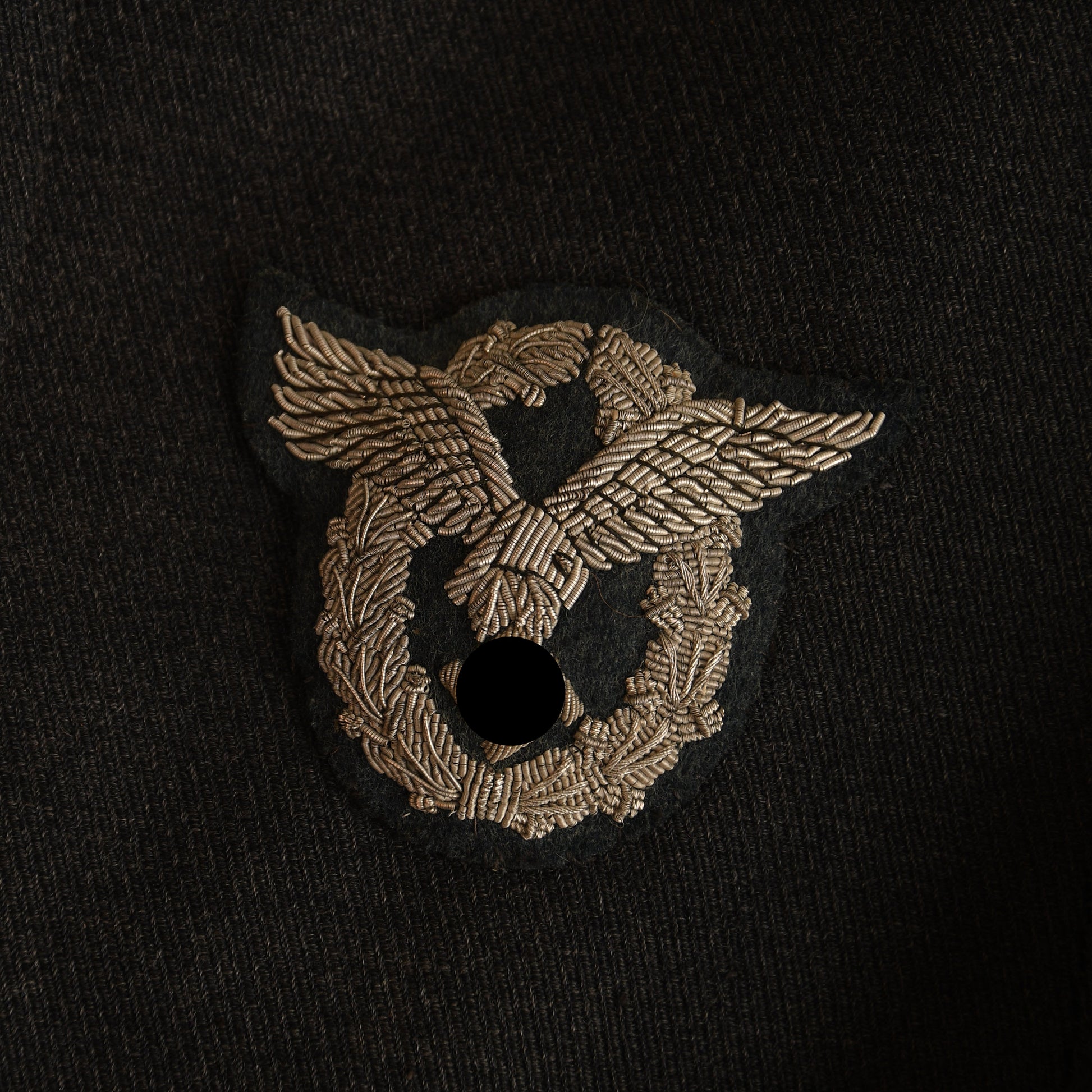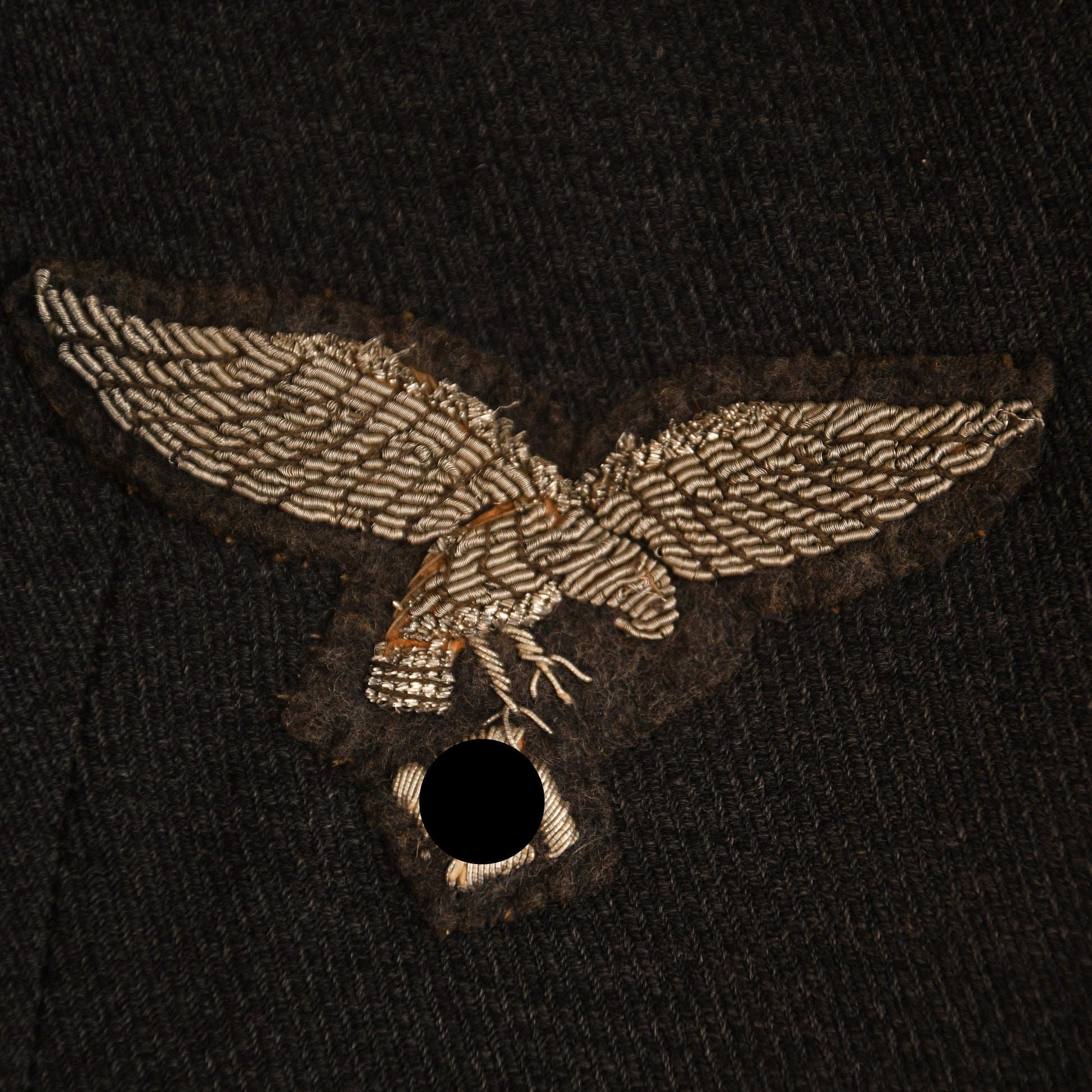 The blouse is equipped with two rows of three loops for twin medal ribbon bars, with one ribbon bar remaining, displaying the Luftwaffe long service ribbon and the Spanish Civil War award—perfectly complementing the early droop-tailed eagle. Standard silver cording graces the collar, and a fully original padded Luftwaffe officers pilot’s badge in bullion weave is fitted.