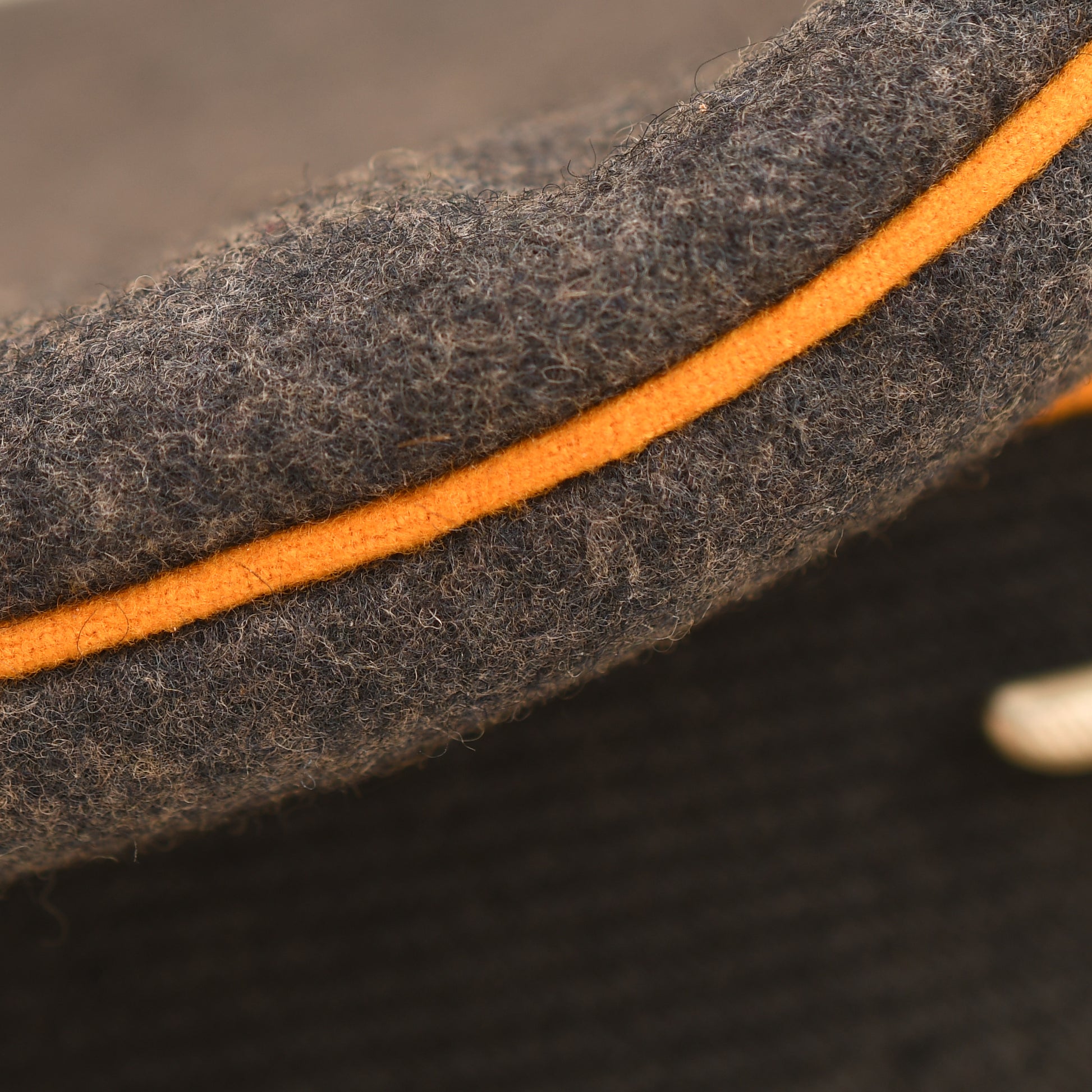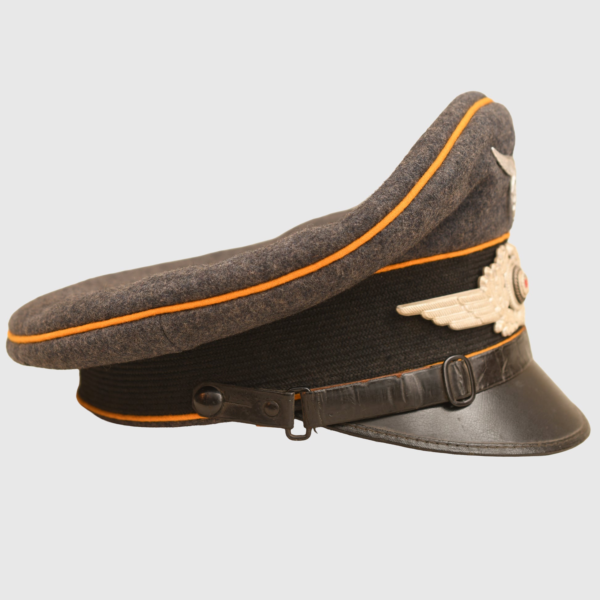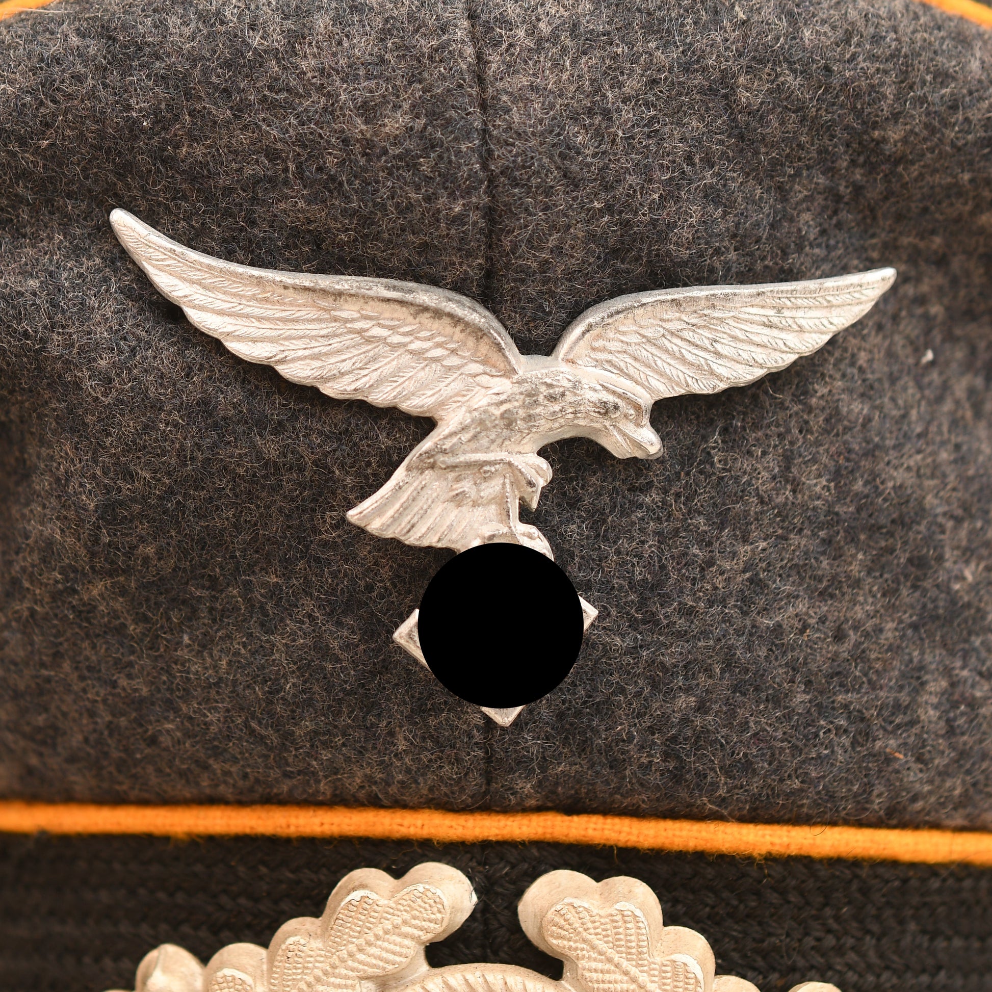 This is a very clean and historically significant visor cap for a non-commissioned officer or enlisted man serving with the Luftwaffe. The cap is size 57 1/2 and is constructed from issue-quality wool. The nap of the cloth remains thick, with only a single moth nip noted on the rear overhang.
