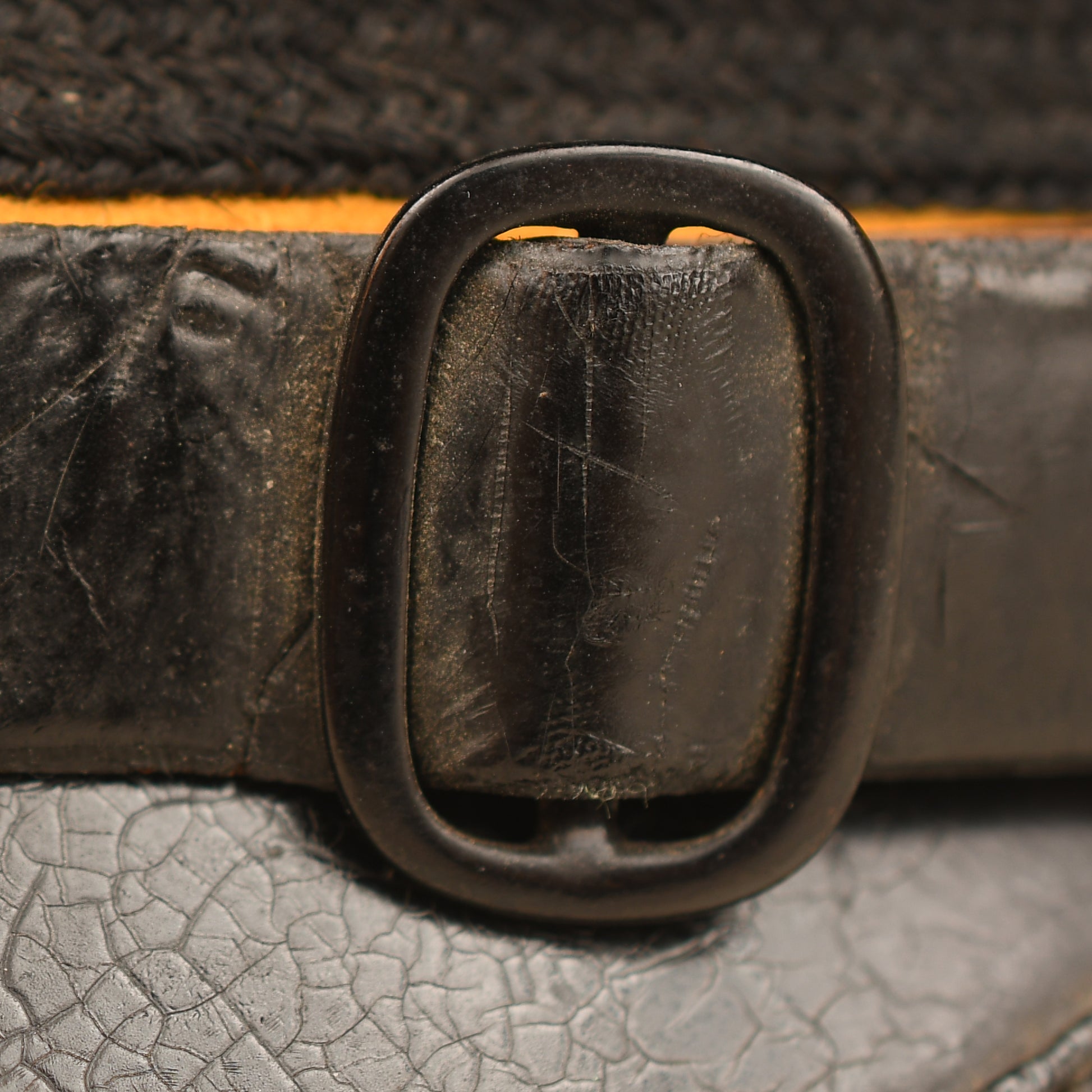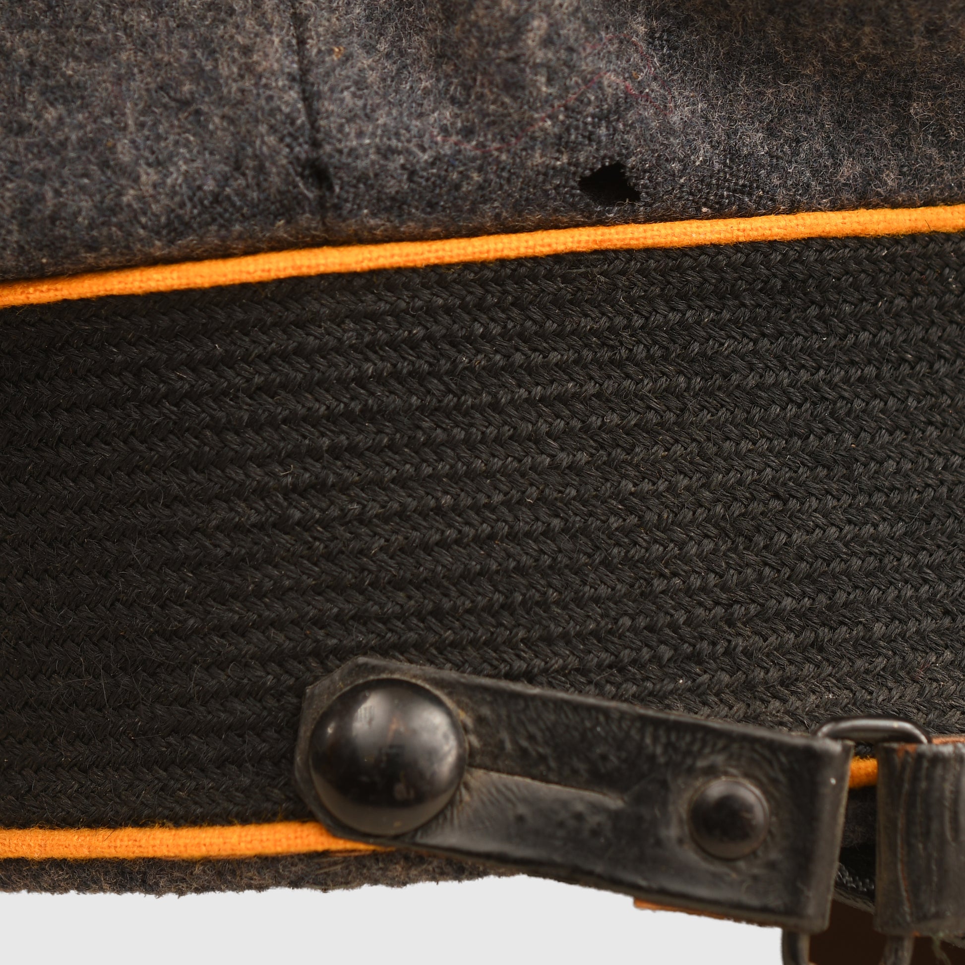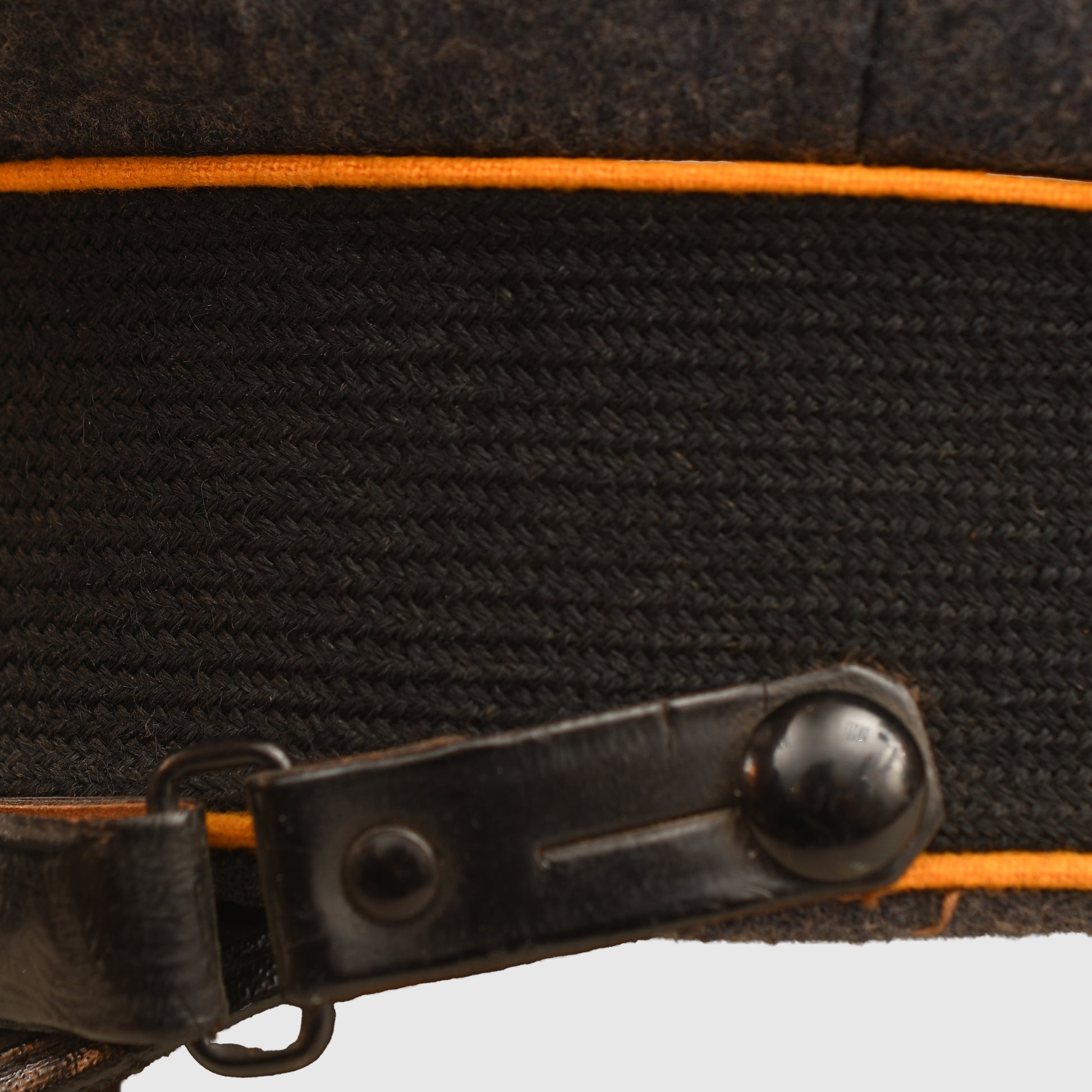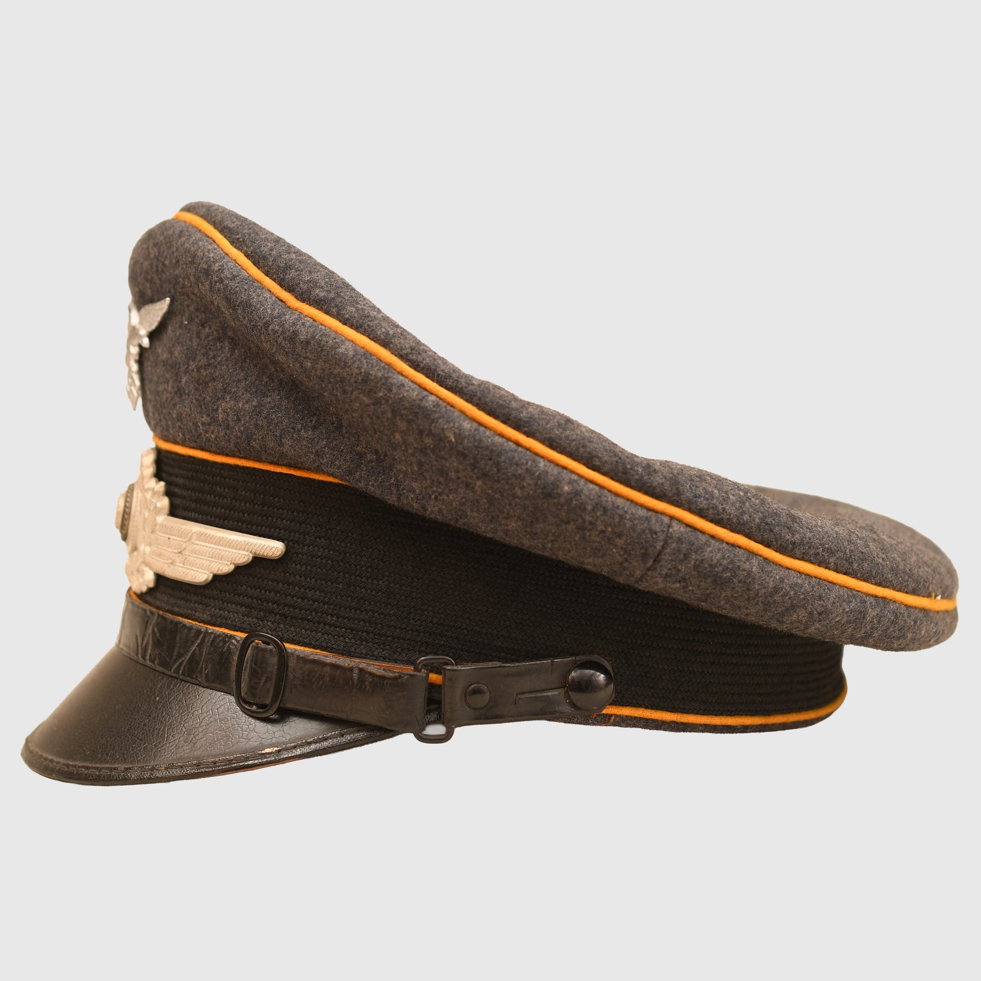 The cap features the yellow piping associated with the flight and paratrooper sections, along with a standard mohair centre band. It is fitted with a matching set of aluminium insignia and the standard double-oval buckled leather chin strap. The front peak is the double-ribbed style typically seen on Luftwaffe headgear.