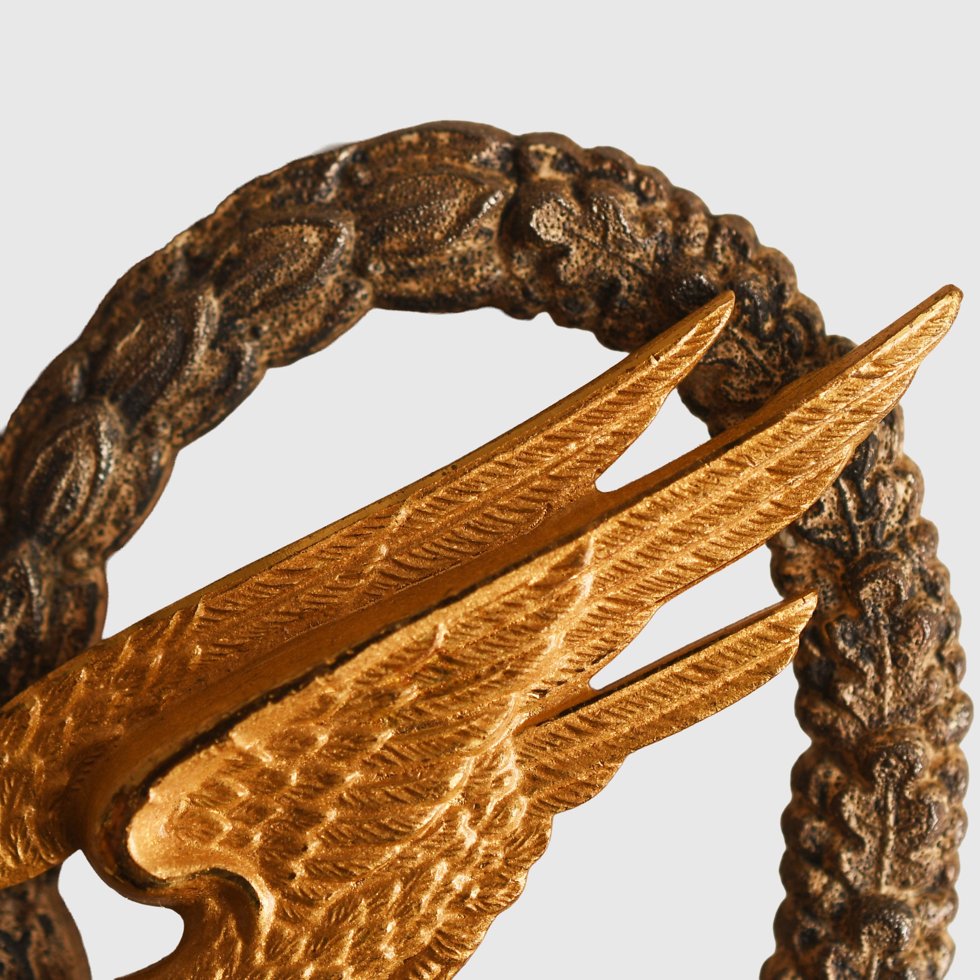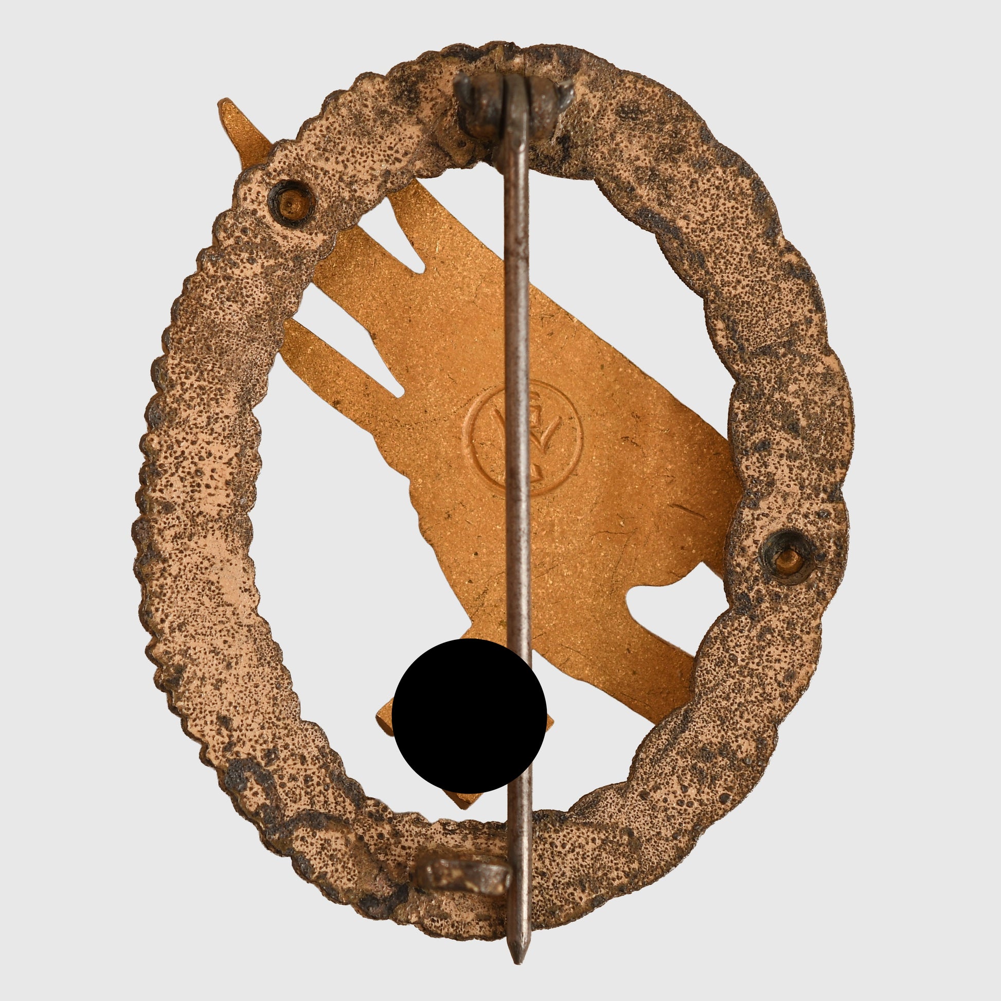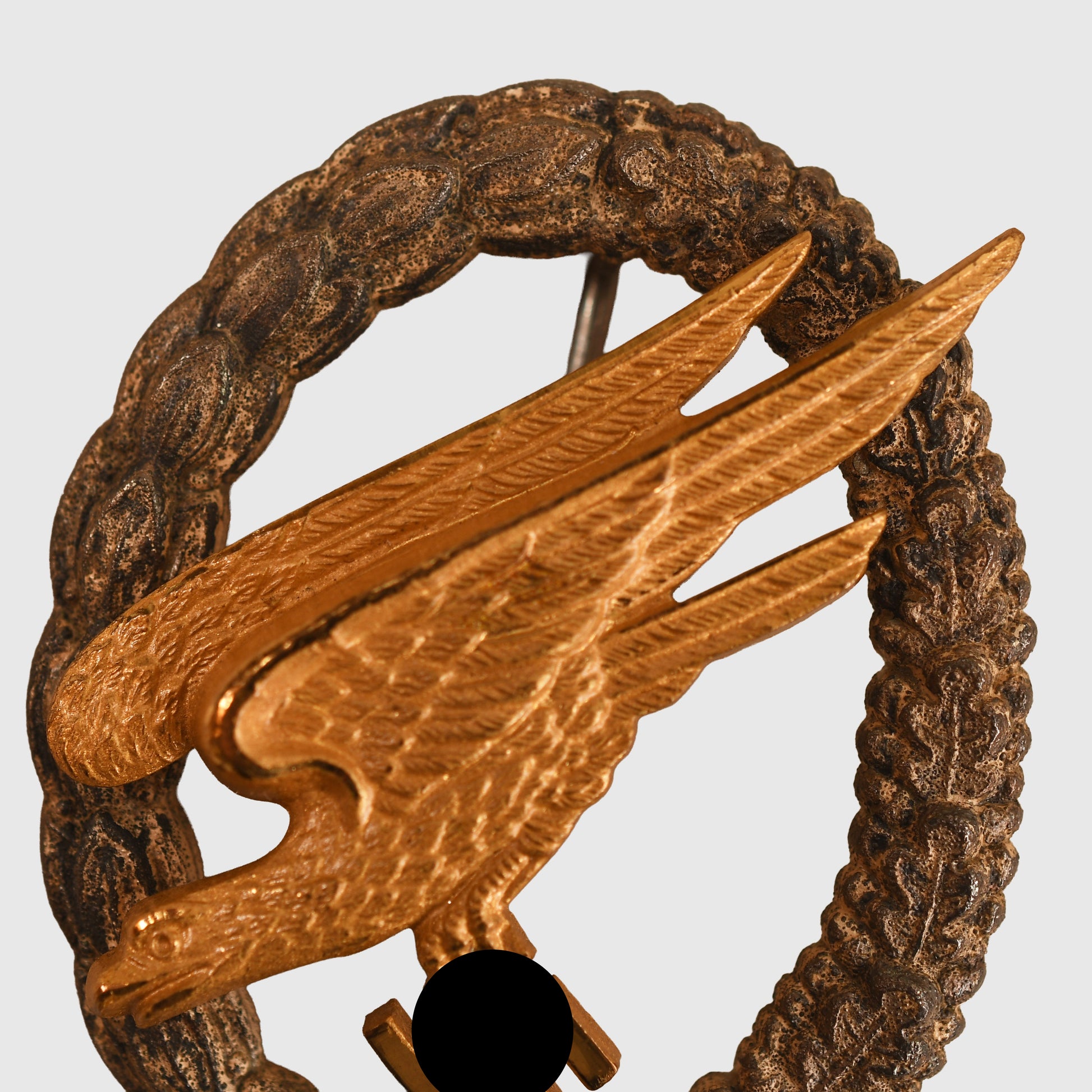 A lovely quality award, the diving eagle has all its original fire gilt with frosted highlights to the edges of the wings and the eagle’s head. A small area to the top left hand side of the wreath has slightly lost its finish, the silvered finish generally remaining to the remainder of the wreath. Classic GWL construction on the reverse side. The hook is cast with the wreath and has its thin needle pin and two sunken rivets with the logo ‘GWL’ impressed into the reverse side of the eagle. The GWL is the company of Gebruder Wegerhof of Ludenscheid.