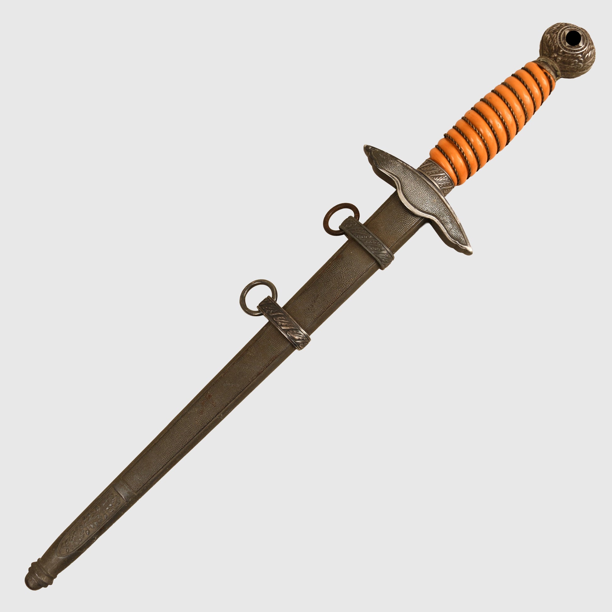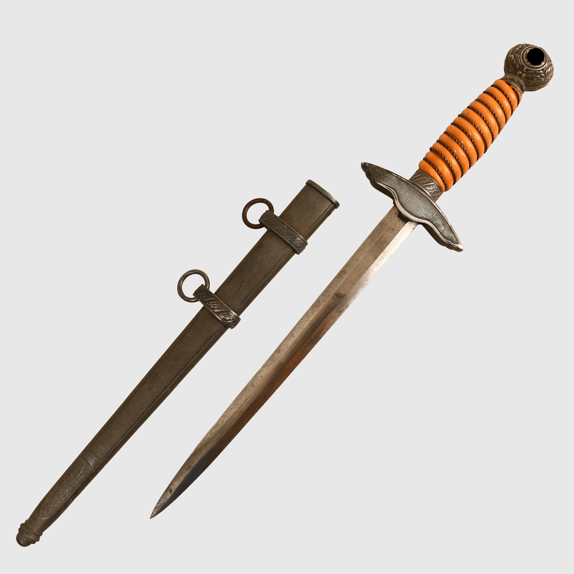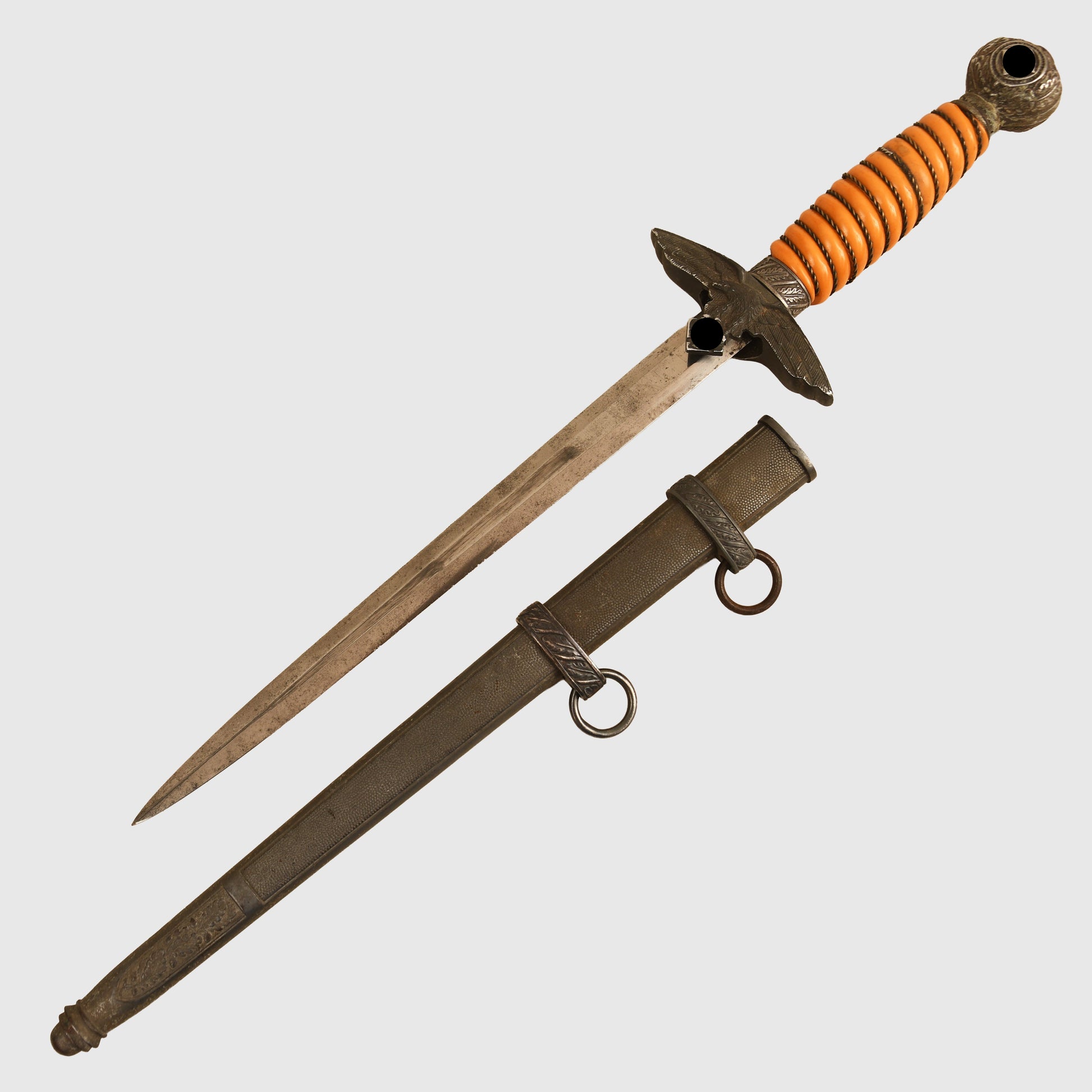 A beautifully preserved example featuring a deep patinated finish and an attractive deep orange grip. The surface by Eickhorn of Solingen is virtually mint, with all grip wire intact. The upper pommel, cross guard, and scabbard retain a dark, even patina, with both scabbard rings complete and the grip free from chips. An excellent example of a Luftwaffe officers display piece with strong overall presence.