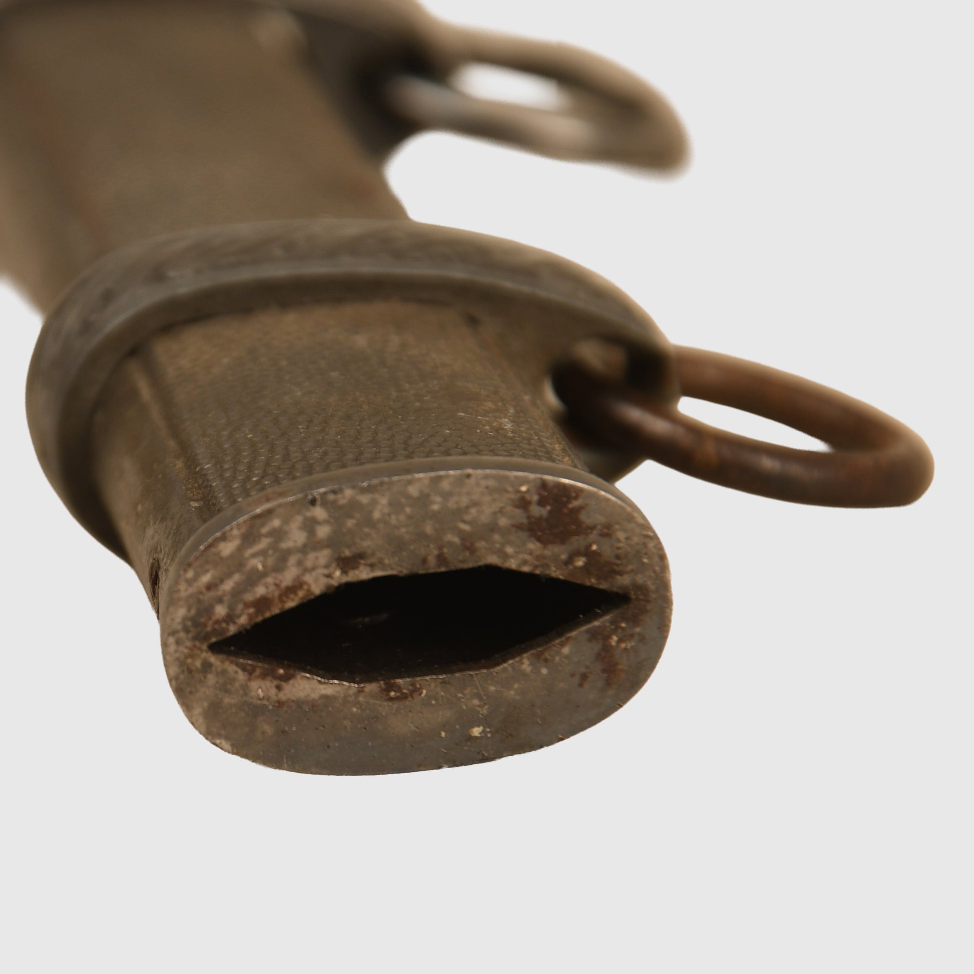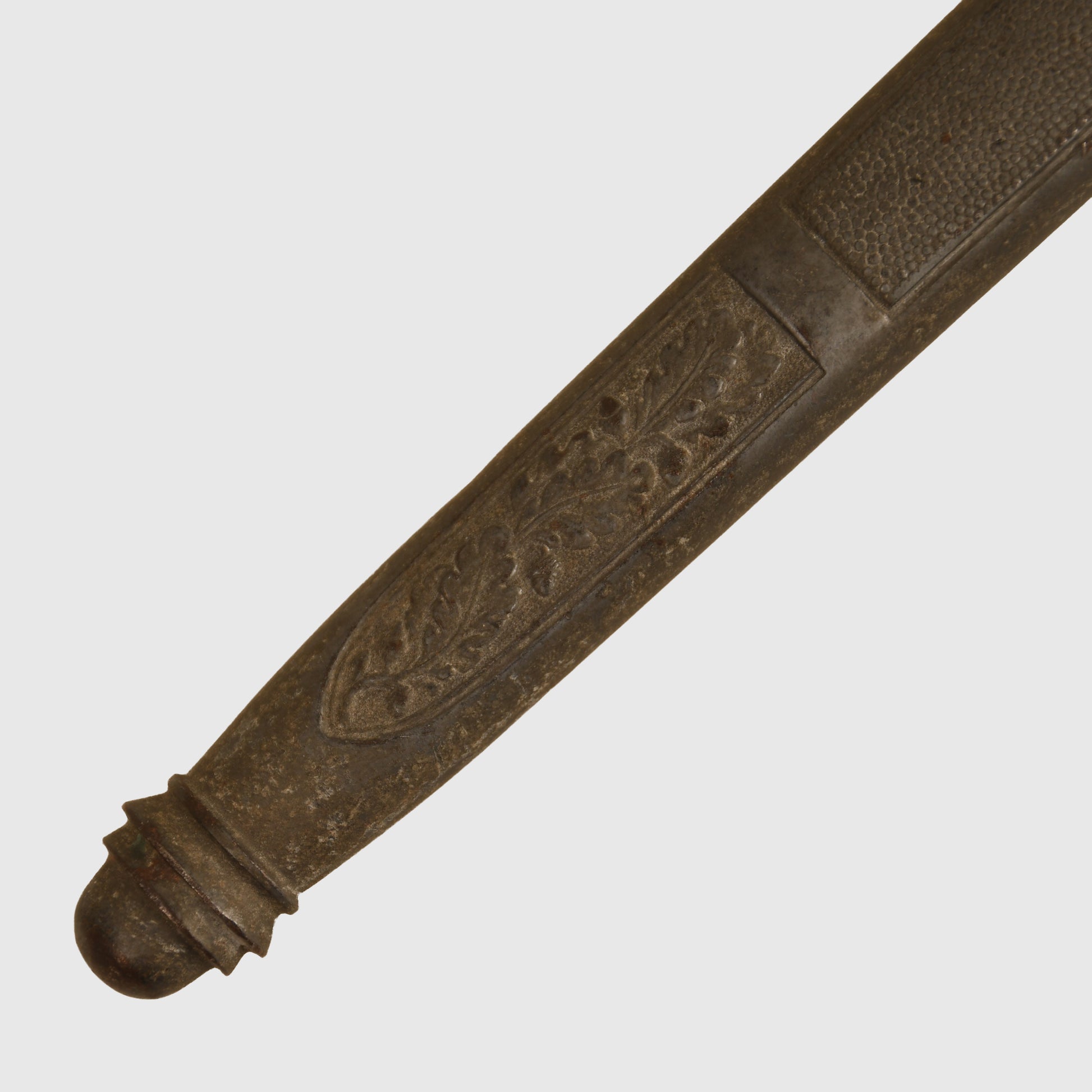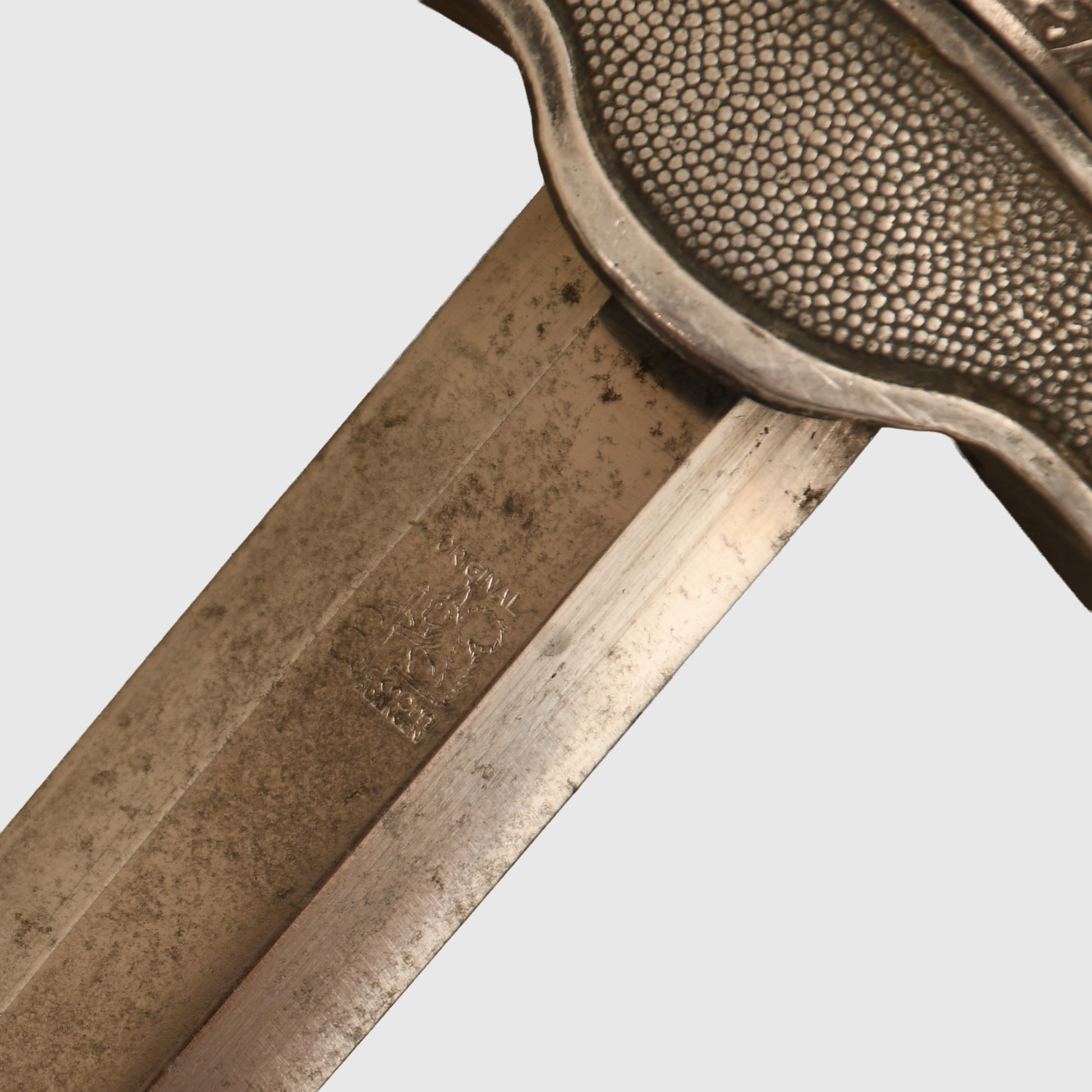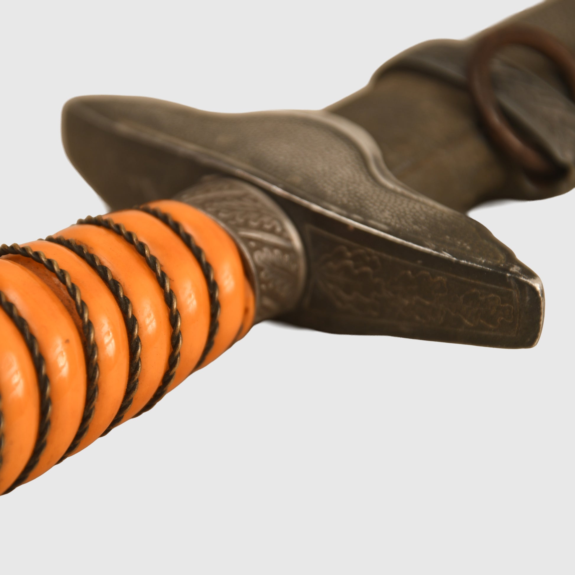 A beautifully preserved example featuring a deep patinated finish and an attractive deep orange grip. The surface by Eickhorn of Solingen is virtually mint, with all grip wire intact. The upper pommel, cross guard, and scabbard retain a dark, even patina, with both scabbard rings complete and the grip free from chips. An excellent example of a Luftwaffe officers display piece with strong overall presence.