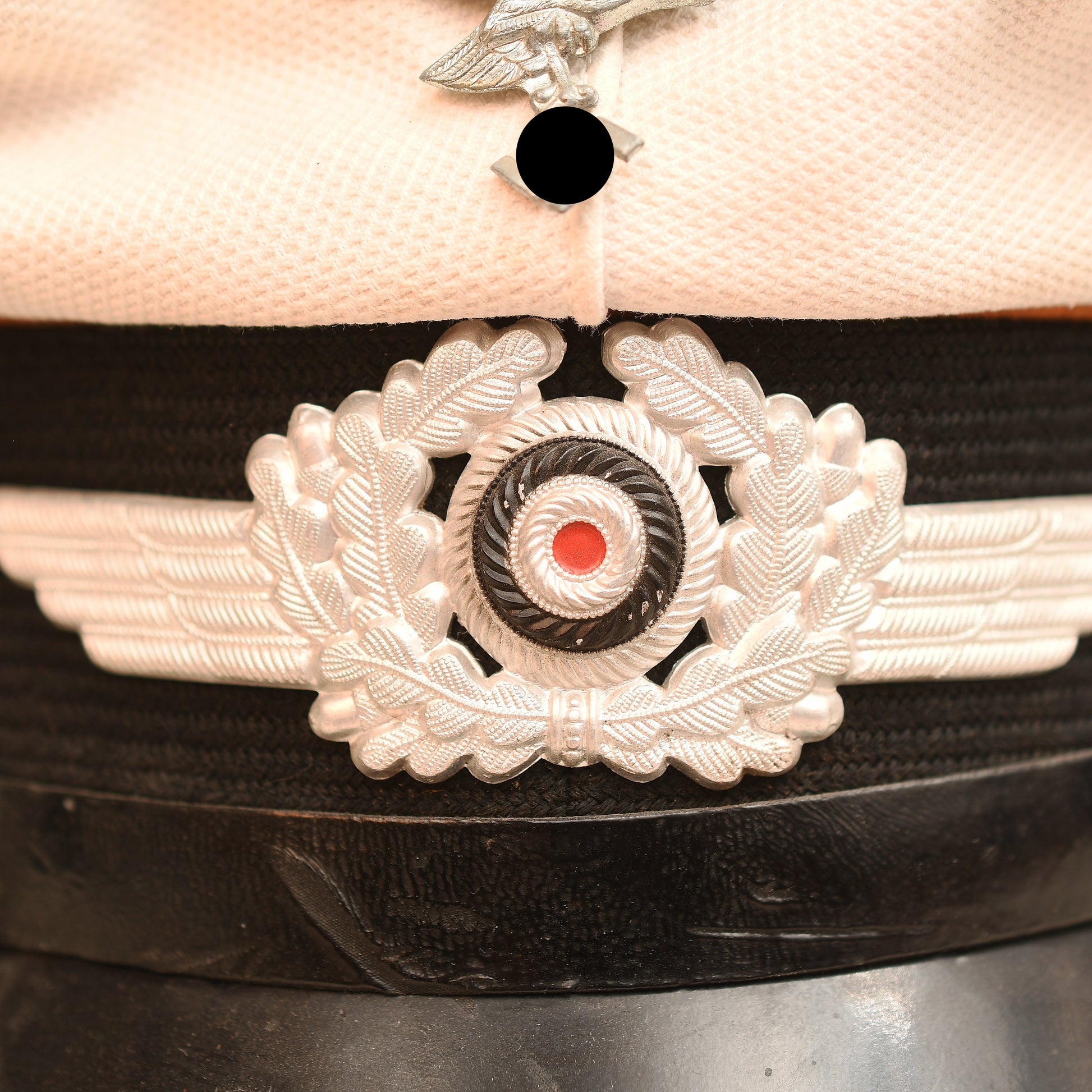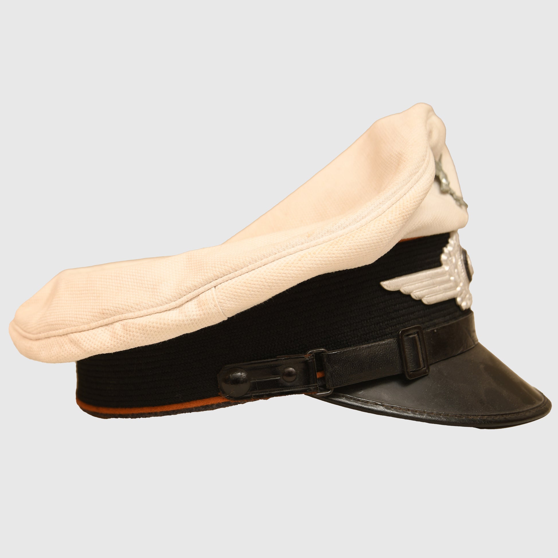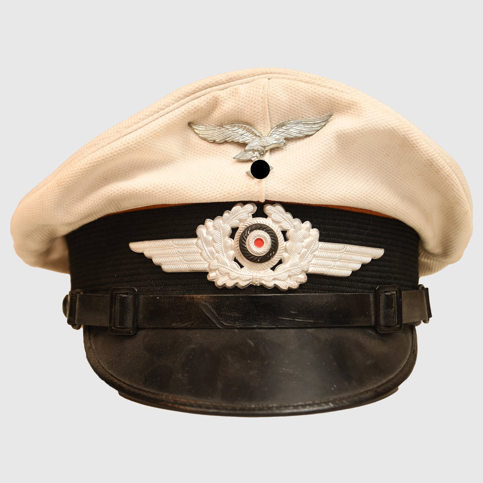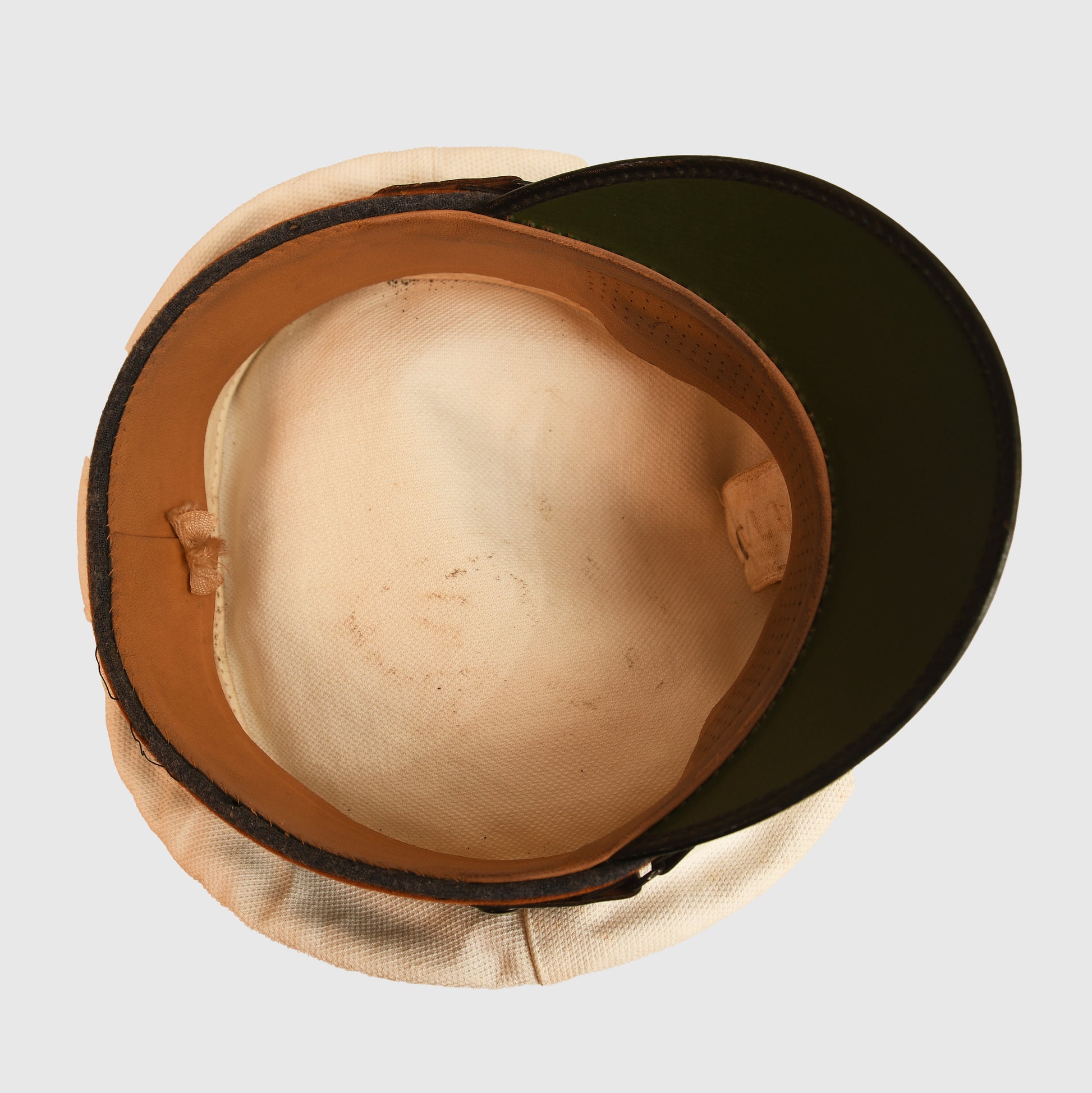 A very good example of a Luftwaffe enlisted man’s or NCO’s white top visor cap for a member of a signals unit; featuring the correct brown piping to both upper and lower edges of the standard mohair centre band. The removable white cotton top shows light service staining consistent with field use; overall appearance remains sharp and well-presented.