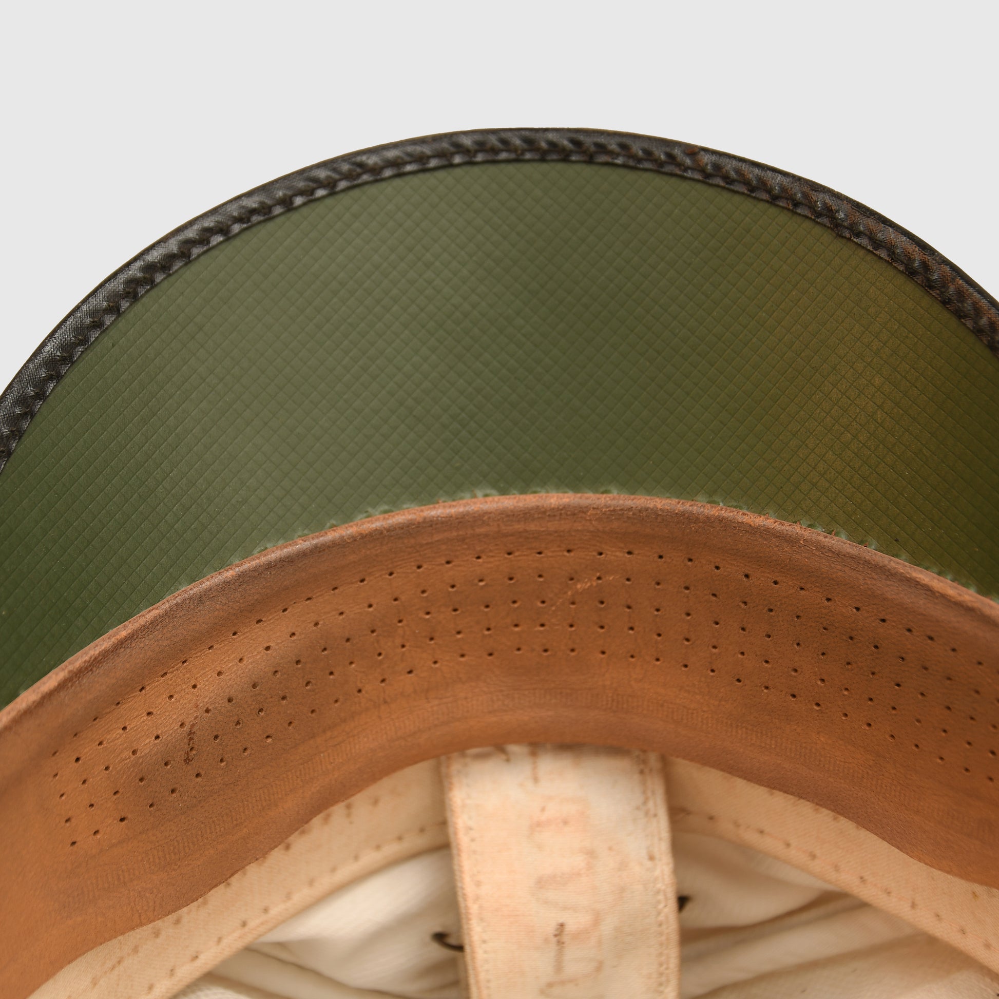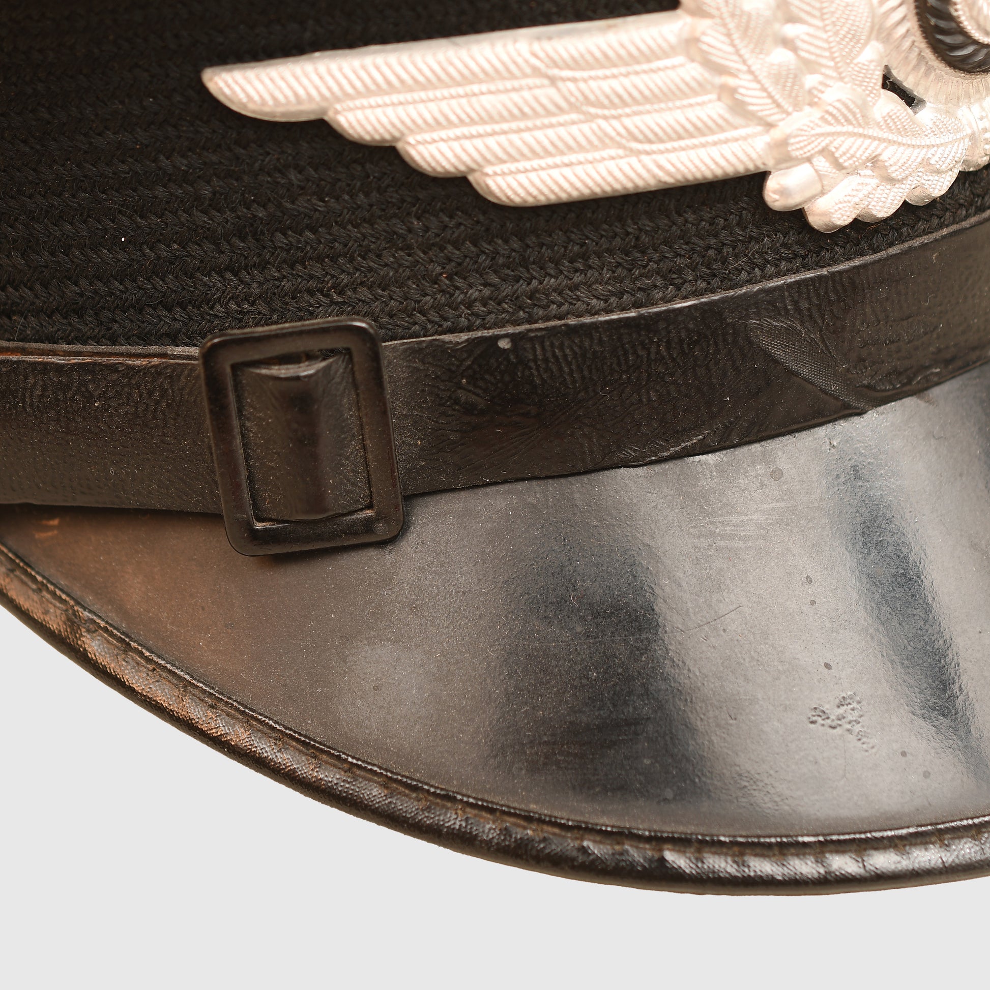Fitted with a matched set of aluminium national eagle and cockade; the chinstrap is standard issue with double buckles. The visor itself has the typical double-ribbed edge found on Luftwaffe caps. The interior retains its complete mid-tan sweatband; the leather remains supple with only minor signs of service wear. A desirable and increasingly scarce branch-specific Luftwaffe cap in solid condition.
