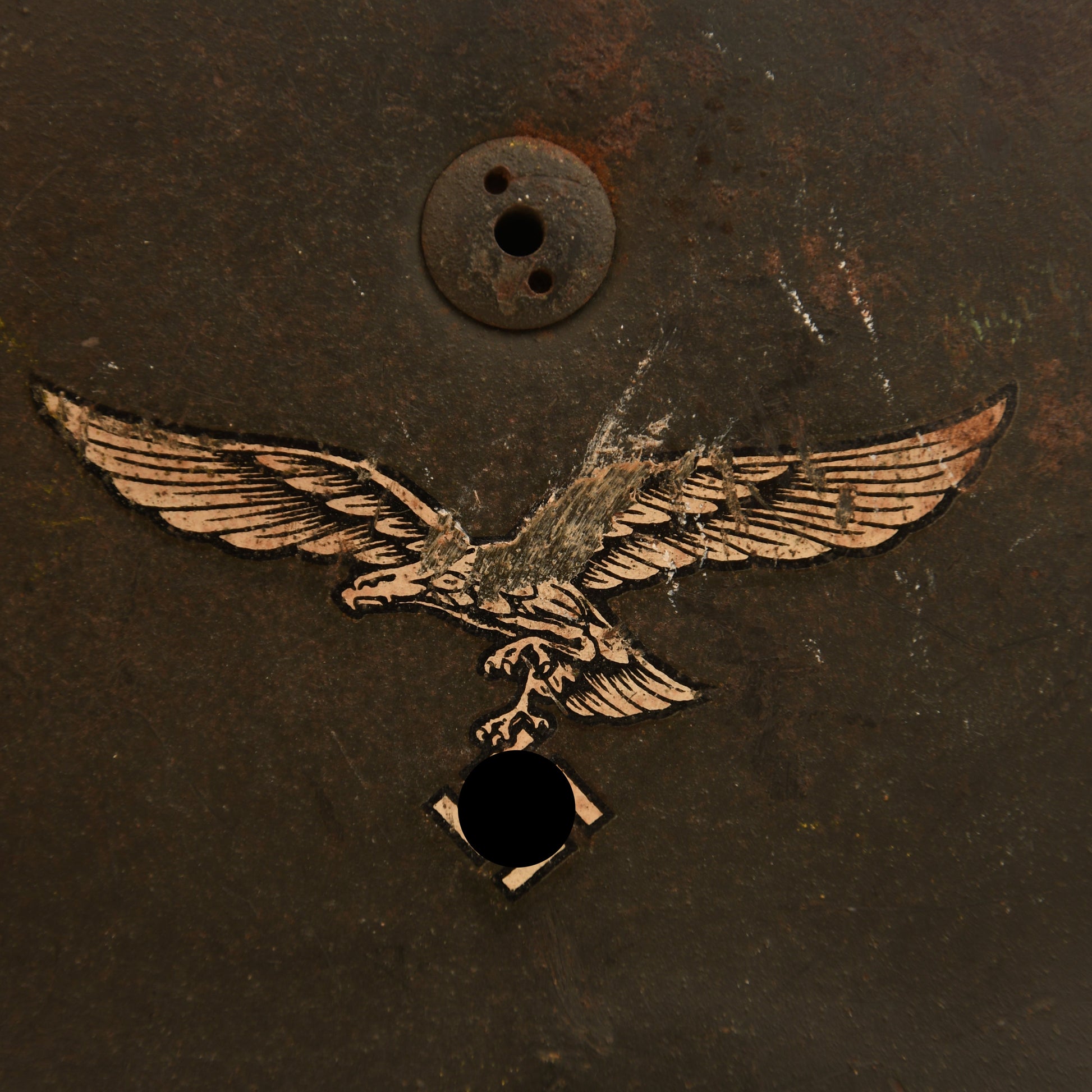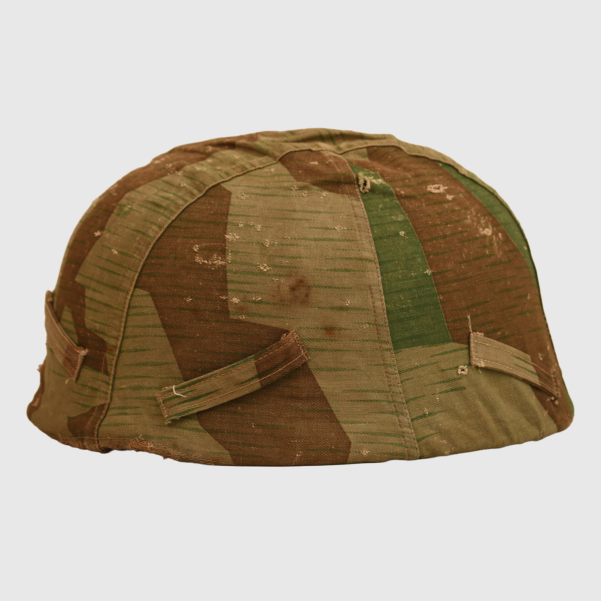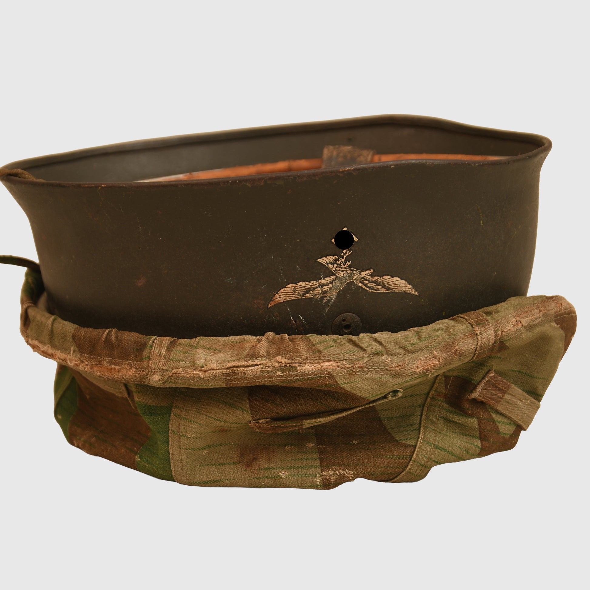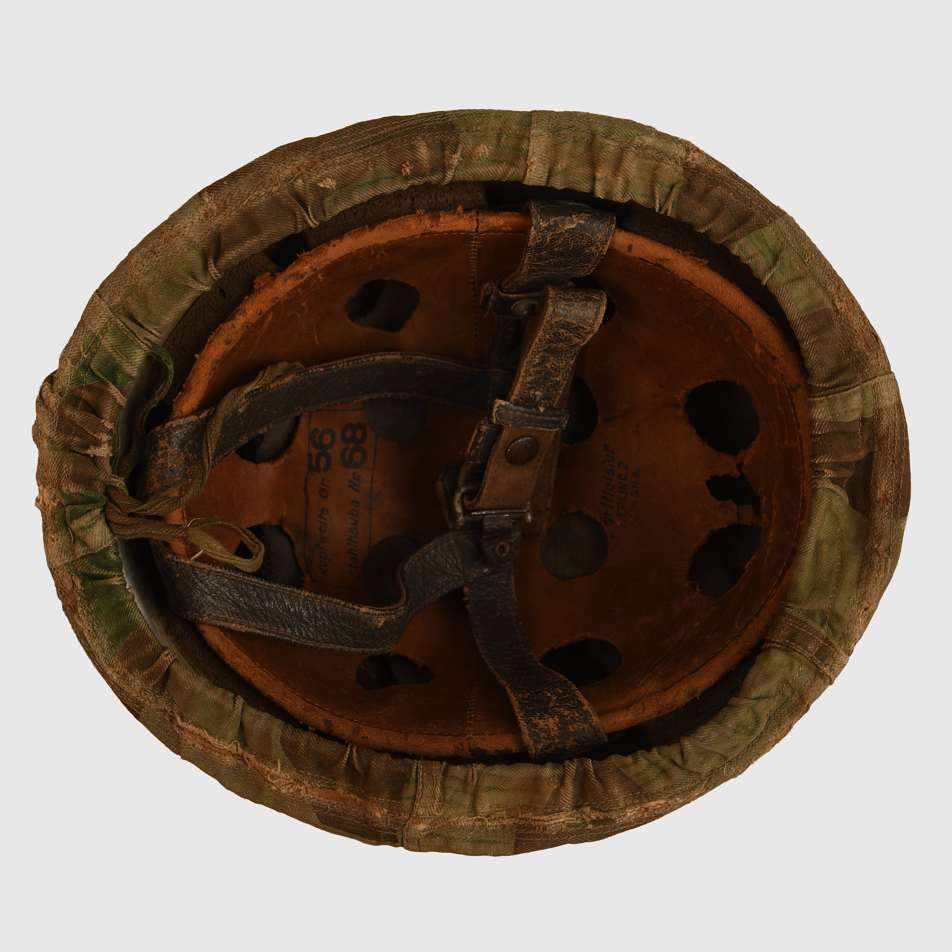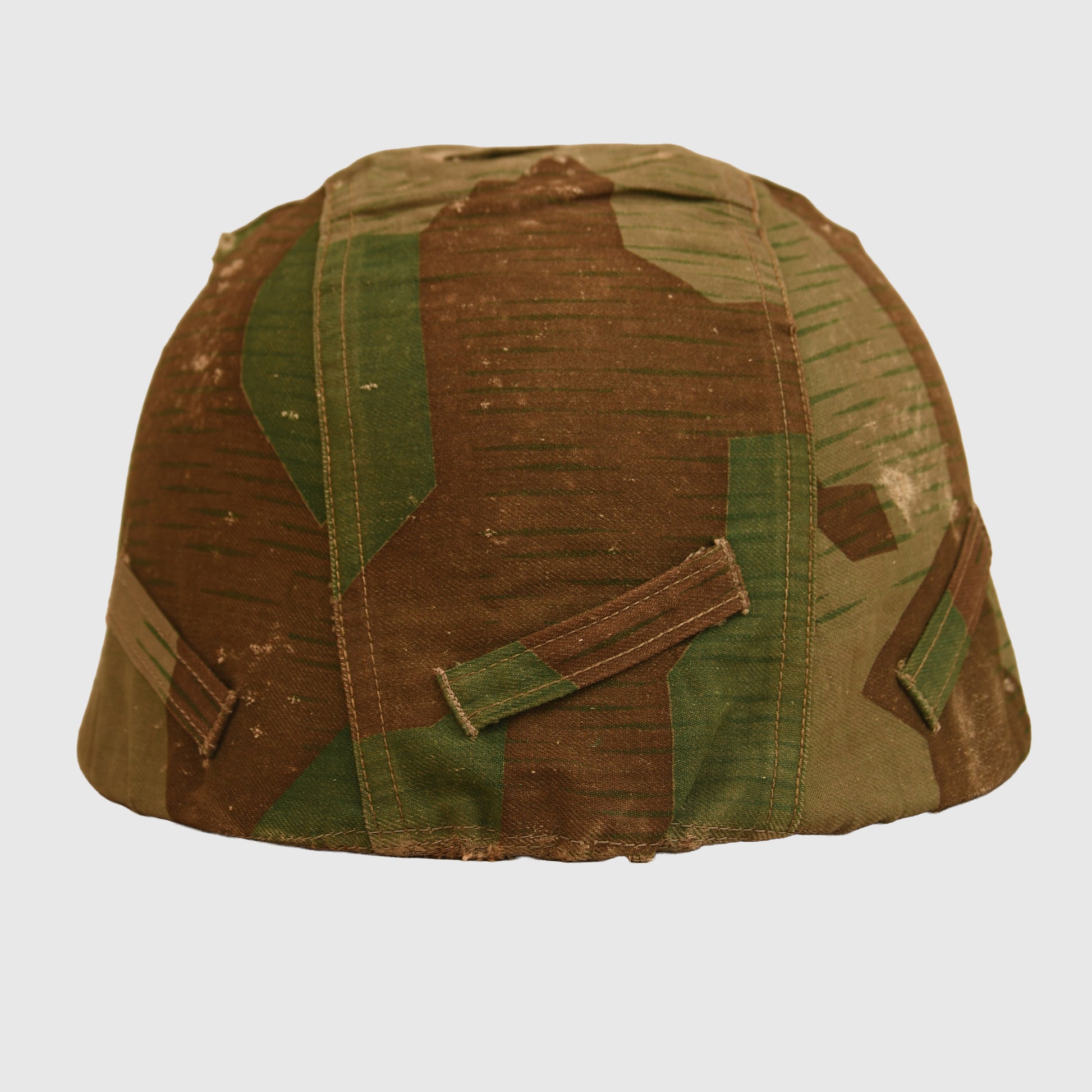 Accompanying the helmet is an original army splinter-pattern camouflage cover with foliage loops, field-adapted by a Luftwaffe paratrooper. The cover shows minor nicks, light discoloration, and small areas of rust bleed that align with the helmet shell, confirming it as original. Tested and verified, the cover retains its bowl-like shape when inverted, a reliable indicator of authenticity.