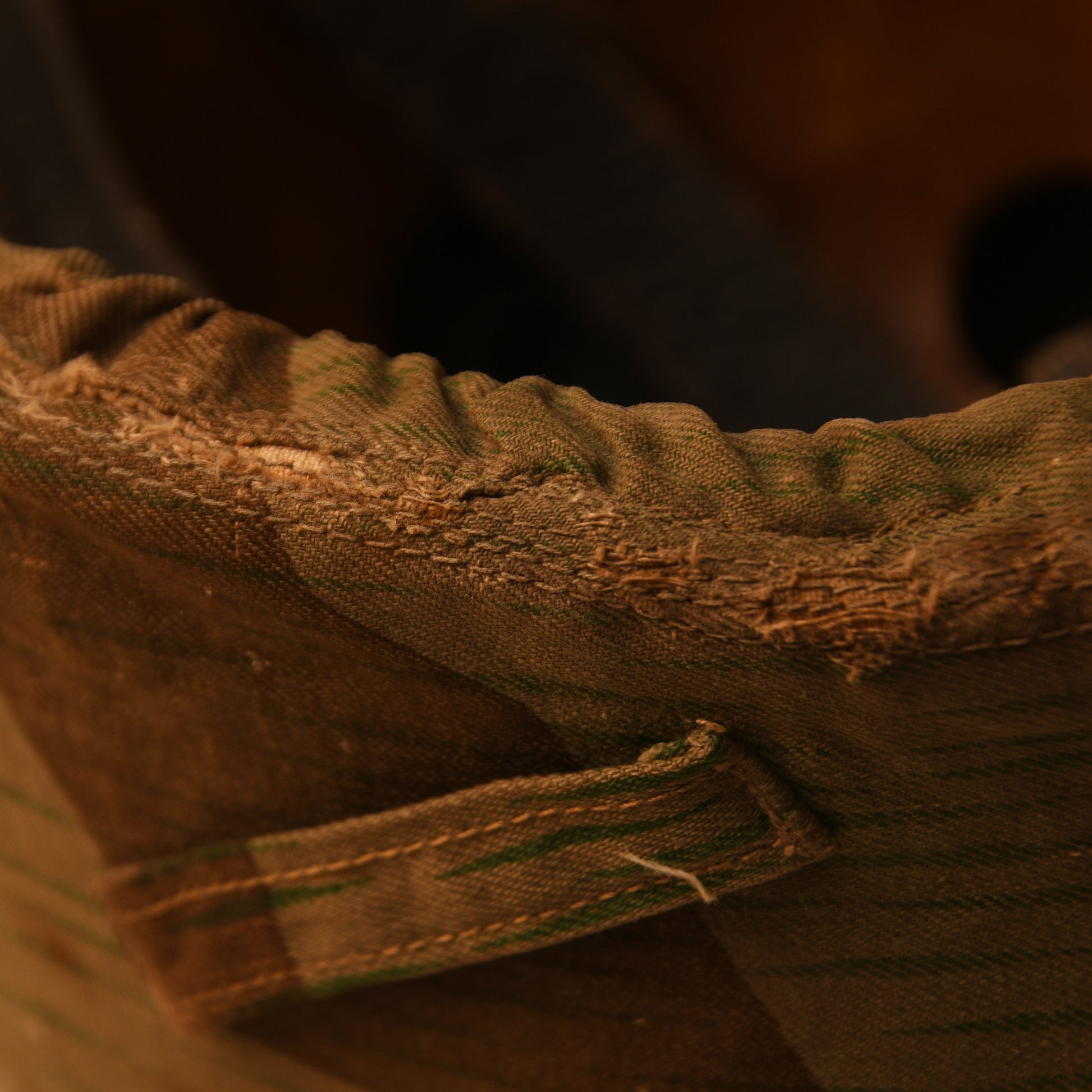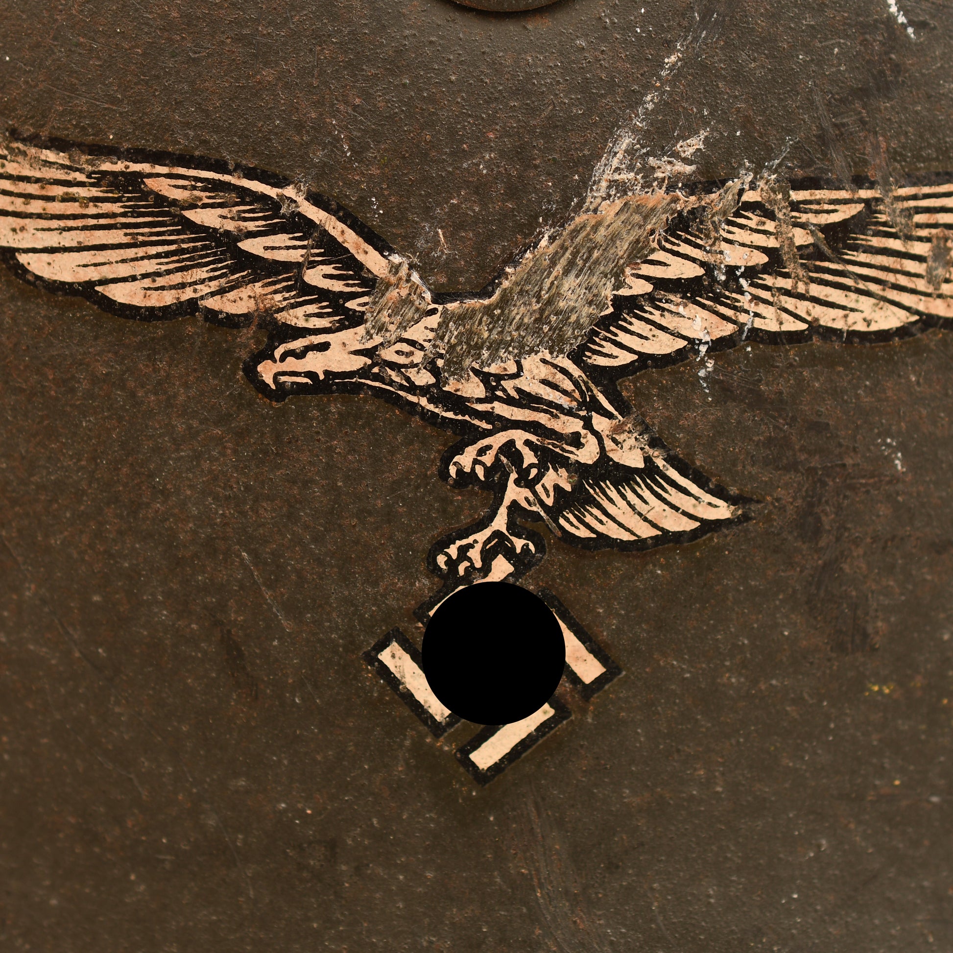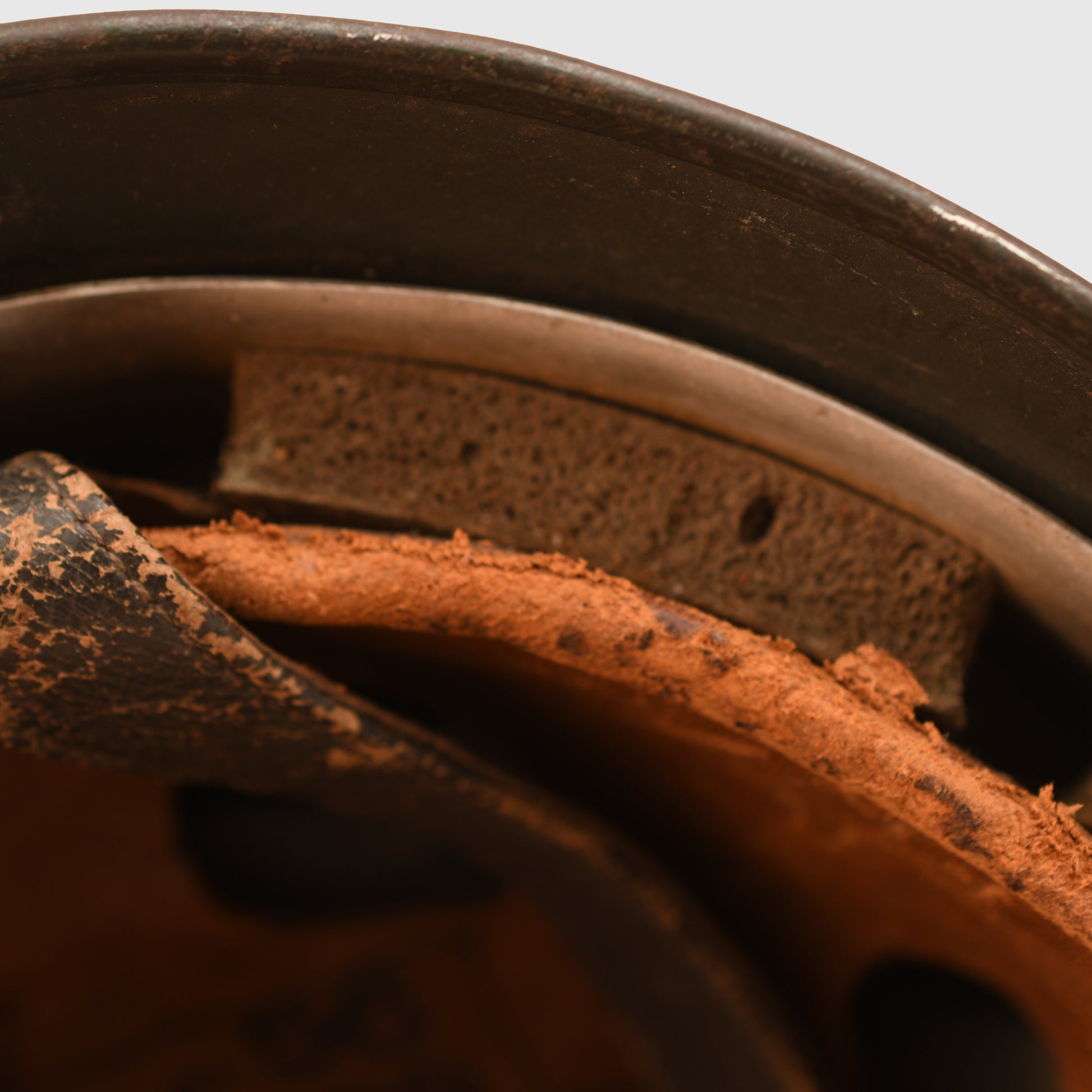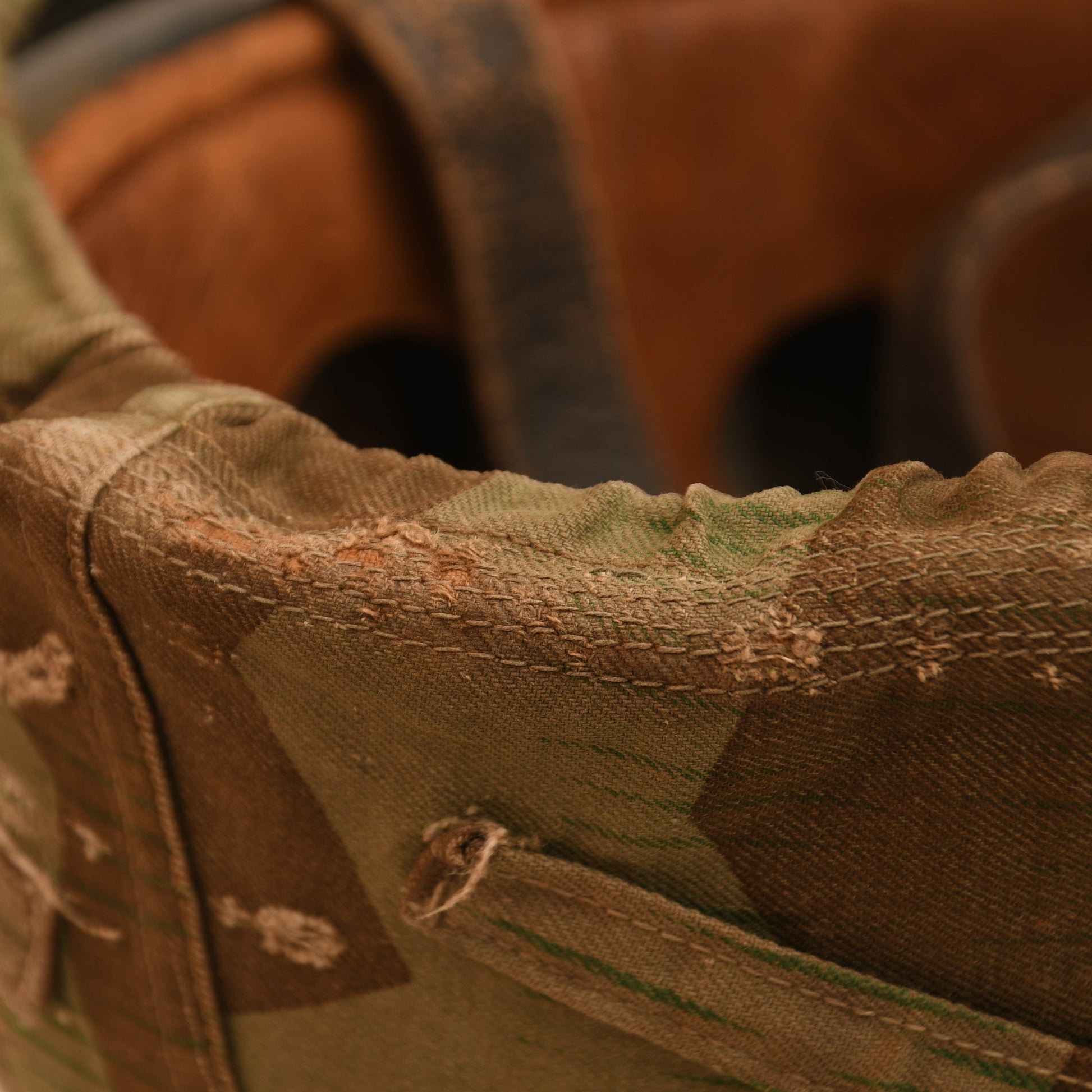 Accompanying the helmet is an original army splinter-pattern camouflage cover with foliage loops, field-adapted by a Luftwaffe paratrooper. The cover shows minor nicks, light discoloration, and small areas of rust bleed that align with the helmet shell, confirming it as original. Tested and verified, the cover retains its bowl-like shape when inverted, a reliable indicator of authenticity.