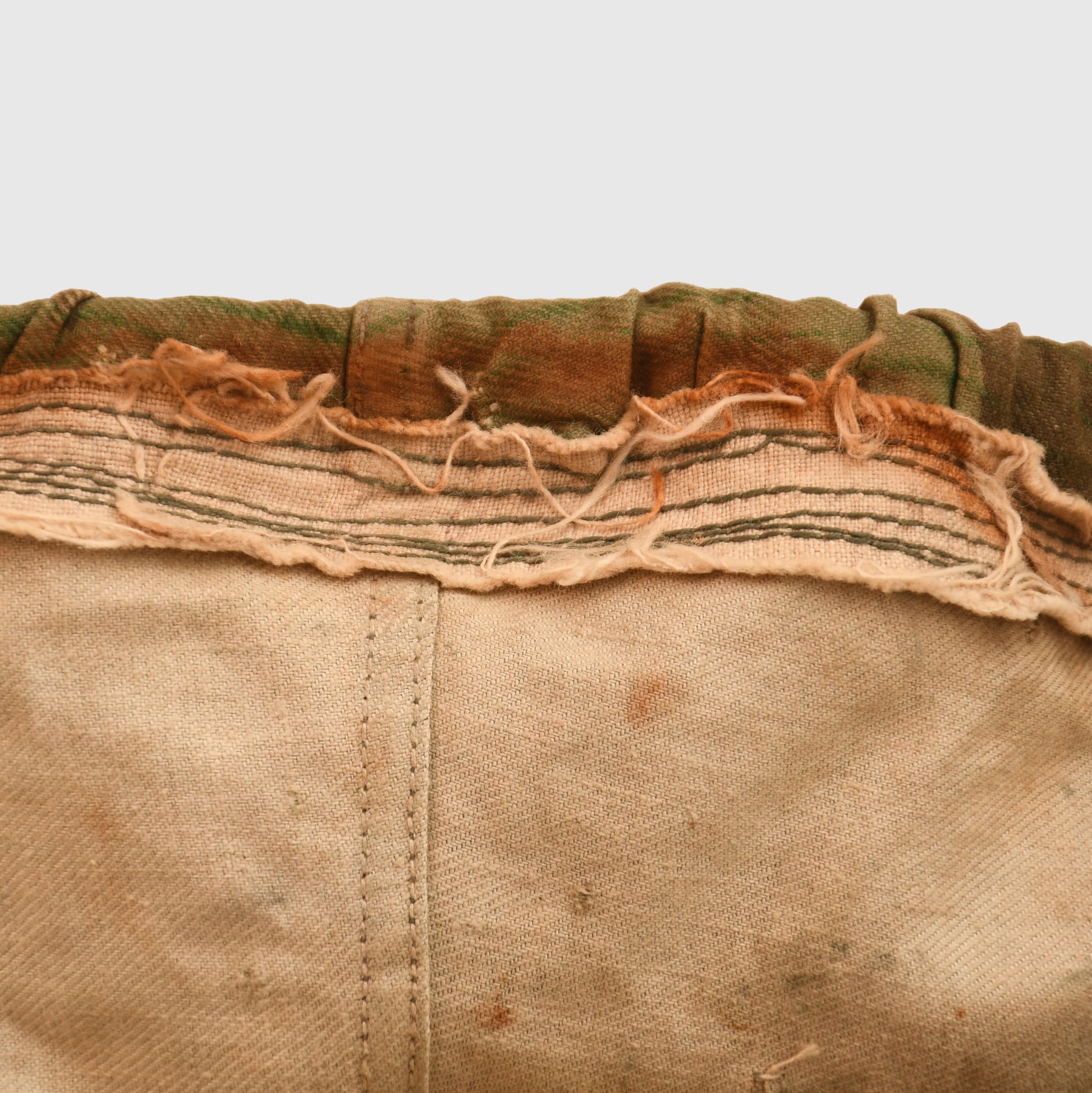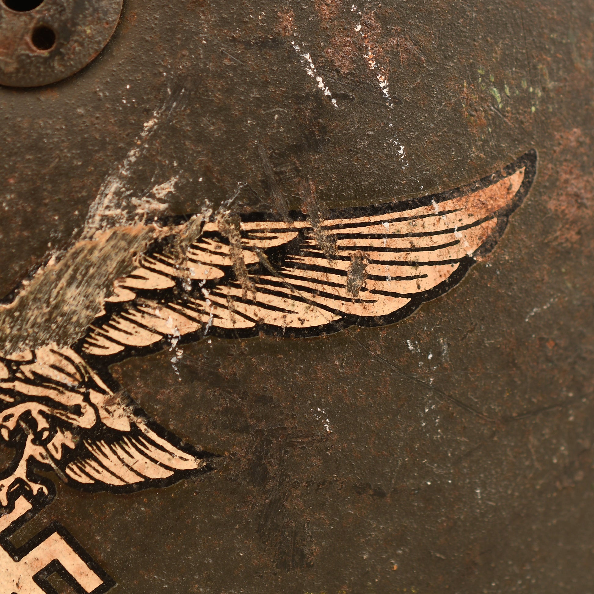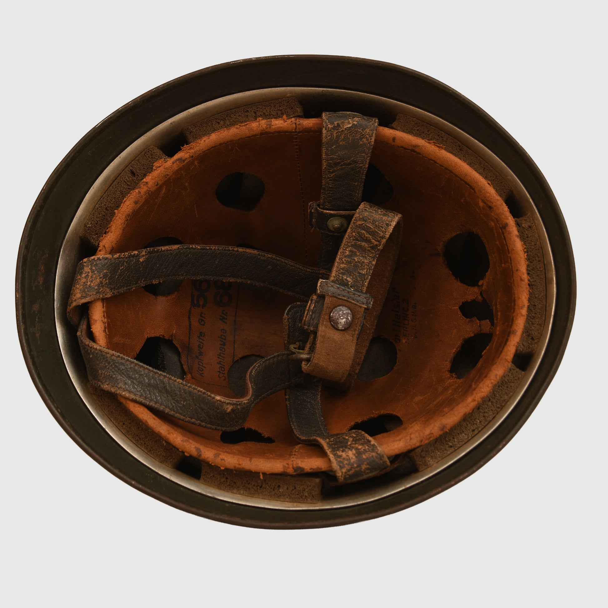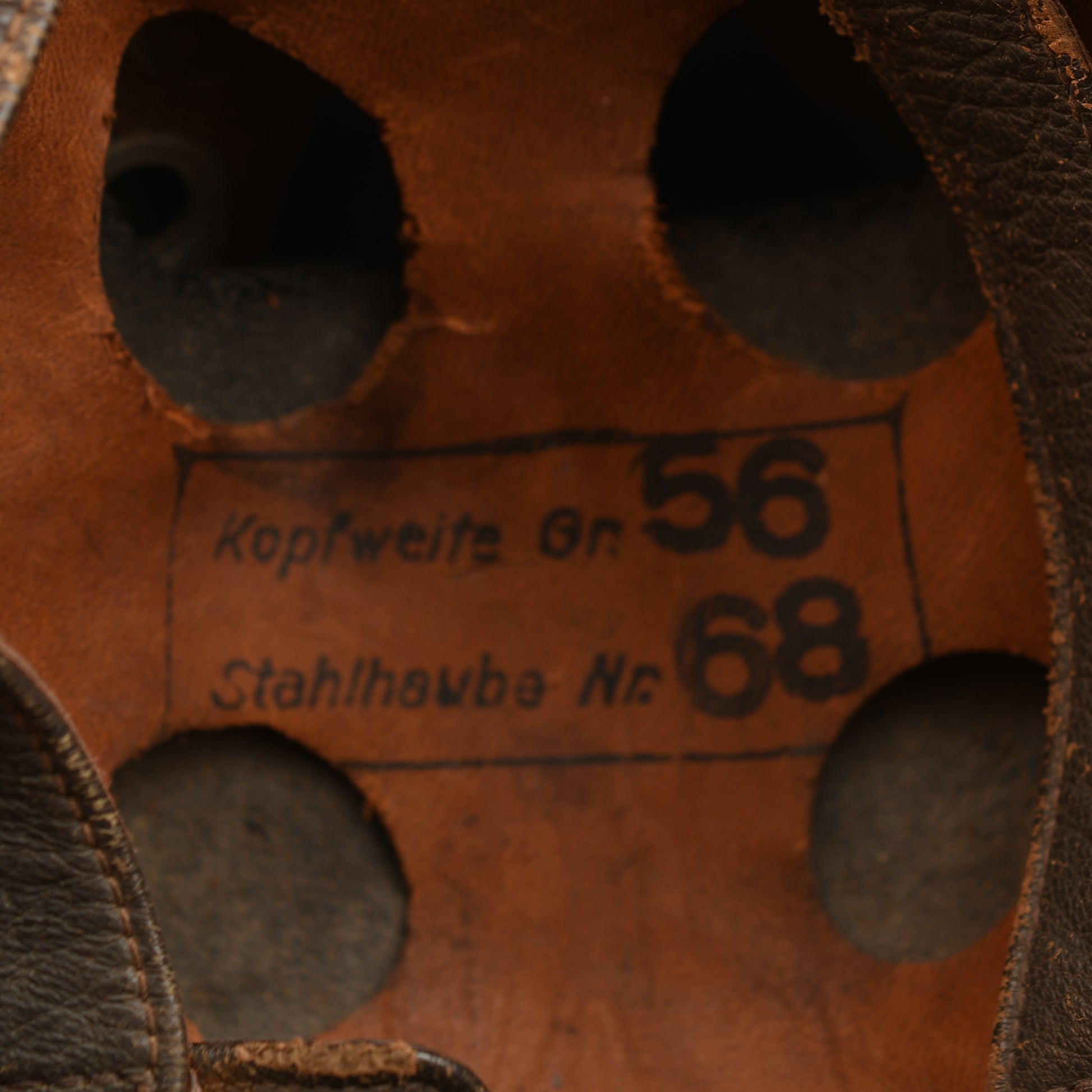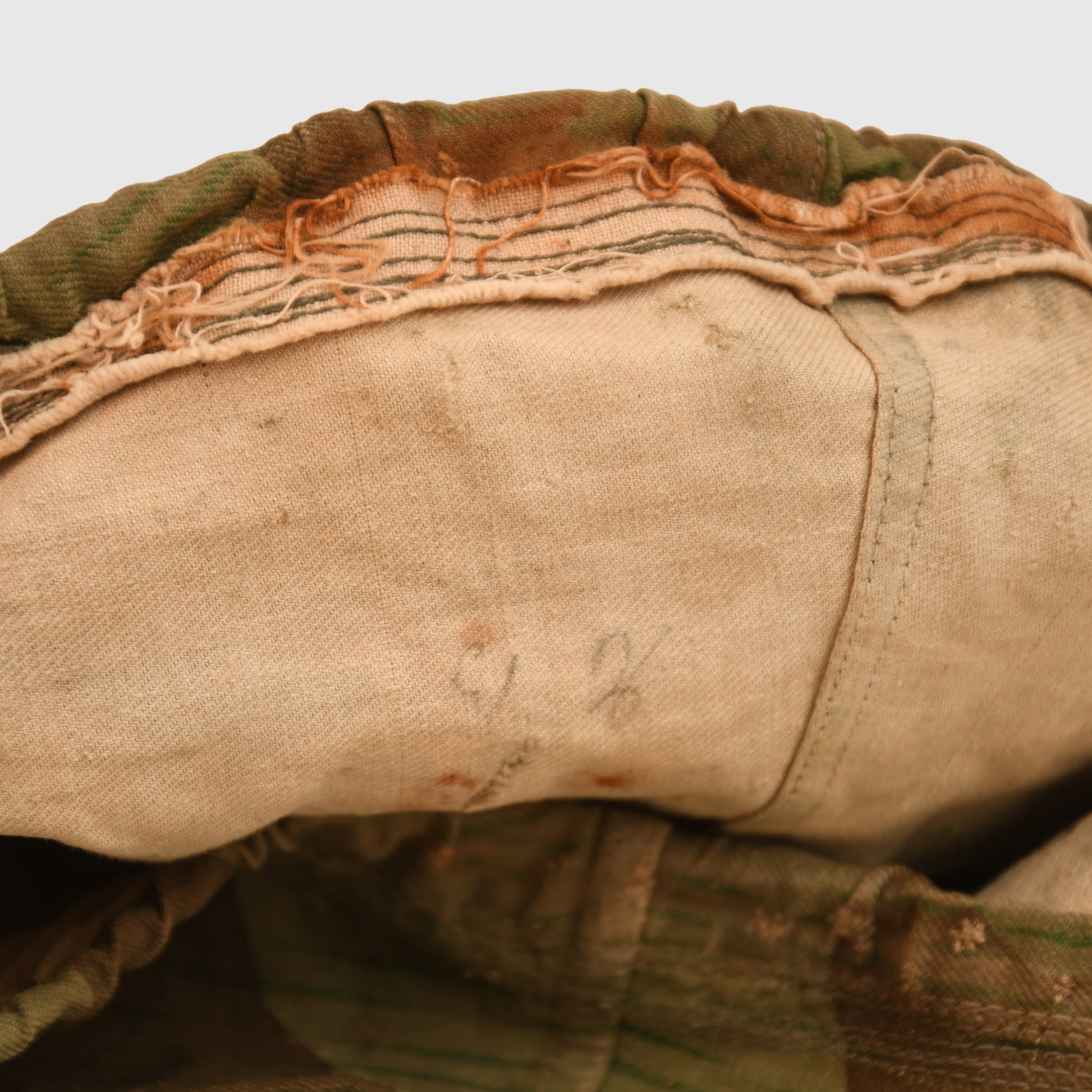 Accompanying the helmet is an original army splinter-pattern camouflage cover with foliage loops, field-adapted by a Luftwaffe paratrooper. The cover shows minor nicks, light discoloration, and small areas of rust bleed that align with the helmet shell, confirming it as original. Tested and verified, the cover retains its bowl-like shape when inverted, a reliable indicator of authenticity.