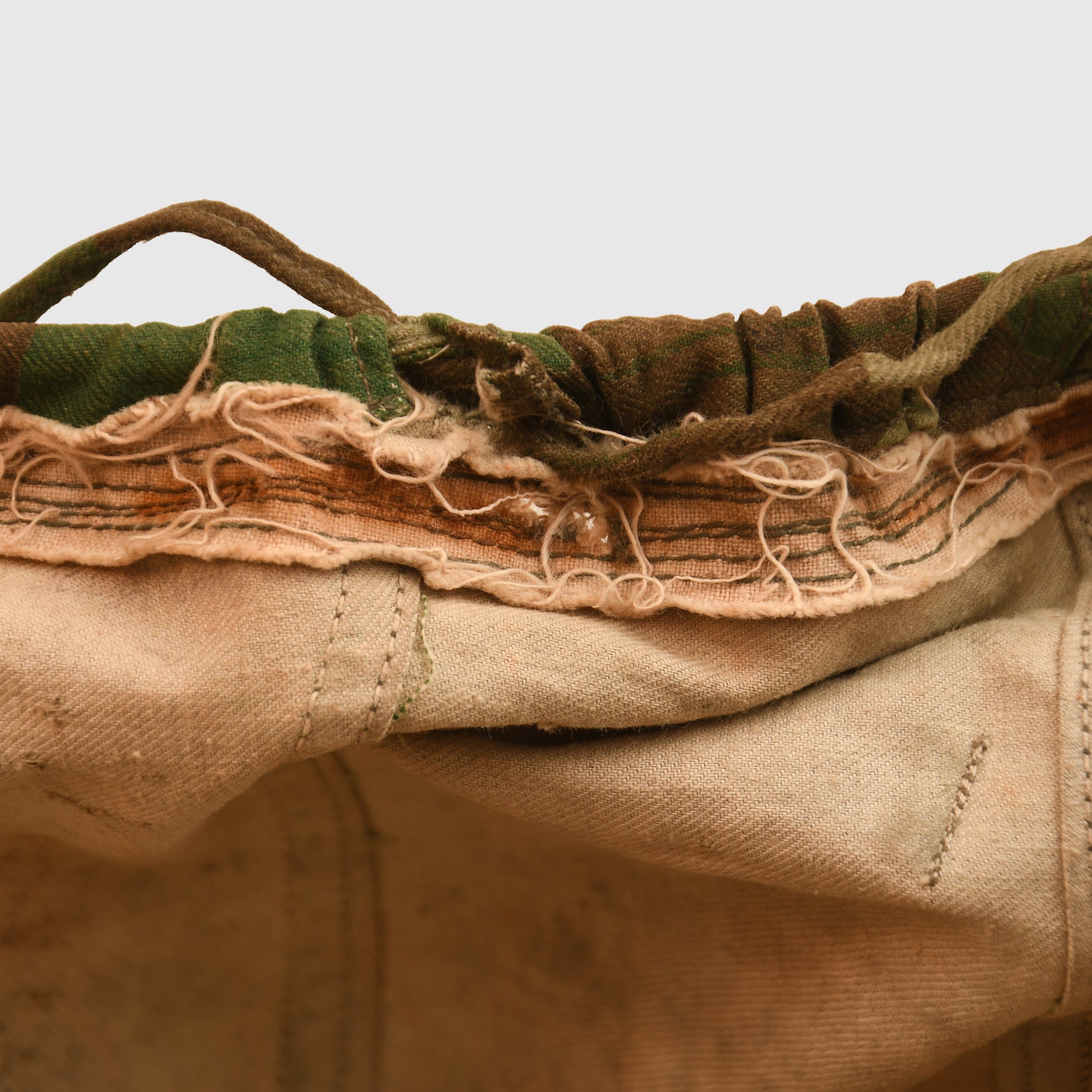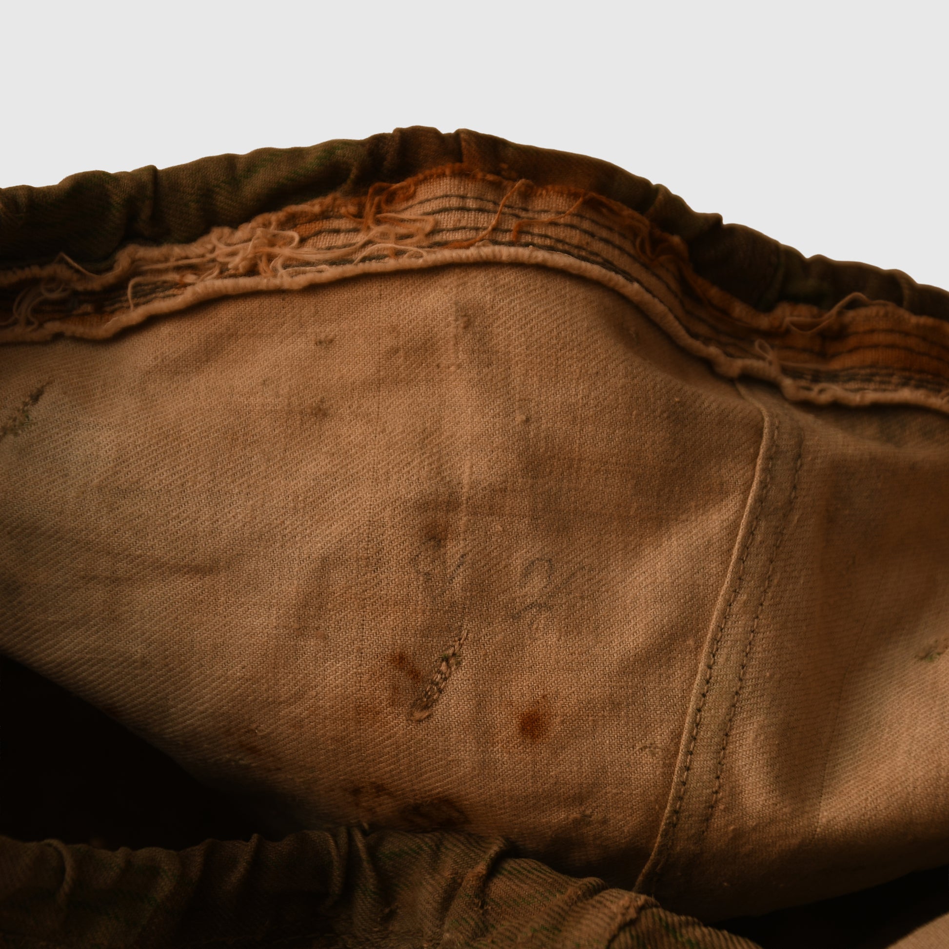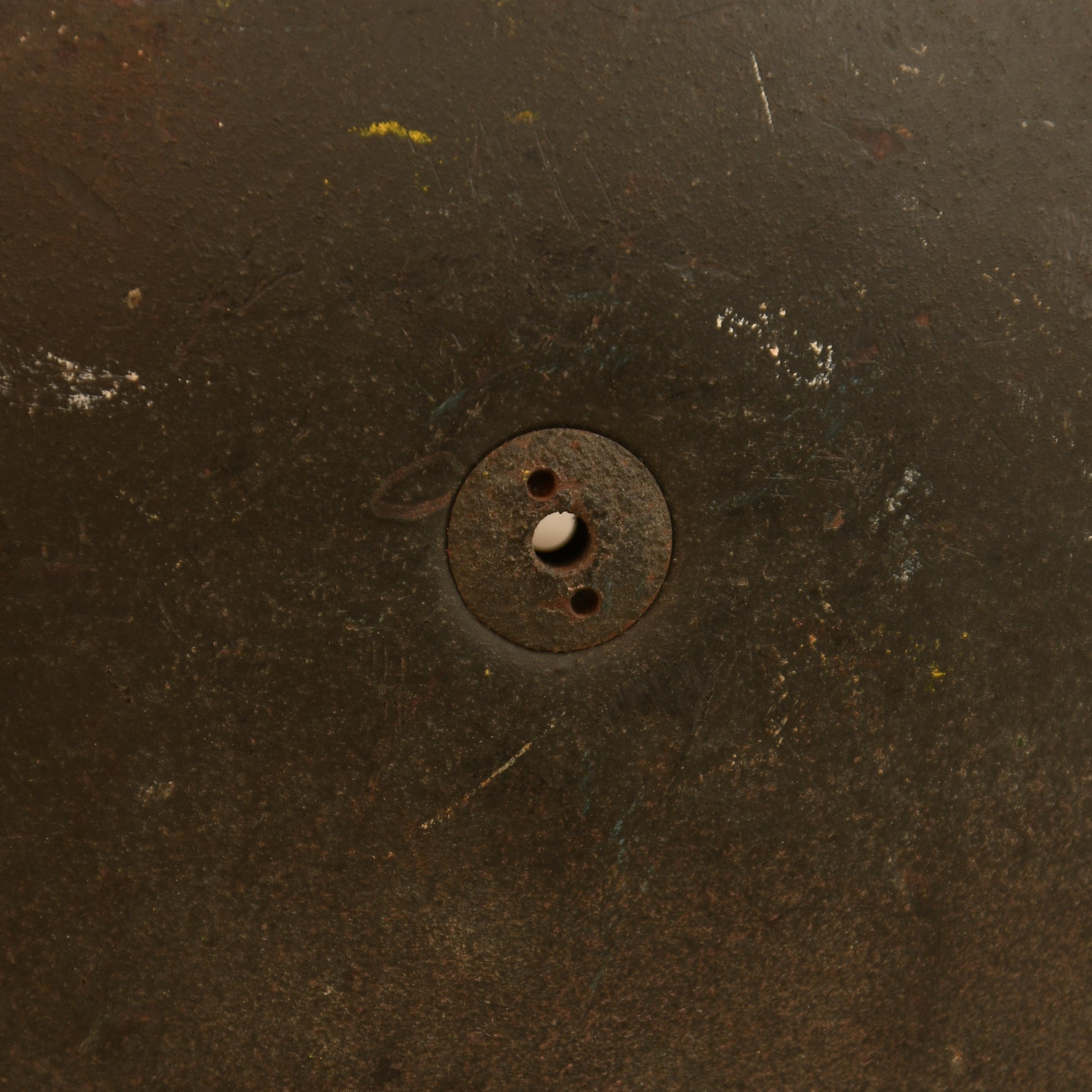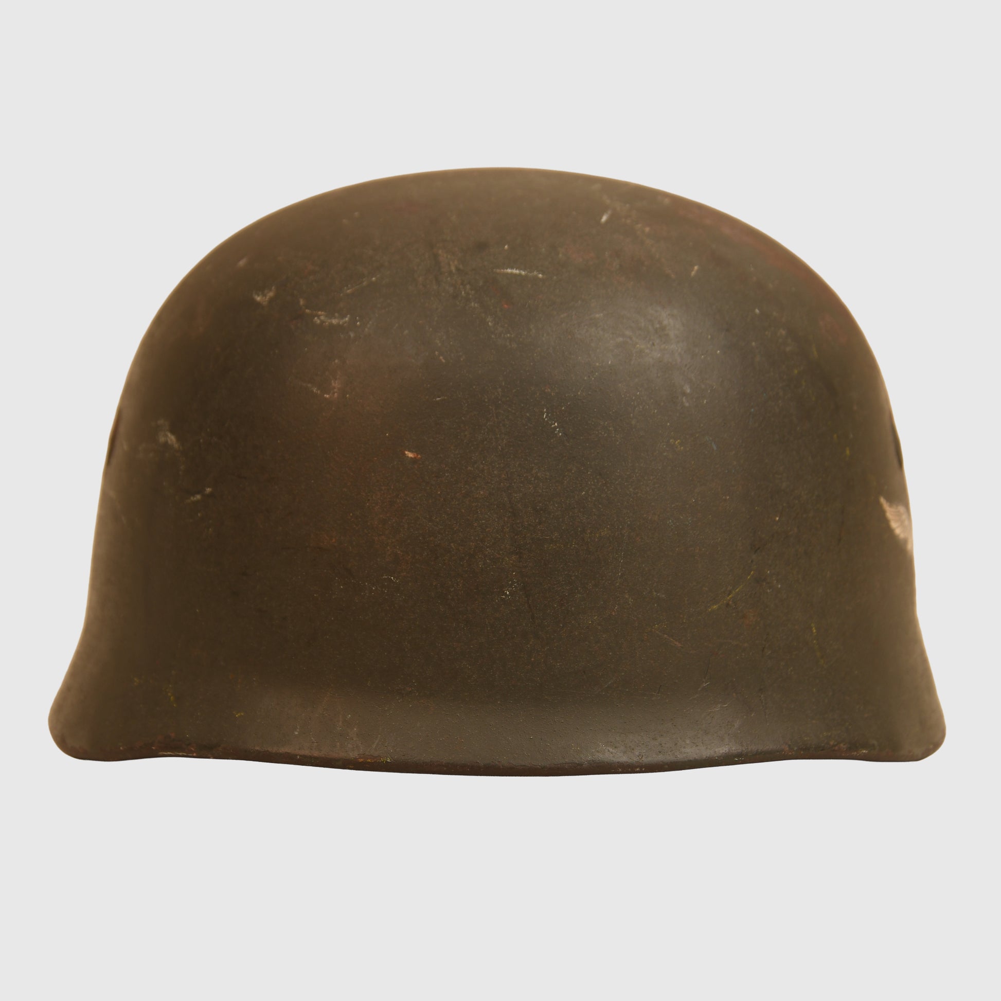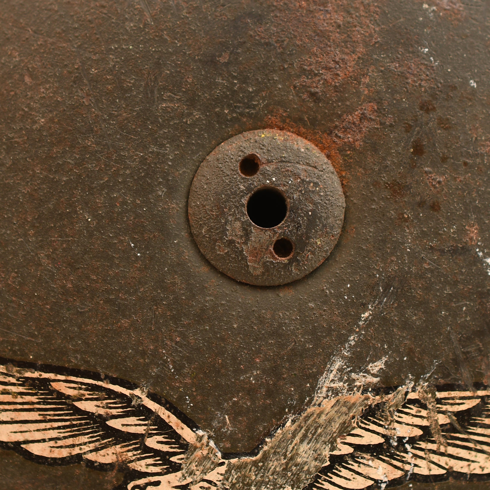 Accompanying the helmet is an original army splinter-pattern camouflage cover with foliage loops, field-adapted by a Luftwaffe paratrooper. The cover shows minor nicks, light discoloration, and small areas of rust bleed that align with the helmet shell, confirming it as original. Tested and verified, the cover retains its bowl-like shape when inverted, a reliable indicator of authenticity.