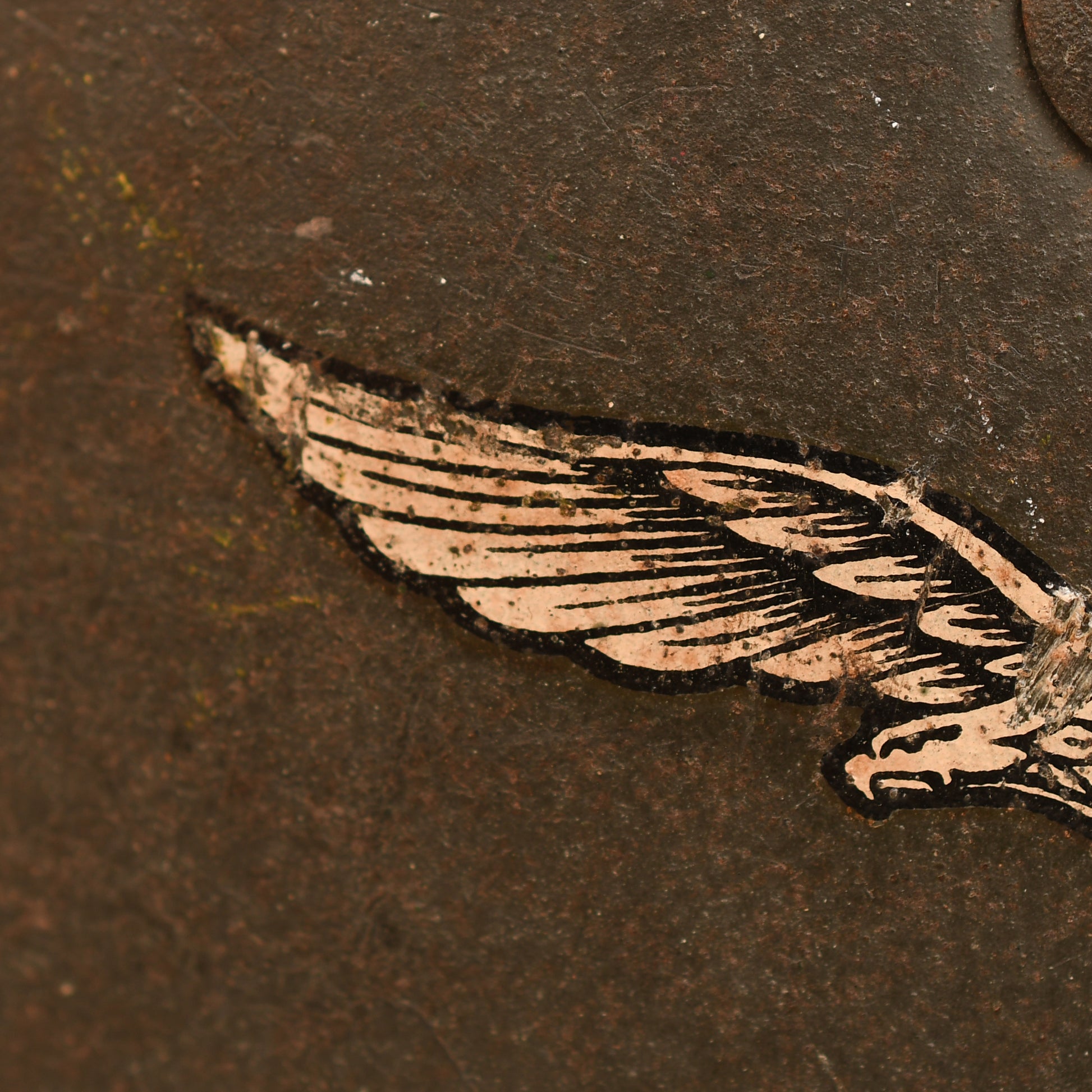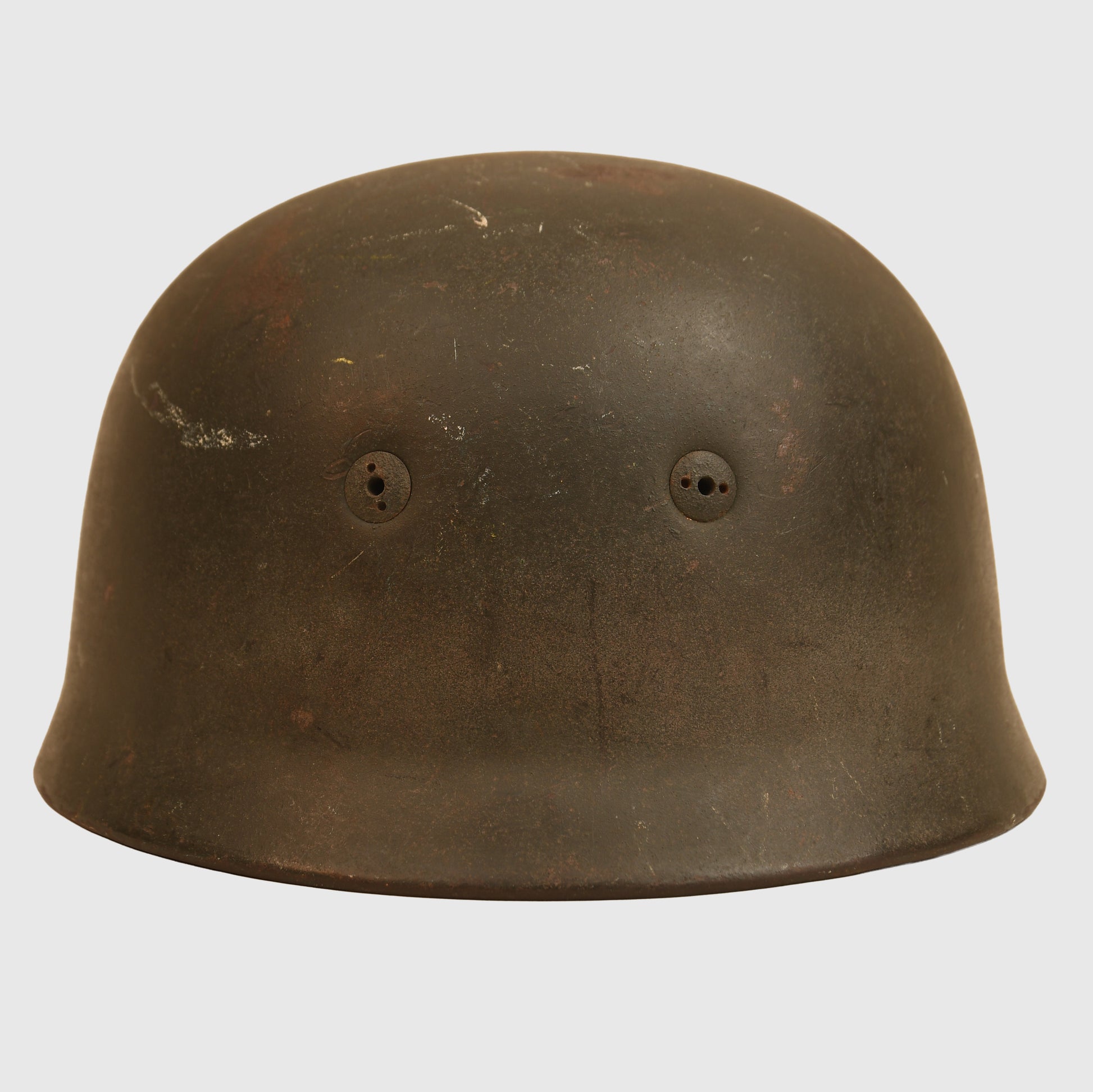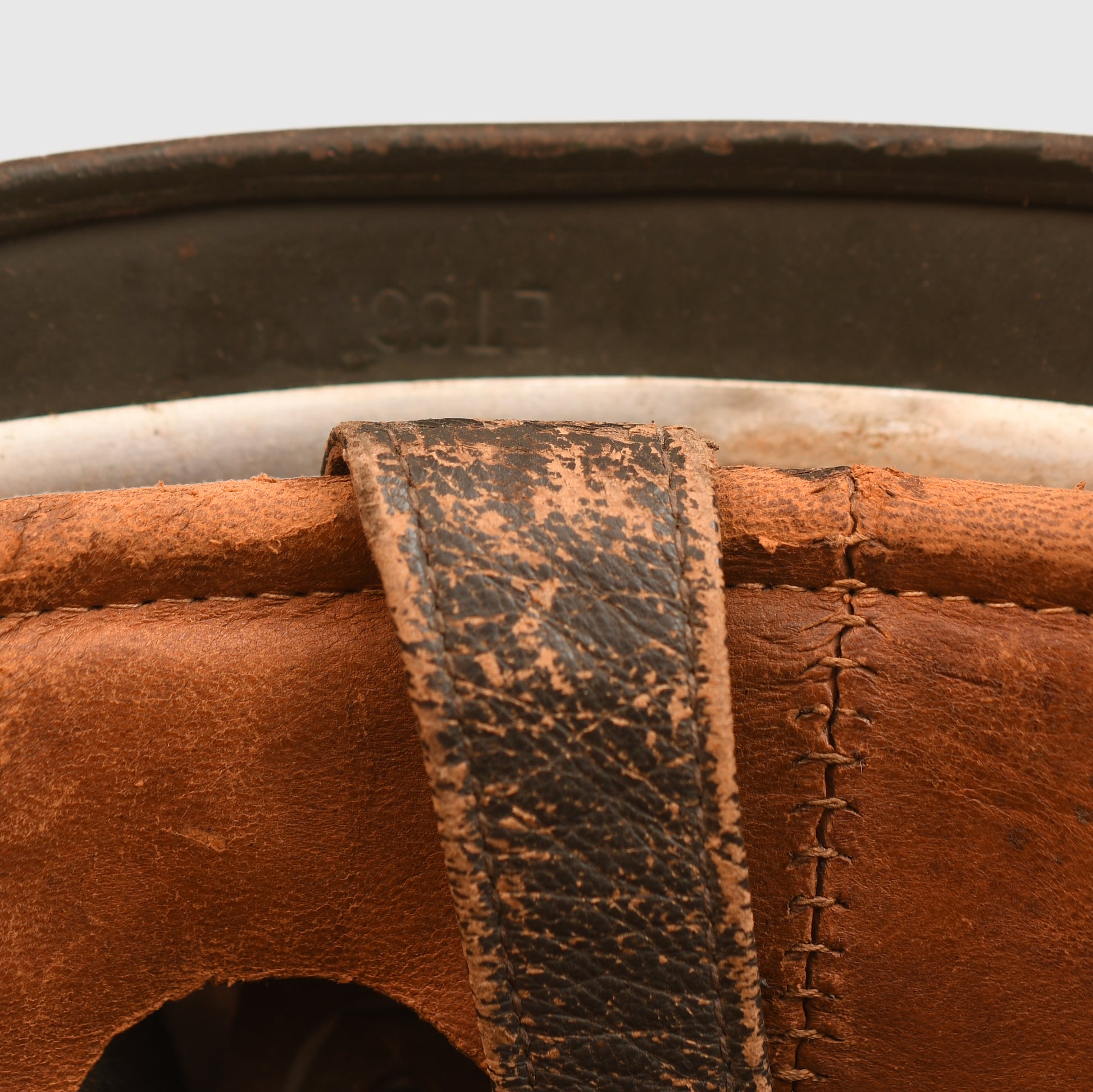 A very fine ET66 stamped paratrooper helmet with original liner size 68, fitting a head size of 56. The exterior retains virtually all of its original field grey-green factory finish, with minor areas of rust bleed. The Luftwaffe decal is sharp and clear, with a single abrasion to the rear of the eagle’s head. Original three-hole spanner bolts remain intact.