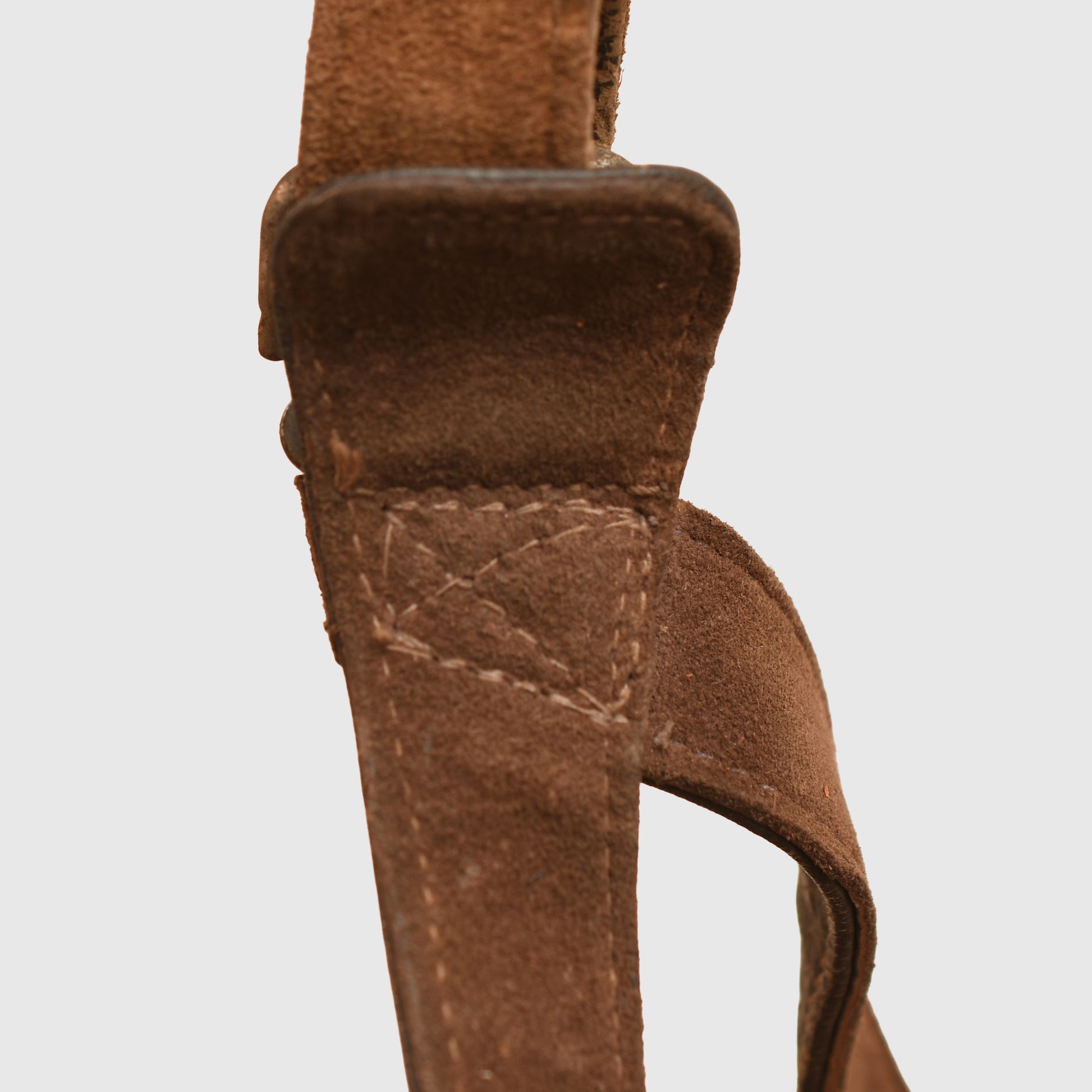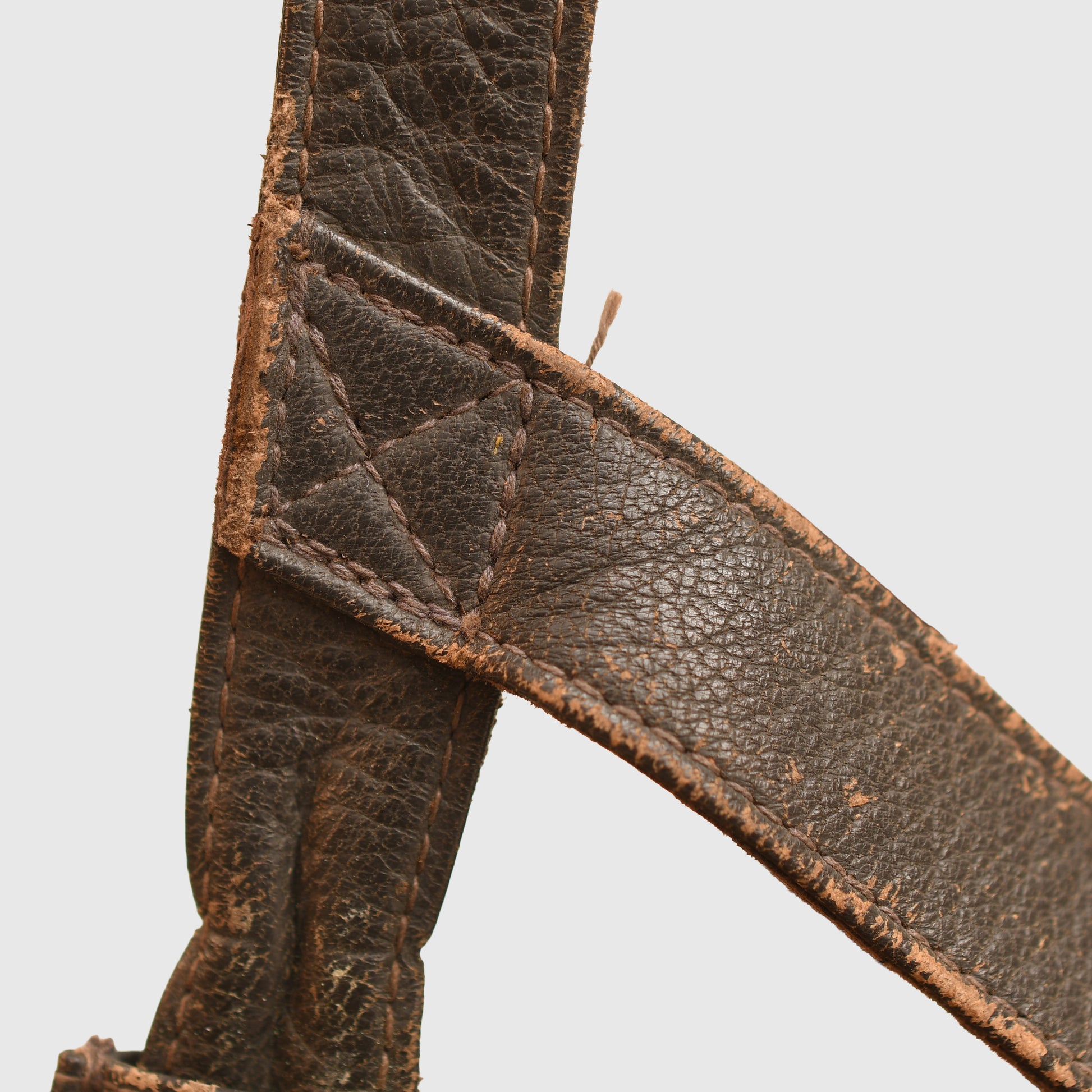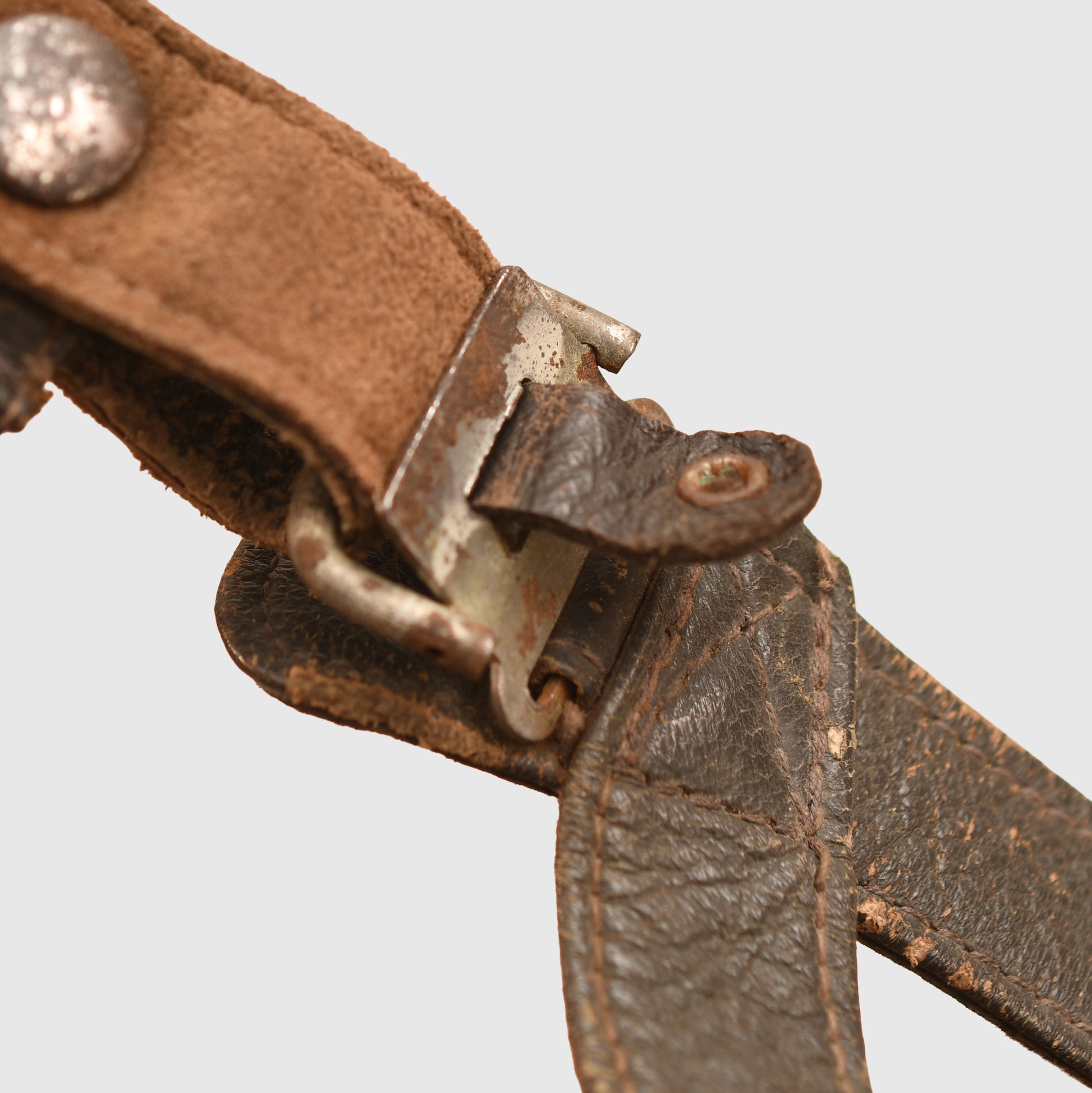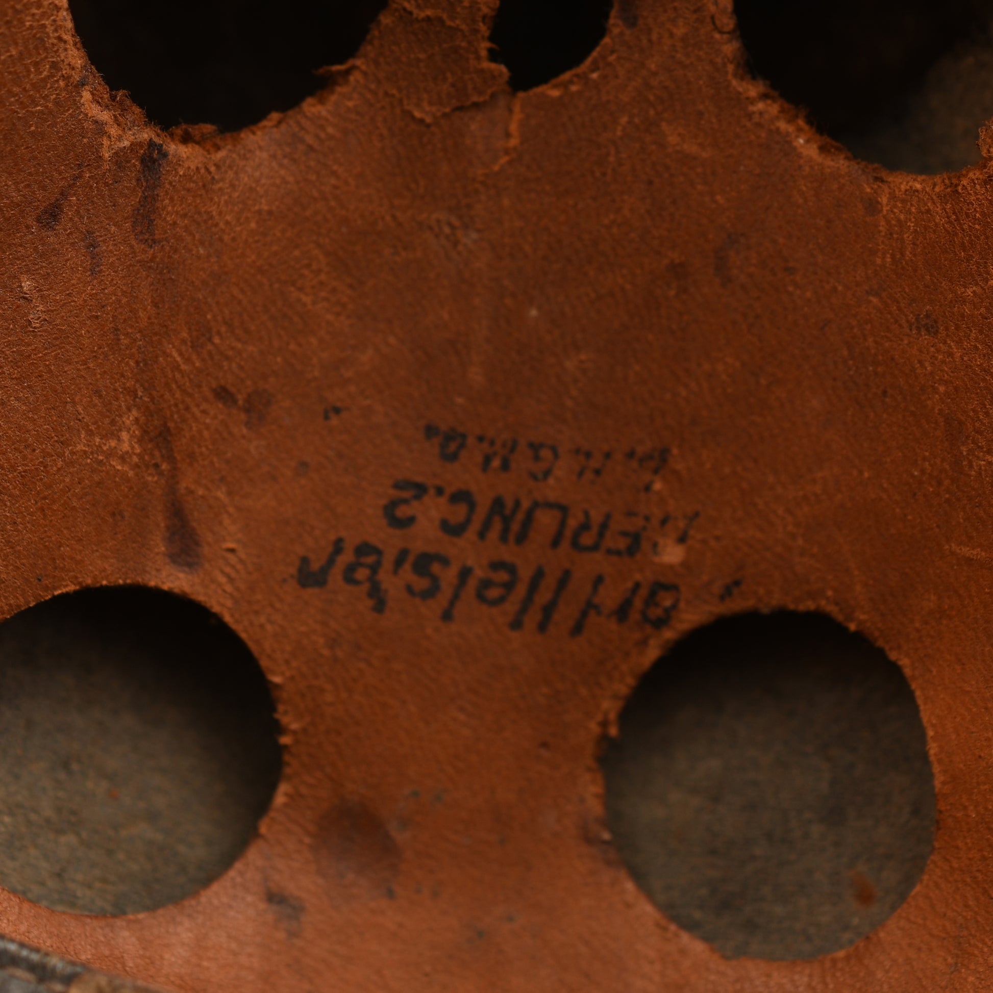 The interior strapping is complete, showing service wear; all male/female closure studs are present, with the final adjuster stud firmly attached. The Sorbo rubber suspension between liner and band is solid, and the light tan leather liner shows only minor roughness along the lower edge. The maker mark, ‘Karl Heisler, Berlin,’ is clear on the front section of the leather.