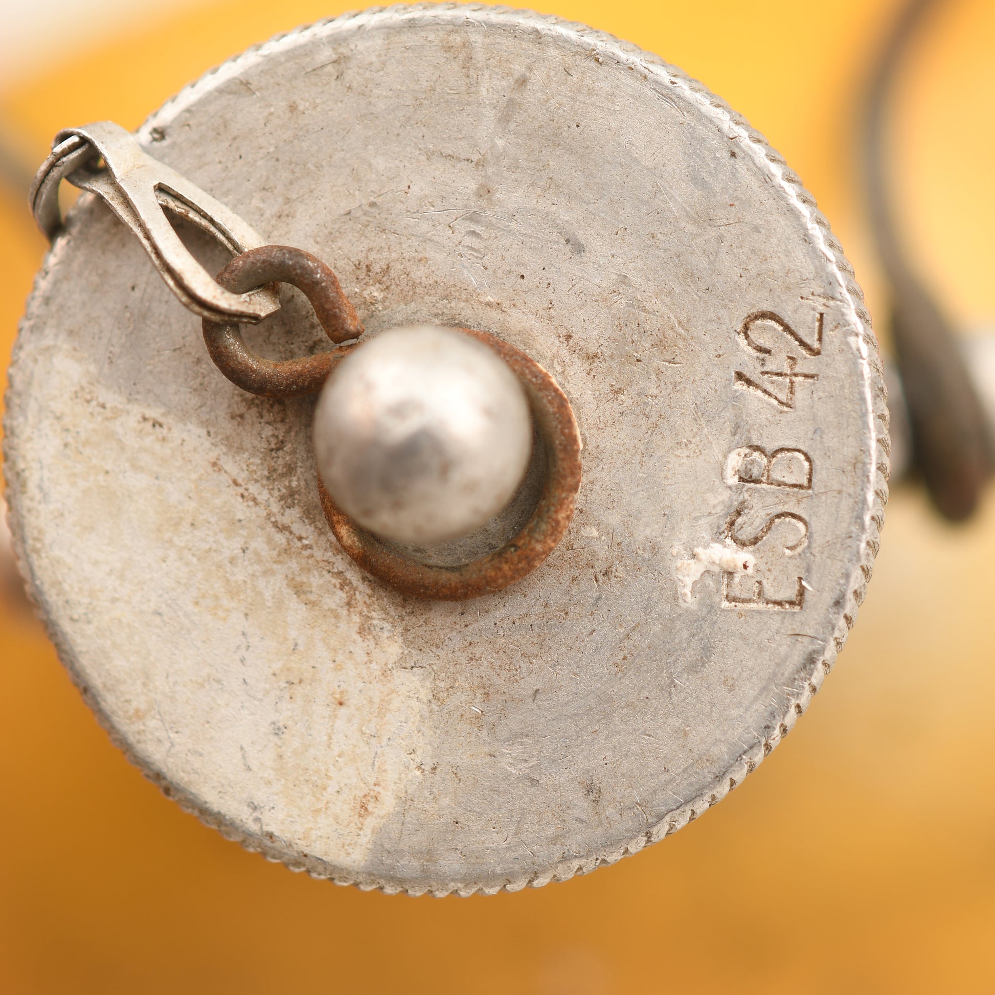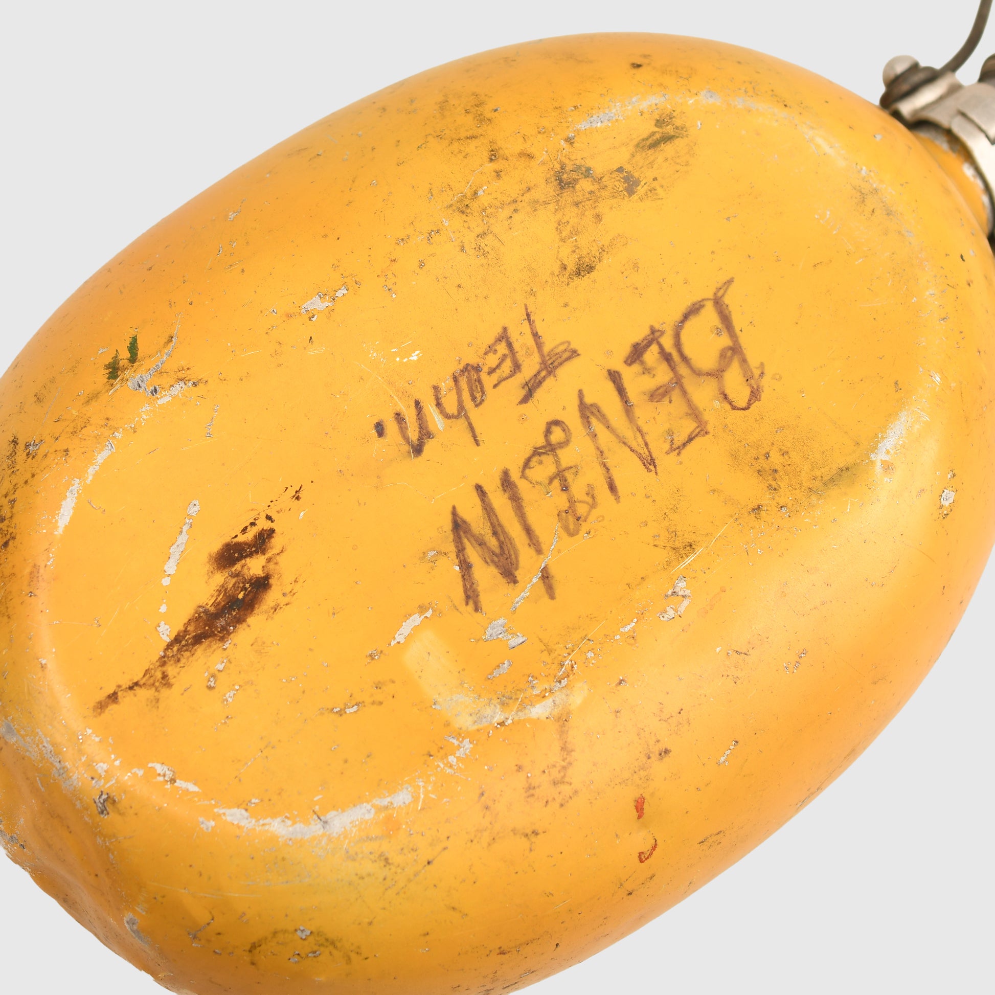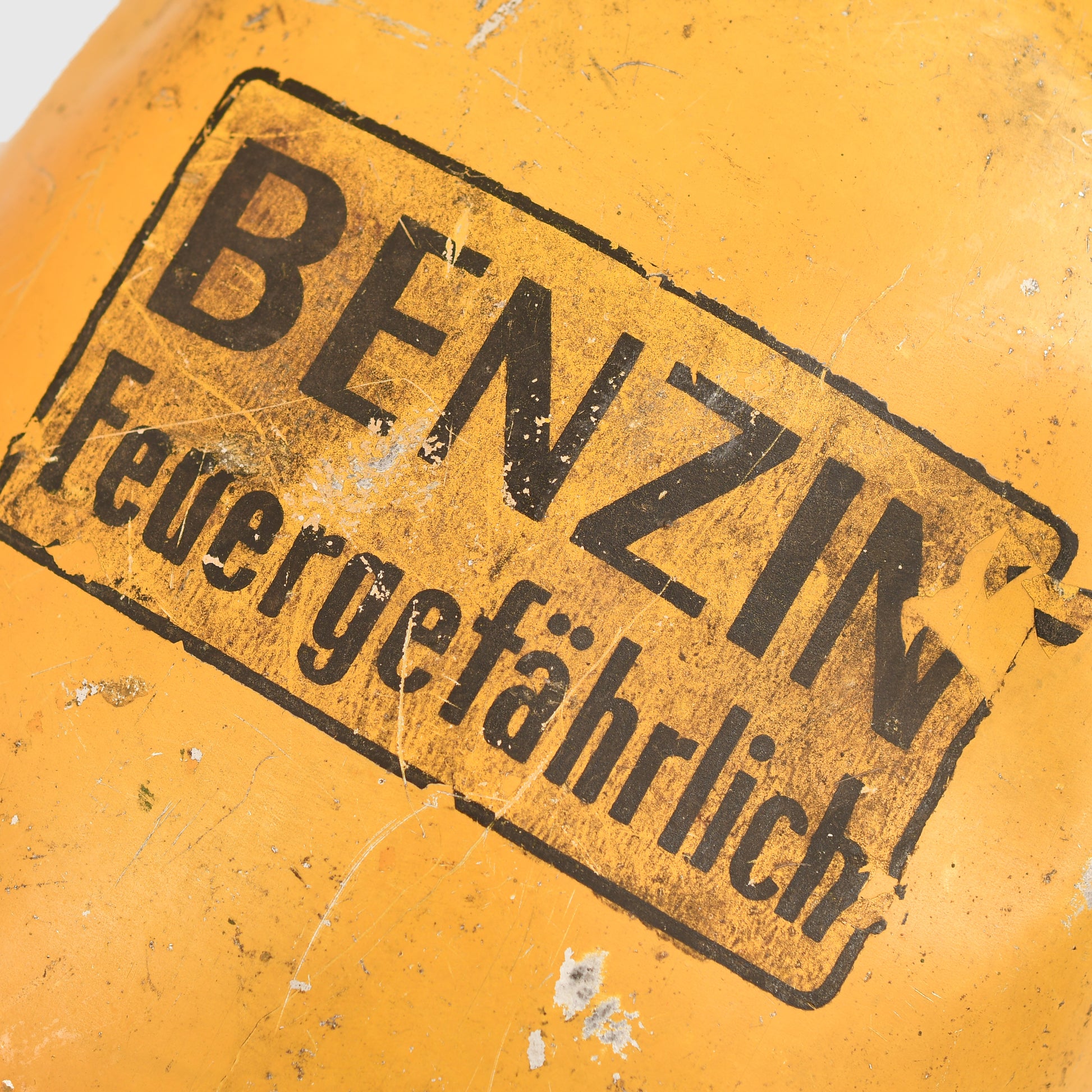 A large capacity aluminium bottle painted in Luftwaffe yellow with the words ‘Benzin Feuergefahrlich’. The cap is marked ‘ESB 42’ with its carrying handle and cap securing chain. Some indentations to the base. Hand applied on the rear of the bottle, also the word ‘Benzin’.
