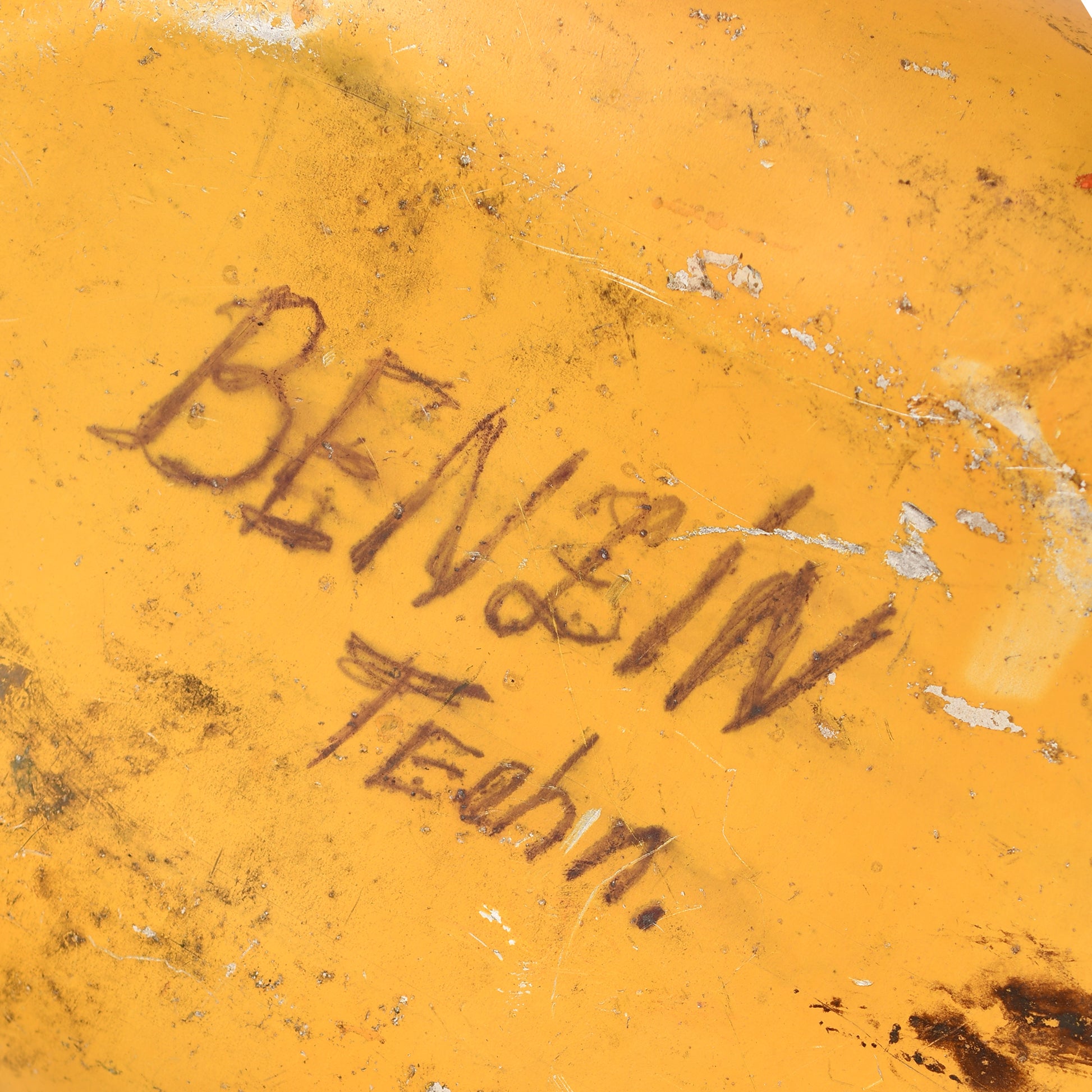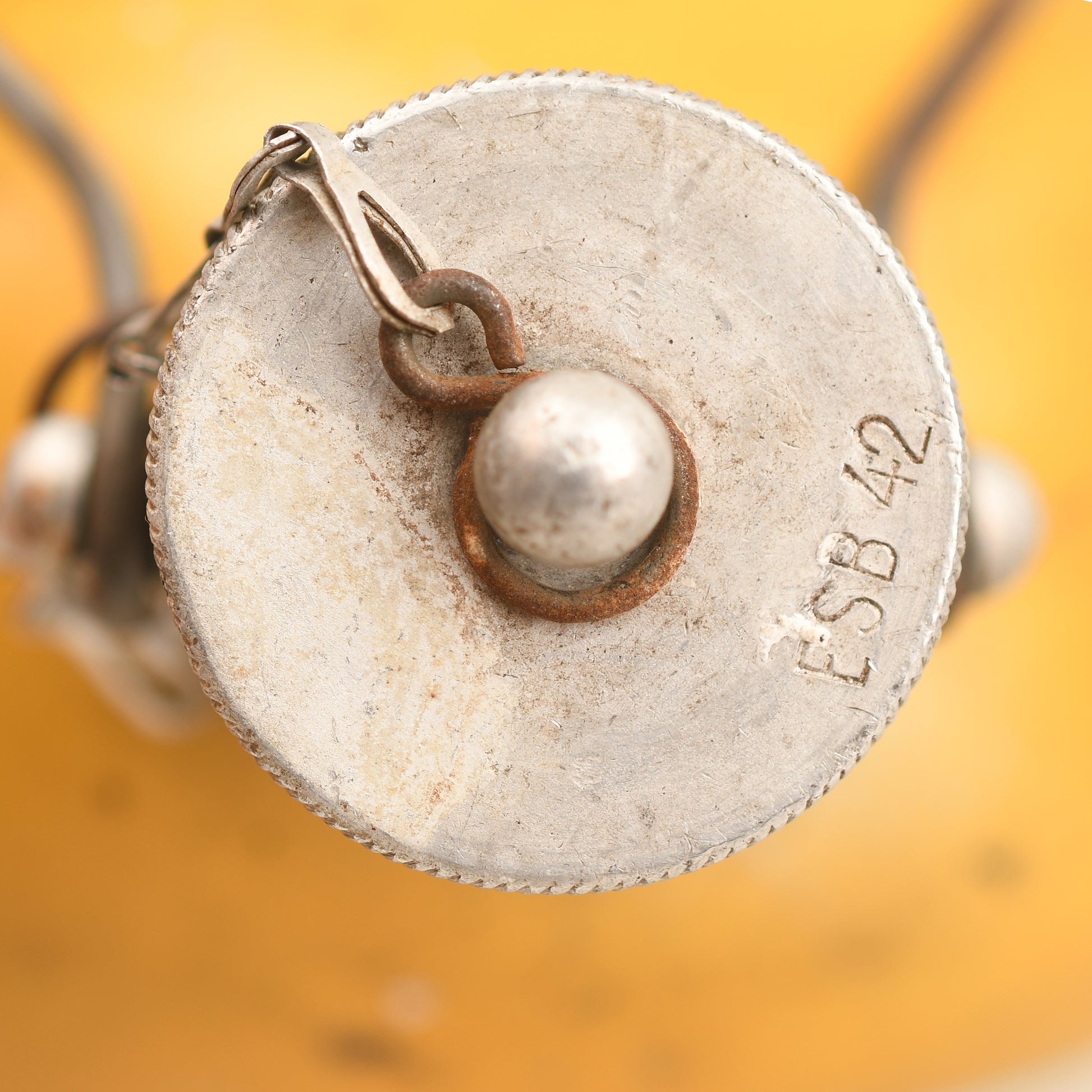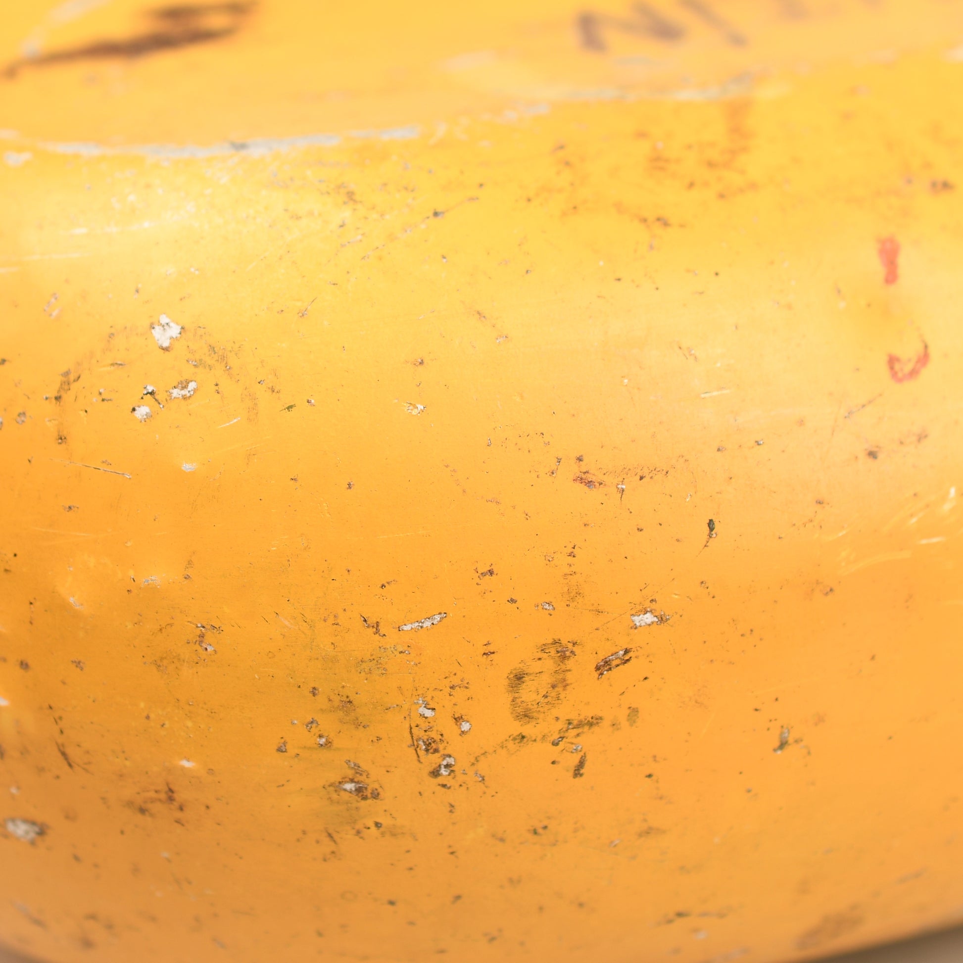 A large capacity aluminium bottle painted in Luftwaffe yellow with the words ‘Benzin Feuergefahrlich’. The cap is marked ‘ESB 42’ with its carrying handle and cap securing chain. Some indentations to the base. Hand applied on the rear of the bottle, also the word ‘Benzin’.