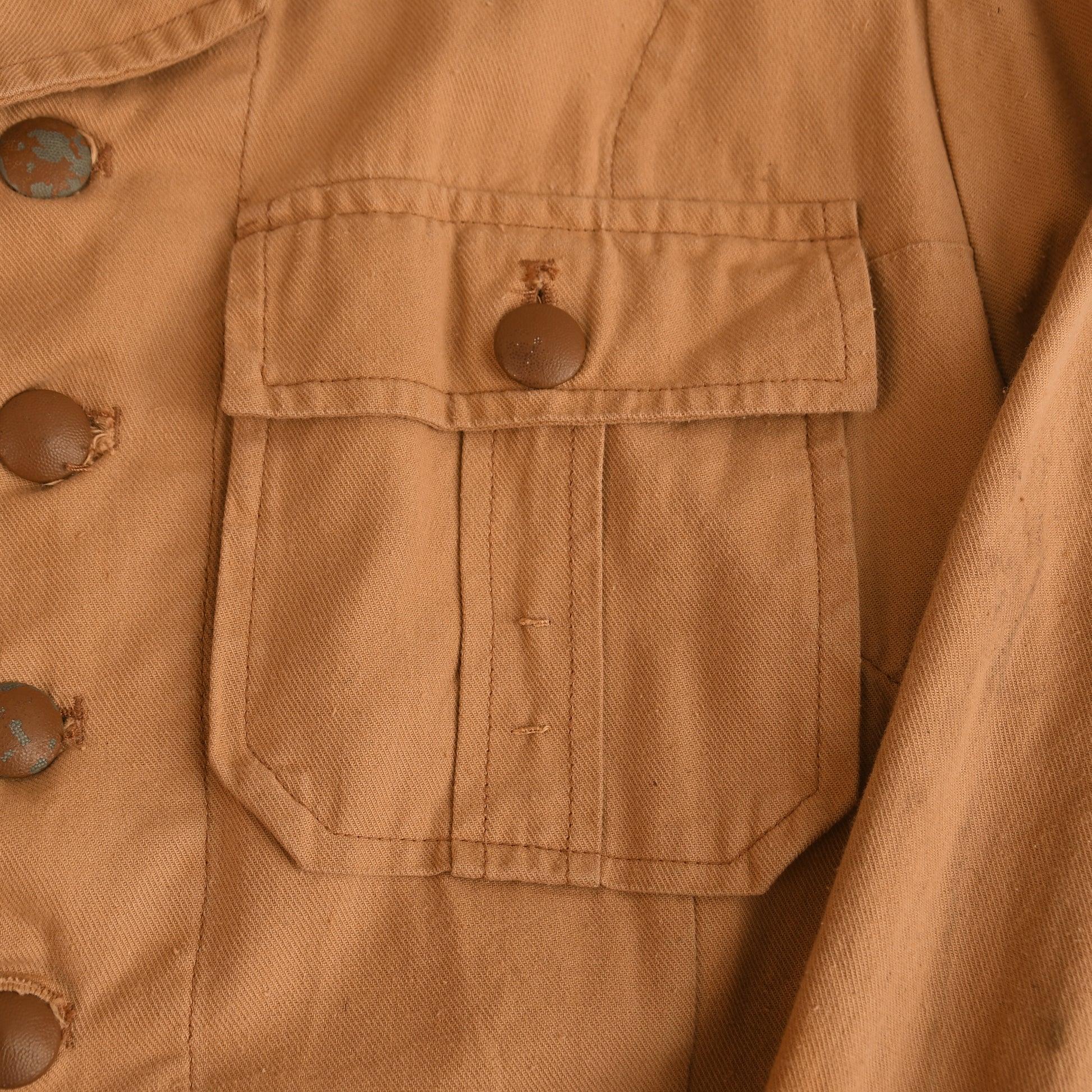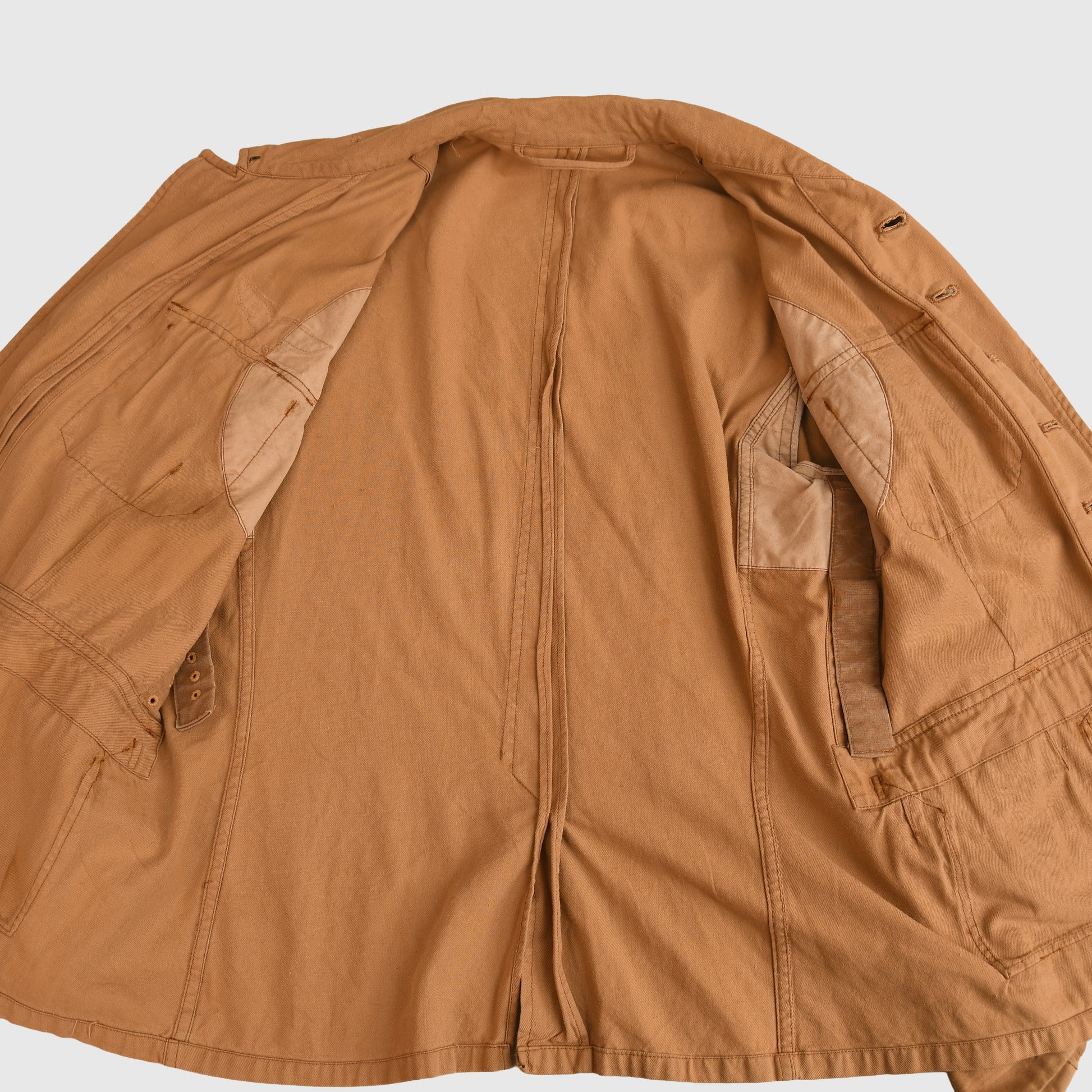 The interior exhibits faint ink markings from the well-known manufacturer Peek & Cloppenburg, a retail firm that is still in operation in Germany today. The tunic has seen use and has been washed, resulting in slight, natural fading of the tan material, which adds to its combat character.